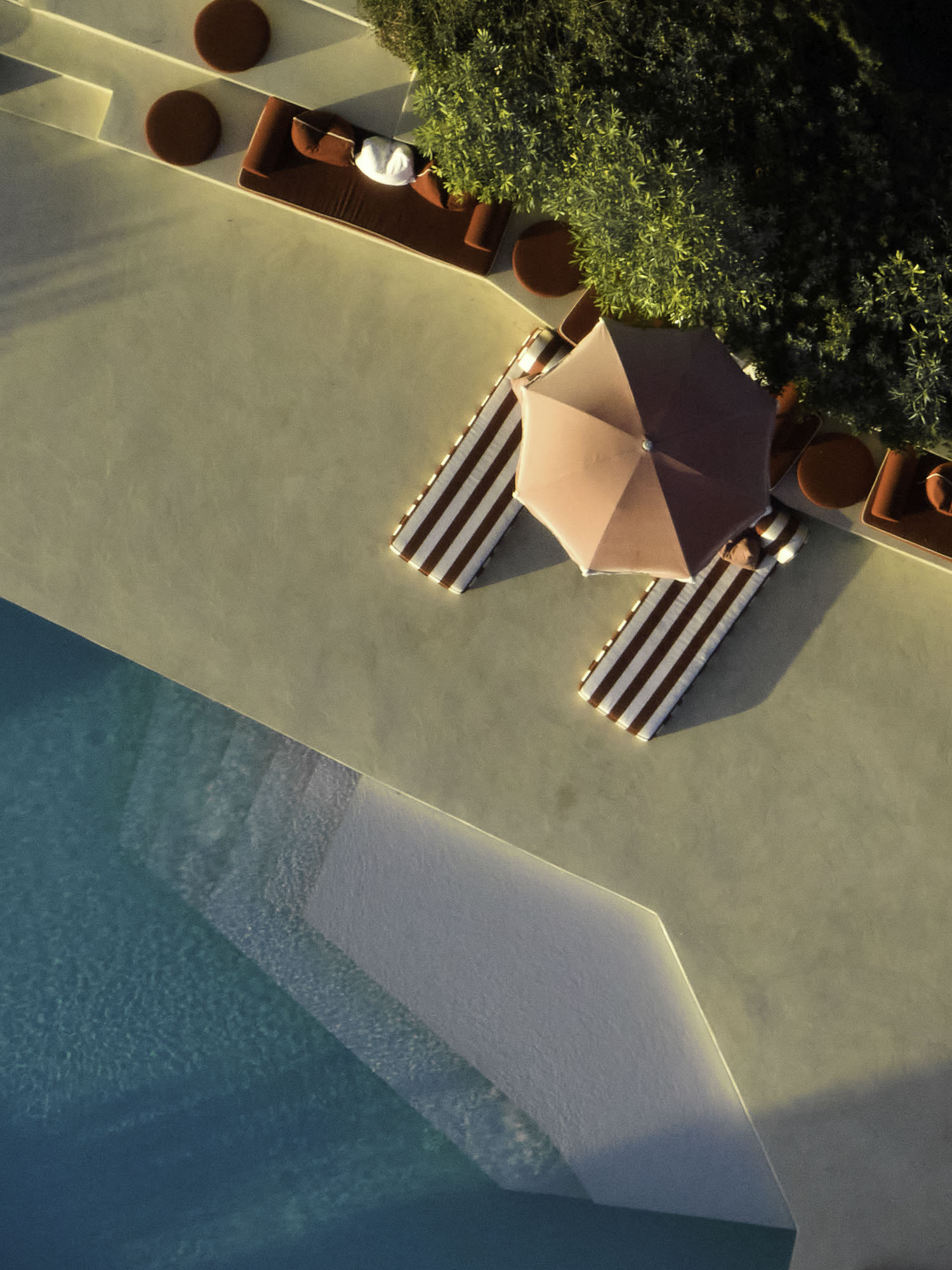 The large terrace features playful red-and-white striped loungers and seating, adding a splash of character to the stylish pool area. An outdoor kitchen, bar, and shaded dining area invite long, relaxed meals under the stars. A lush, hidden courtyard garden leads off the living area and offers a tranquil breakfast nook surrounded by greenery. For those feeling active, gym equipment is available on-site, and a garden path winds directly down to Kipiadi Beach—just 50 metres away.