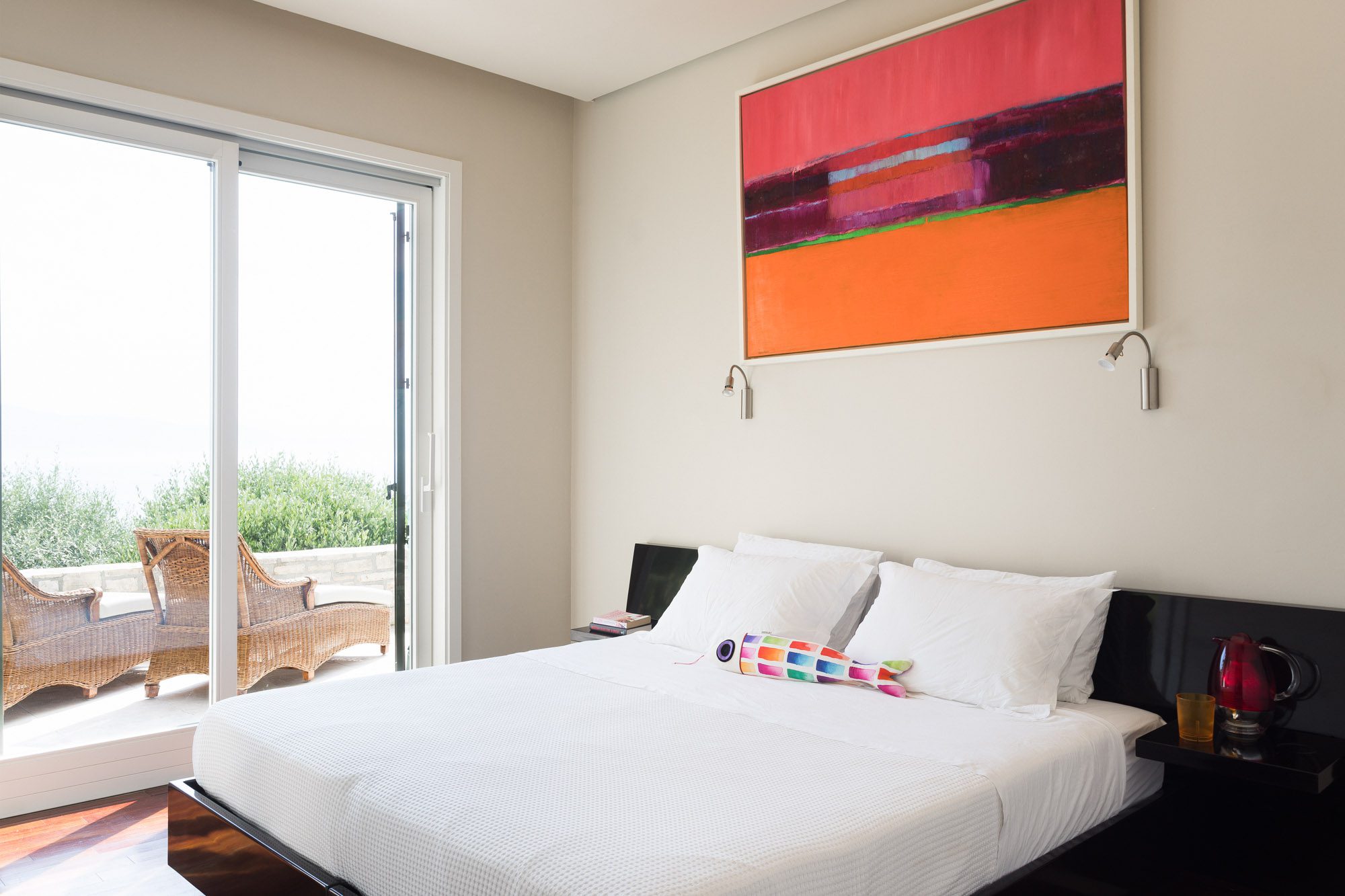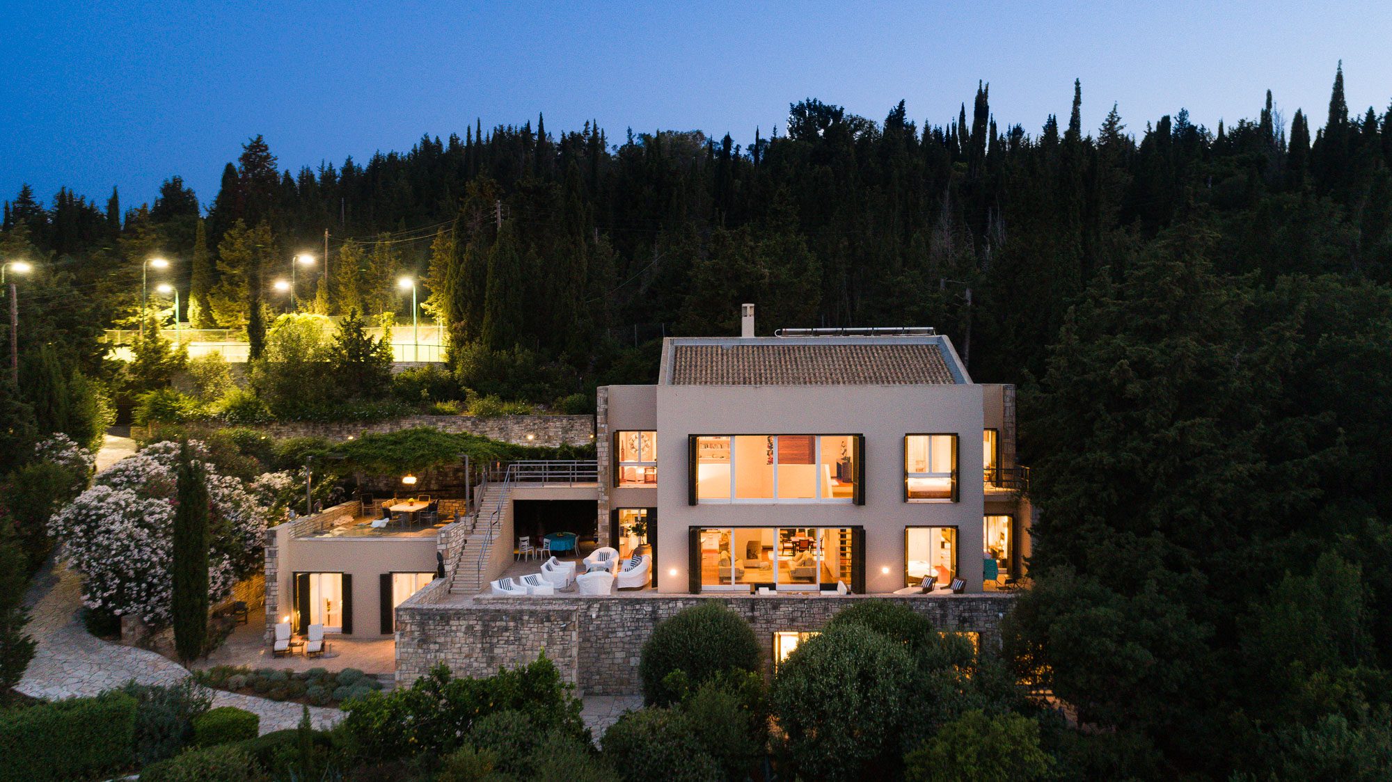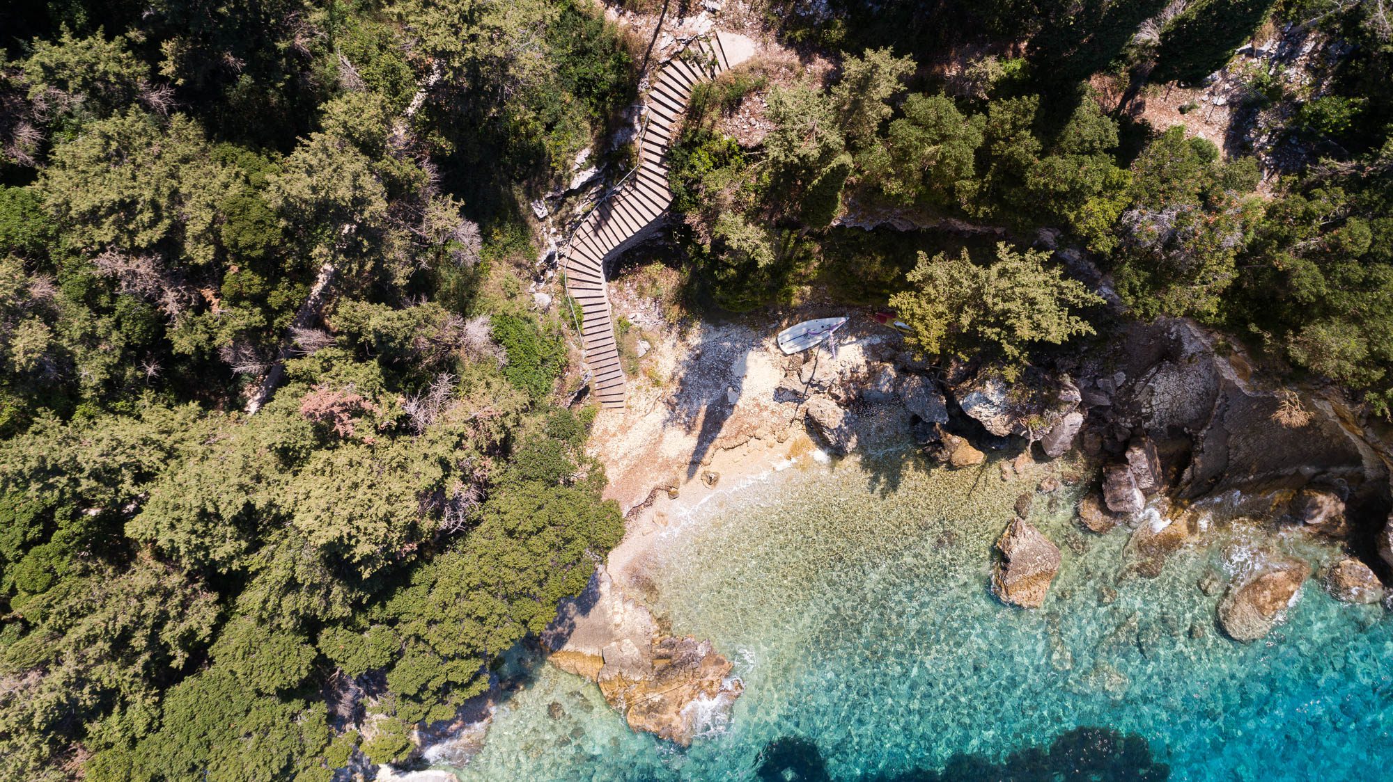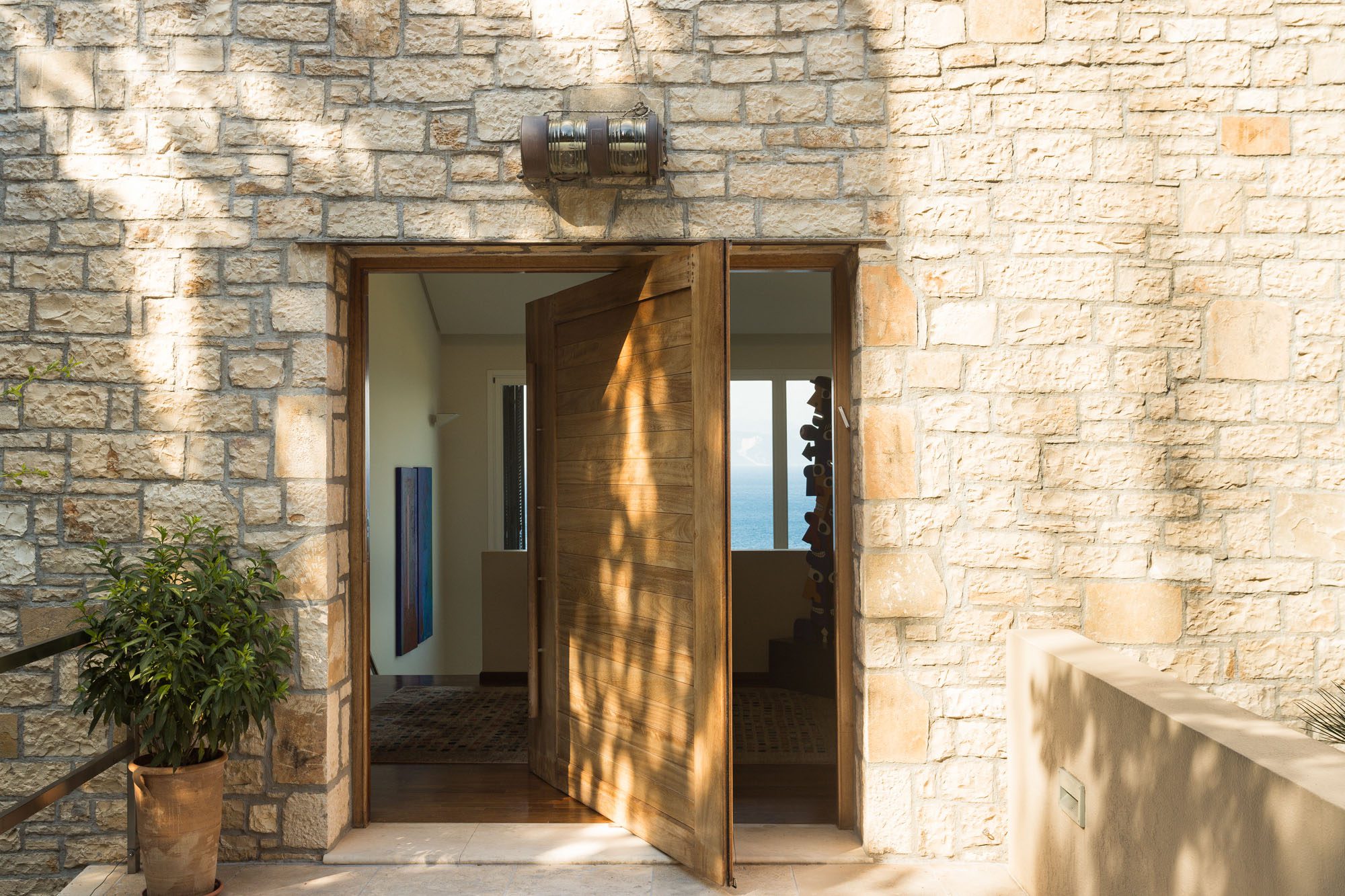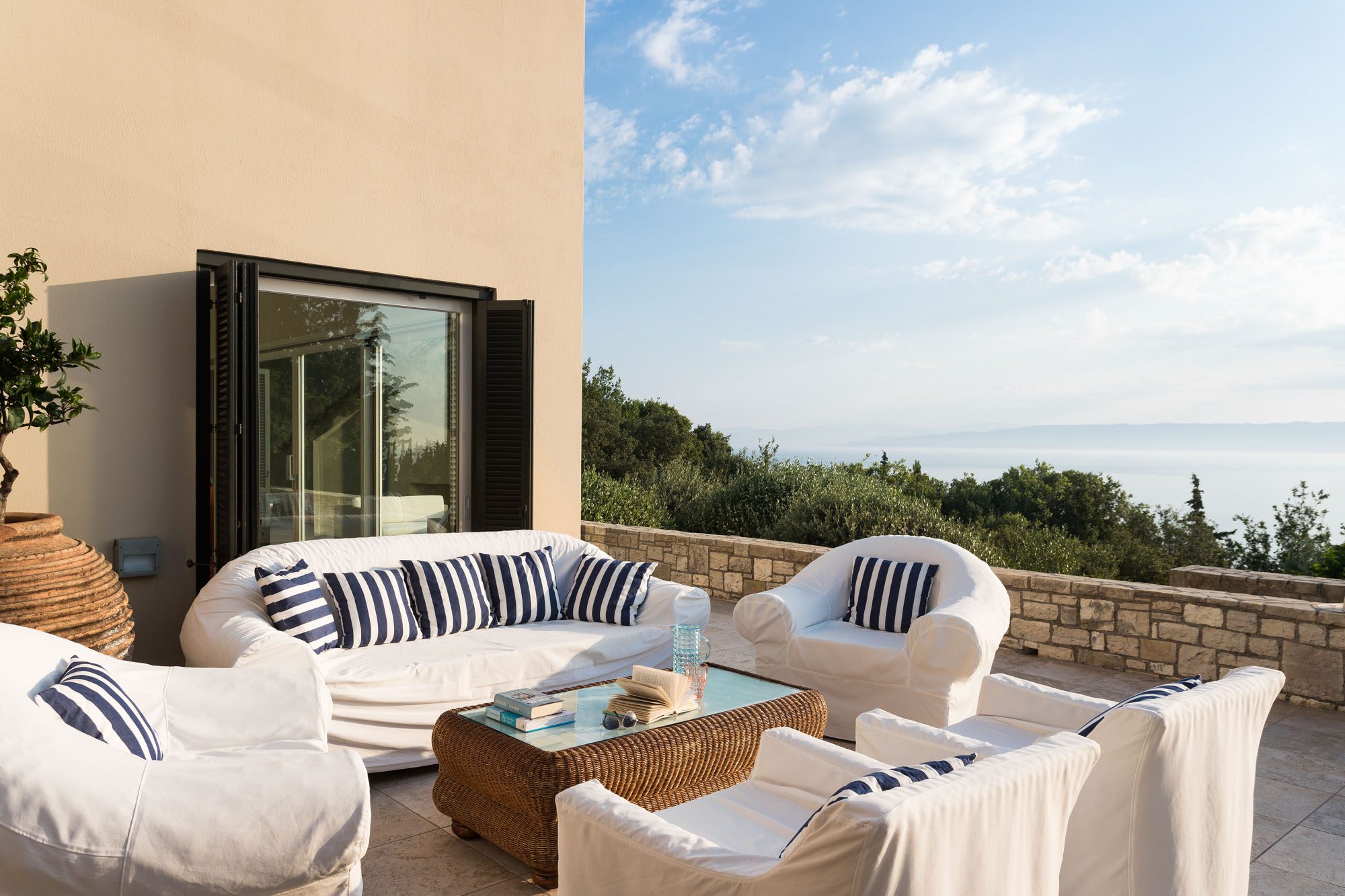 It's in a secluded spot on the east coast of Paxos but just a short drive to the villages of Loggos and Lakka. You can wander down the hillside path, ending in steps, to your own secluded cove with crystal blue waters and a little beach.