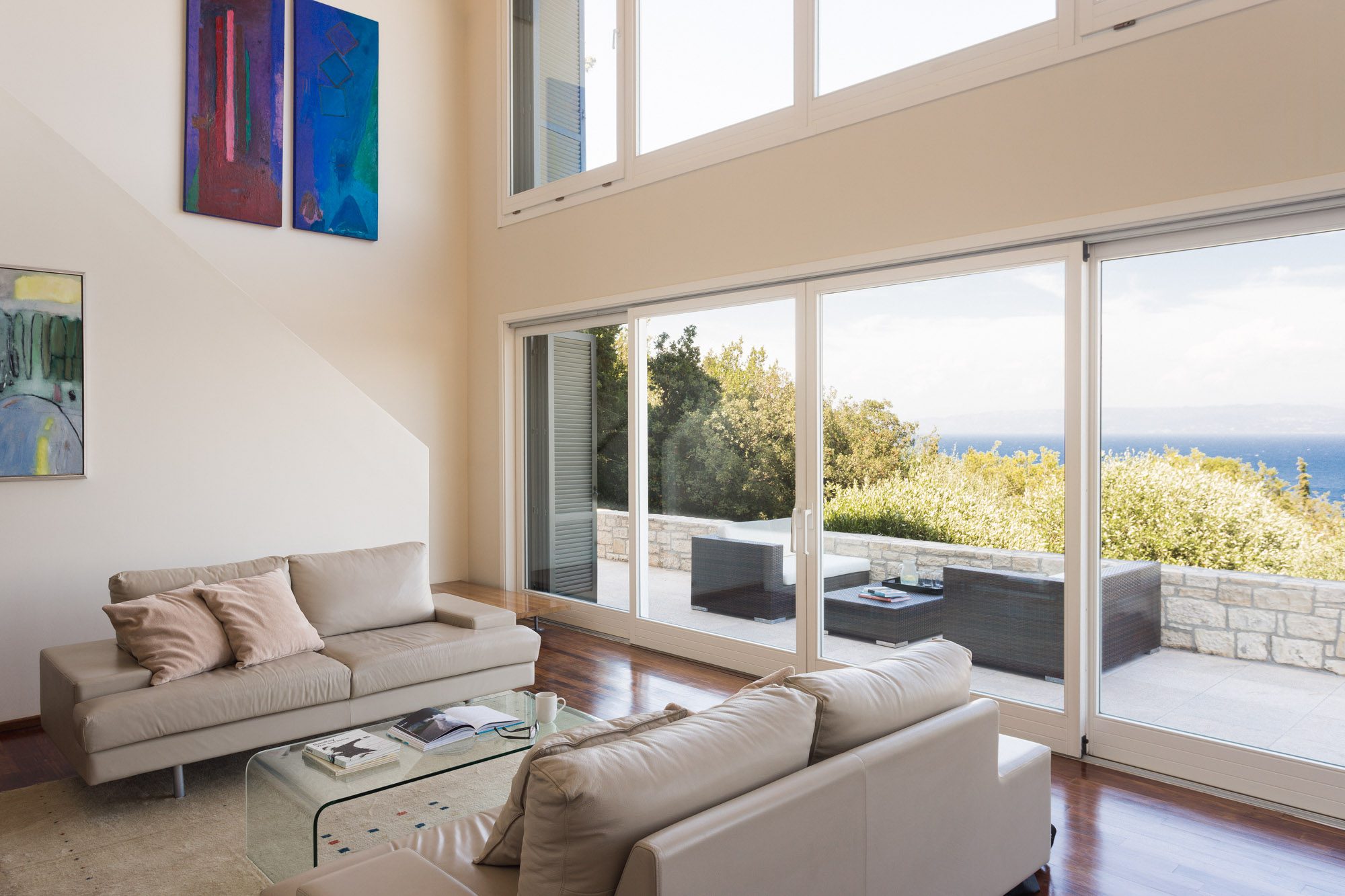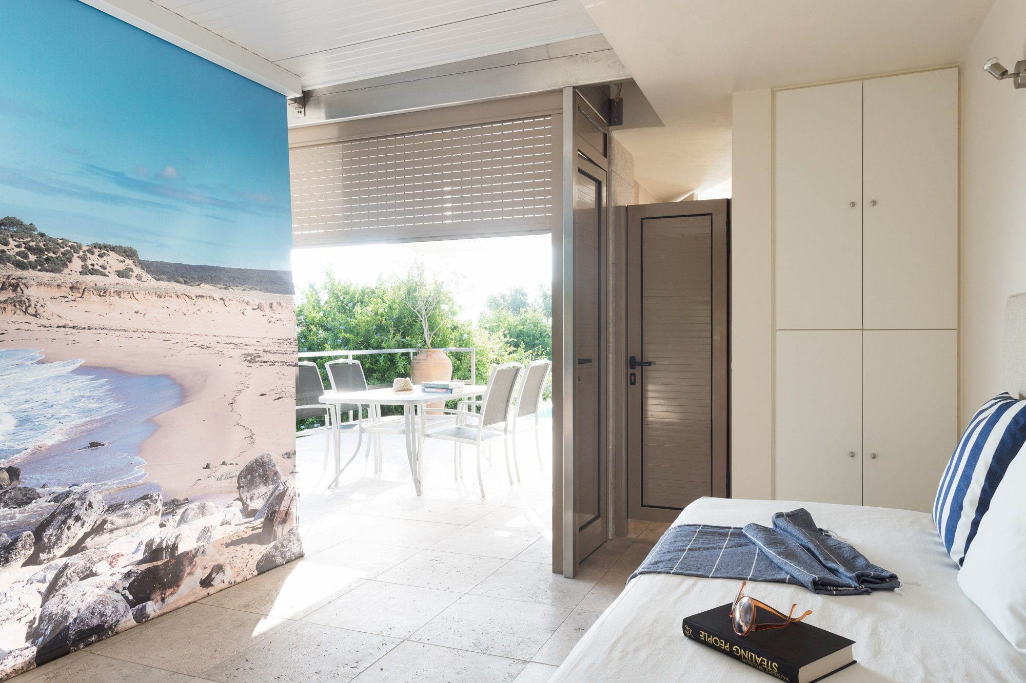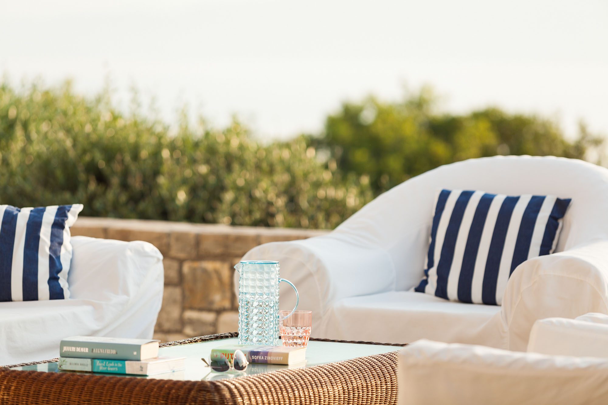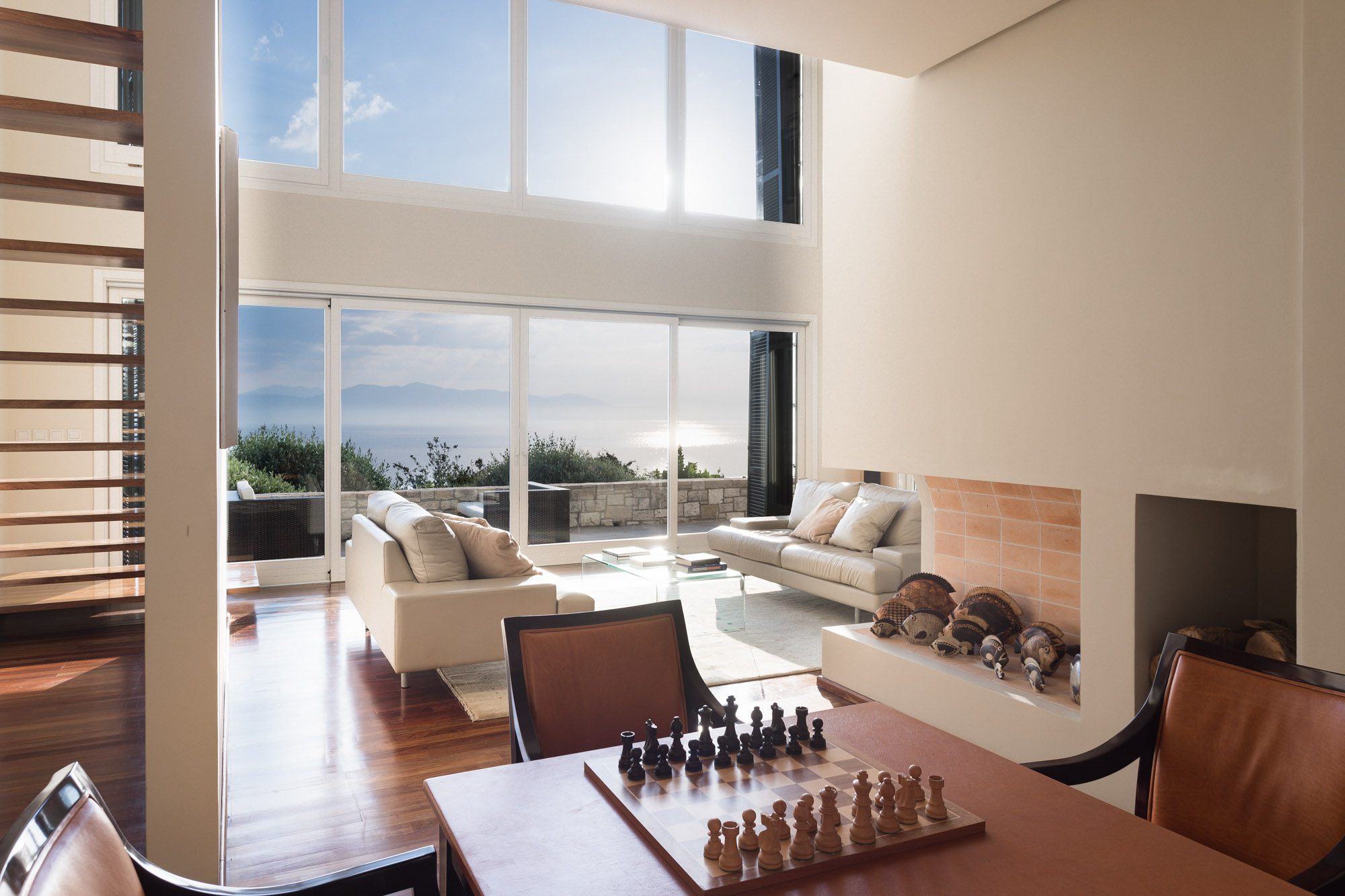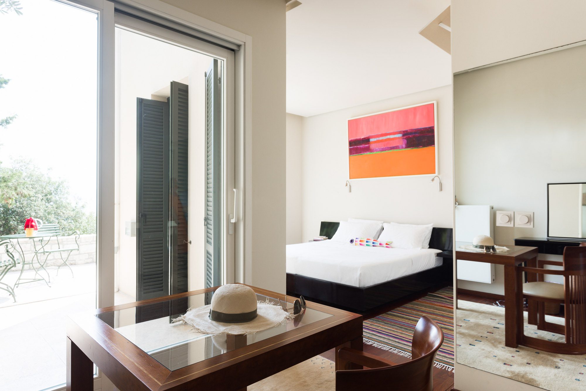It's in a secluded spot on the east coast of Paxos but just a short drive to the villages of Loggos and Lakka. You can wander down the hillside path, ending in steps, to your own secluded cove with crystal blue waters and a little beach.