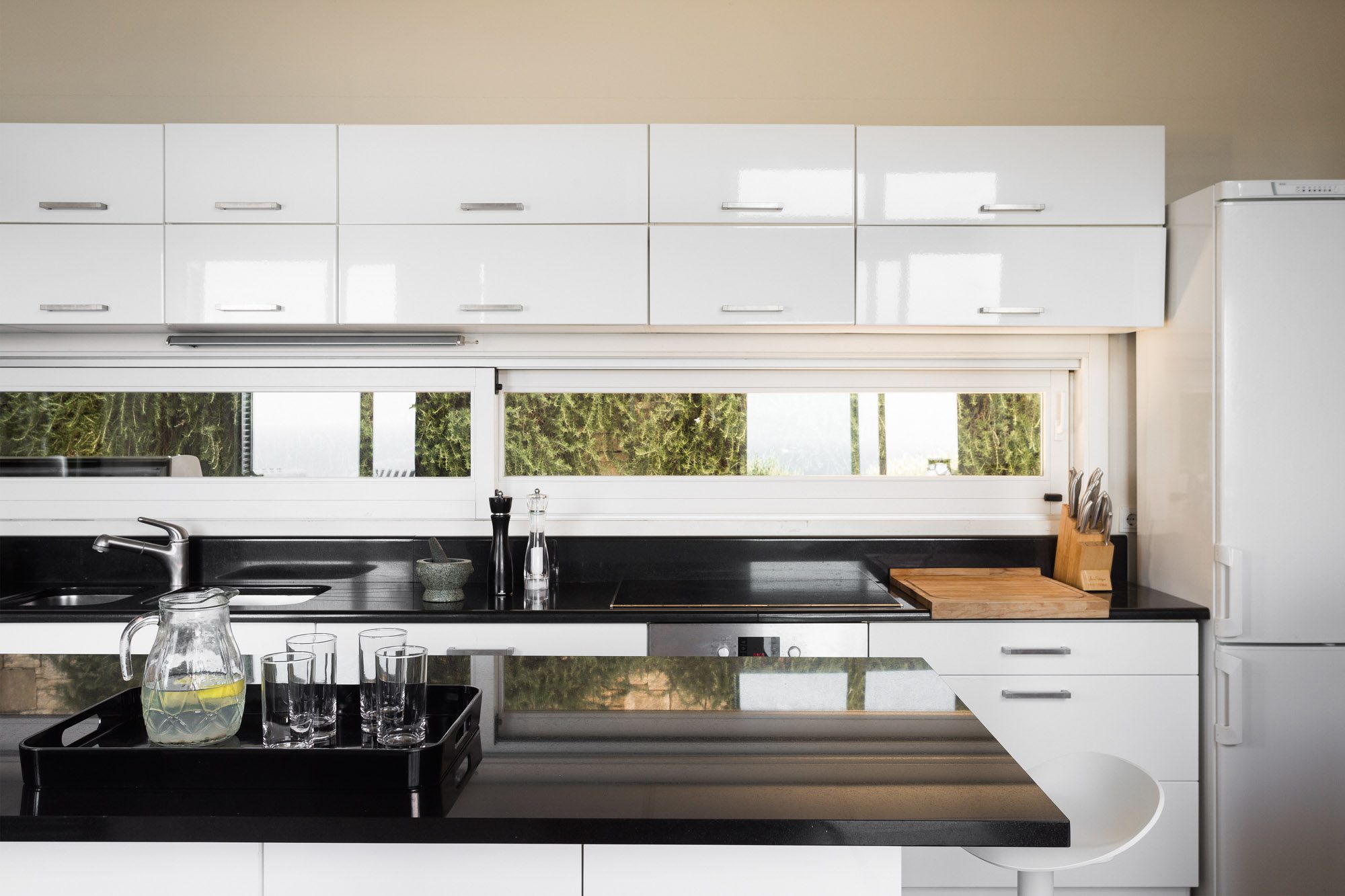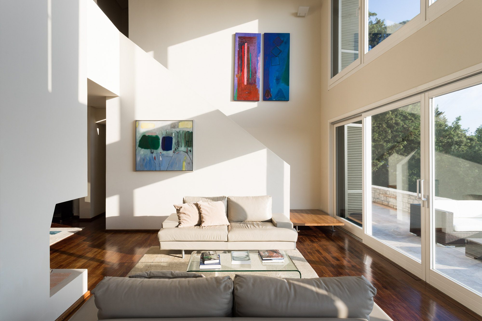 The interiors are chic and minimalist, decorated in neutral colours, with modern art adorning the walls and sleek contemporary furniture. The bedrooms are split across the main house and annexe; below the house is a gym, and one of the bedrooms is perfect for teenagers. There's also a study and a well-equipped kitchen.