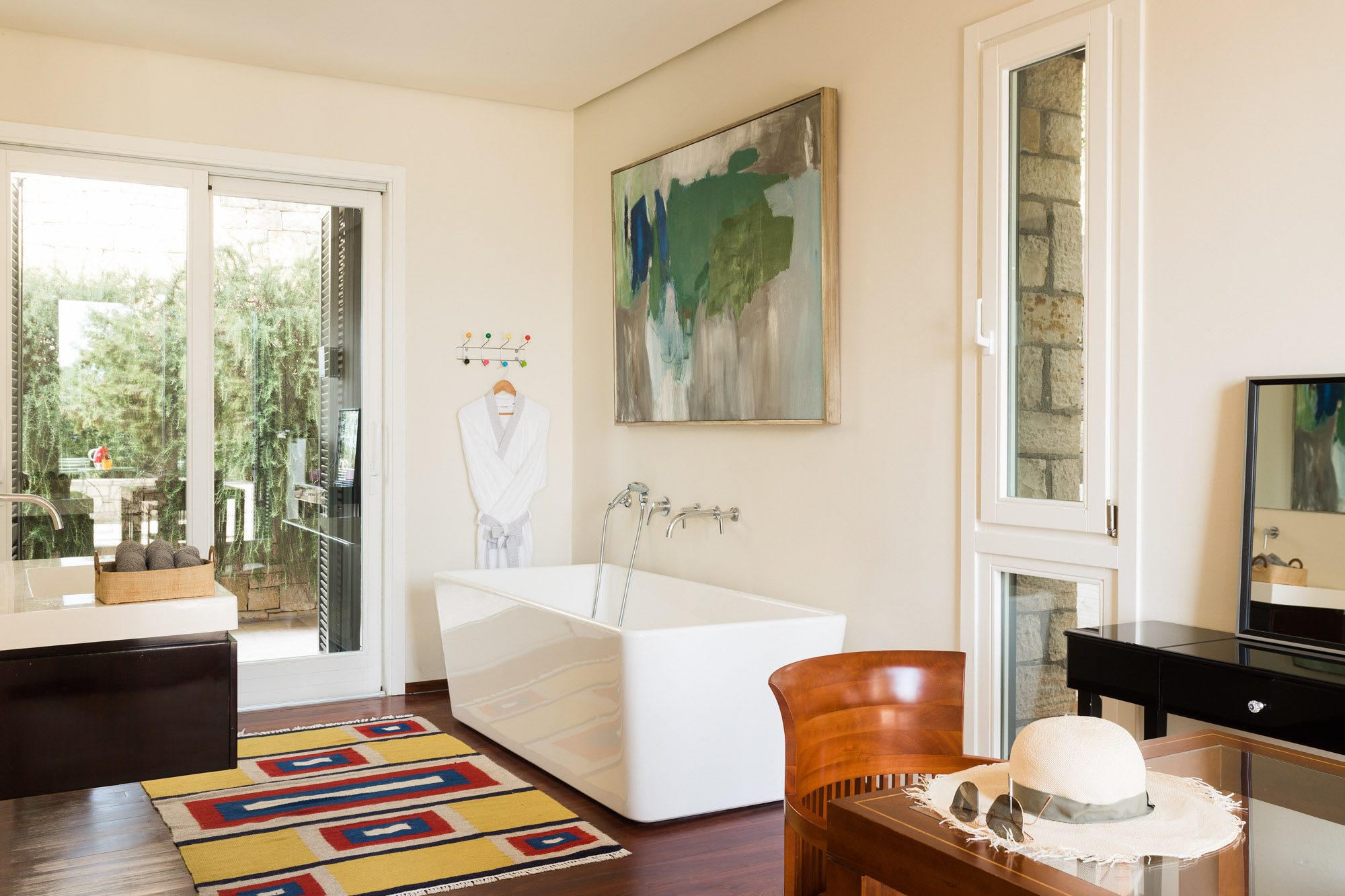 There's a choice of comfortable seating, two covered dining terraces, a curved infinity pool, a barbecue and a private floodlit tennis court. Kids will love the treehouse below the house, accessed by a little wooden bridge. Table tennis and boules are also provided.