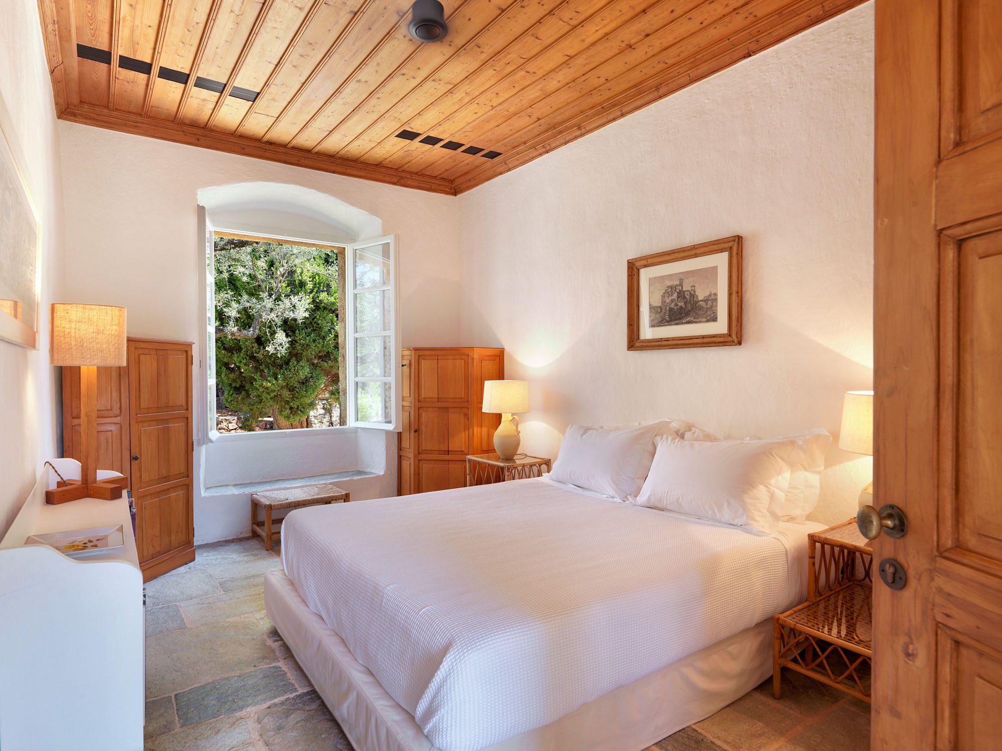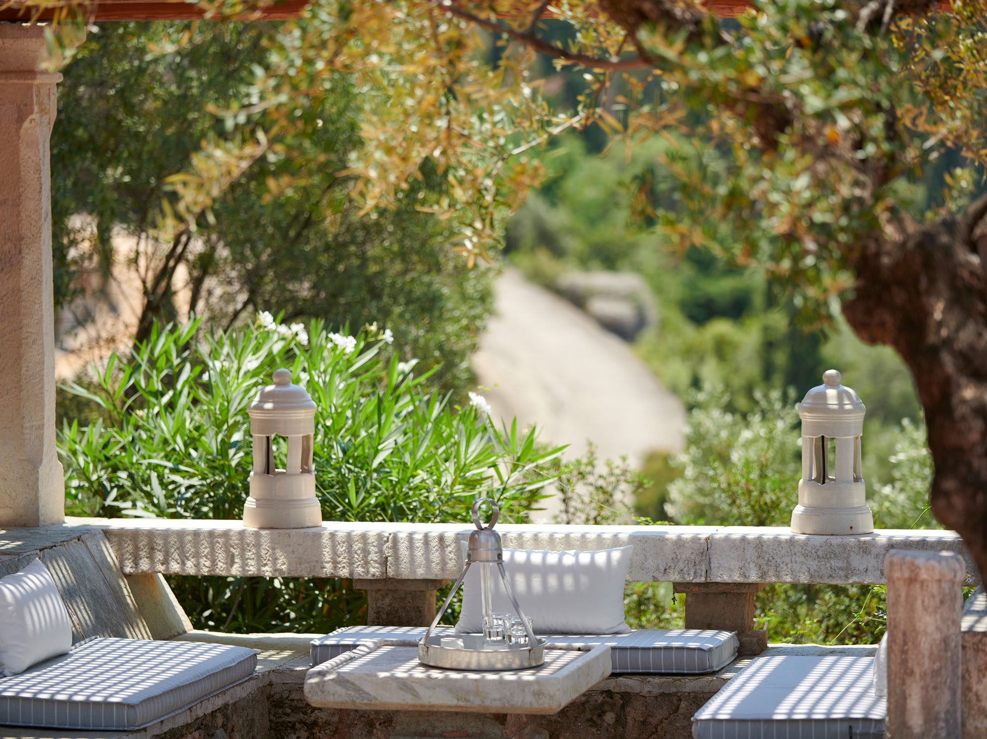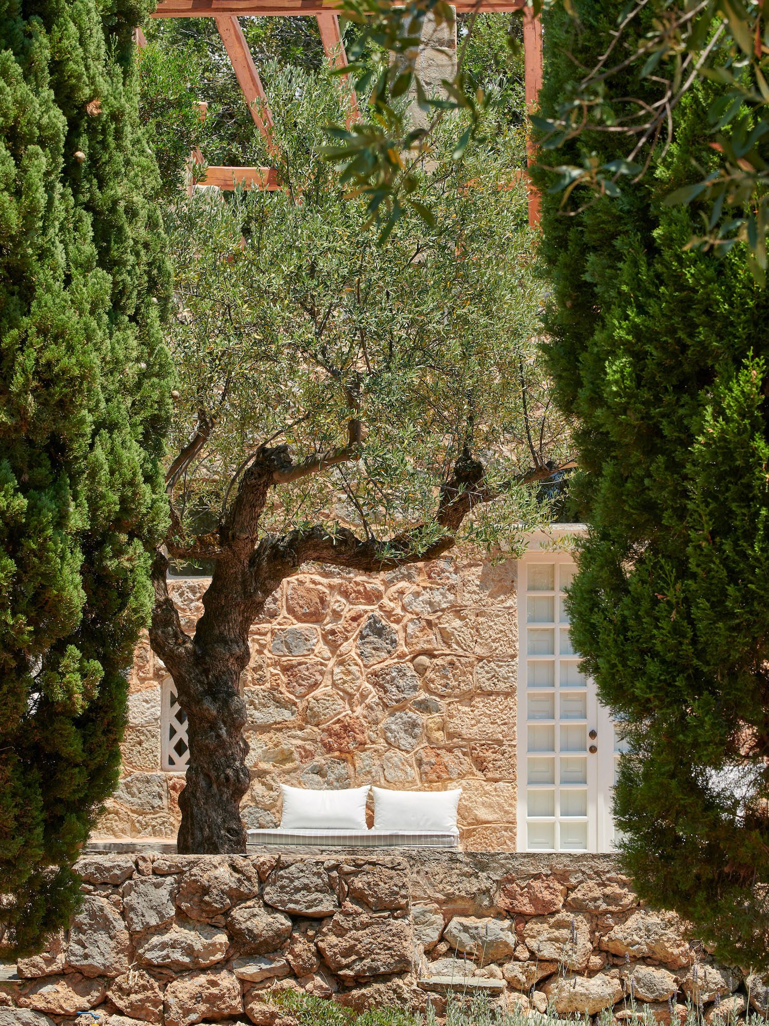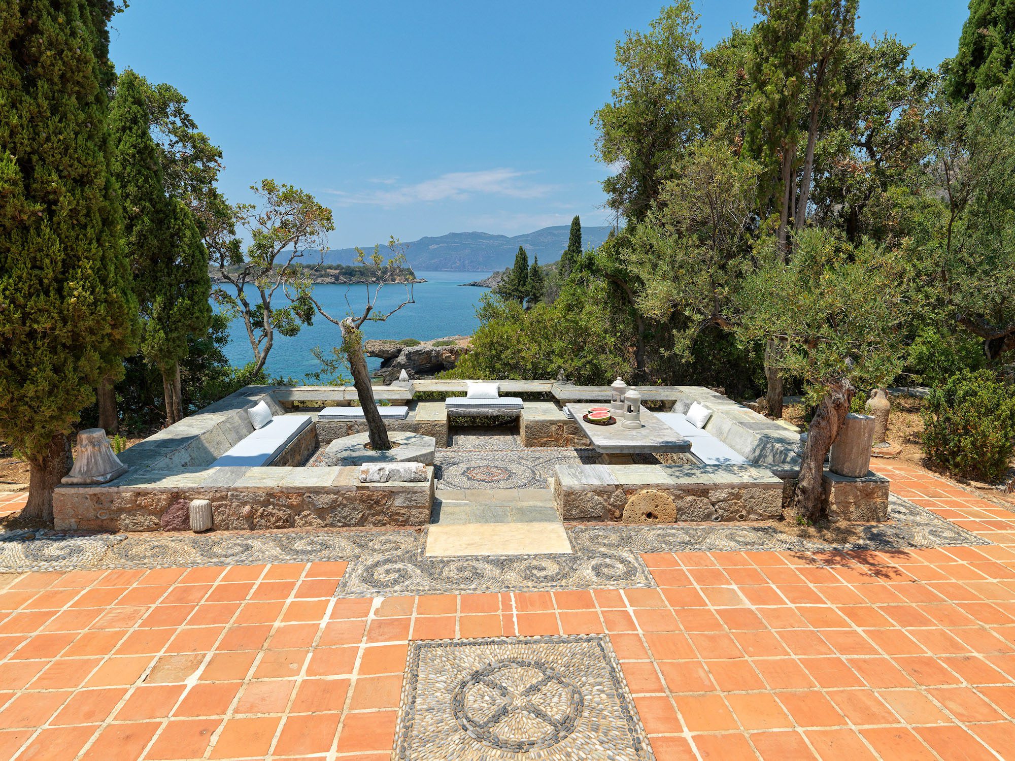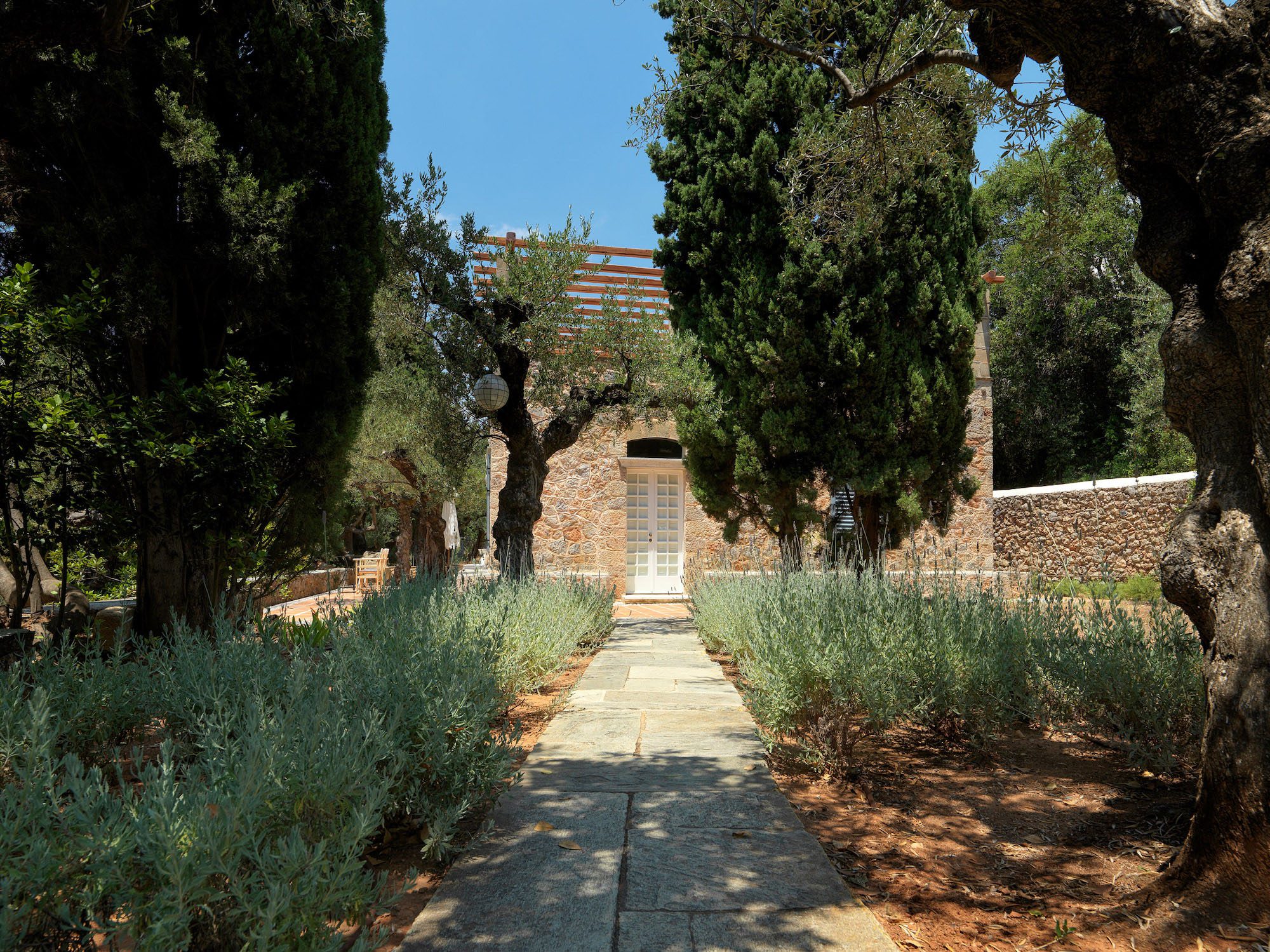 Surrounded by a lush Mediterranean garden of olive and cypress trees, white oleanders, fragrant shrubs, and wildflowers that gently slope down to the sea, the estate is a true haven.