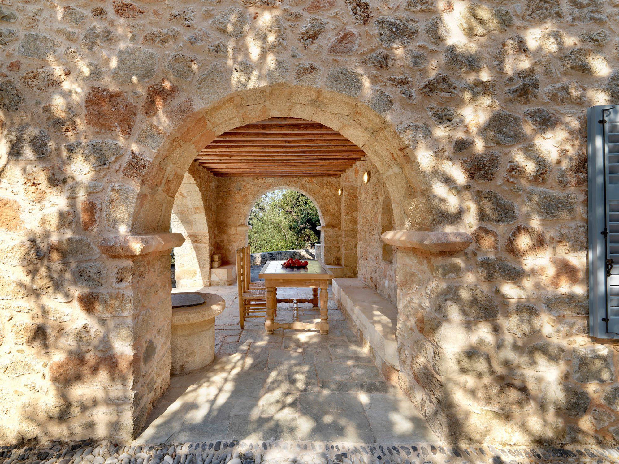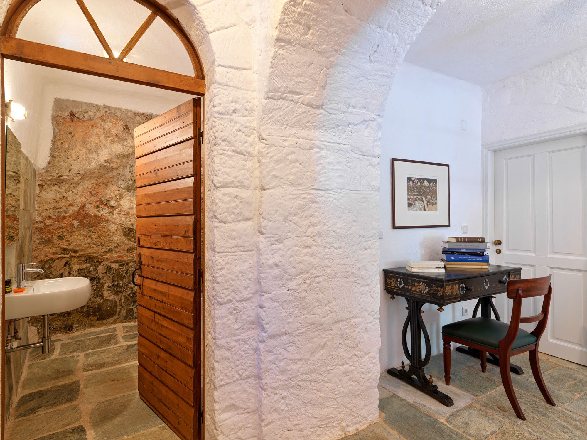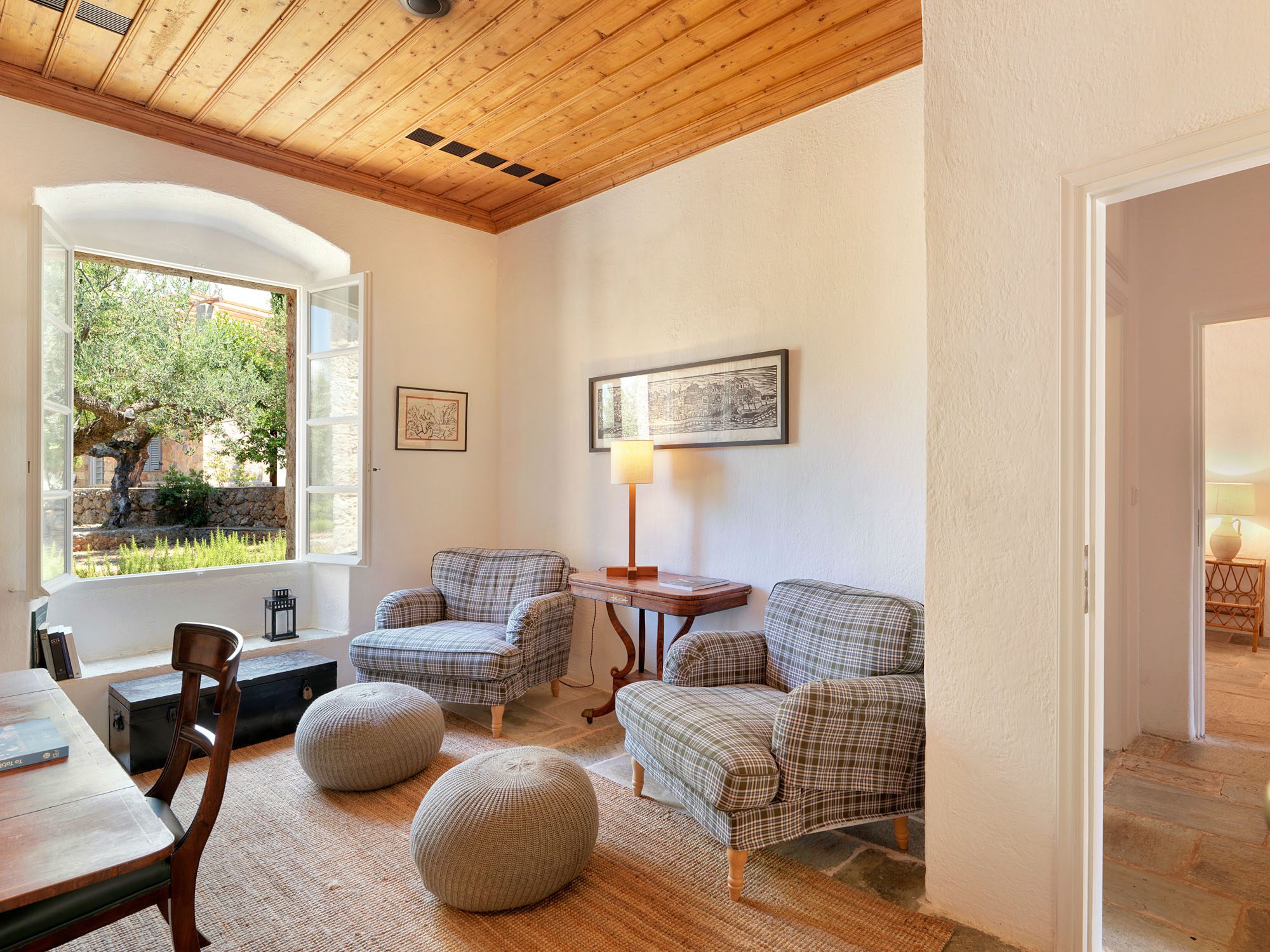 The house comprises three traditional stone buildings: the main house with three beautifully appointed suites, the traditional house, formerly the writer’s office, and the guest house.
