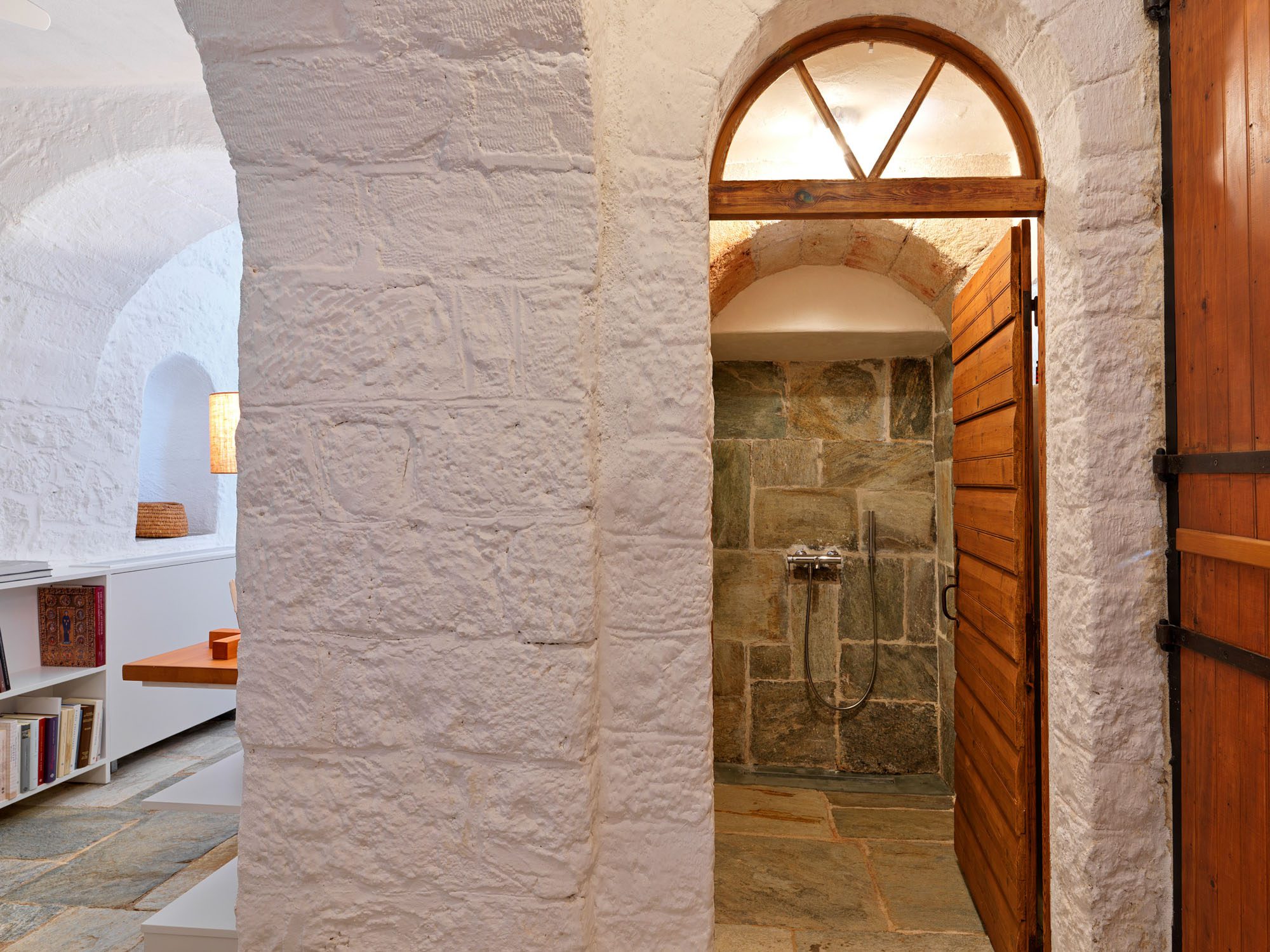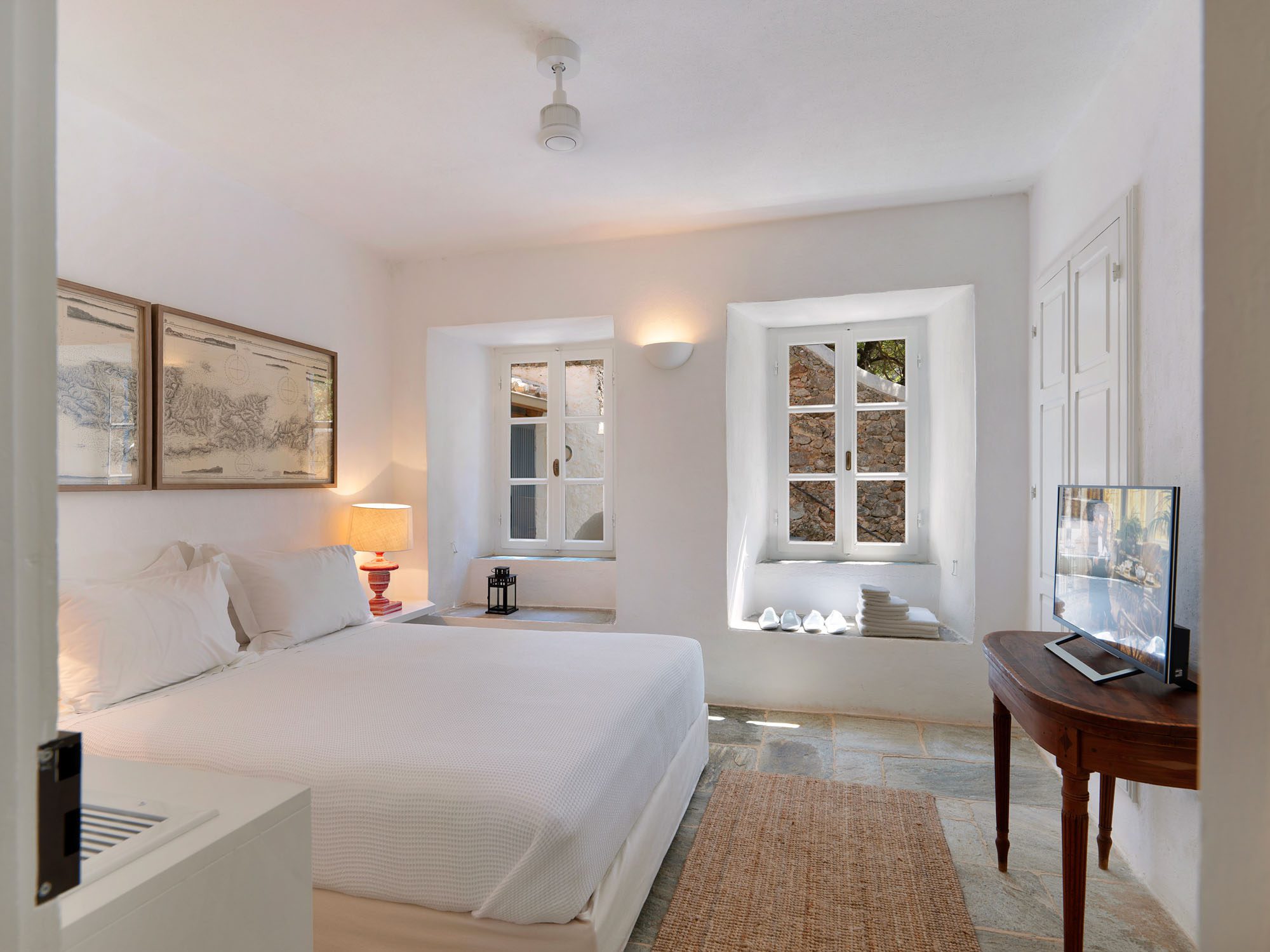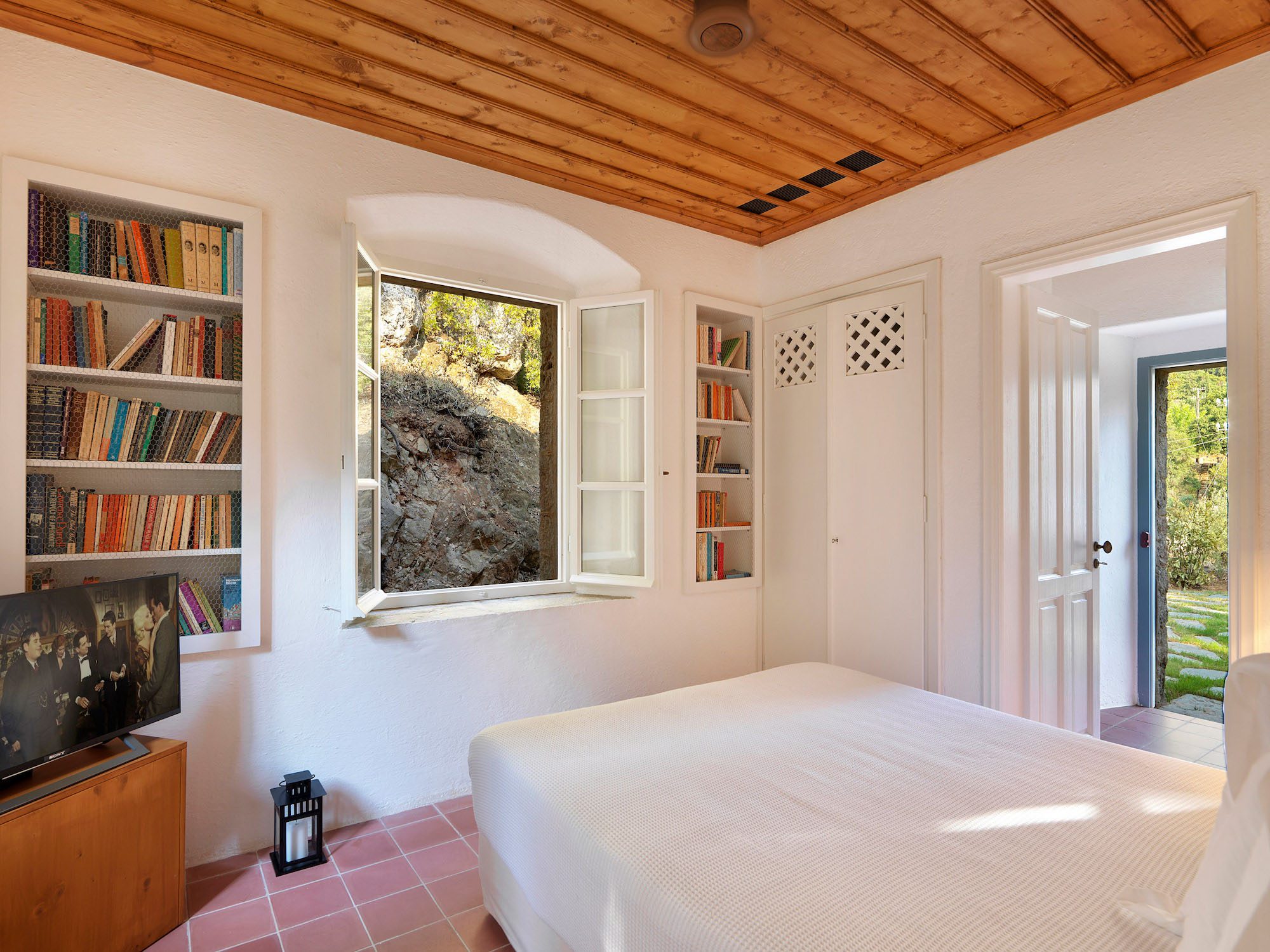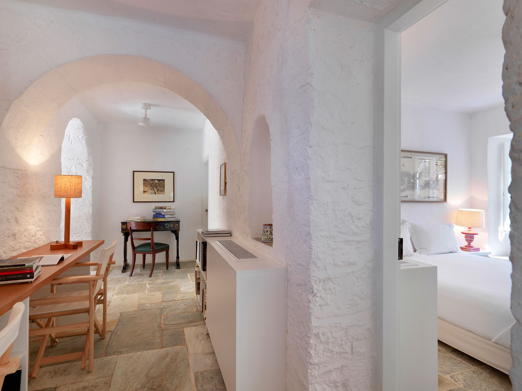 The house comprises three traditional stone buildings: the main house with three beautifully appointed suites, the traditional house, formerly the writer’s office, and the guest house.