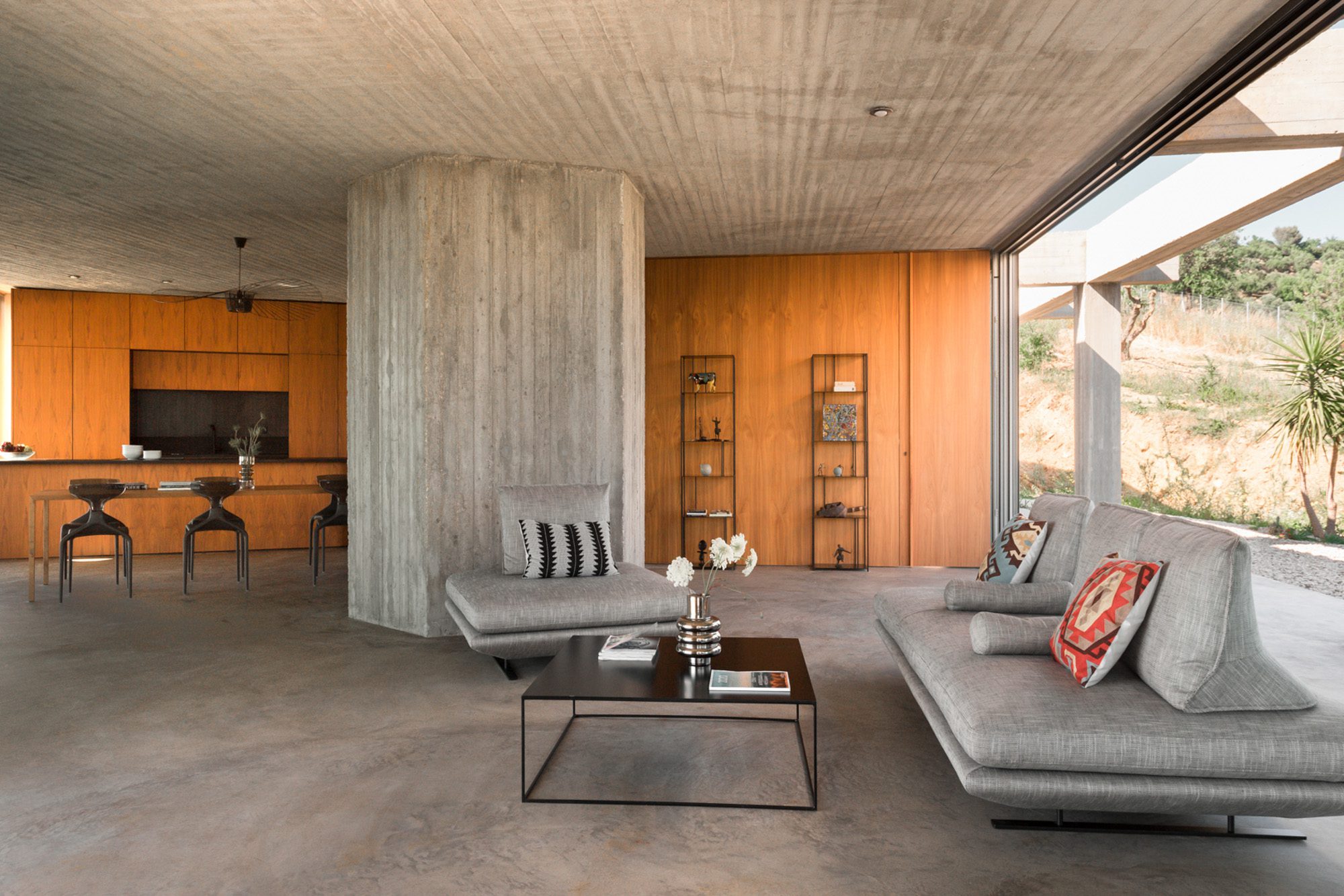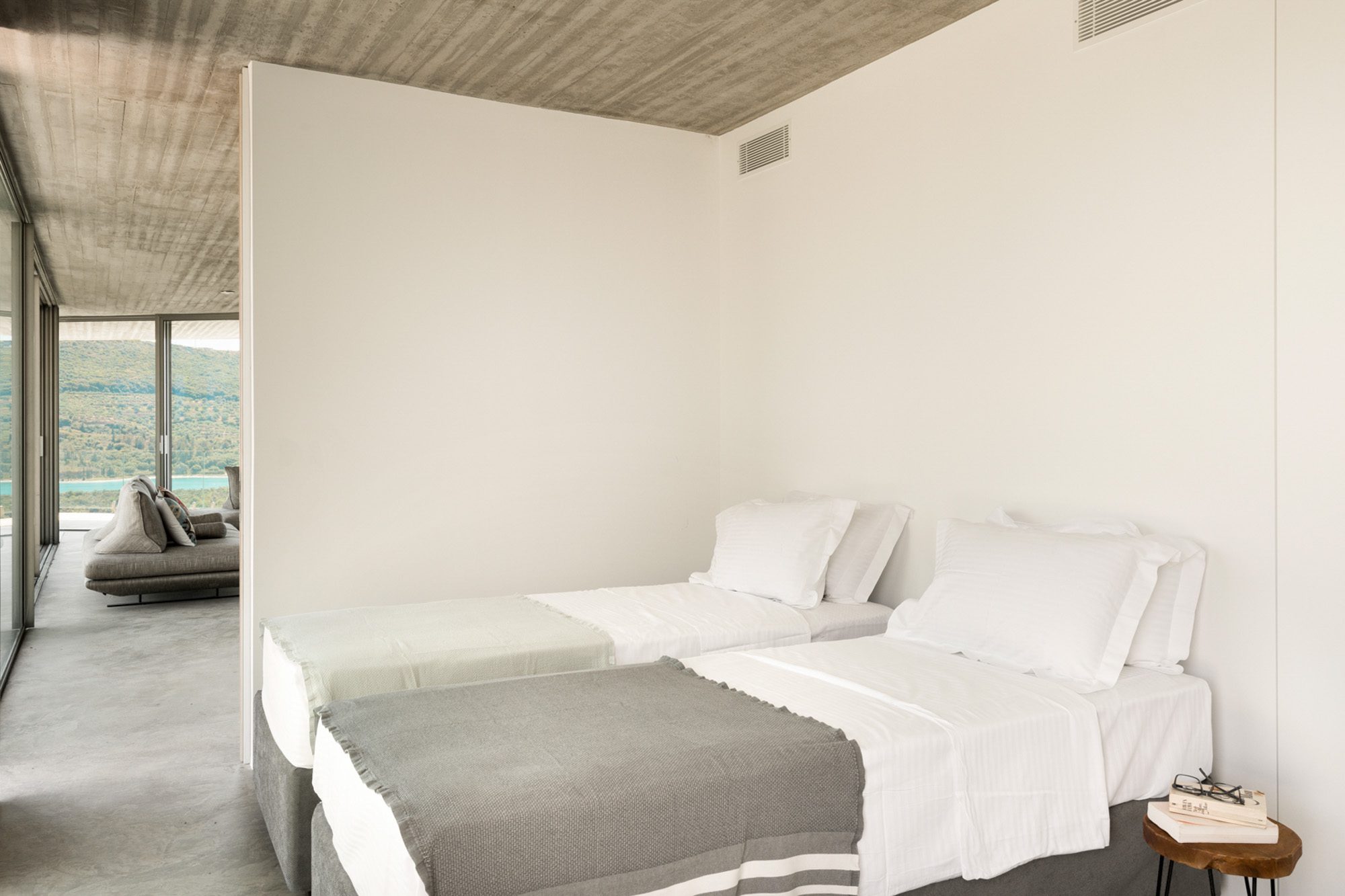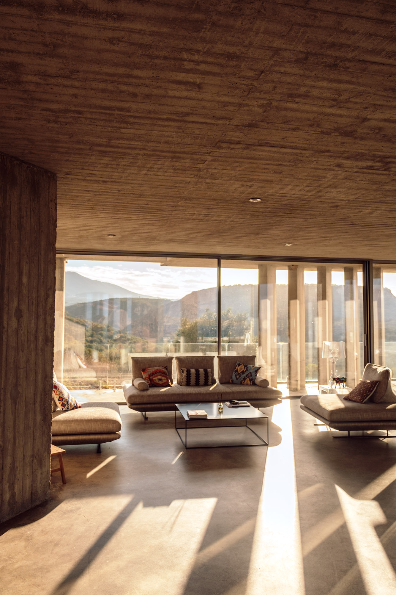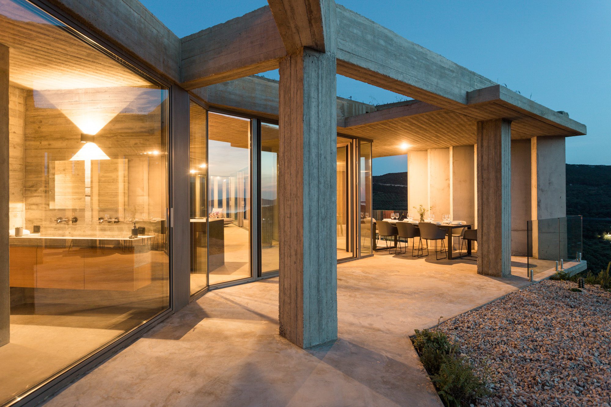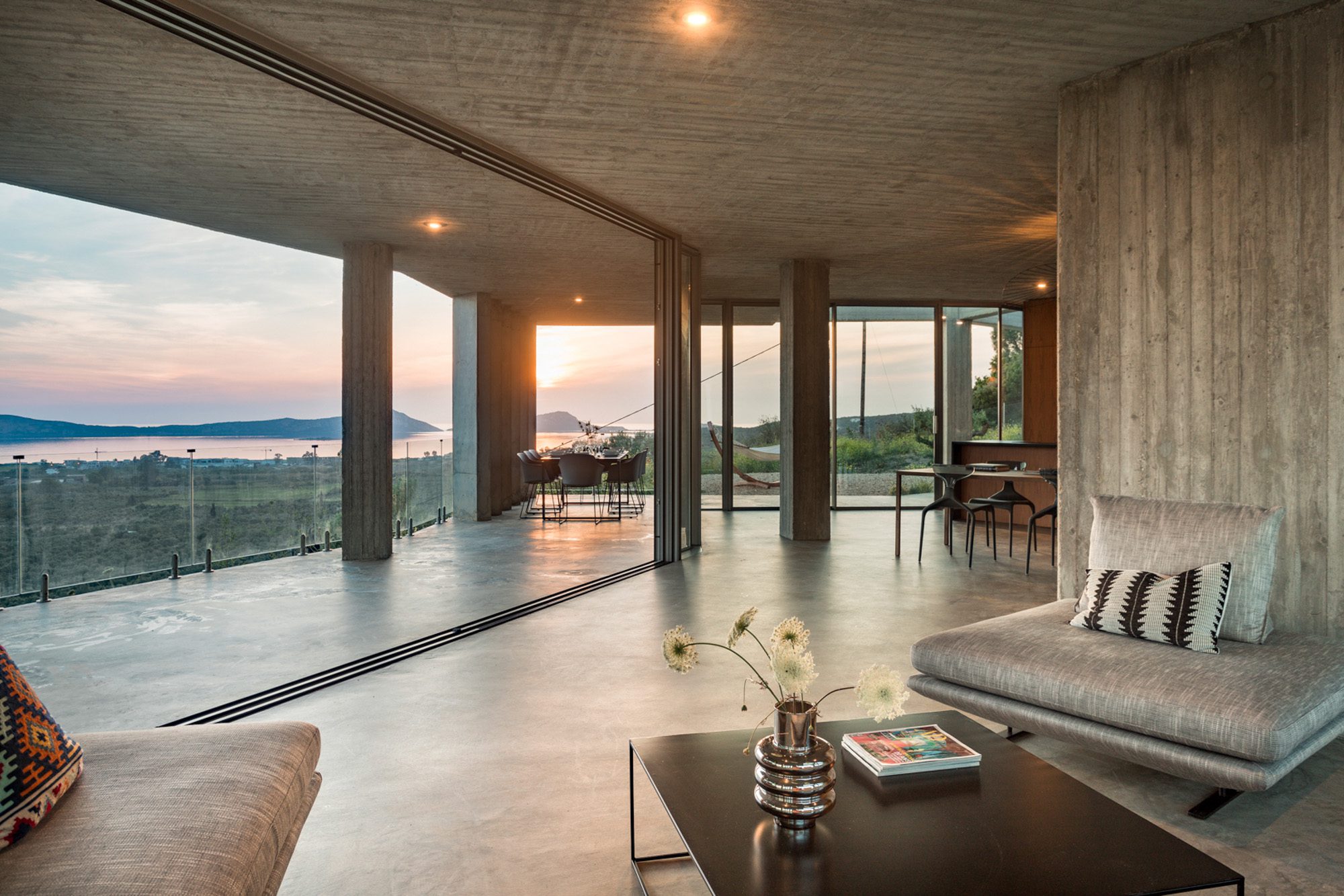Three bedrooms are on the main floor, all with huge windows and access to the terrace. A further en suite bedroom is on the lower floor. The capacious open-plan living area has a TV end with big floor cushions, a separate sitting area with comfortable sofas, a dining space and a fitted kitchen. Floor-to-ceiling windows maximise the views and give a feeling of connecting with the landscape.