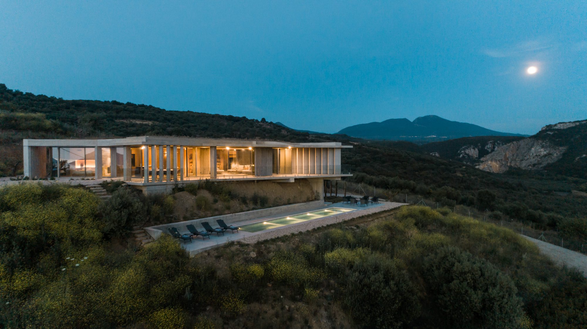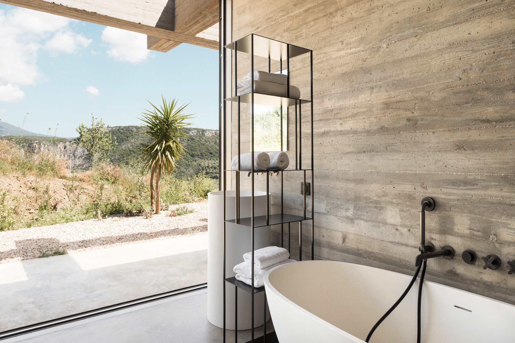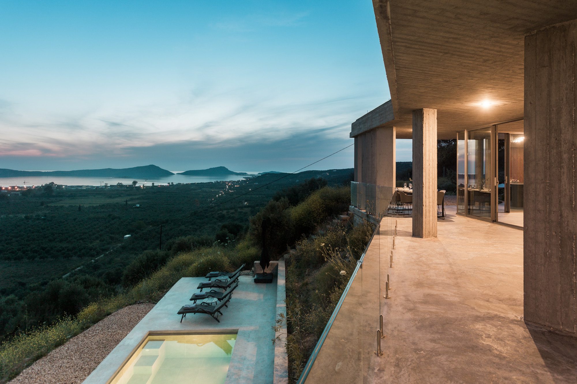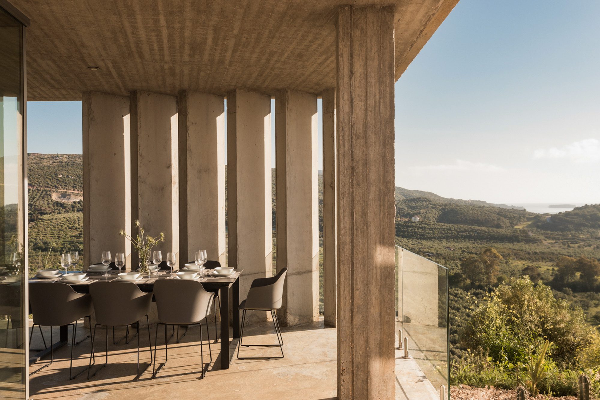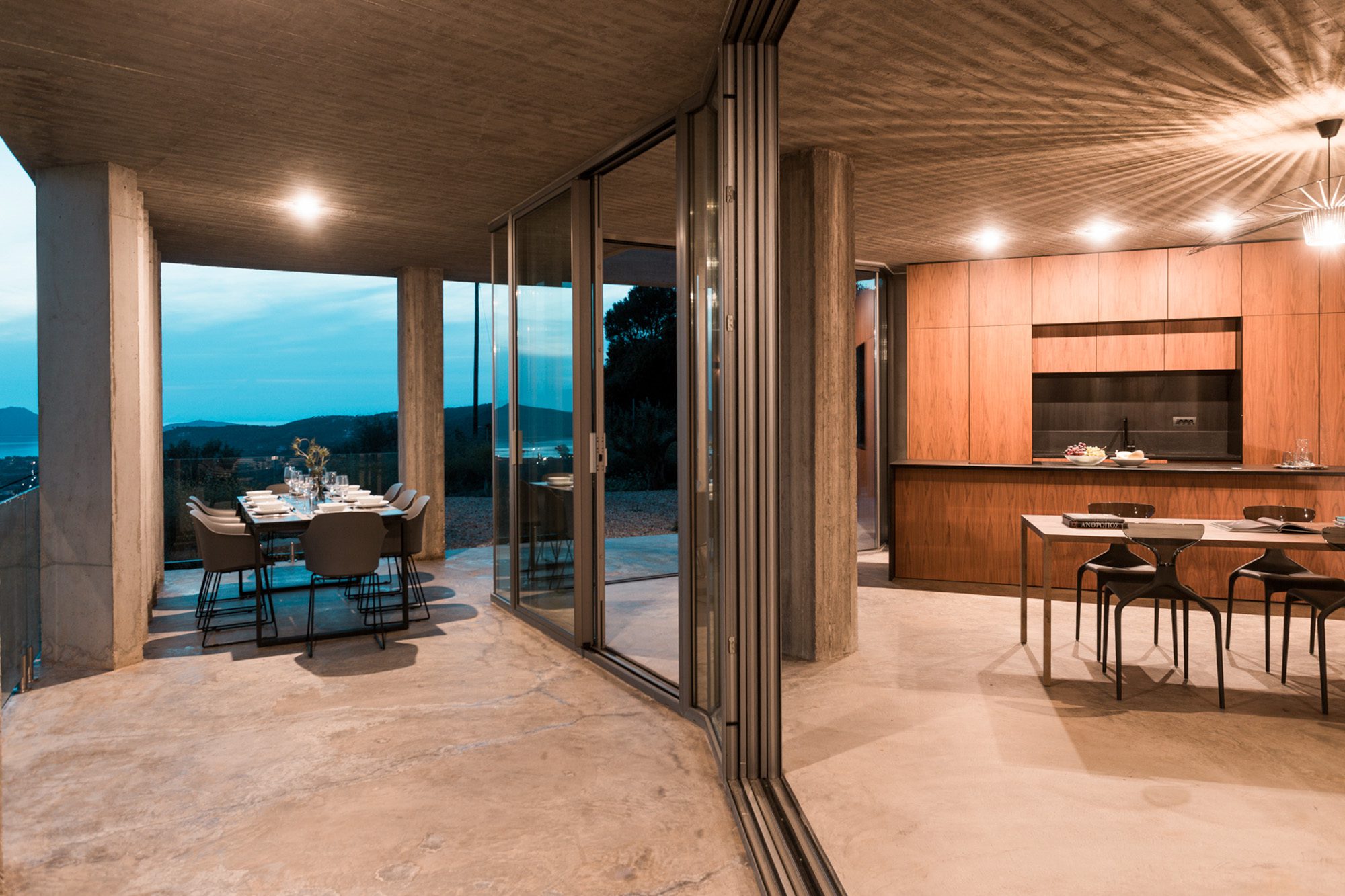 Three bedrooms are on the main floor, all with huge windows and access to the terrace. A further en suite bedroom is on the lower floor. The capacious open-plan living area has a TV end with big floor cushions, a separate sitting area with comfortable sofas, a dining space and a fitted kitchen. Floor-to-ceiling windows maximise the views and give a feeling of connecting with the landscape.