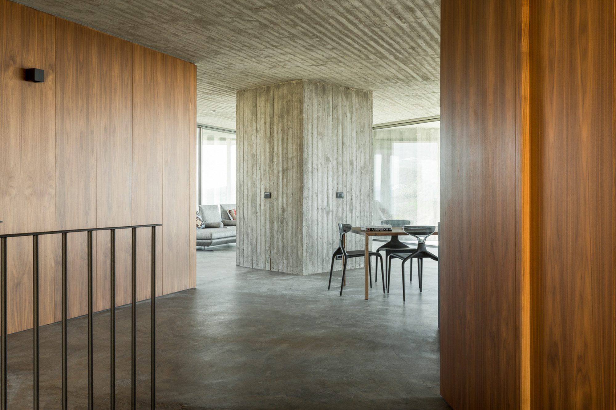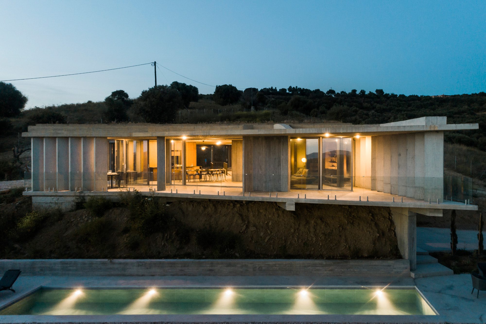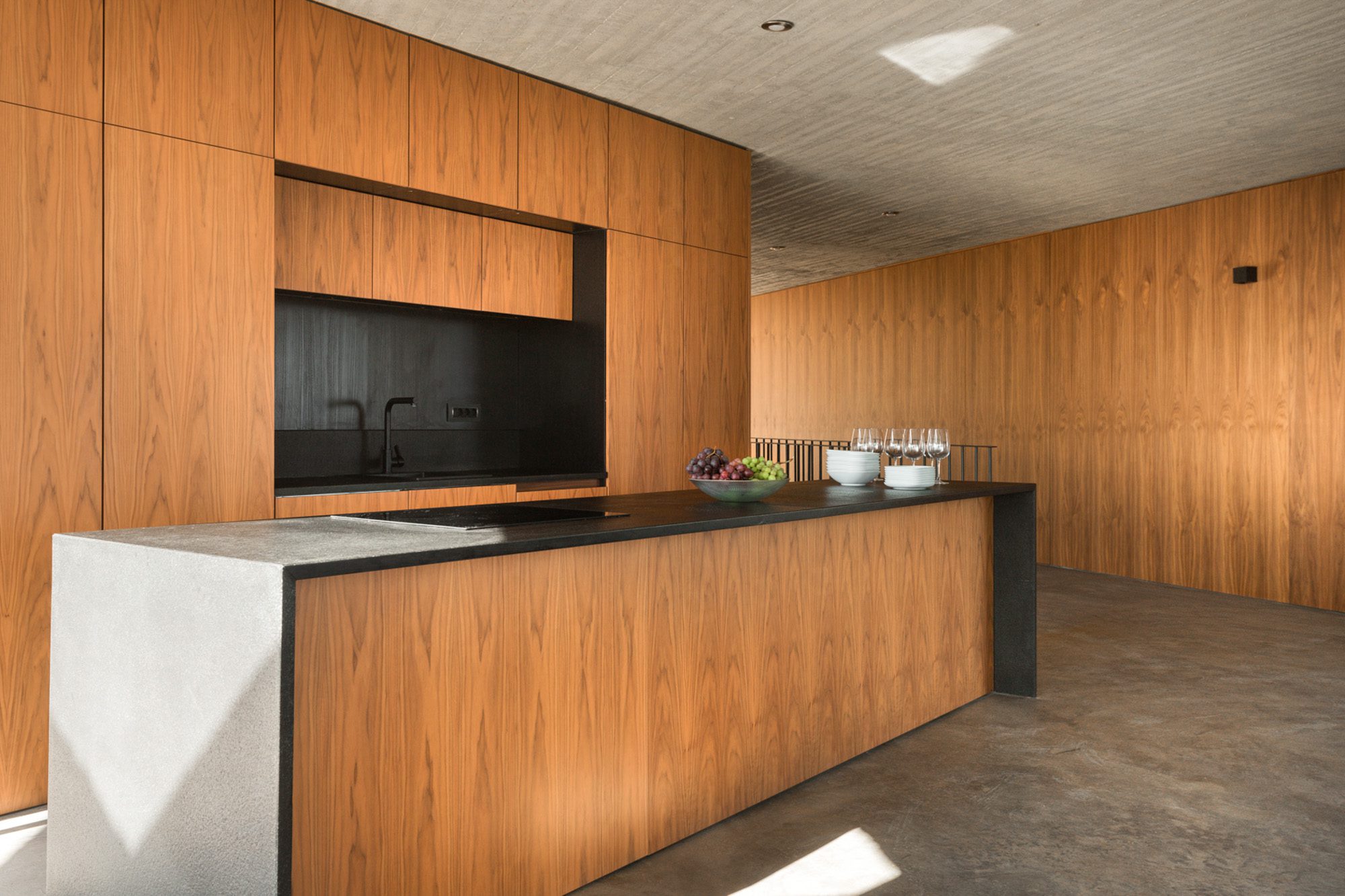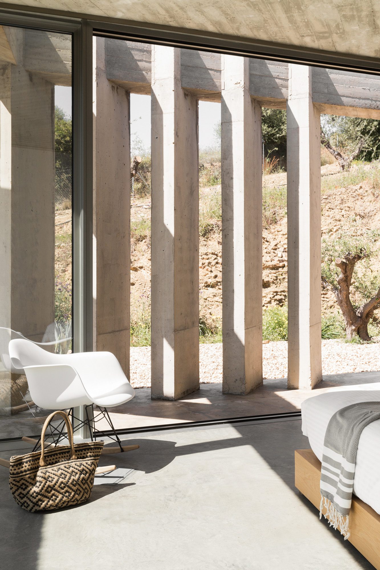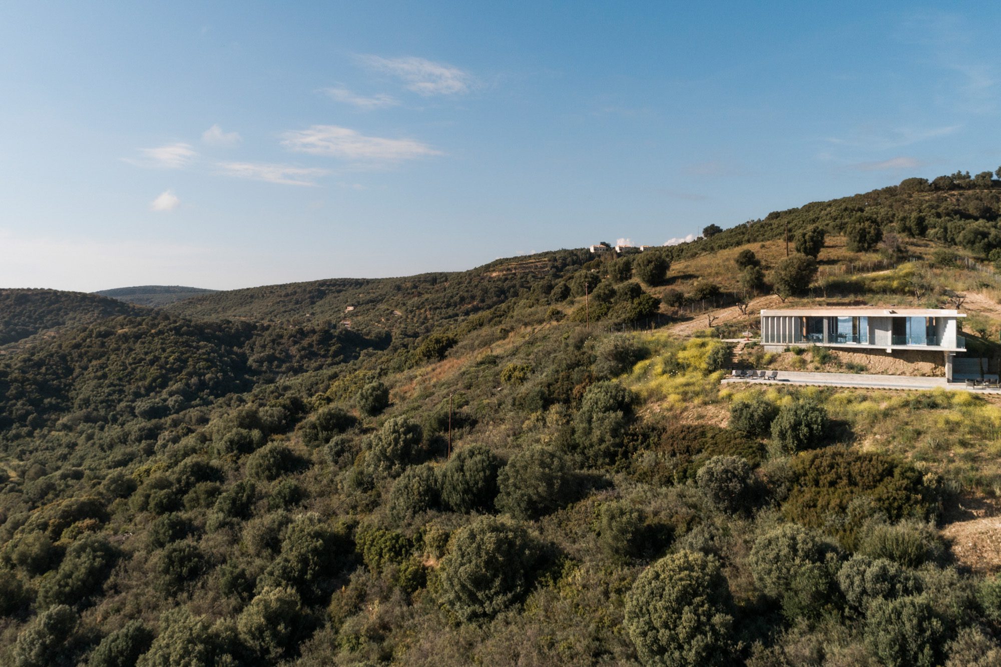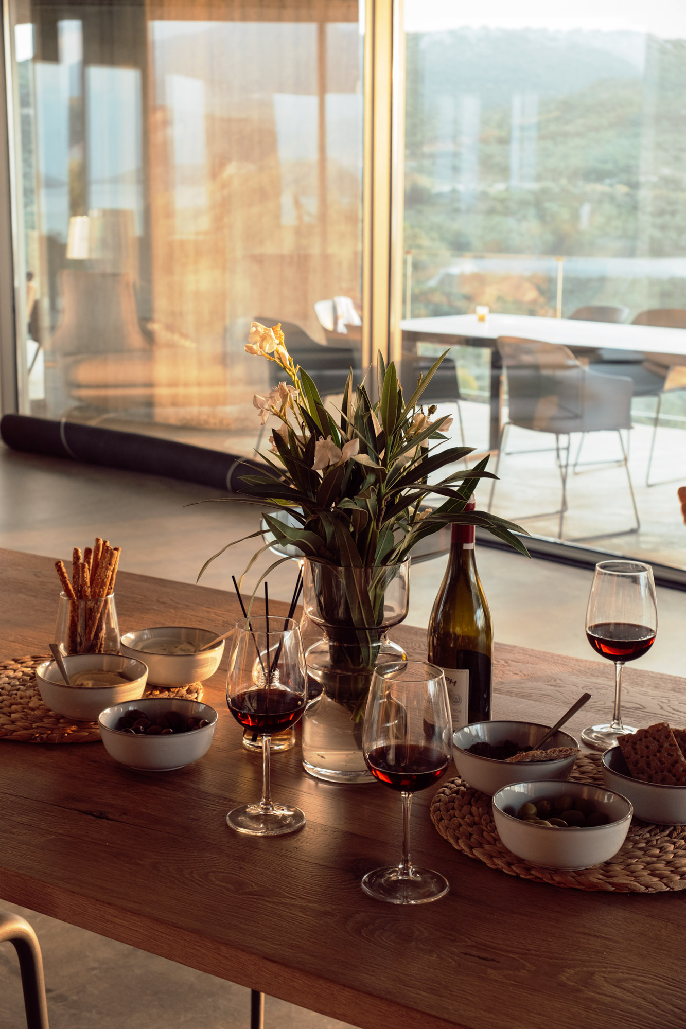 Three bedrooms are on the main floor, all with huge windows and access to the terrace. A further en suite bedroom is on the lower floor. The capacious open-plan living area has a TV end with big floor cushions, a separate sitting area with comfortable sofas, a dining space and a fitted kitchen. Floor-to-ceiling windows maximise the views and give a feeling of connecting with the landscape.