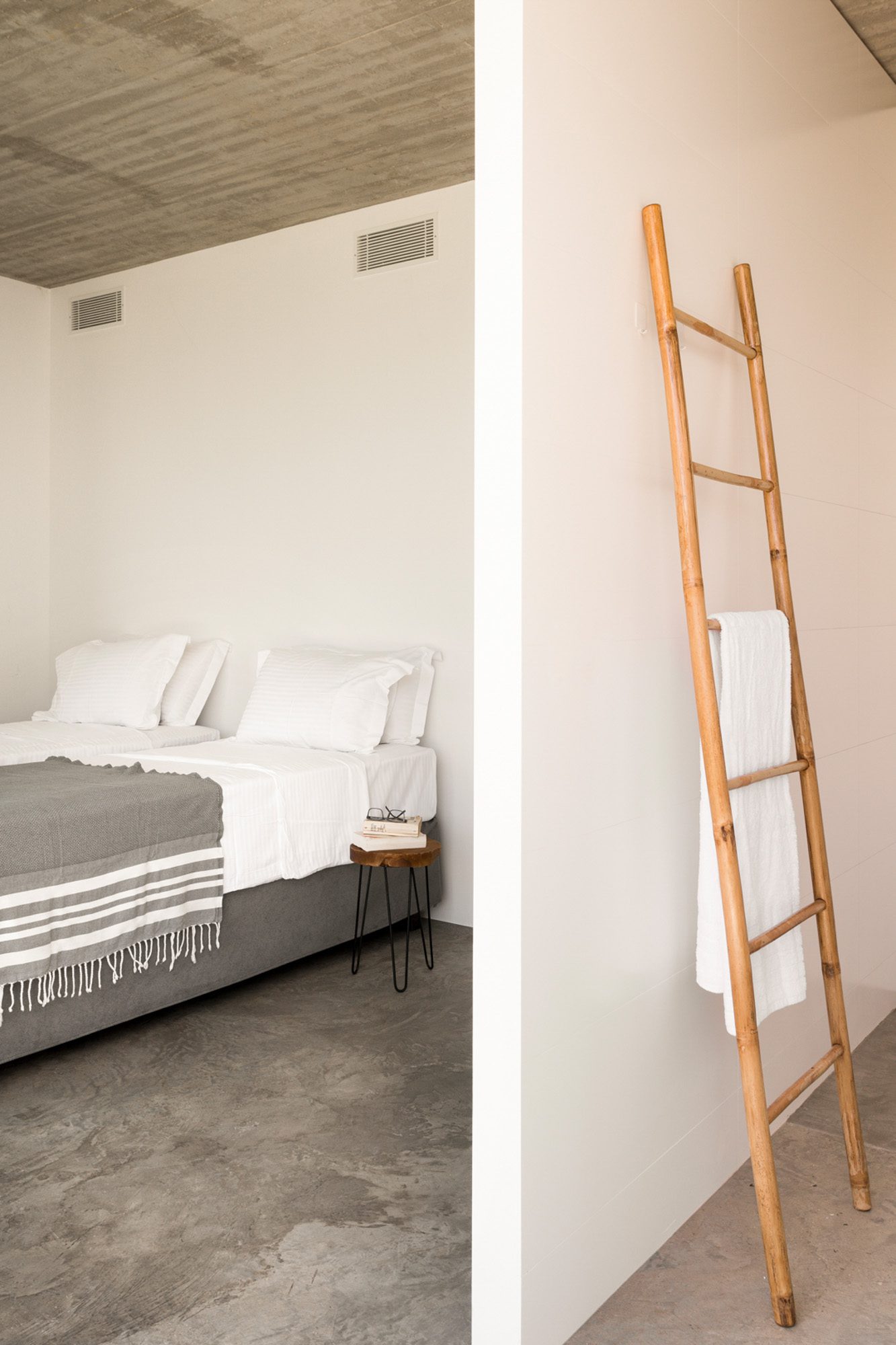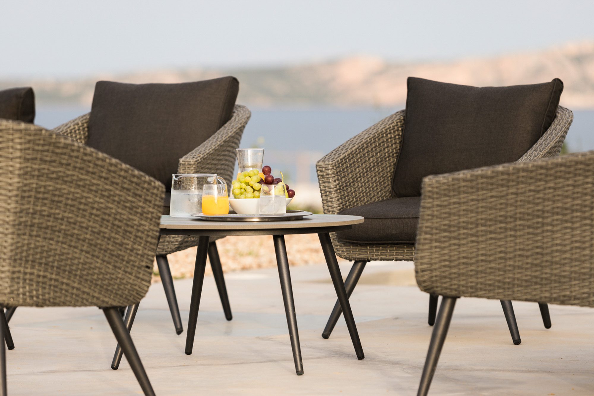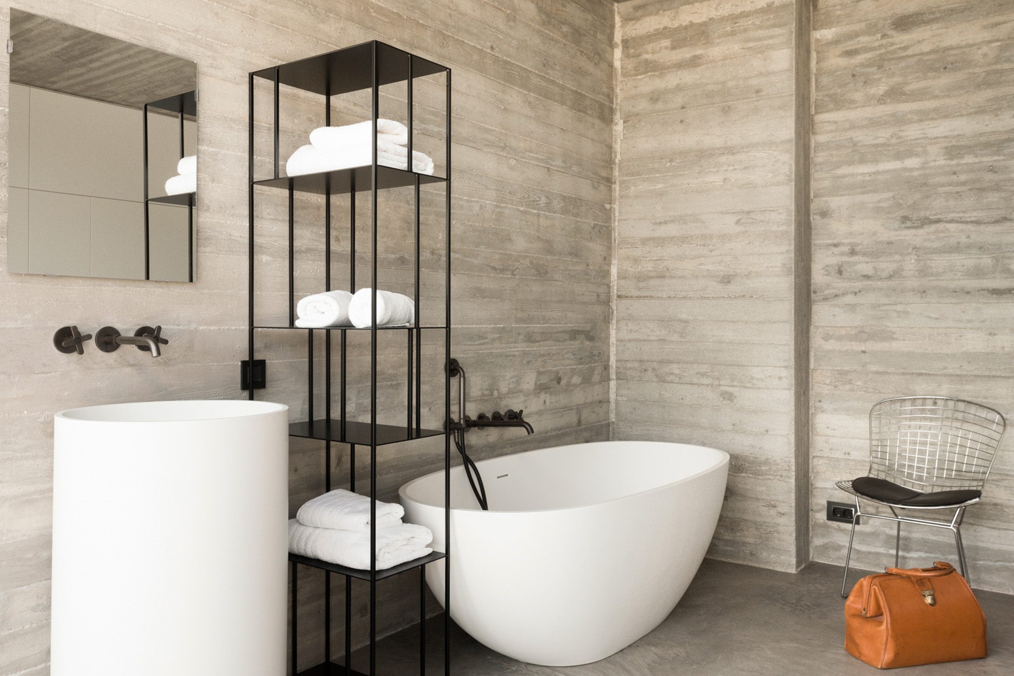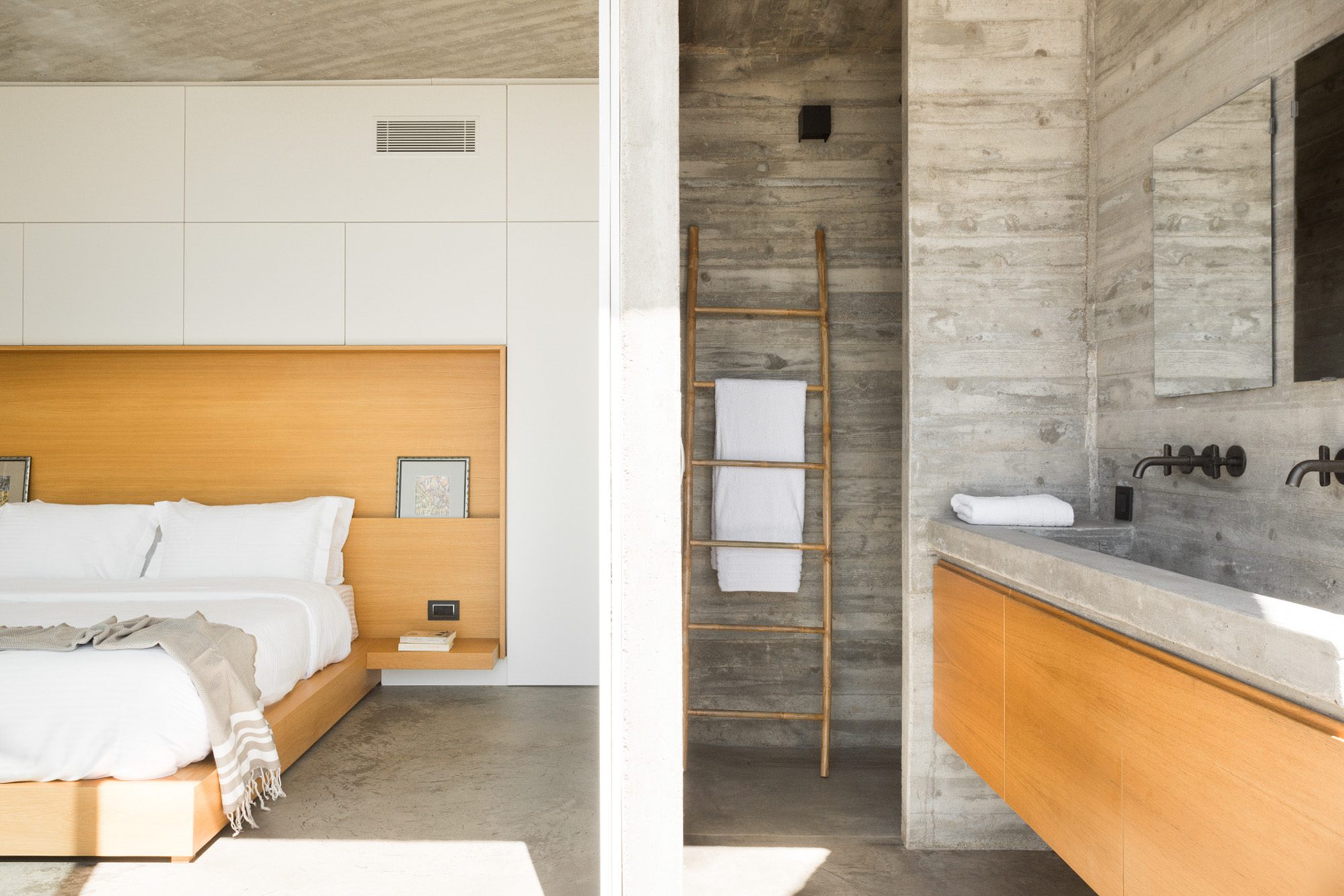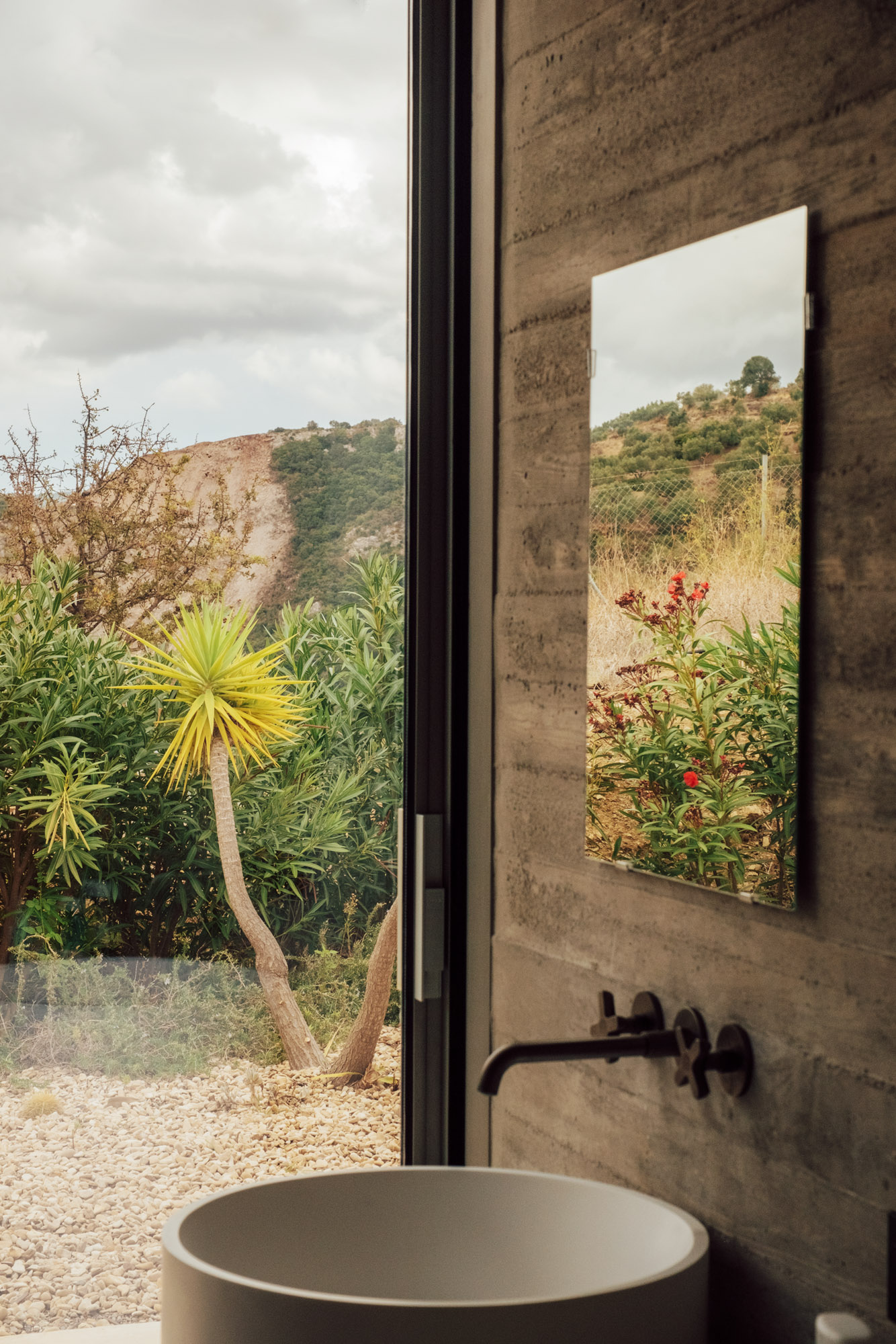 Three bedrooms are on the main floor, all with huge windows and access to the terrace. A further en suite bedroom is on the lower floor. The capacious open-plan living area has a TV end with big floor cushions, a separate sitting area with comfortable sofas, a dining space and a fitted kitchen. Floor-to-ceiling windows maximise the views and give a feeling of connecting with the landscape.