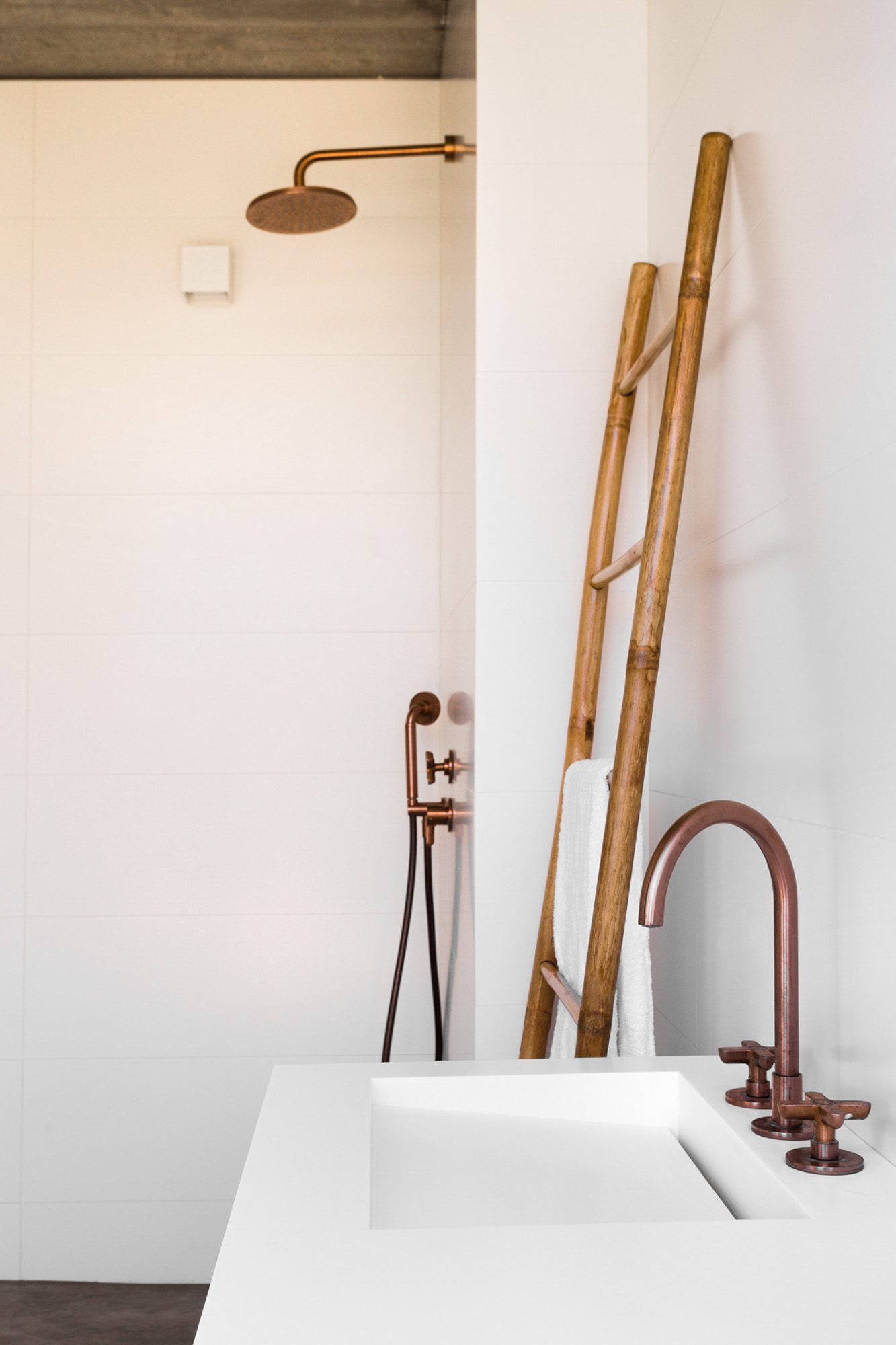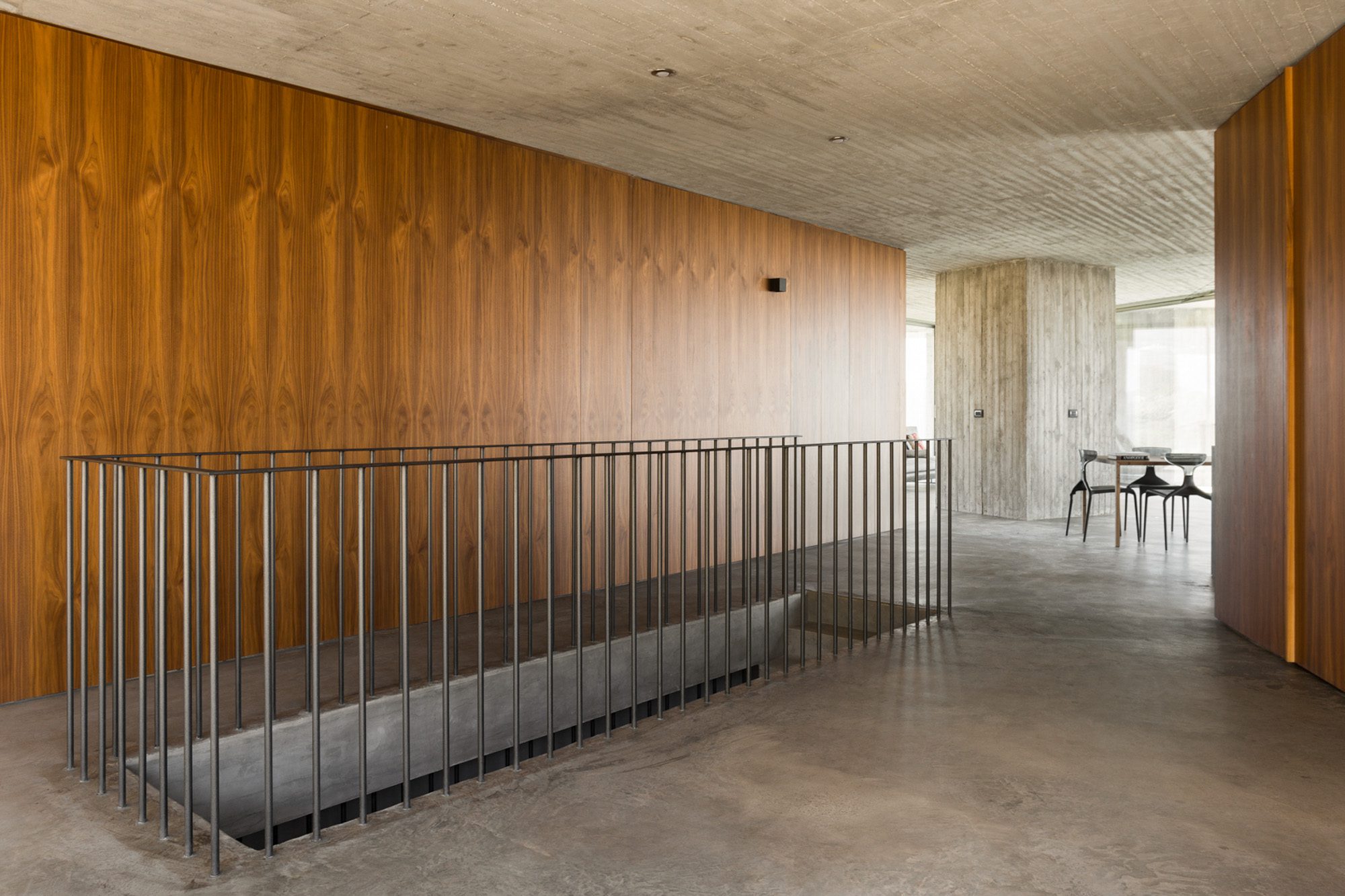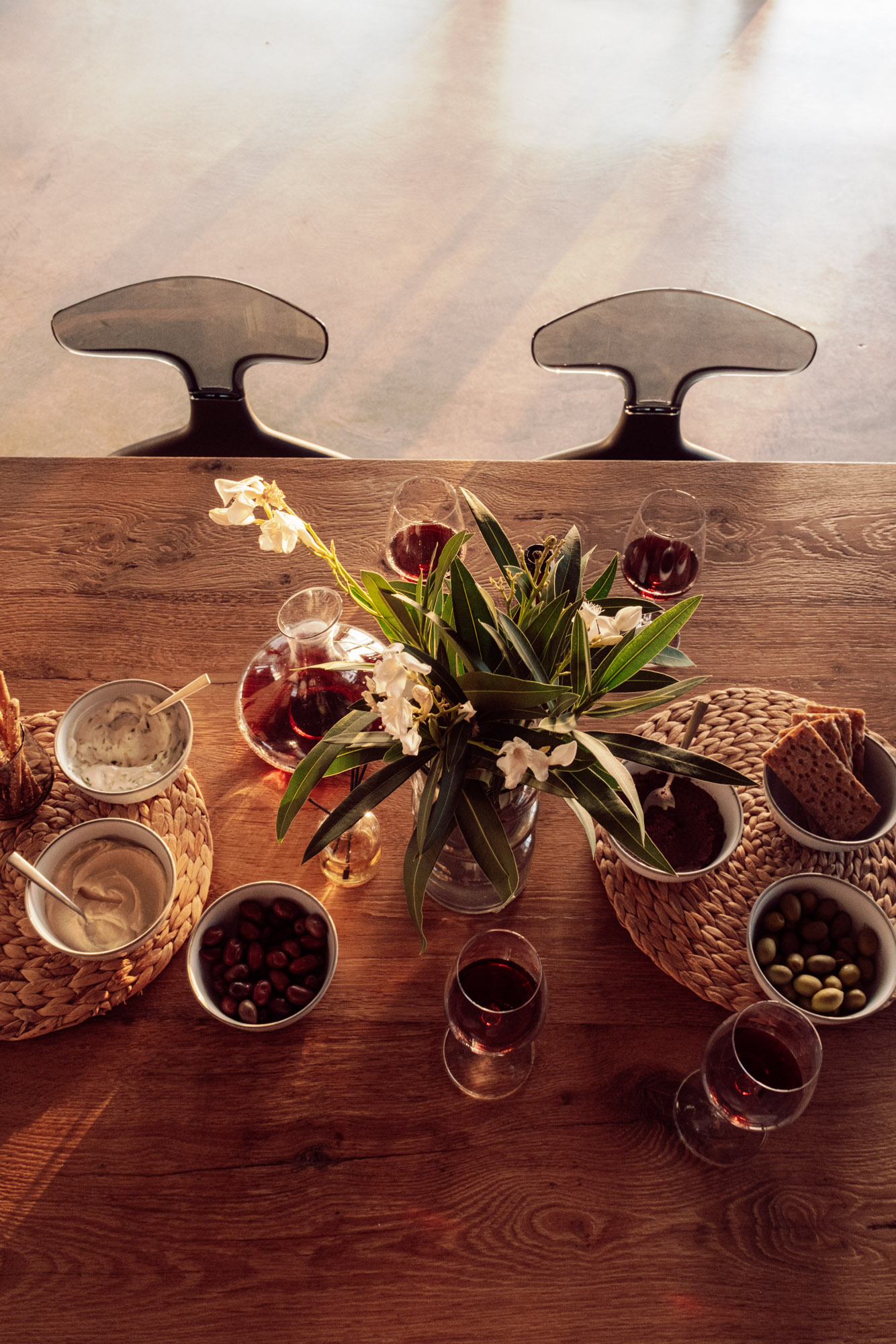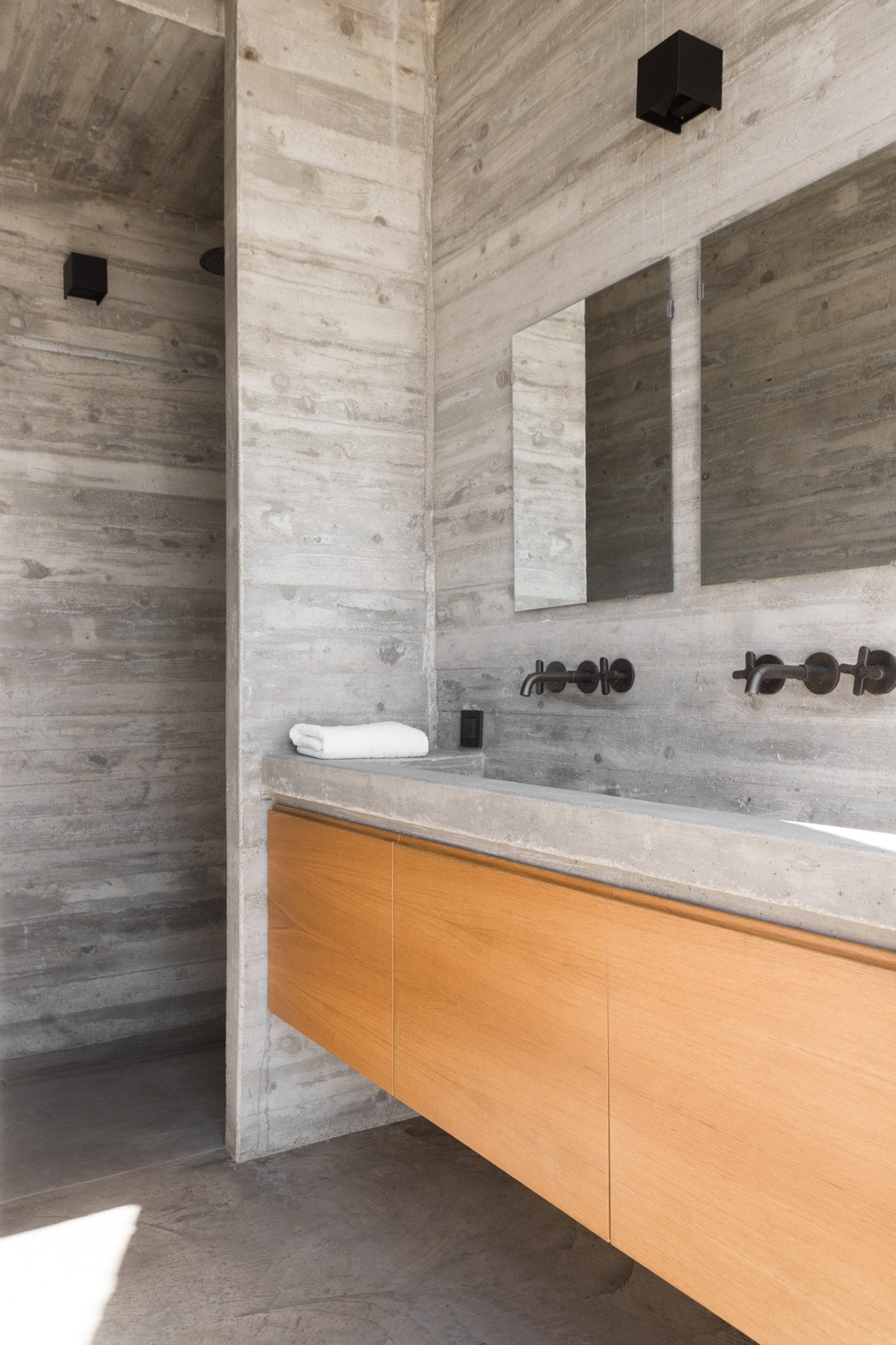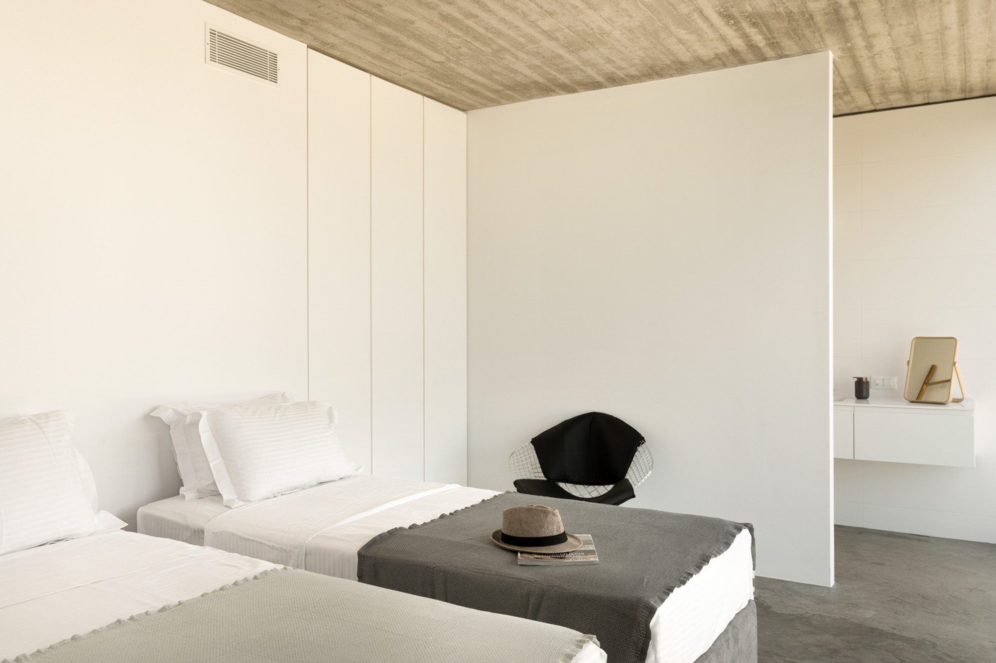Three bedrooms are on the main floor, all with huge windows and access to the terrace. A further en suite bedroom is on the lower floor. The capacious open-plan living area has a TV end with big floor cushions, a separate sitting area with comfortable sofas, a dining space and a fitted kitchen. Floor-to-ceiling windows maximise the views and give a feeling of connecting with the landscape.