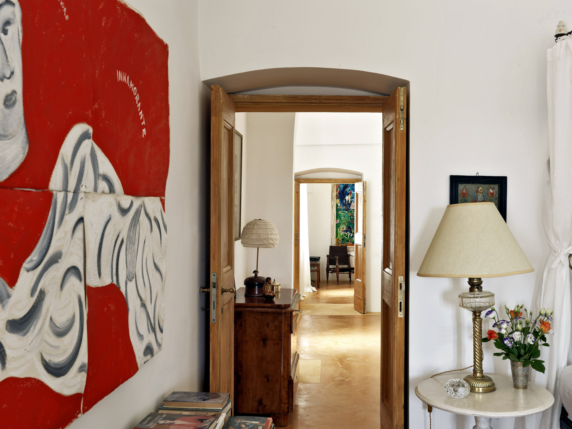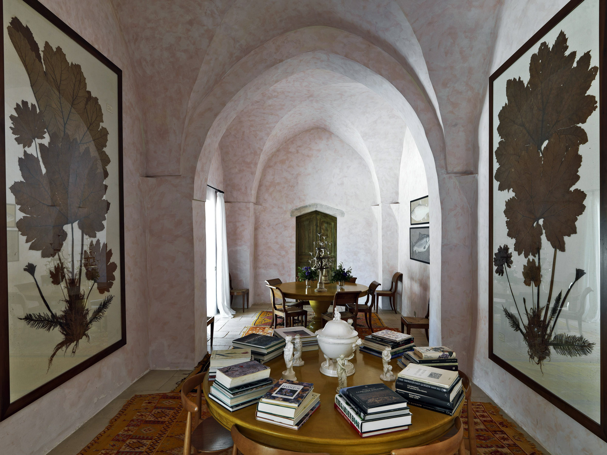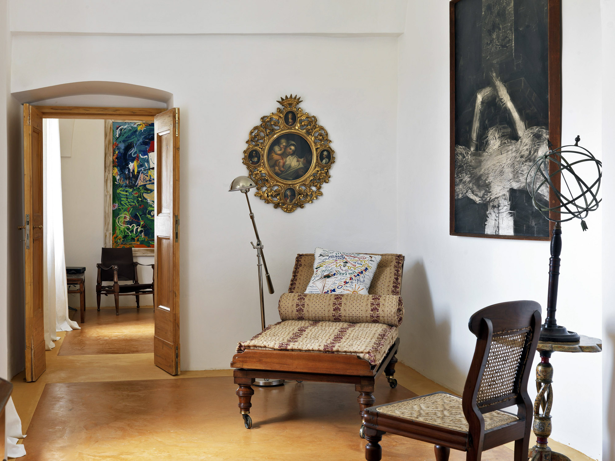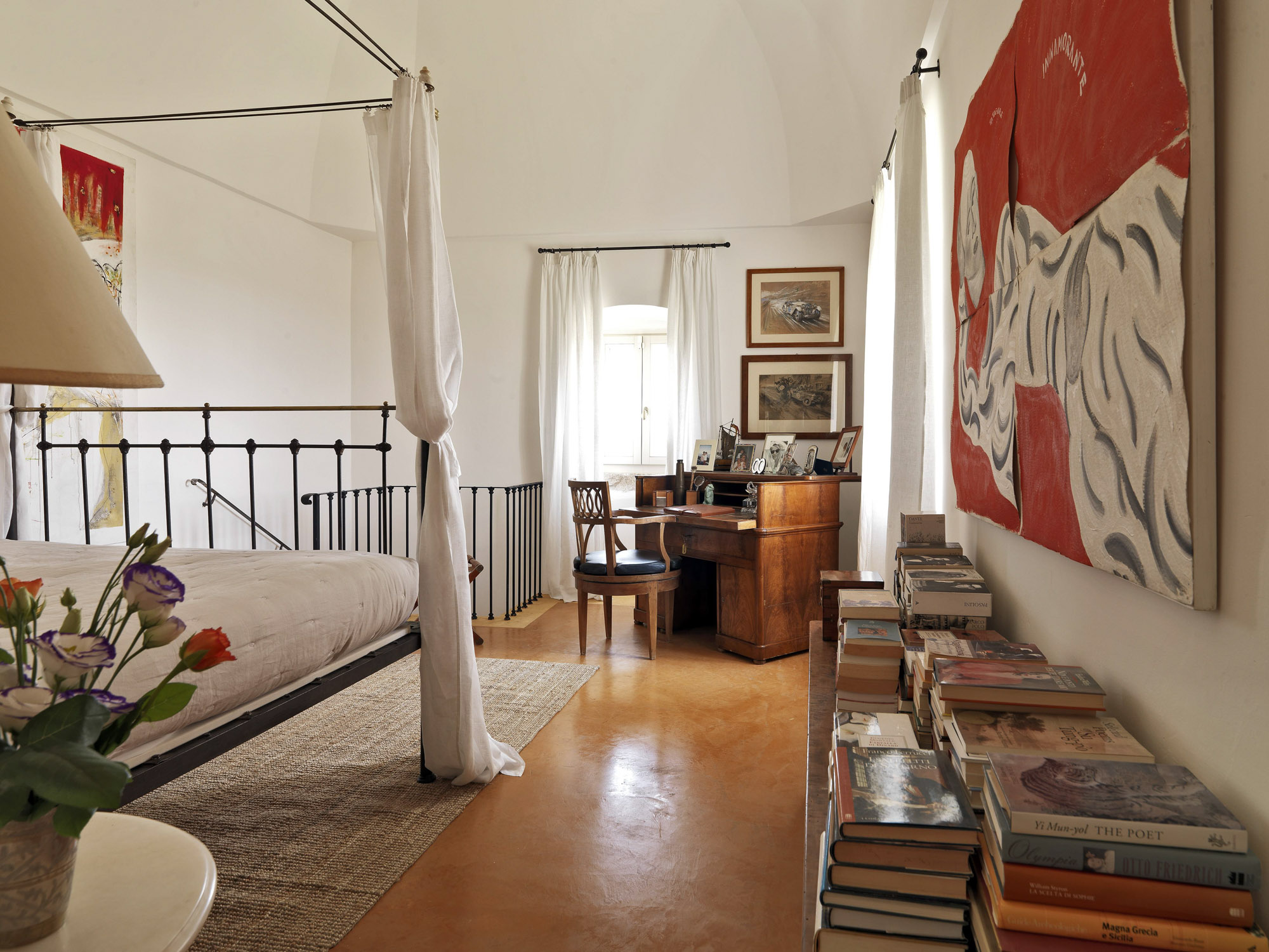 The interiors have the elegance of a rambling country house, with an eclectic mix of modern and antique furniture, artworks, and lots of books.