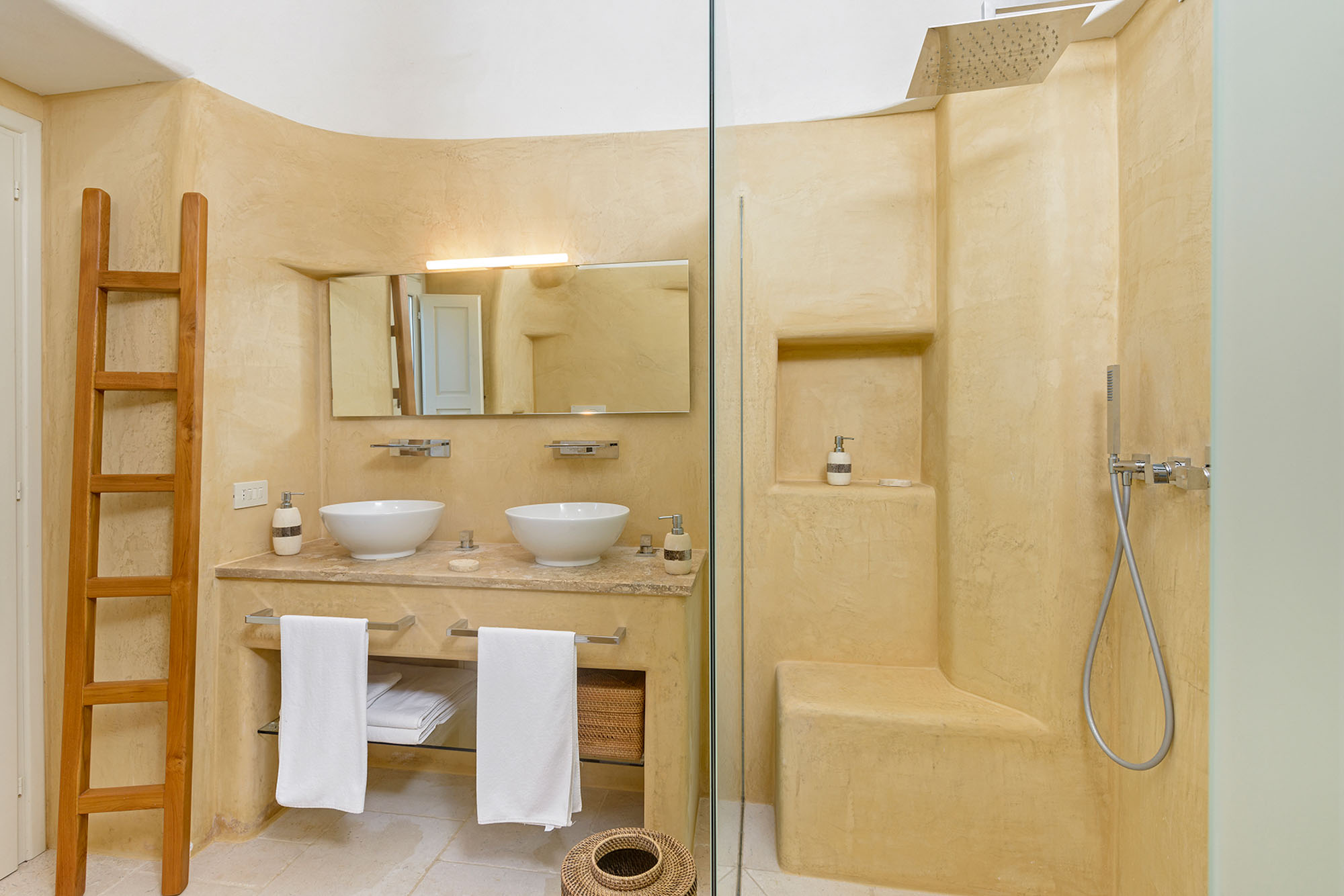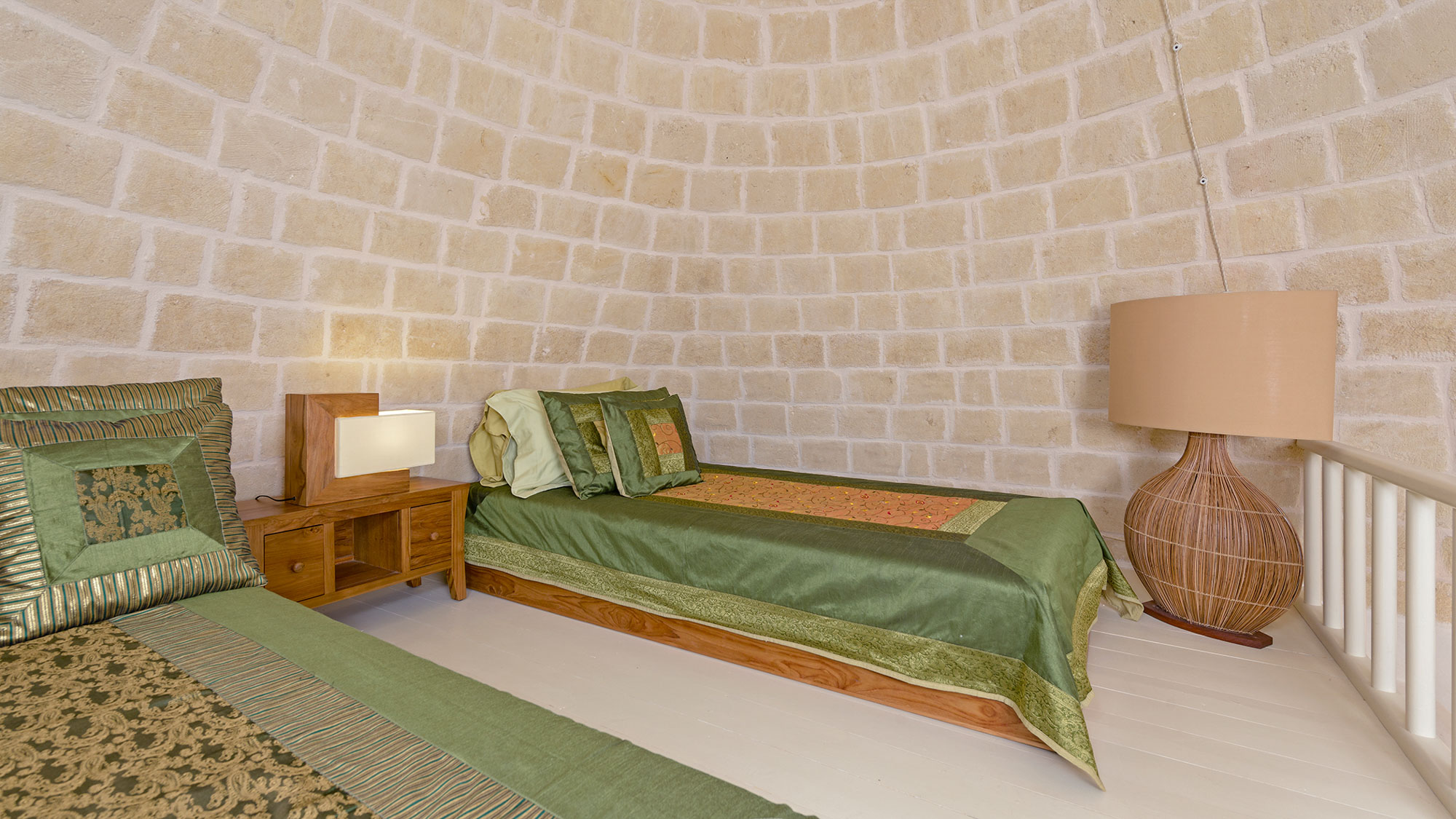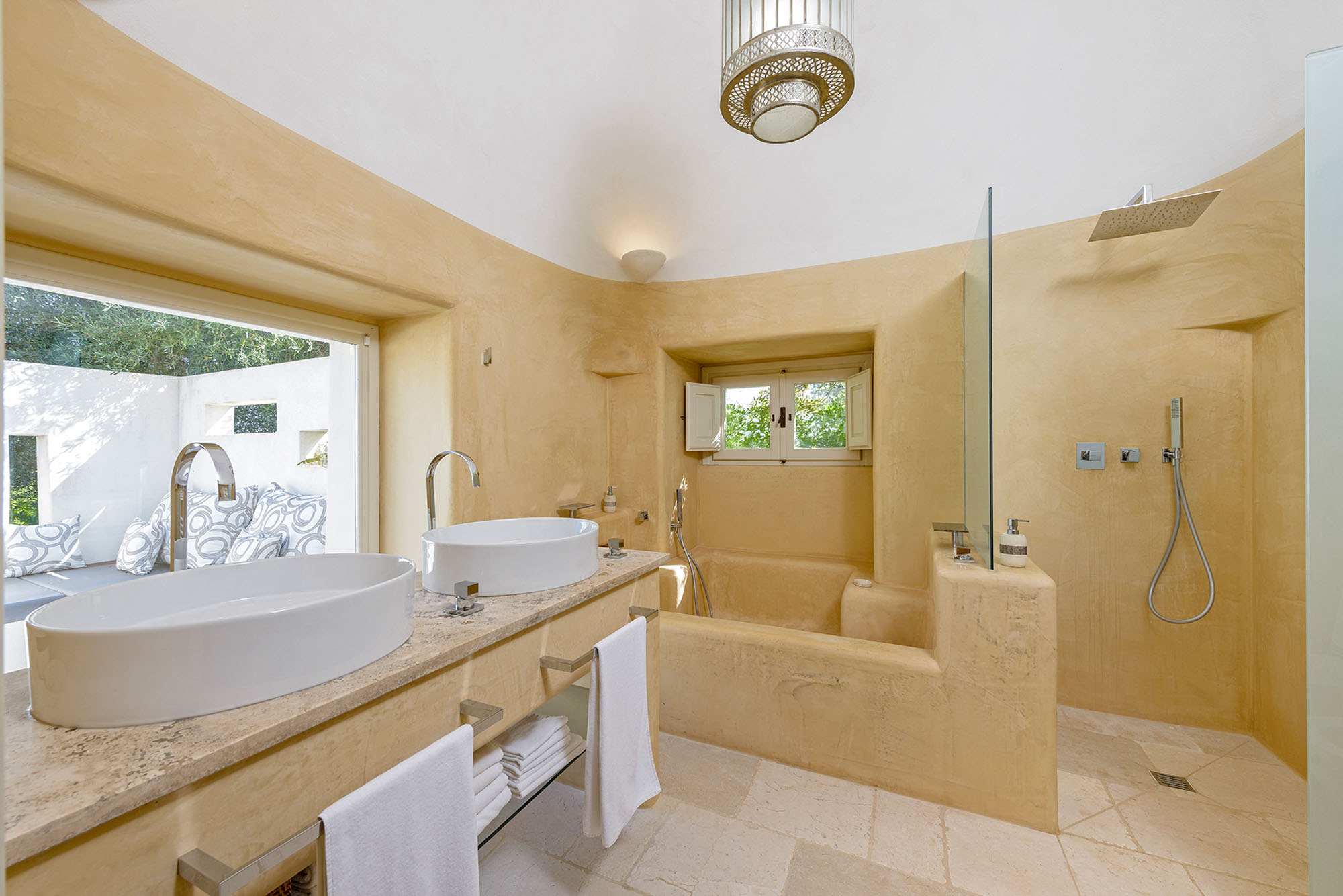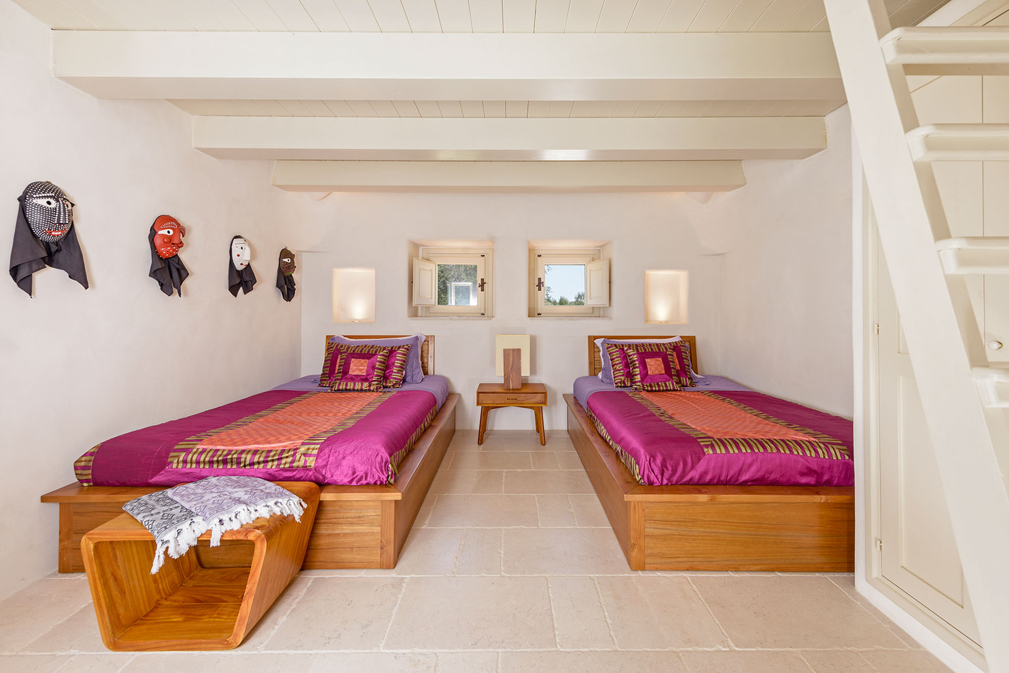 - pale floors, walls, soaring stone ceilings and furniture of honey-coloured wood or upholstered in neutral tones. Rooms flow into one another, from the kitchen-dining room to the living room, study room, and TV room. At one end are two en suite master bedrooms, each with its own gardens and outdoor showers, and at the other, two further twin rooms, with jewel-coloured bed coverings, sharing a large bathroom with a fabulous bath big enough for two. One of these rooms has a staircase to a mezzanine bedroom.
