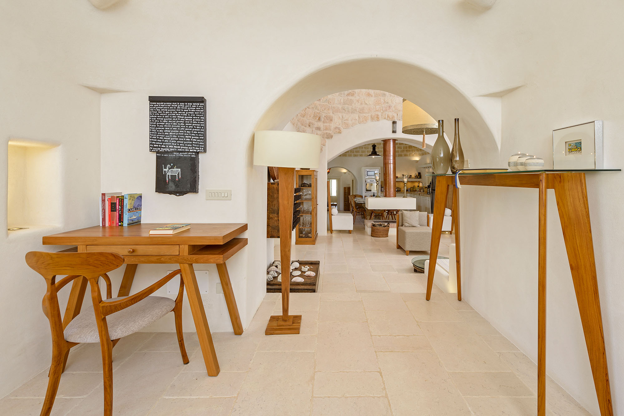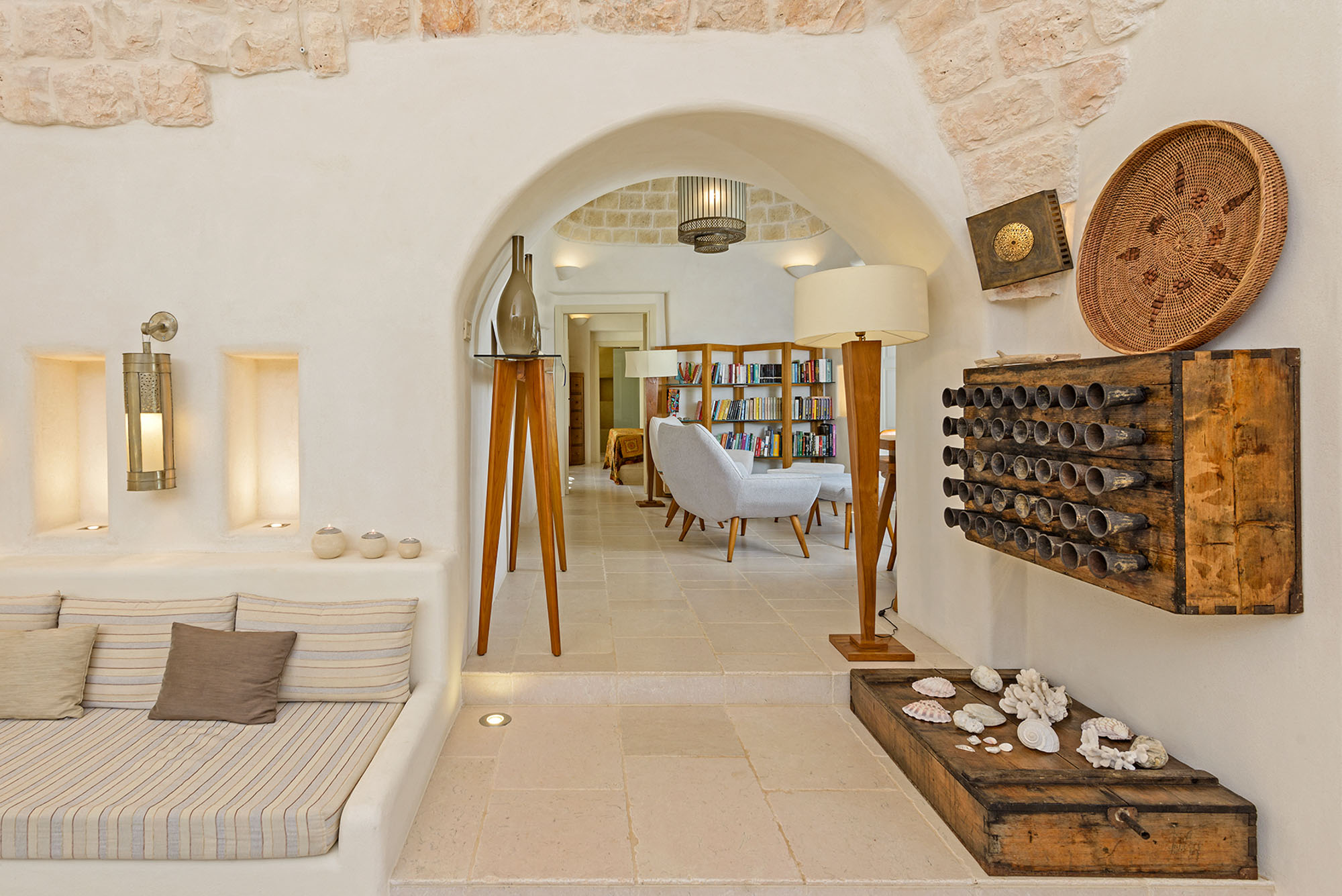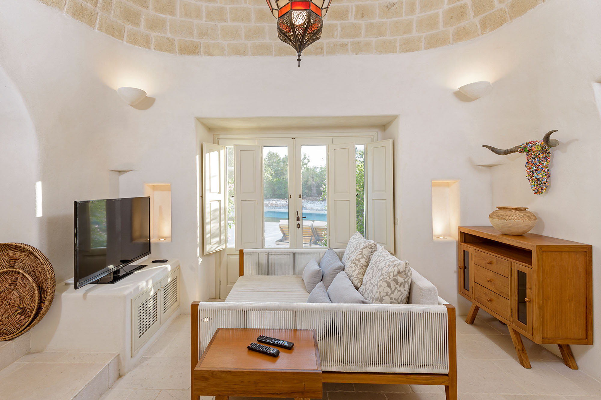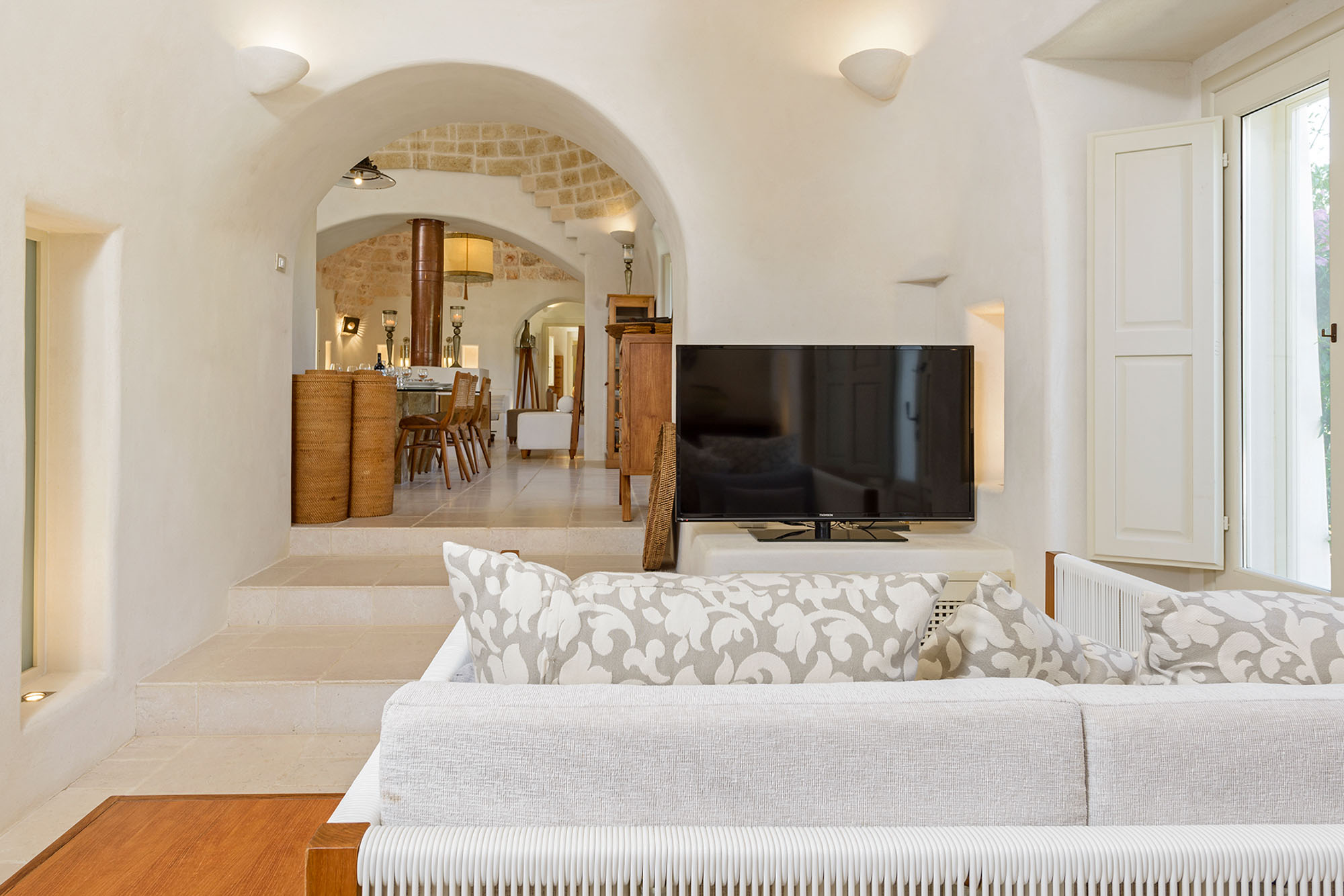- pale floors, walls, soaring stone ceilings and furniture of honey-coloured wood or upholstered in neutral tones. Rooms flow into one another, from the kitchen-dining room to the living room, study room, and TV room. At one end are two en suite master bedrooms, each with its own gardens and outdoor showers, and at the other, two further twin rooms, with jewel-coloured bed coverings, sharing a large bathroom with a fabulous bath big enough for two. One of these rooms has a staircase to a mezzanine bedroom.
