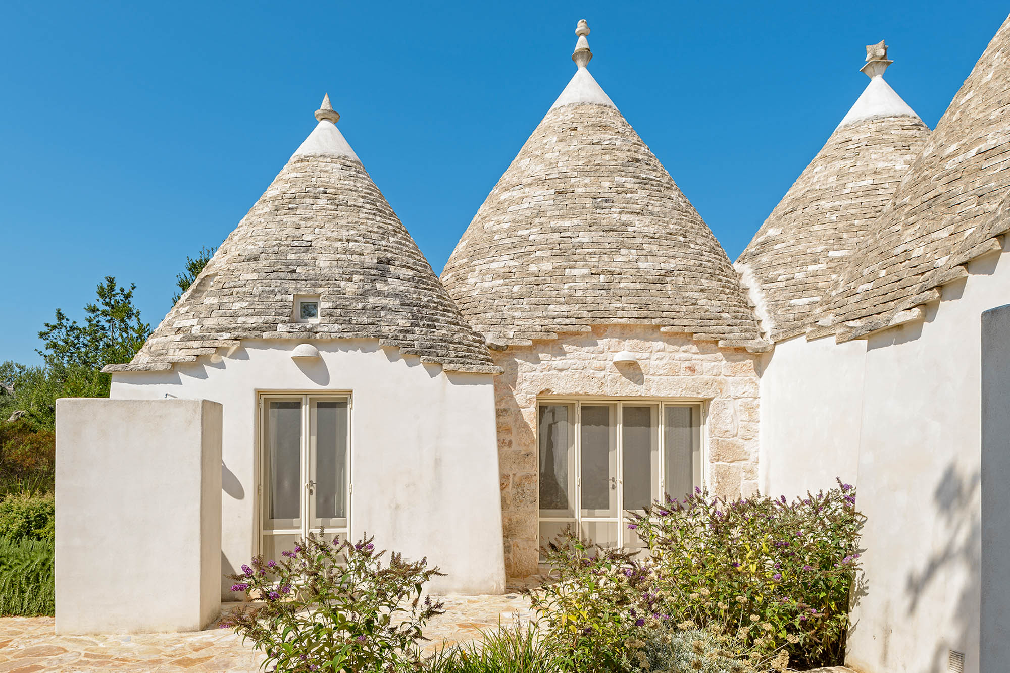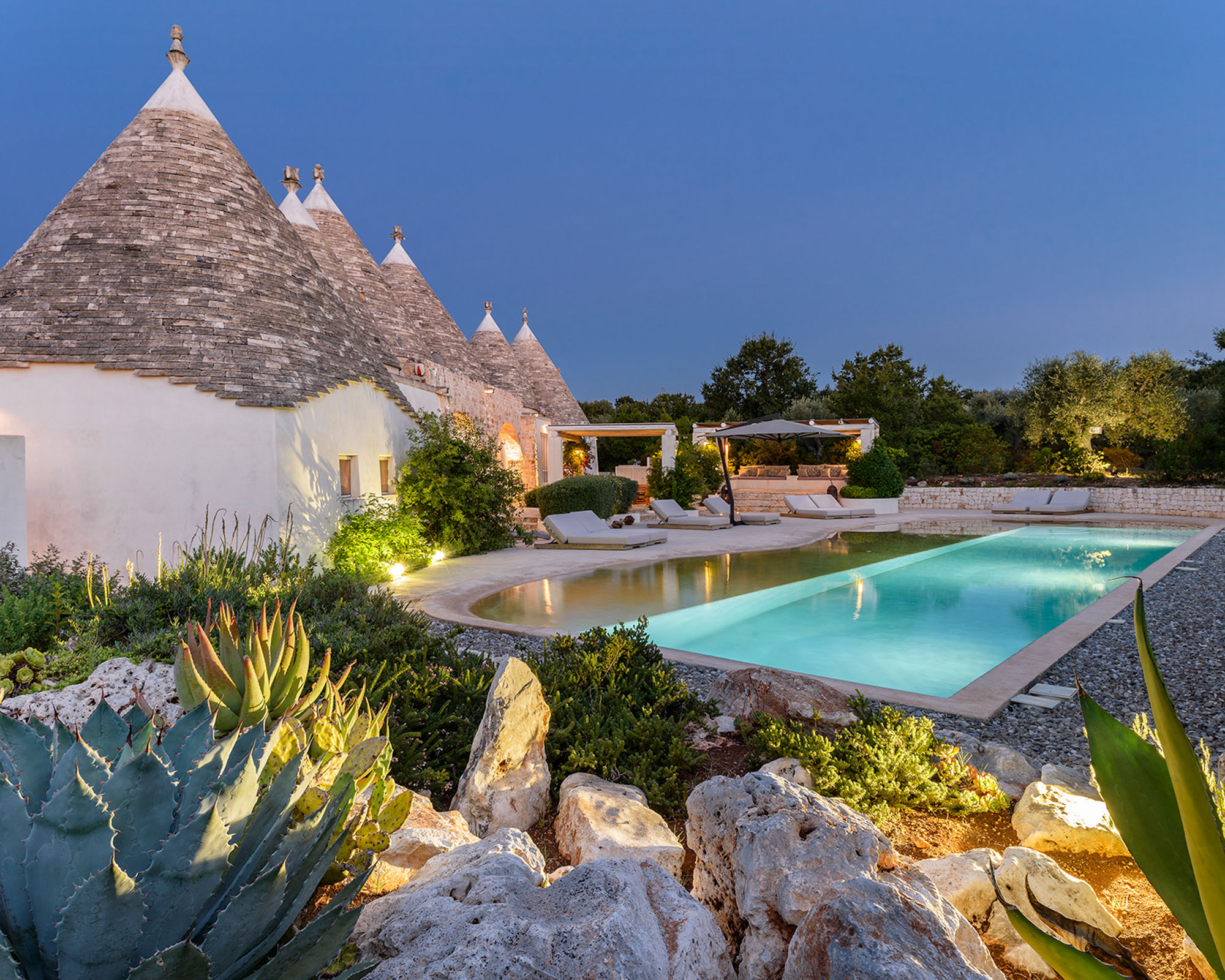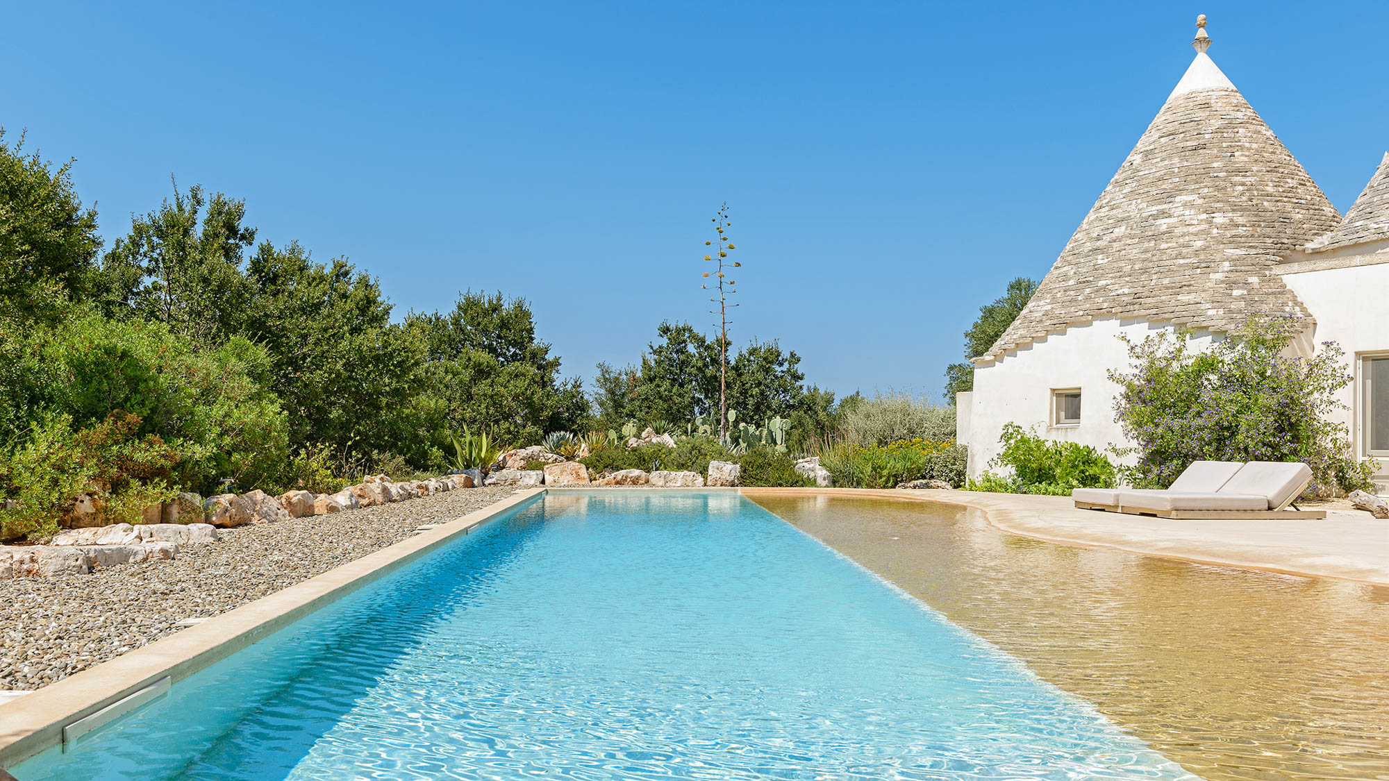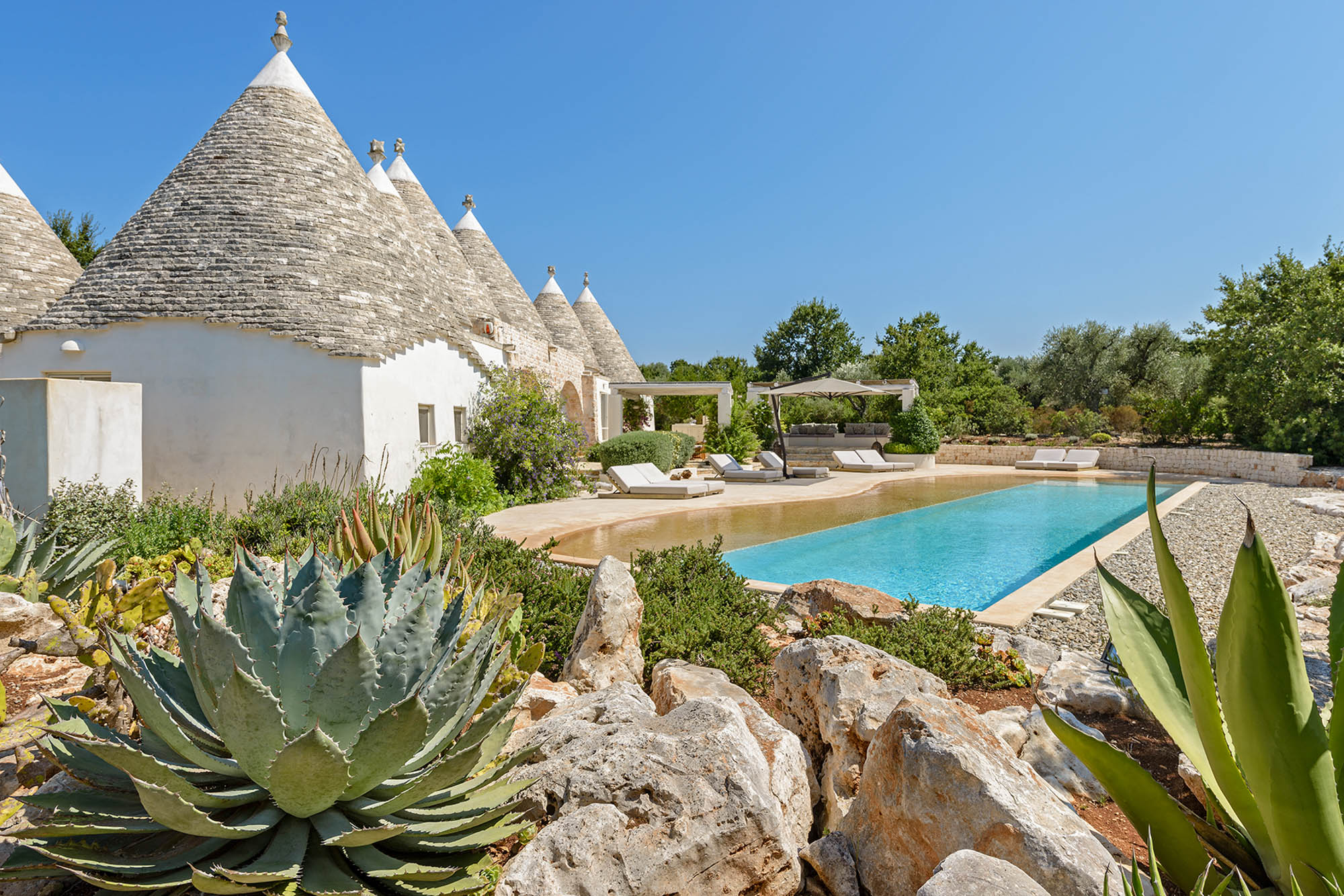 It's newly built, using skilled local craftsmen and blending modern interior aesthetics with traditional building techniques. Set within 6 acres of private land and surrounded by farmland and olive groves, the location is so private and peaceful, yet there are six Michelin-starred restaurants within half an hour's drive and lovely beaches on both the Adriatic and Ionian coasts to explore.