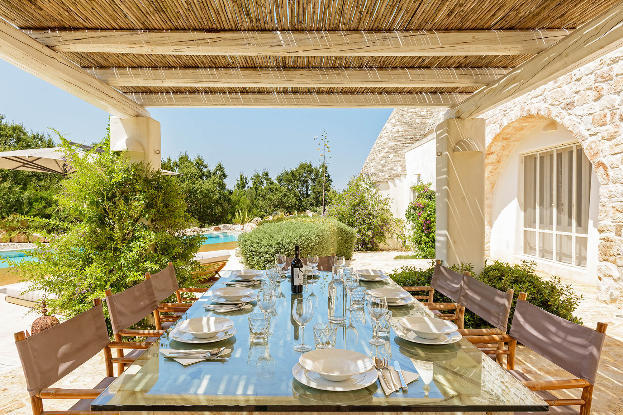 Woven roofed pergolas shade an outdoor kitchen with a barbecue, a large glass and teak dining table and a lounge area, all softened by luxuriant planting. Enjoy the views by day and the long evenings lit by ambient lighting.