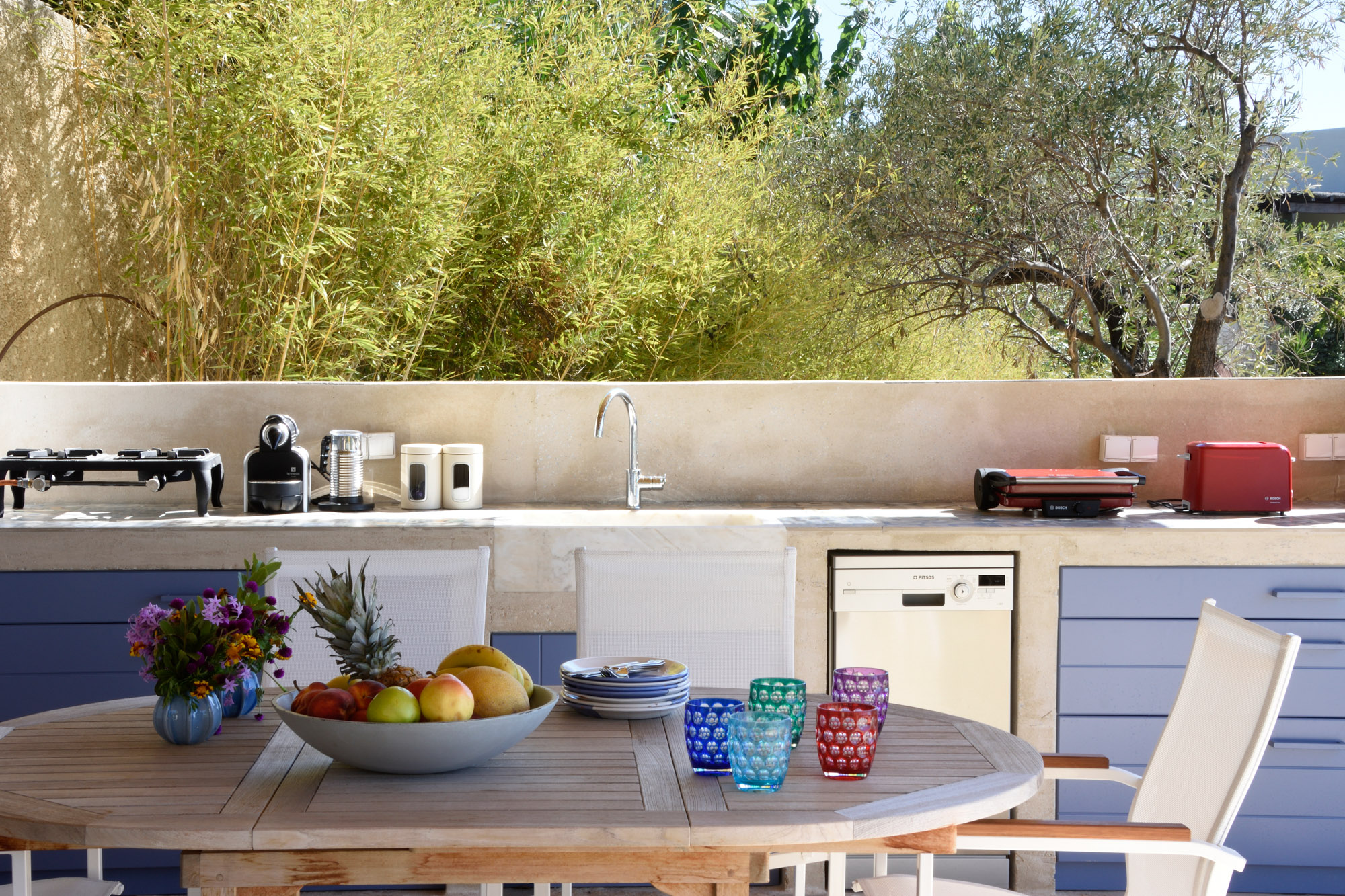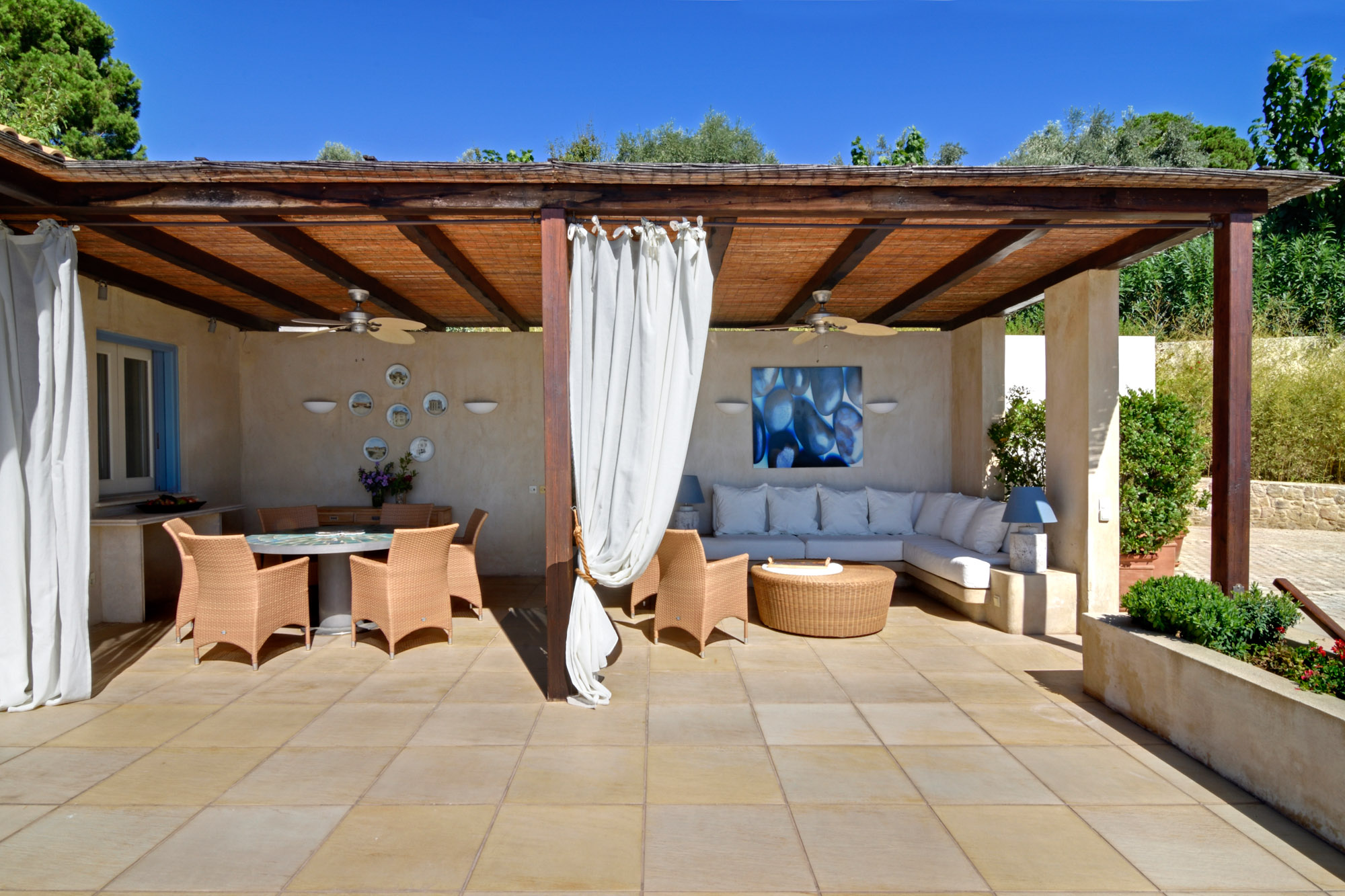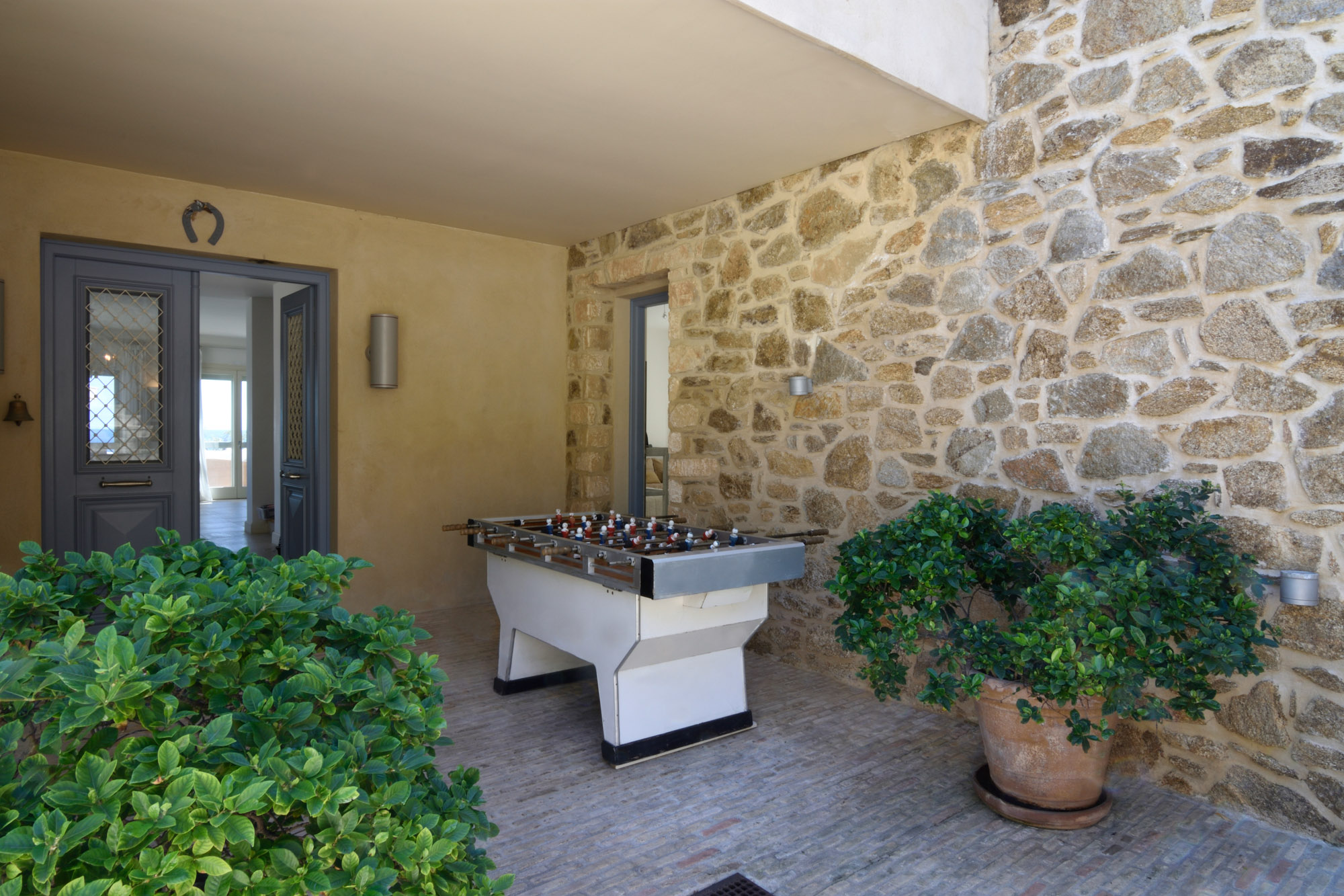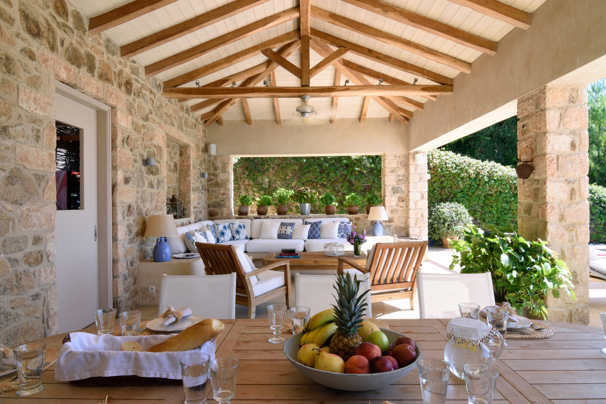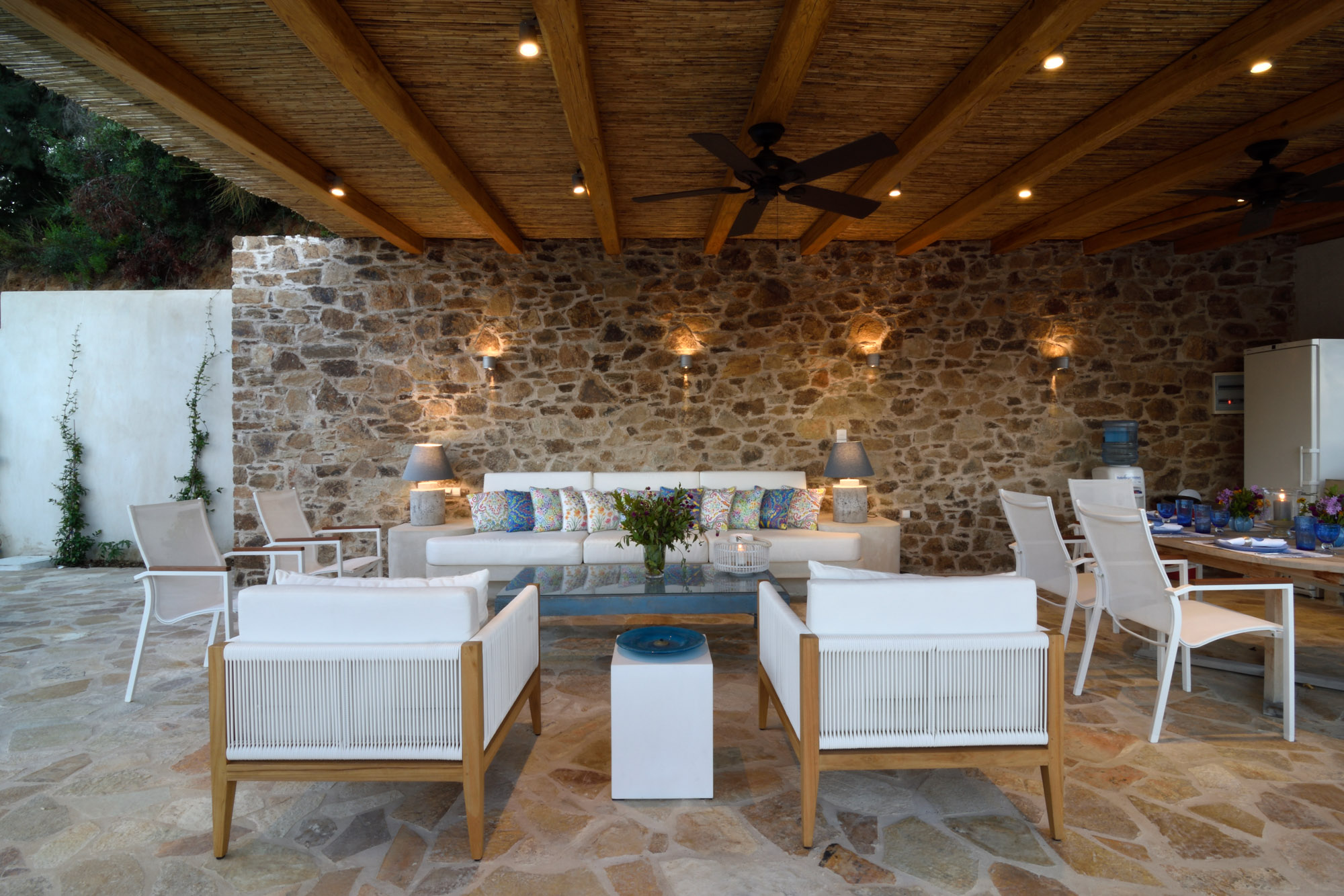 Paraliaki’s beachfront area features sunbeds and parasols right on the sand, while Thalassia has a dedicated outdoor kitchen, barbecue, and shaded dining pavilion for meals under the open sky. The estate’s layout offers seamless transitions between indoor and outdoor spaces, ideal for enjoying the scenic surroundings.