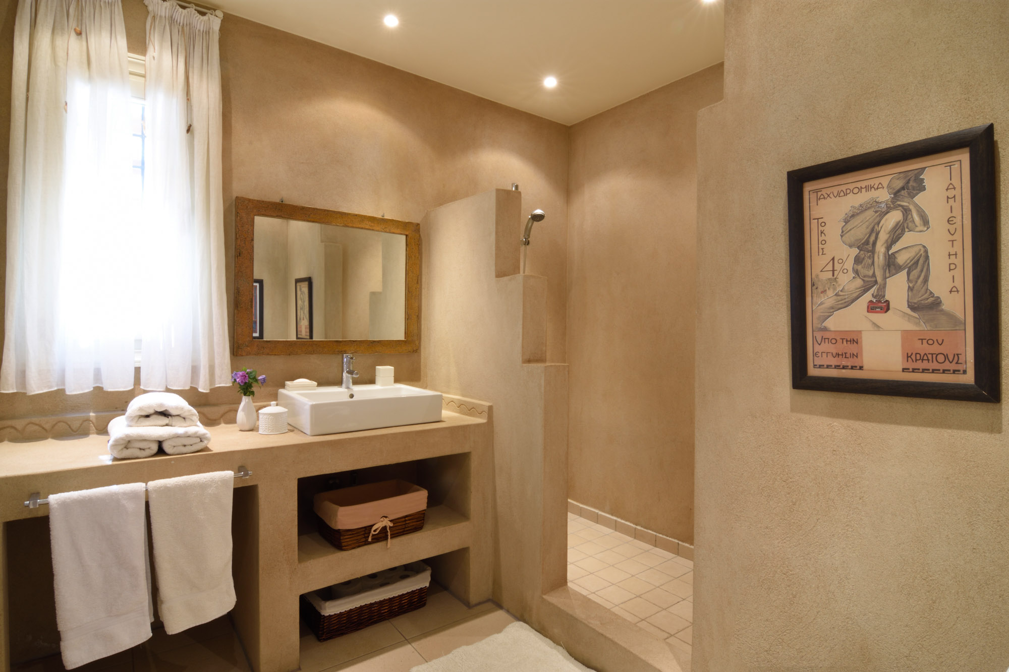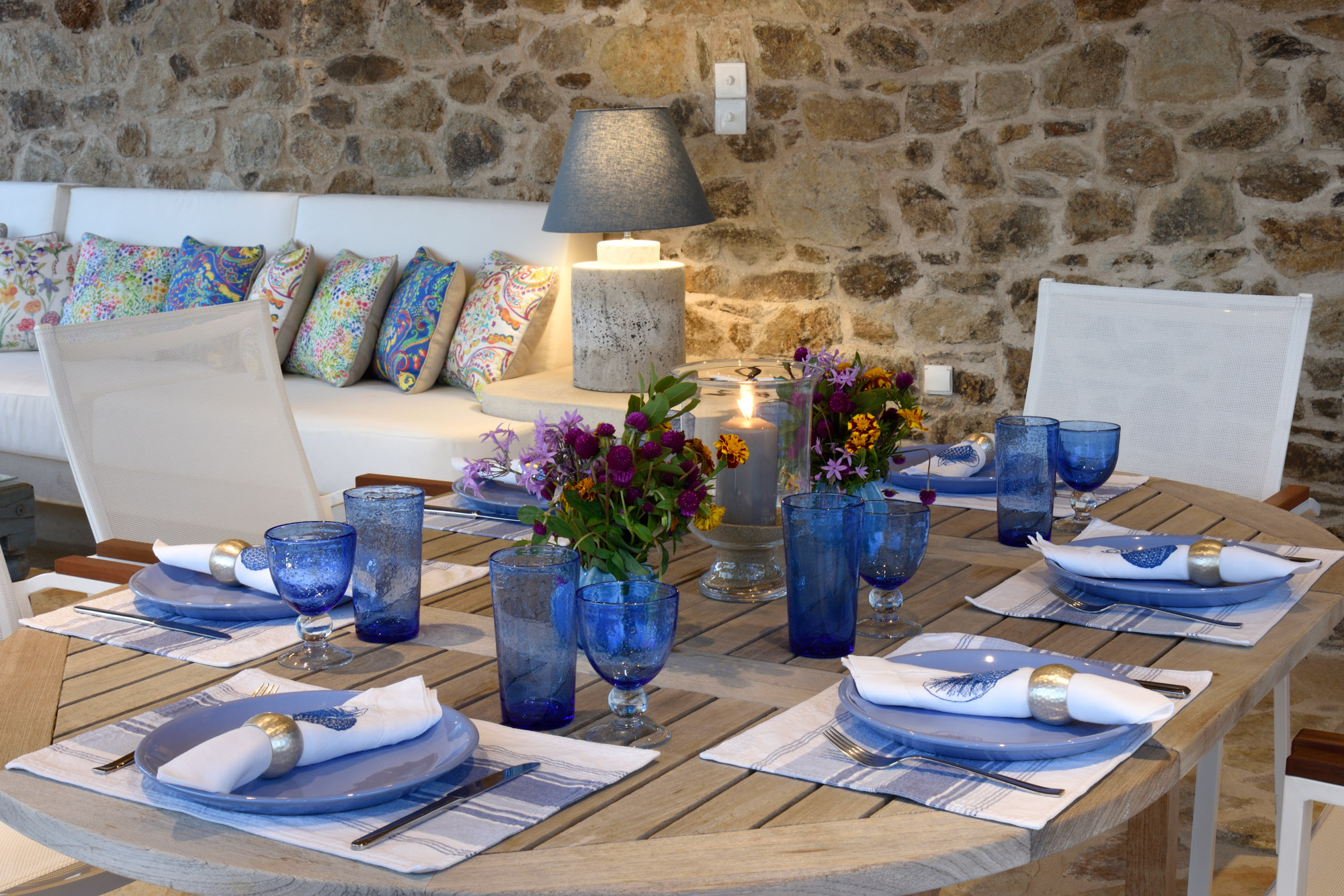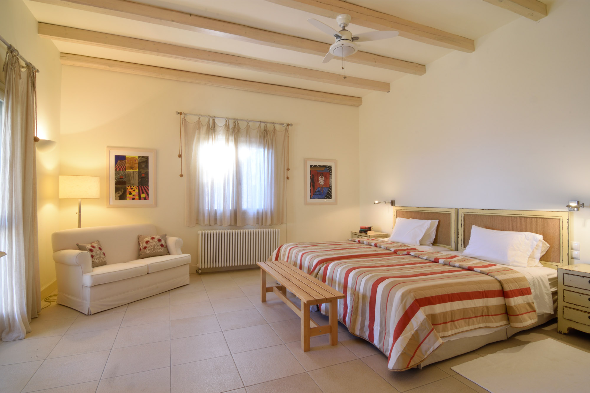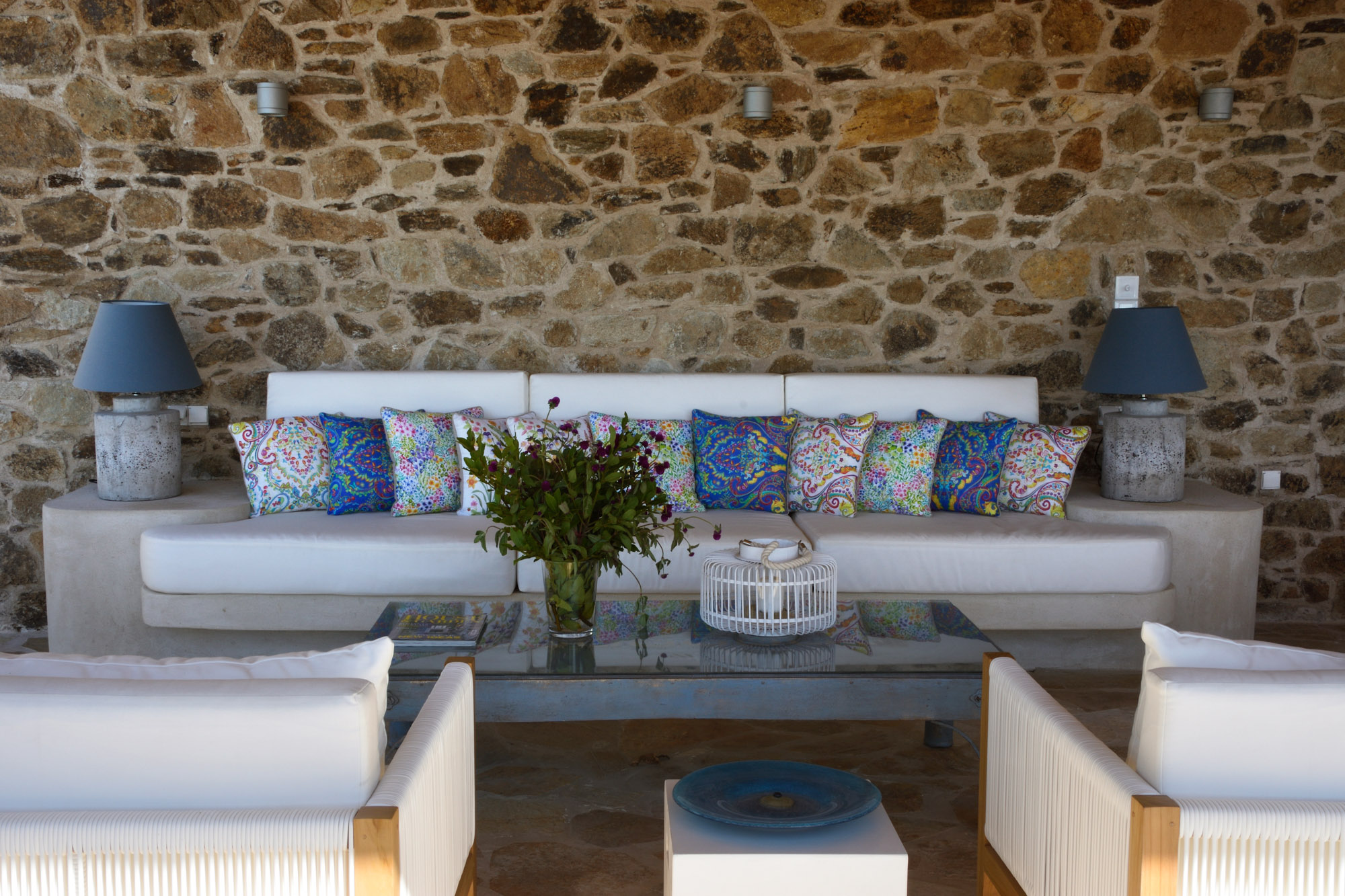 Paraliaki spans three floors and includes five large bedrooms, highlighted by a master suite with a private balcony and a study. An open-plan living and dining area, seating up to 14, opens onto a terrace perfect for gathering. Thalassia’s five bedrooms are spread over two floors, with many leading to shaded verandas that offer cosy seating areas and direct outdoor access.