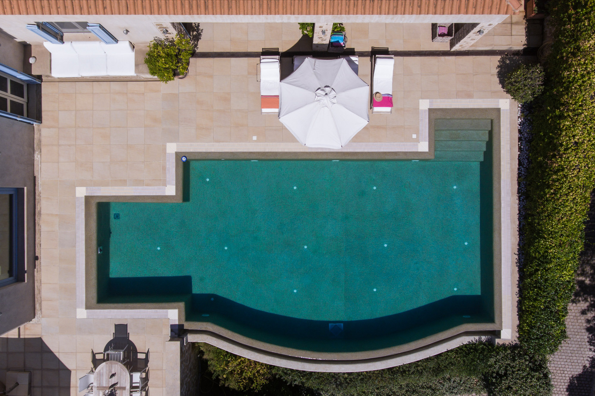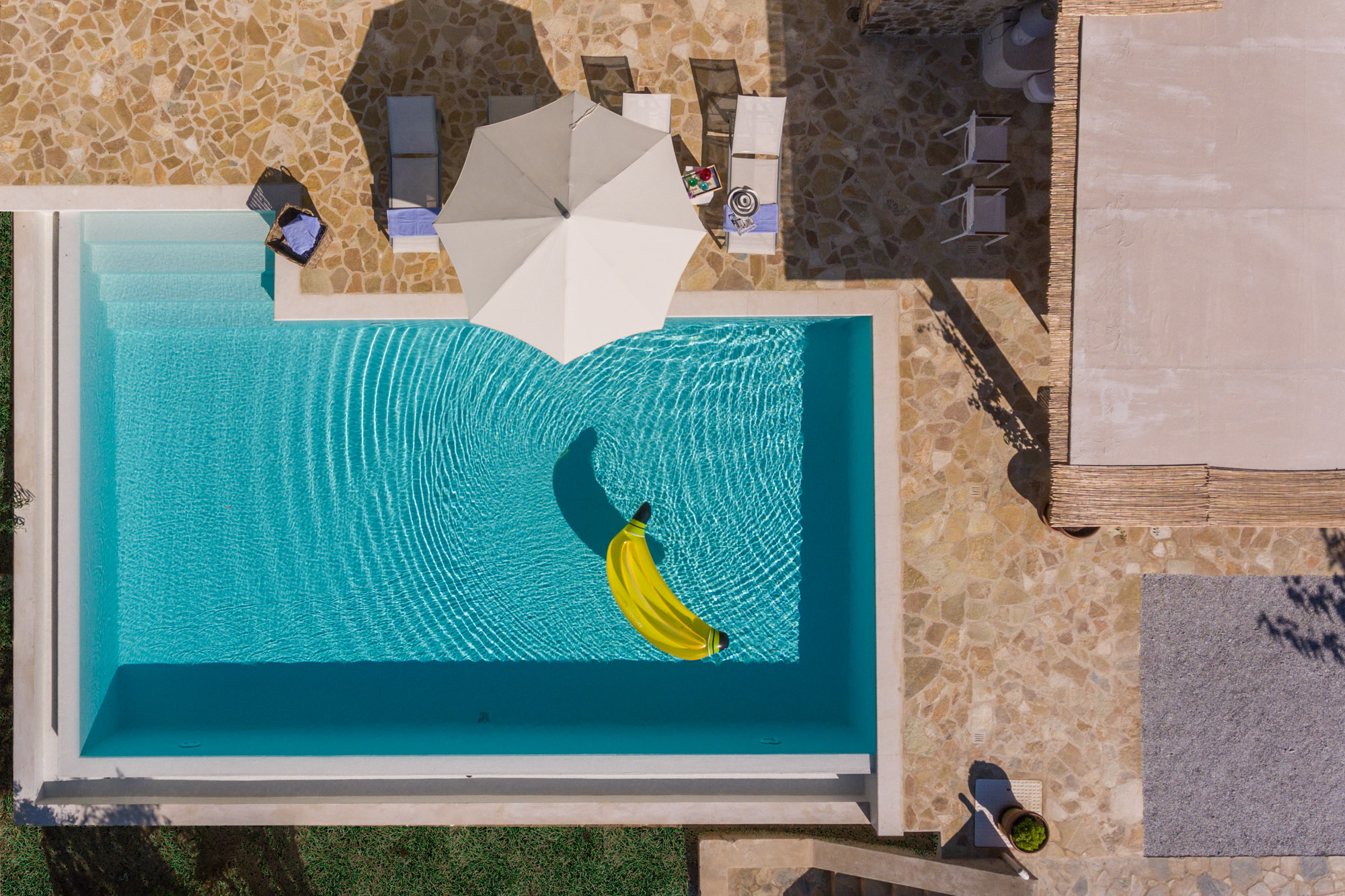 Outside, each villa includes a private infinity pool—80 sqm at Paraliaki and 60 sqm at Thalassia—surrounded by loungers and shaded seating areas, perfect for unwinding by the water.