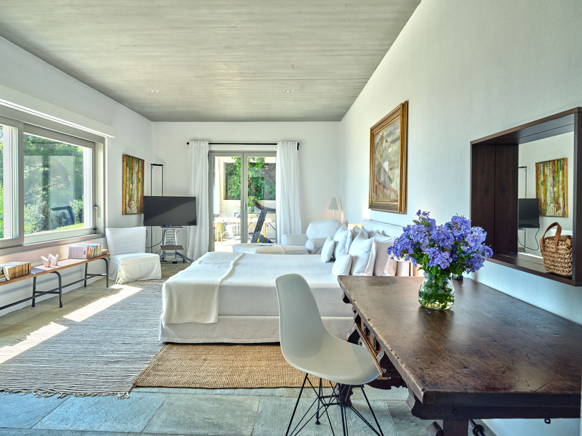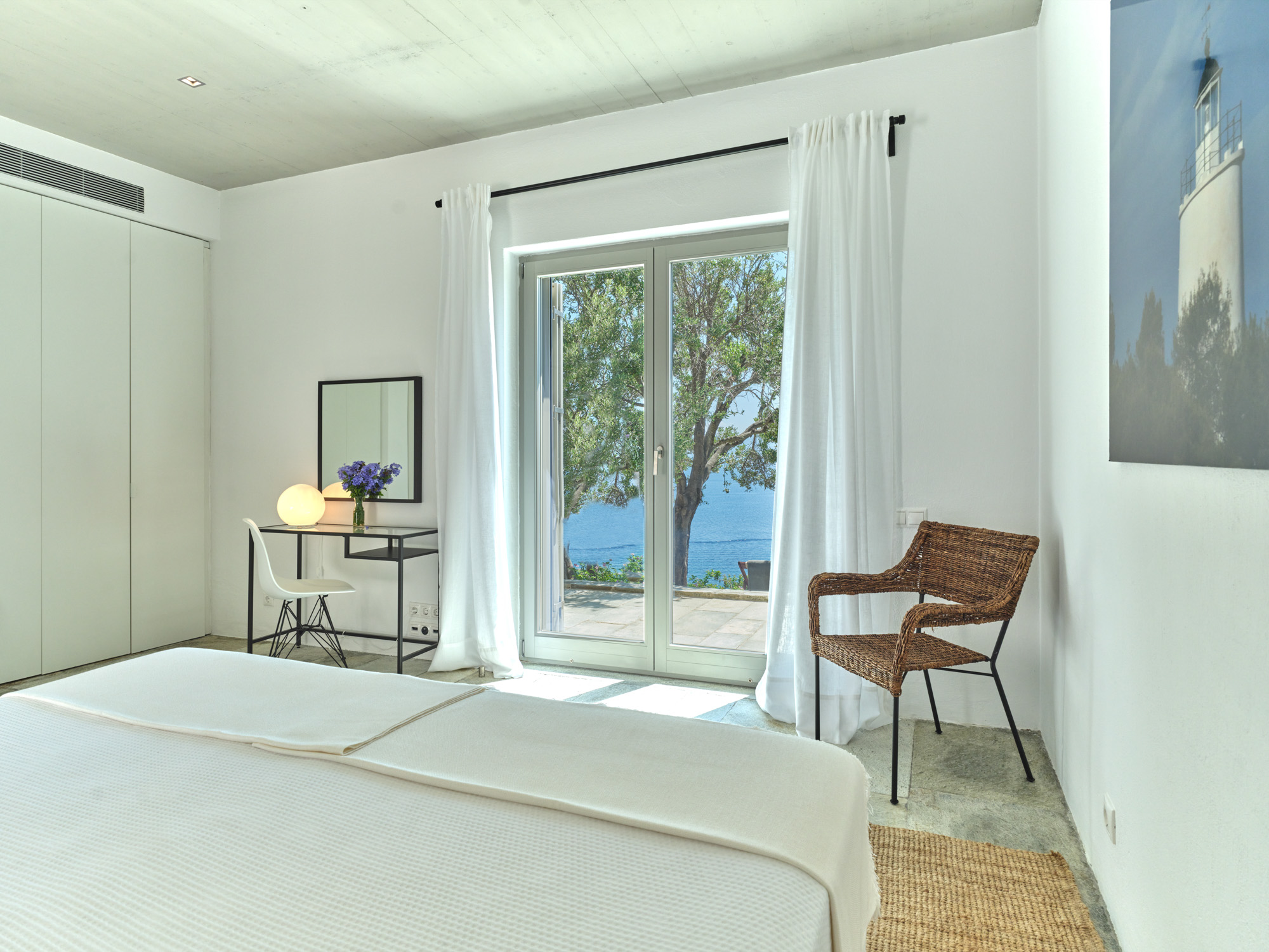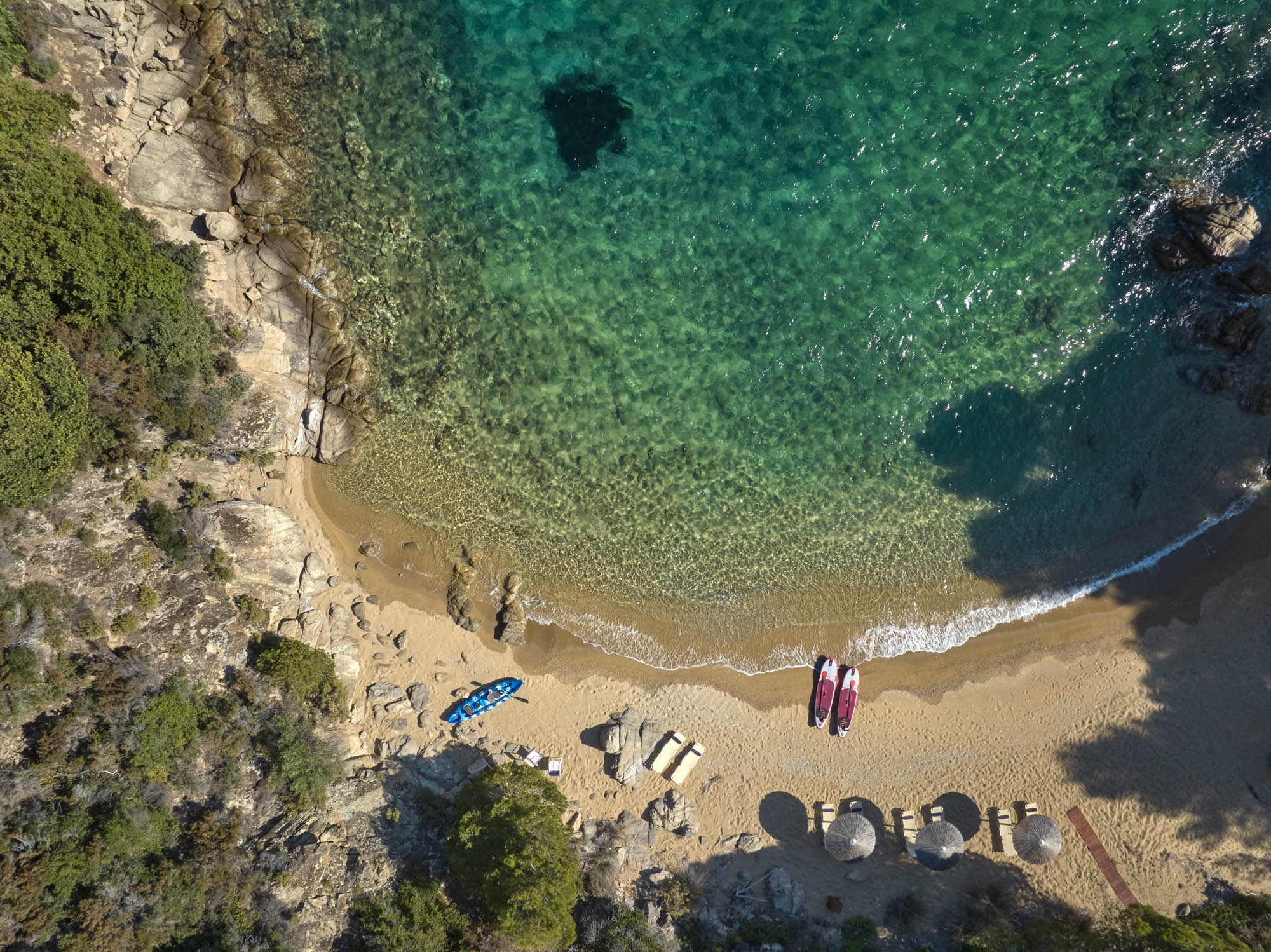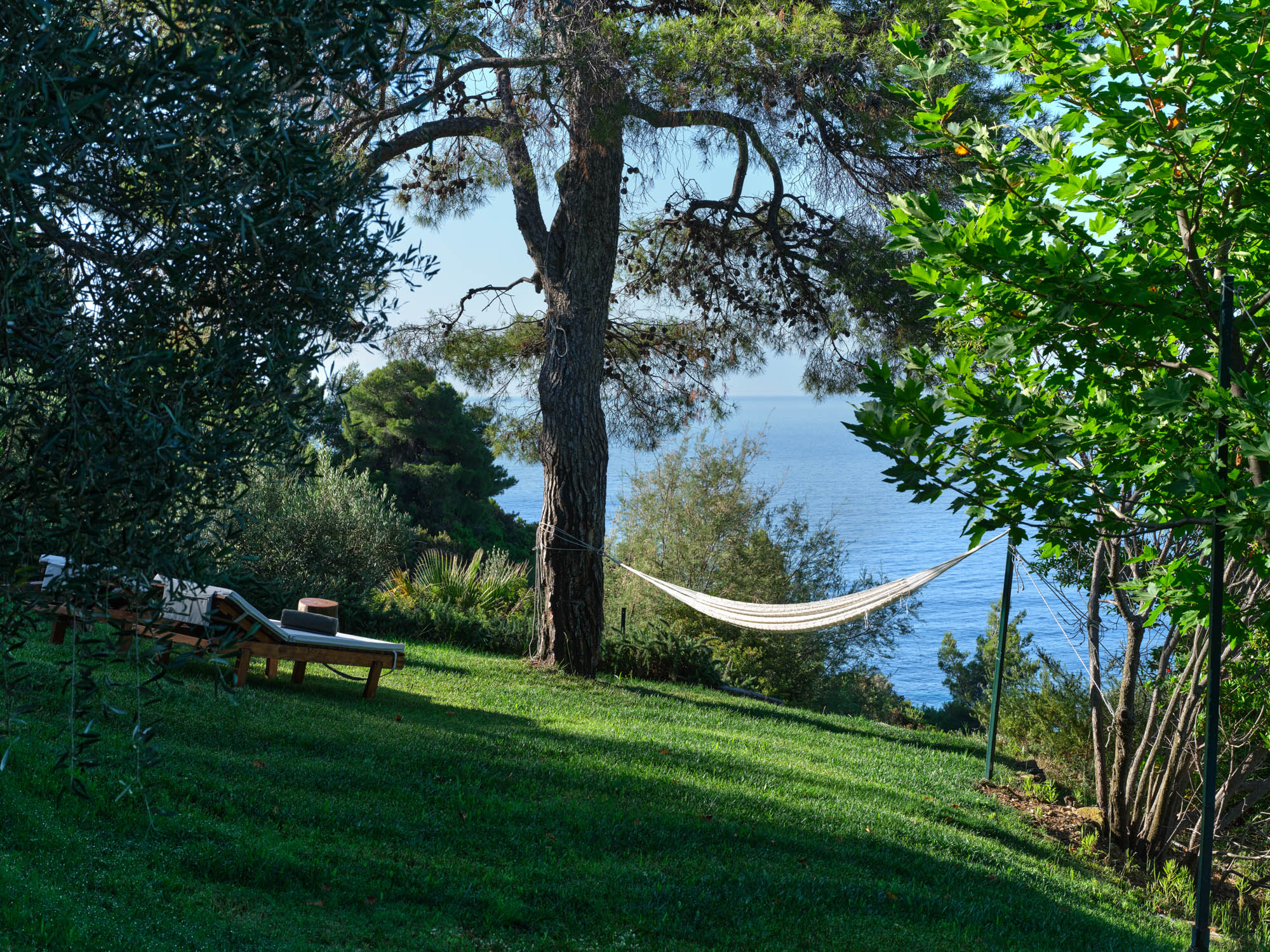 A path leads downhill to a little cove with a small, sandy, unspoilt beach equipped with sun beds and umbrellas. Between the villa and beach is a small stone building with a refrigerator, shower and toilet.