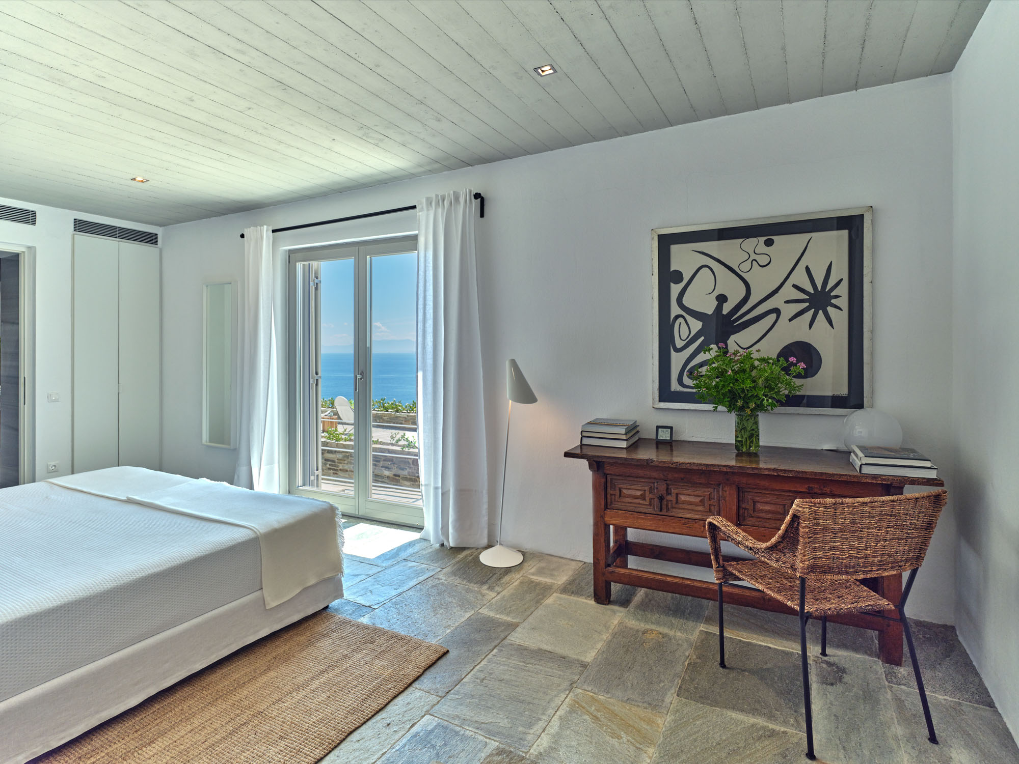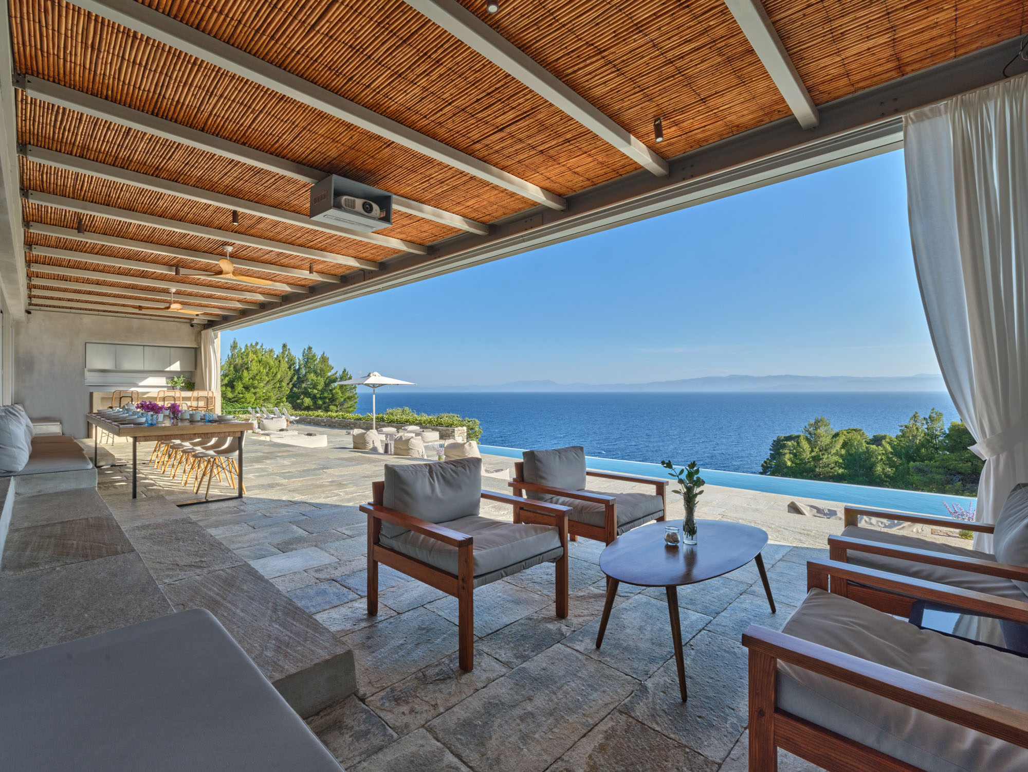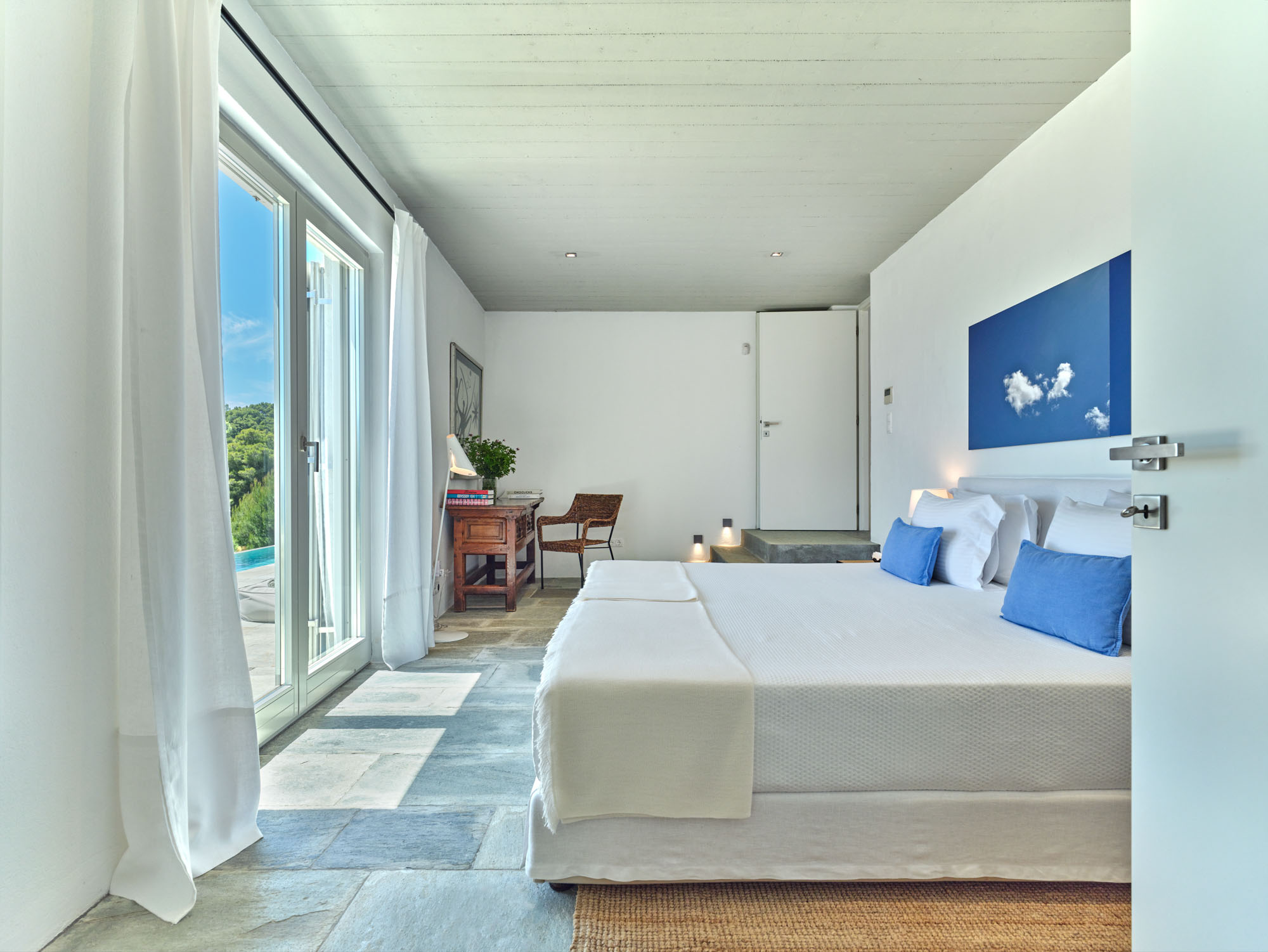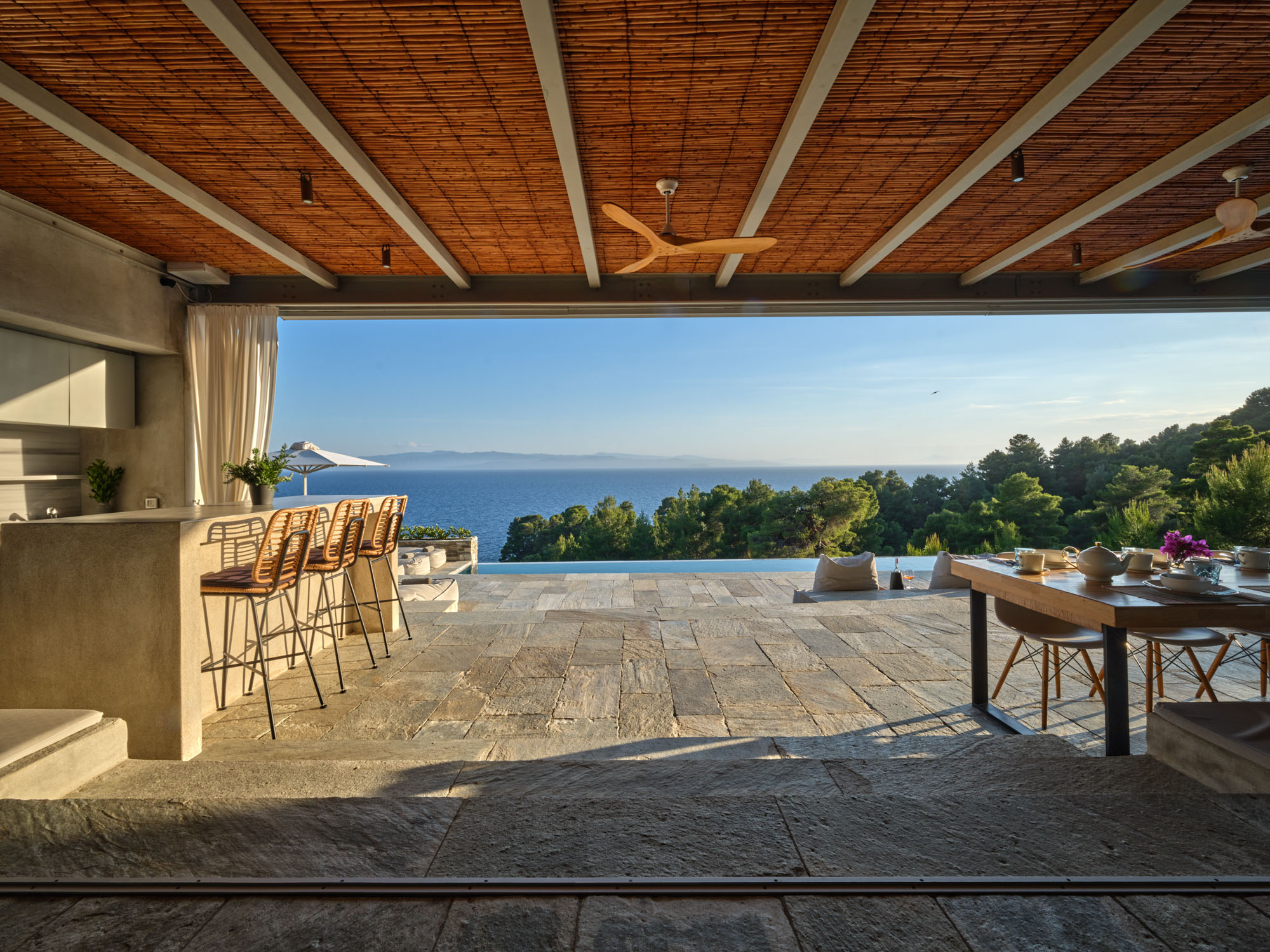 They open to a covered expanse of terrace housing a long dining table for 12, with overhead fans, barbecue and fridge. Steps lead down to an inviting 25m Parian marble freshwater swimming pool, beside which are an outdoor projector and large, comfortable sun loungers. A chef is available to prepare meals.