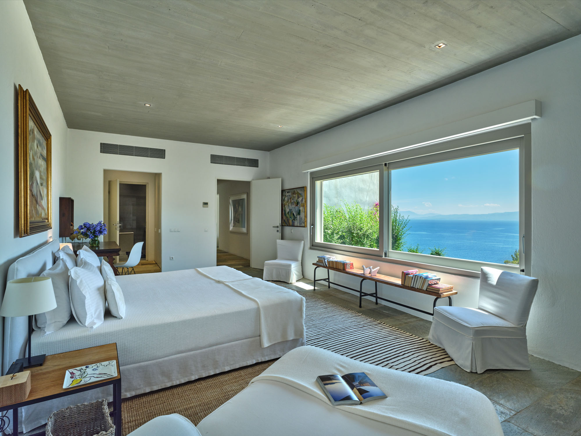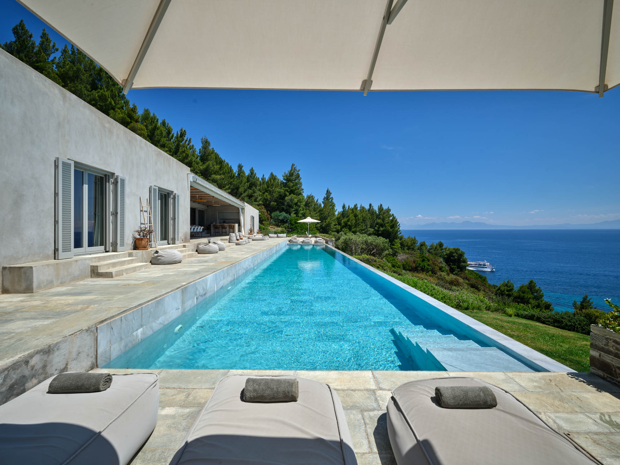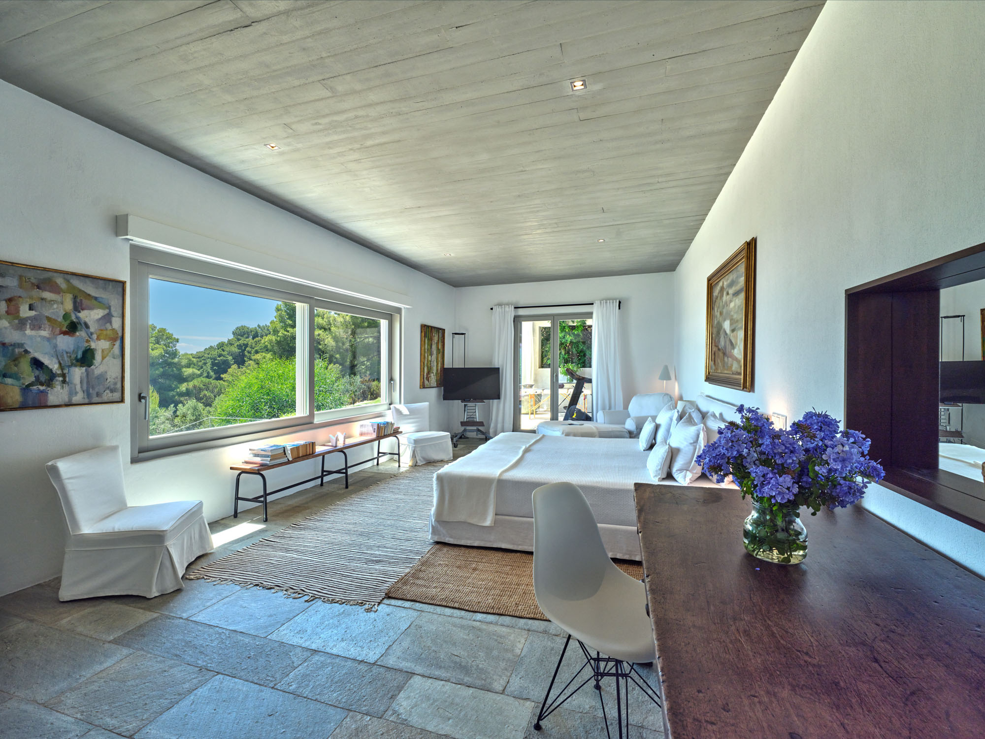 They open to a covered expanse of terrace housing a long dining table for 12, with overhead fans, barbecue and fridge. Steps lead down to an inviting 25m Parian marble freshwater swimming pool, beside which are an outdoor projector and large, comfortable sun loungers. A chef is available to prepare meals.