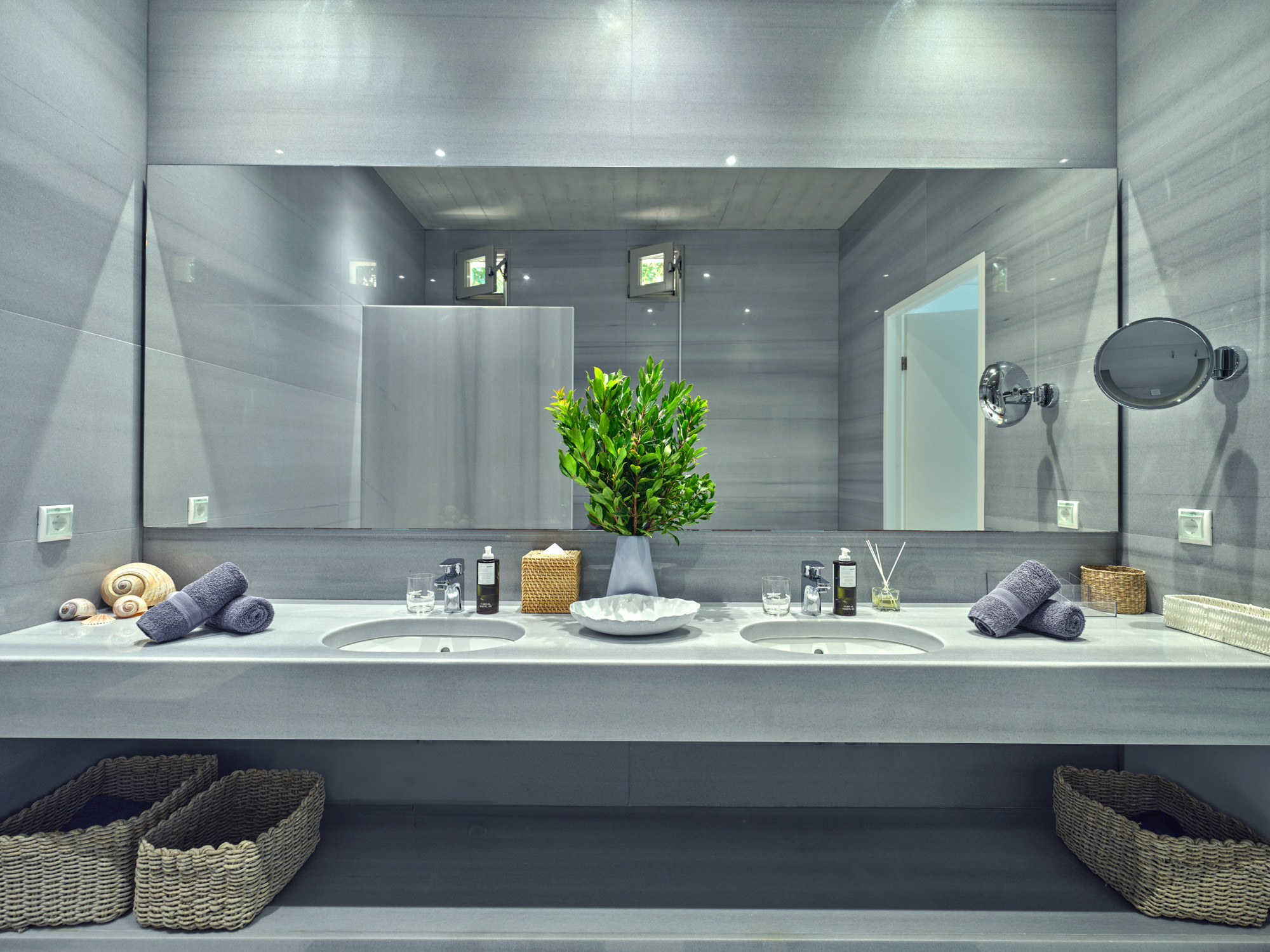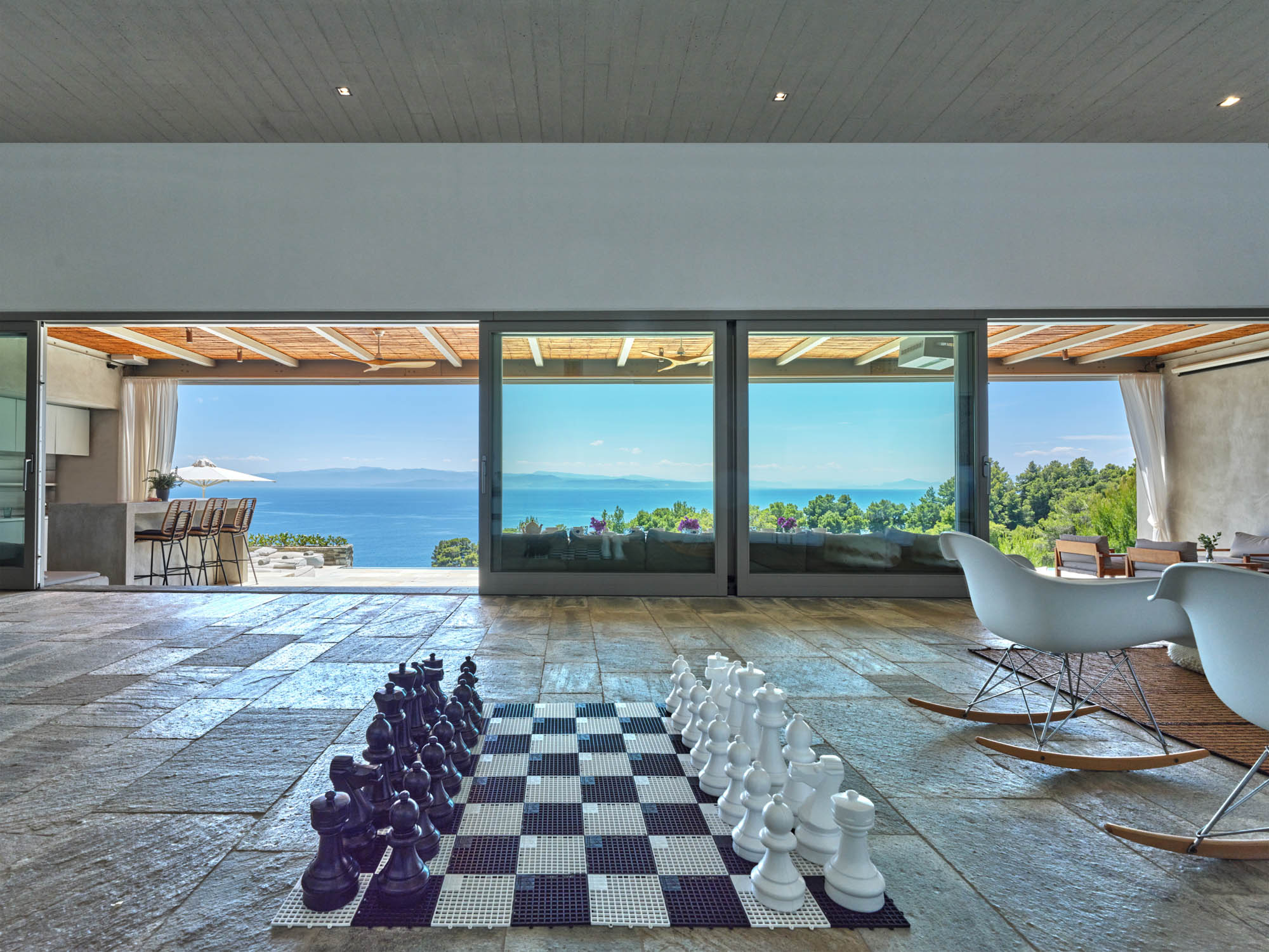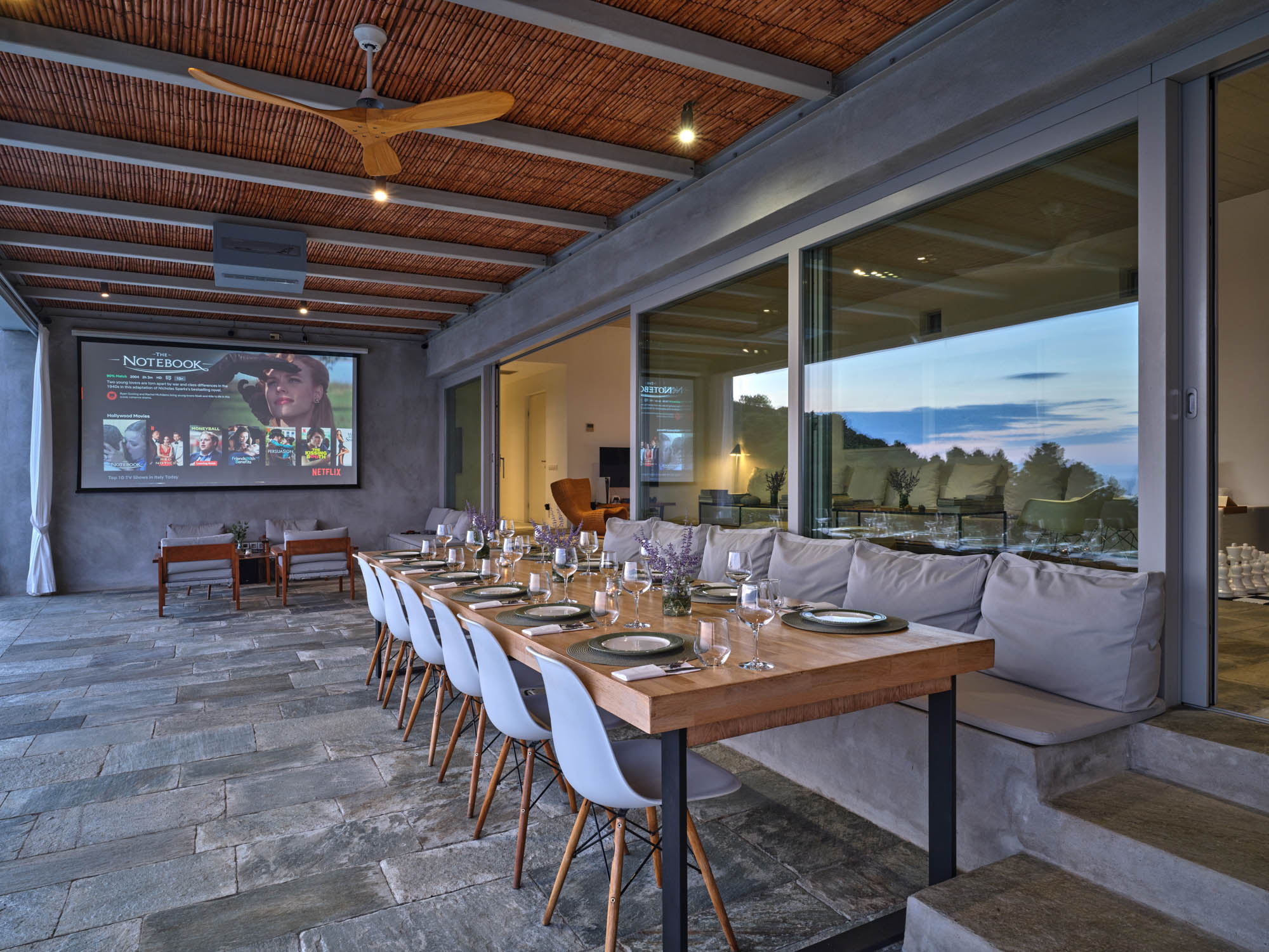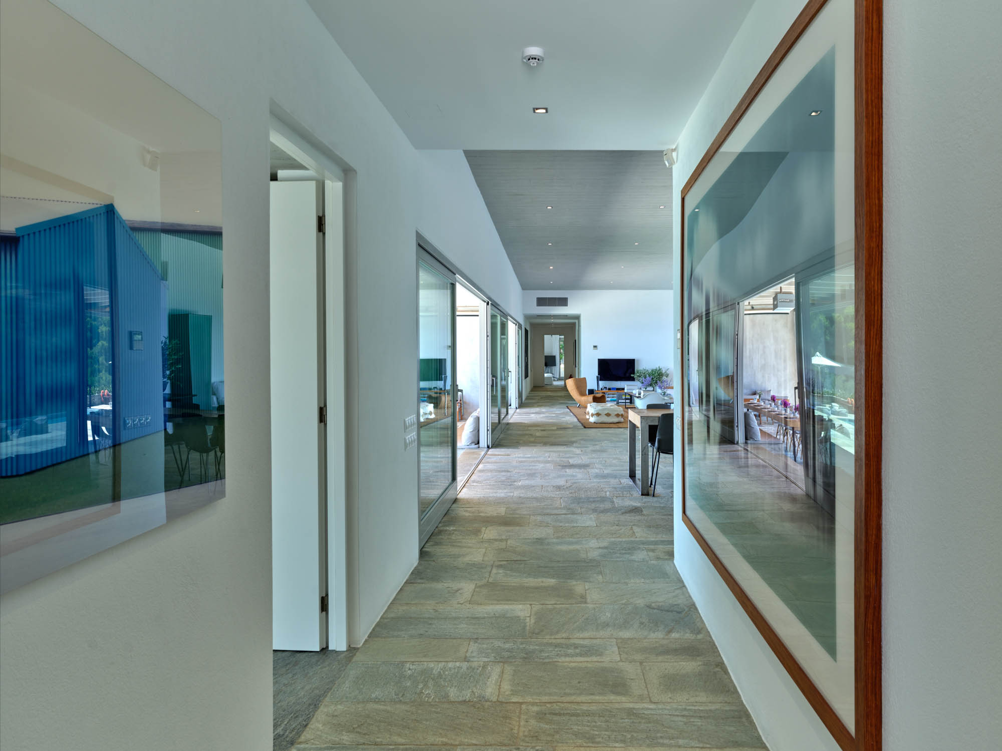 They open to a covered expanse of terrace housing a long dining table for 12, with overhead fans, barbecue and fridge. Steps lead down to an inviting 25m Parian marble freshwater swimming pool, beside which are an outdoor projector and large, comfortable sun loungers. A chef is available to prepare meals.