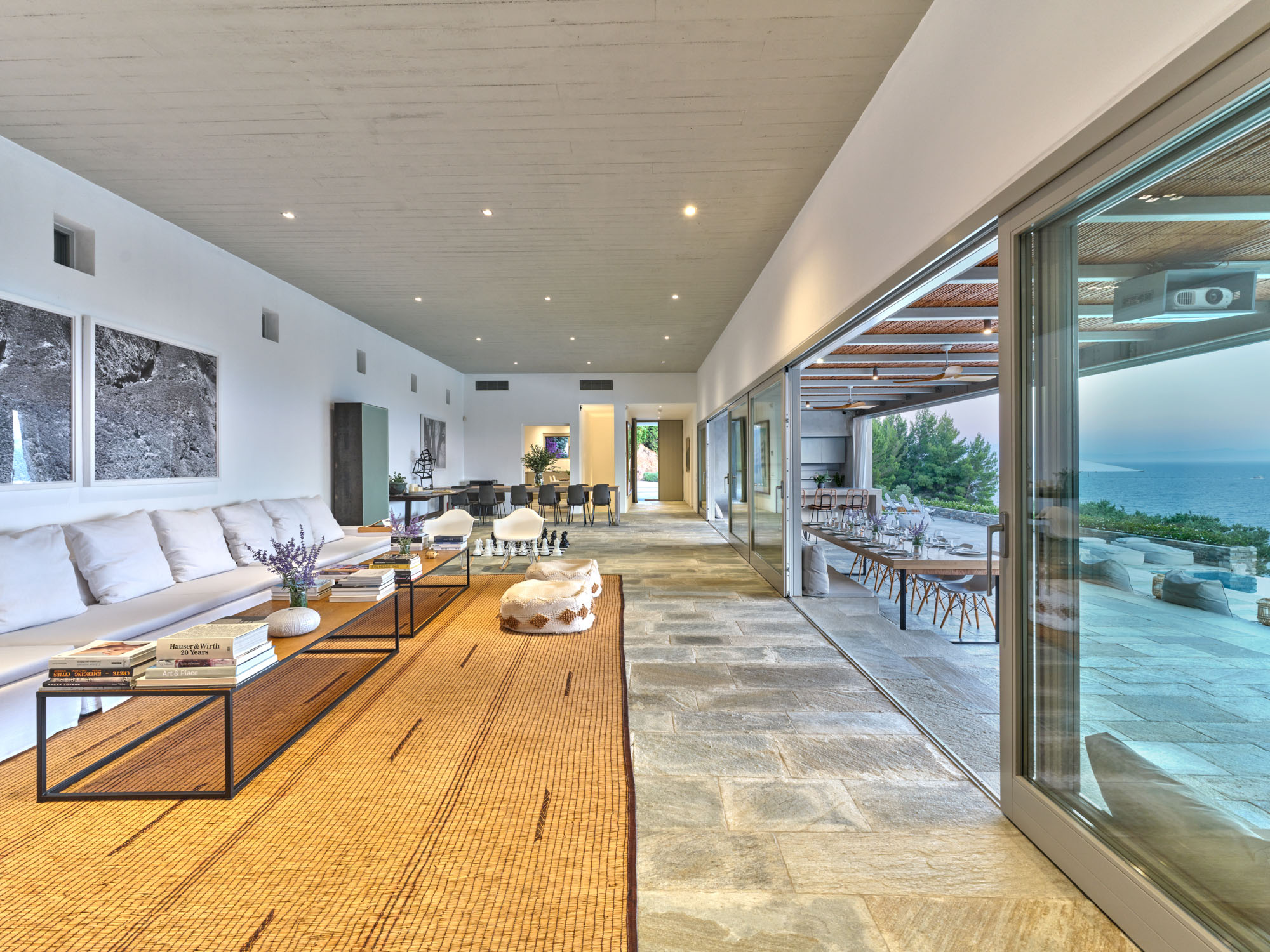 The large open-plan living and dining room has wonderful sea views and lots of light. The uncluttered, minimalist interiors create a calm, restful ambience without sacrificing comfort and welcoming decorative details.
