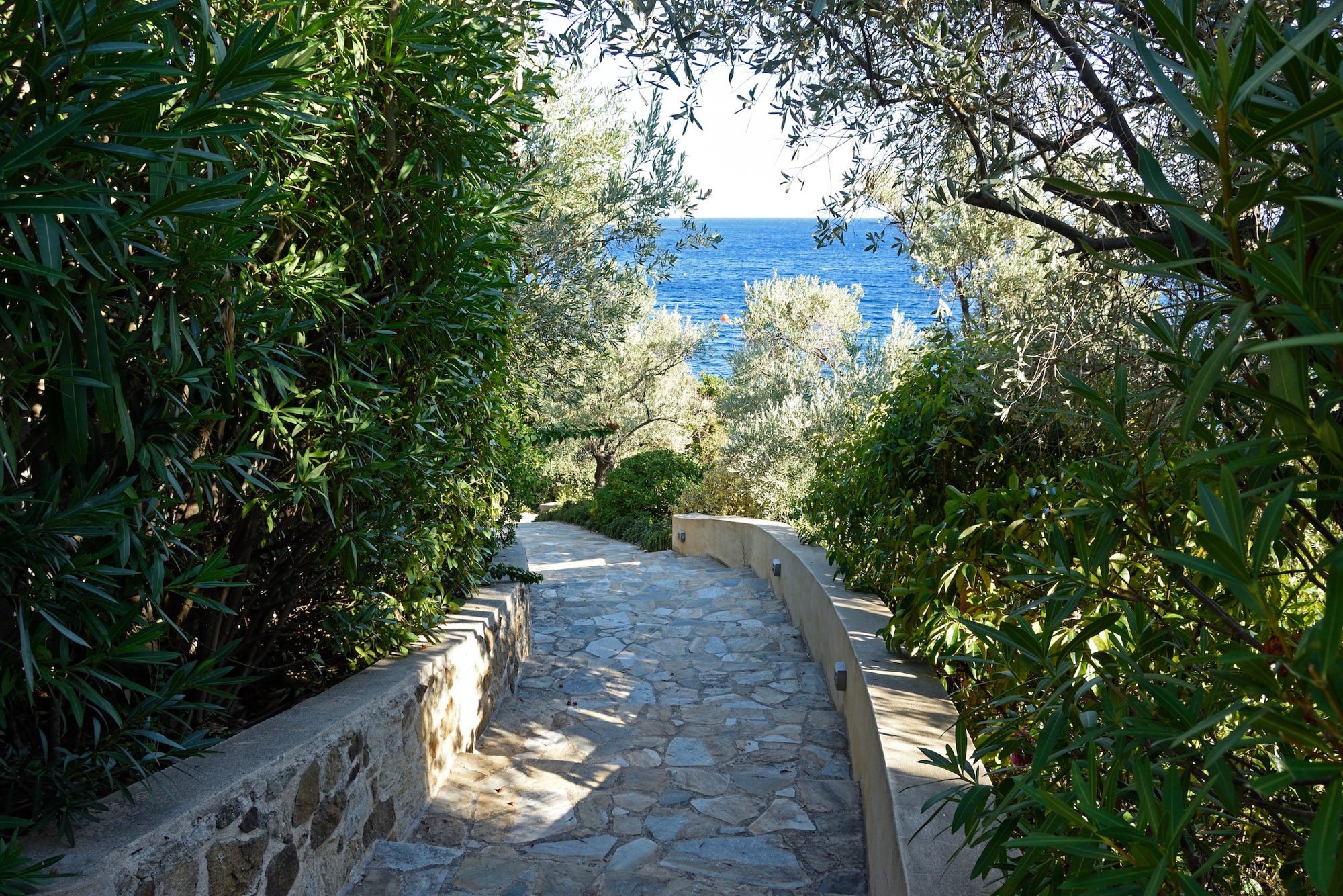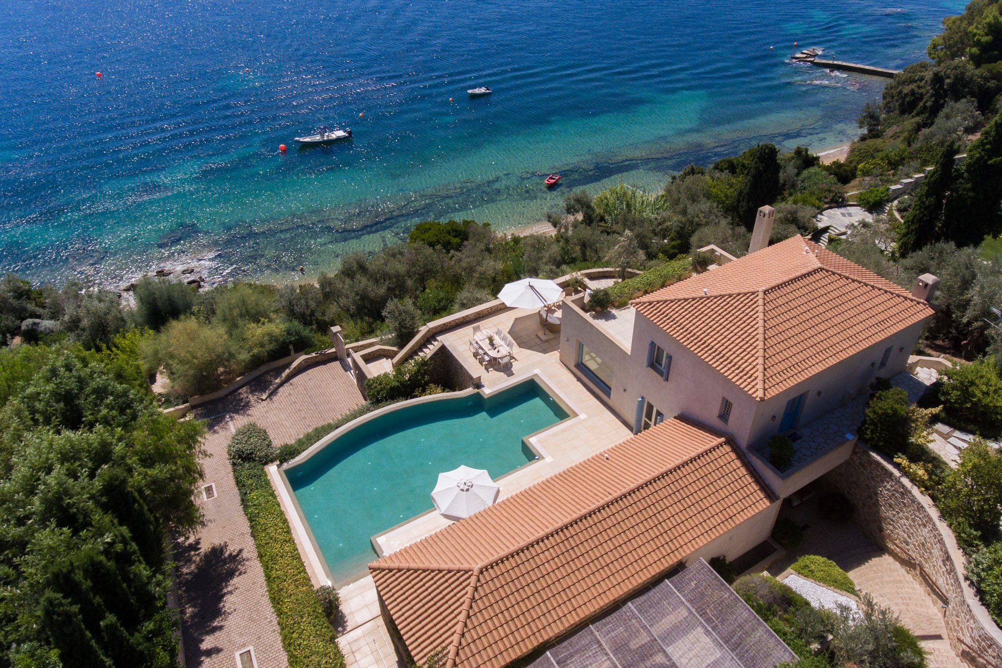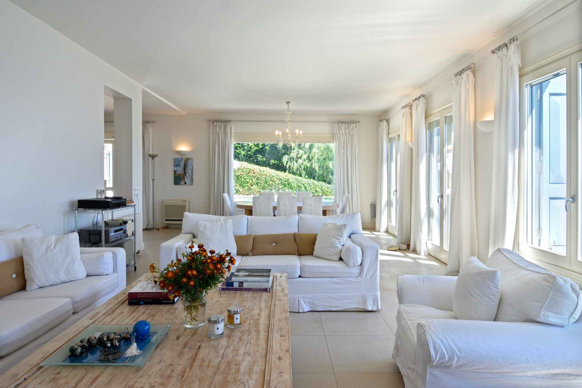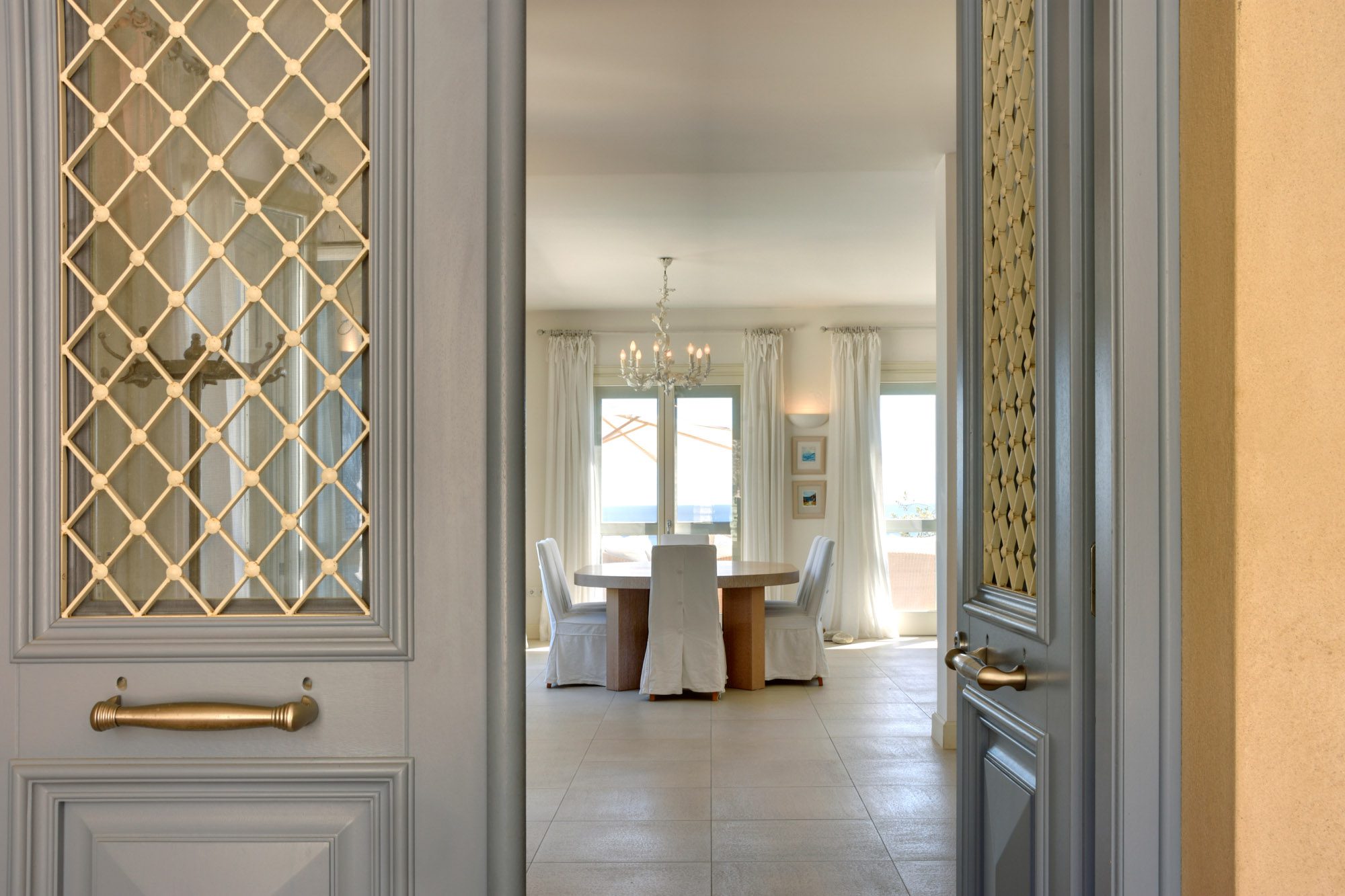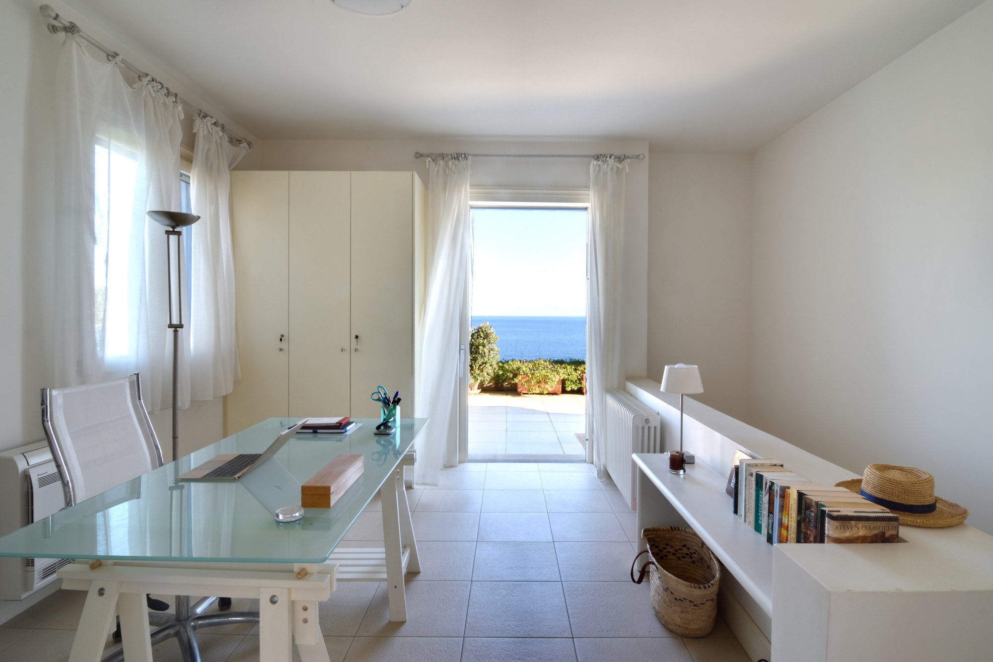 The master on the top floor has a large private balcony, walk-in closet, and study room. The first-floor open-plan living and dining space has excellent sea views, doors to the terrace, a dining table that seats 14 people and a well-equipped kitchen.