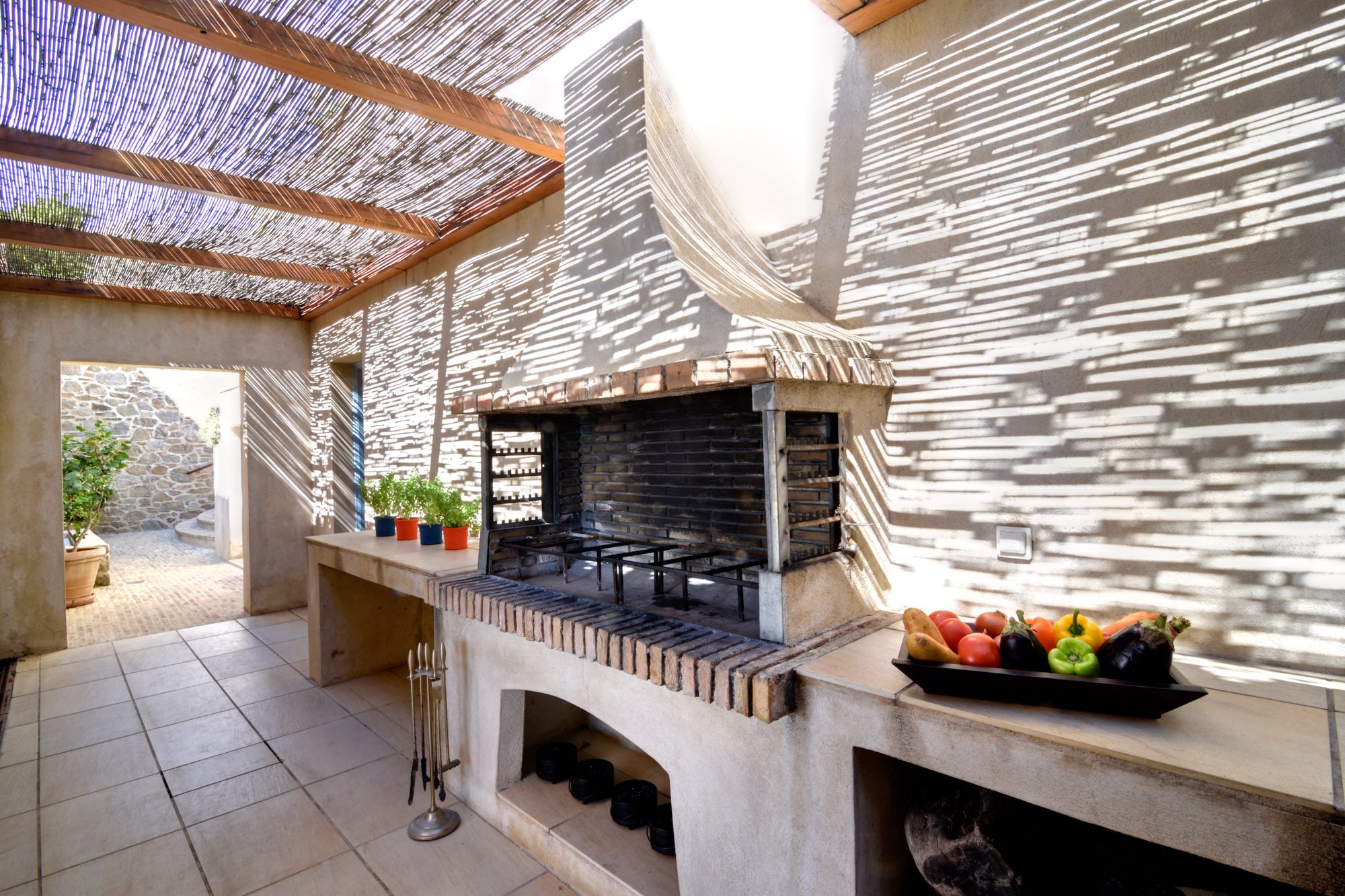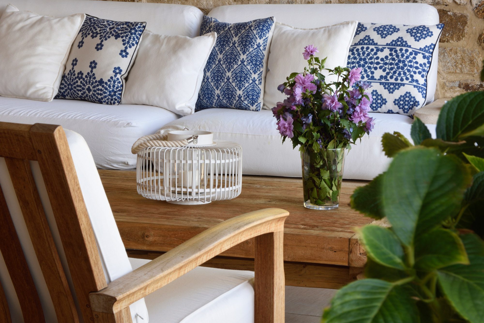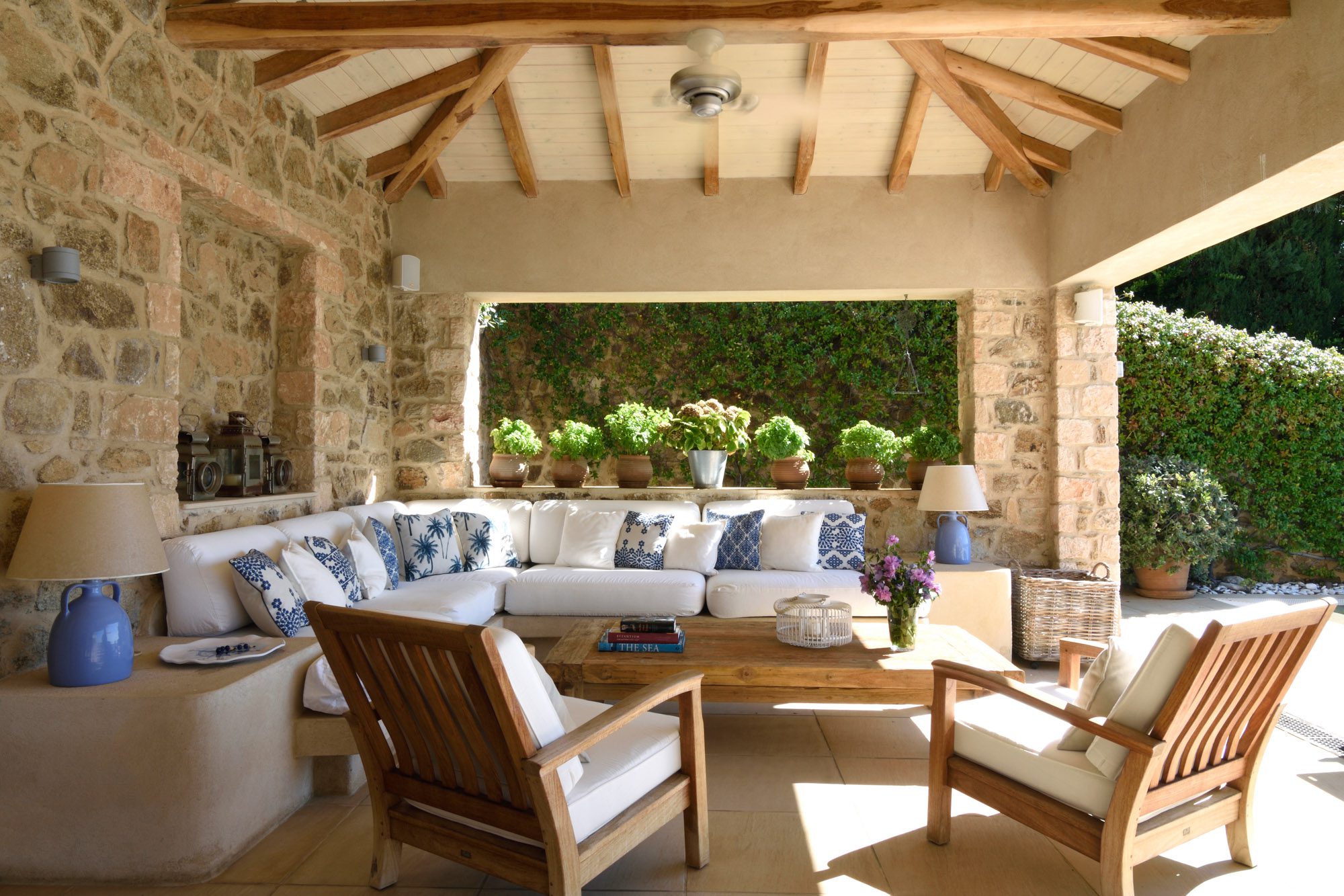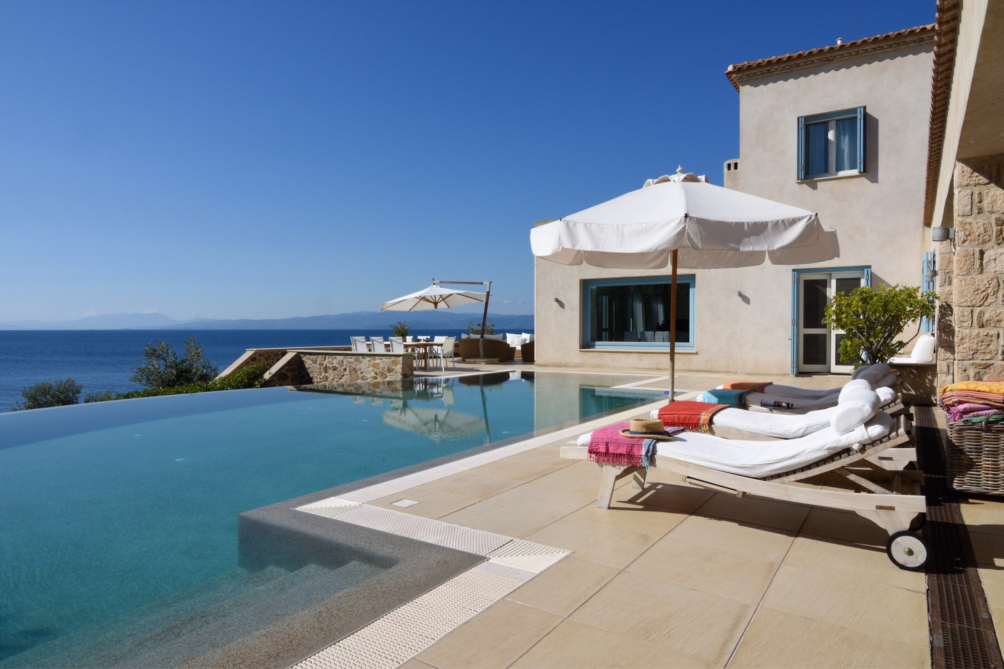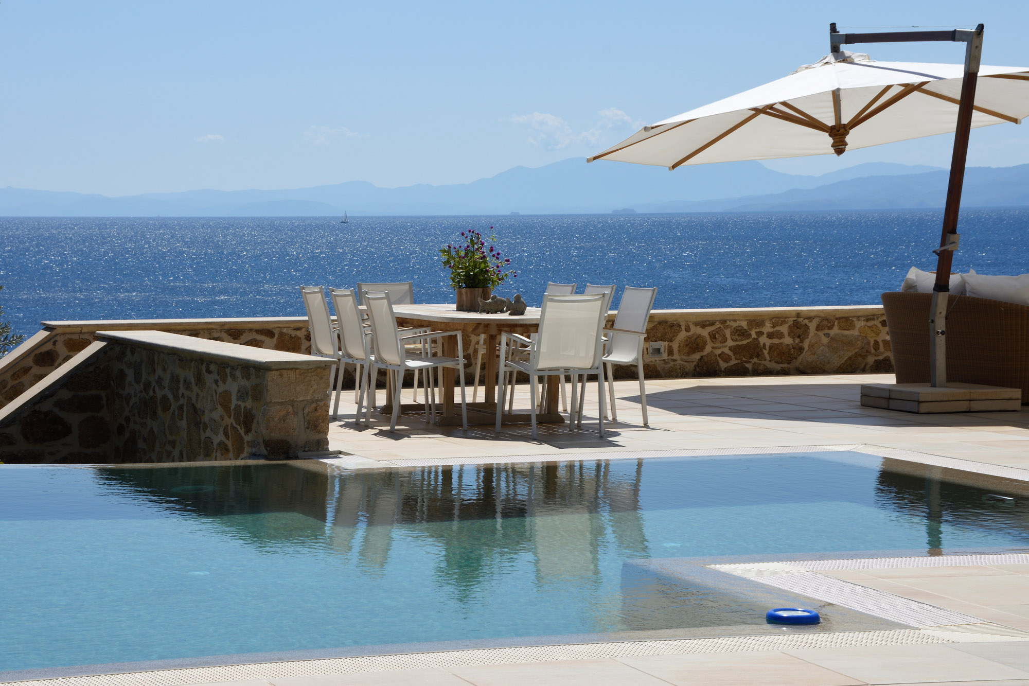 There are sun loungers, a dining table, and chairs overlooking the sea. There's also a second dining table, chairs, and separate seating with sofas shaded by a veranda. The beach has sunbeds and parasols for guests to use.