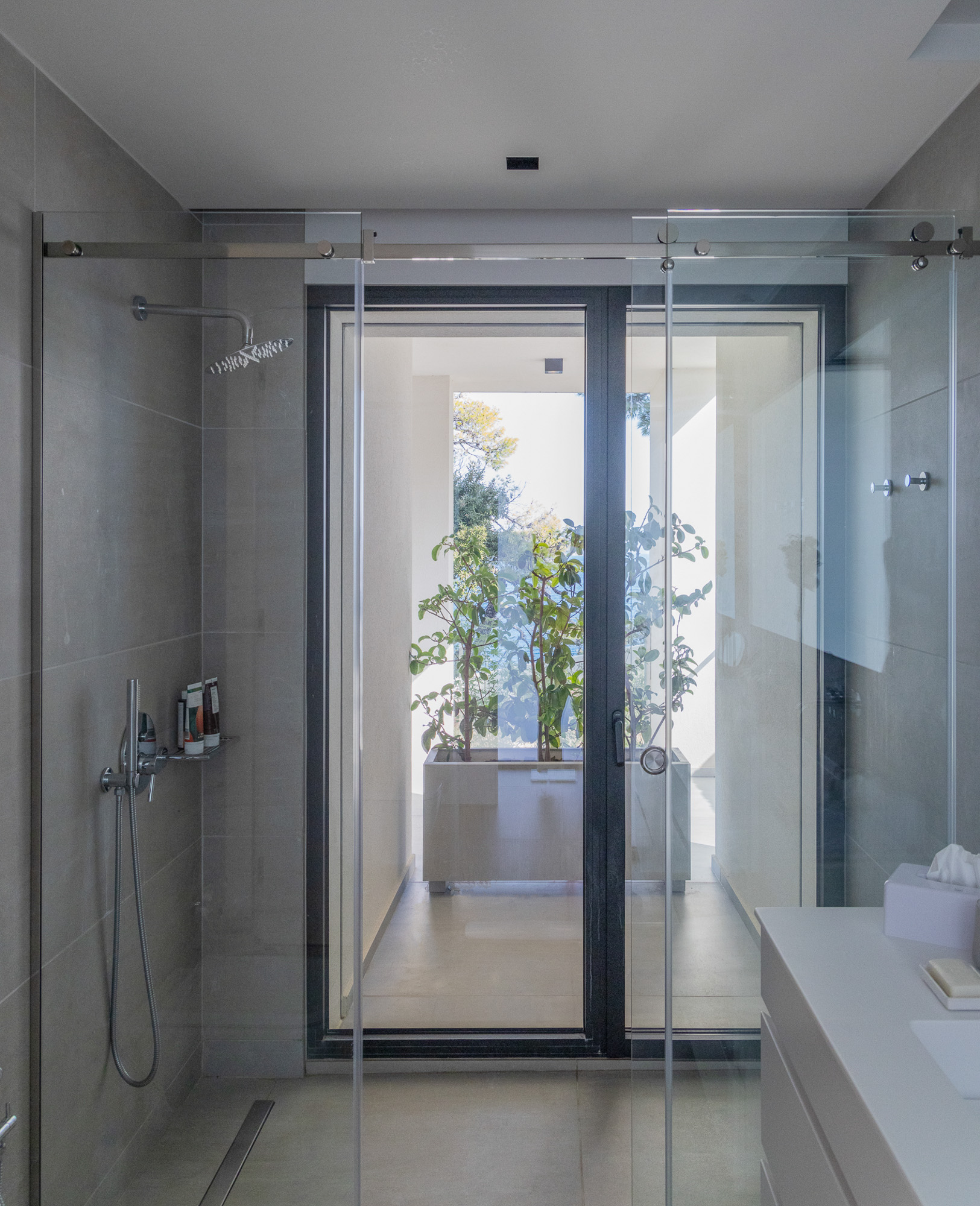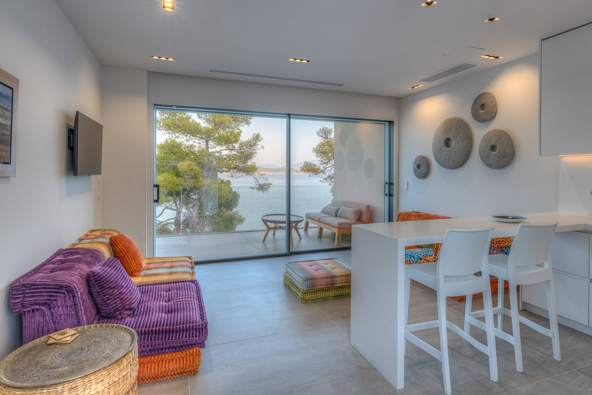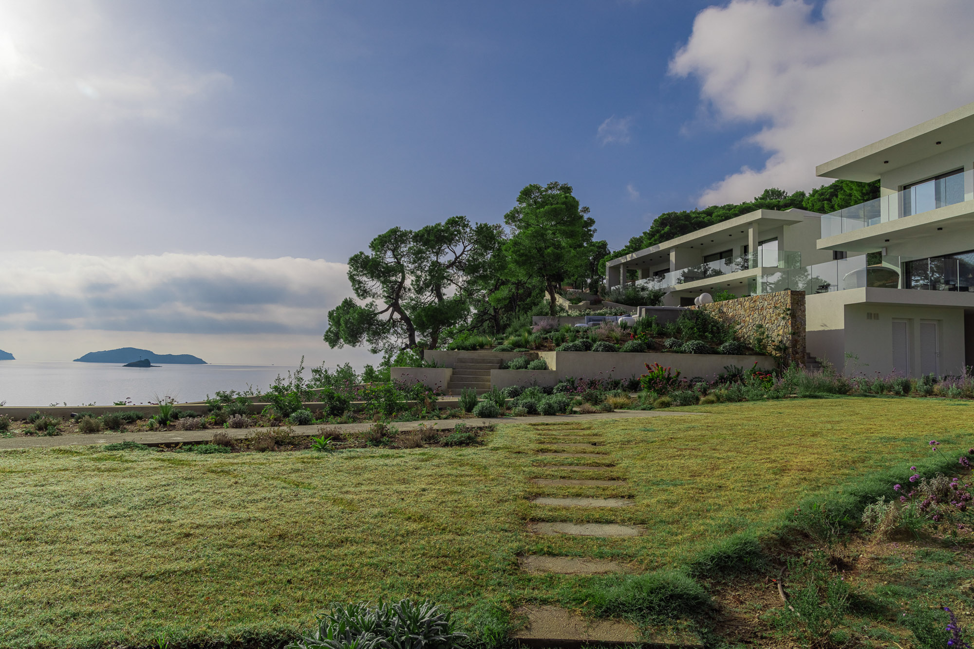 With two main sections, separated by the pool area, it accommodates 14 people, making it ideal for two families or multigenerational groups. At the edge of the garden, a staircase winds down to a secluded sandy beach.