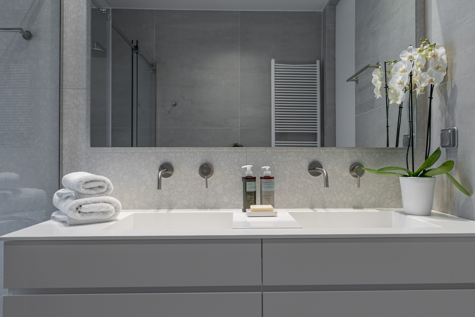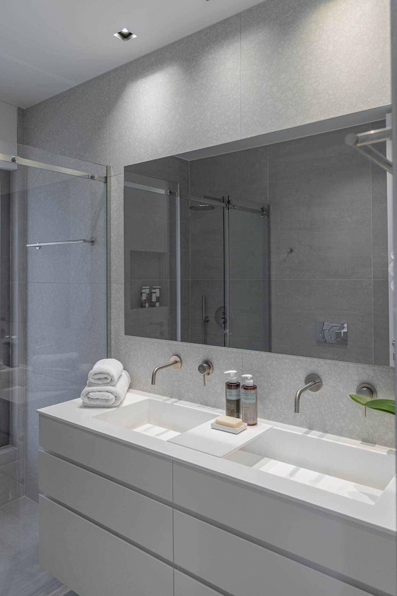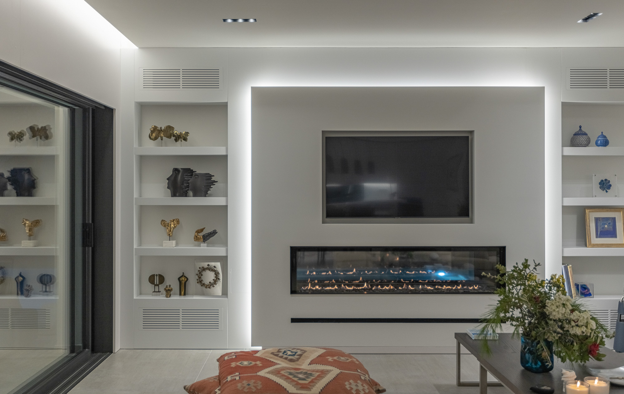 There's a media wall with an inset fireplace and glass doors leading to panoramic views on the terrace. The bedrooms are split across the main and garden houses over two floors, providing guests with plenty of privacy. Two of those in the garden house are independent suites with sitting rooms, fully equipped kitchens, and furnished terraces.
