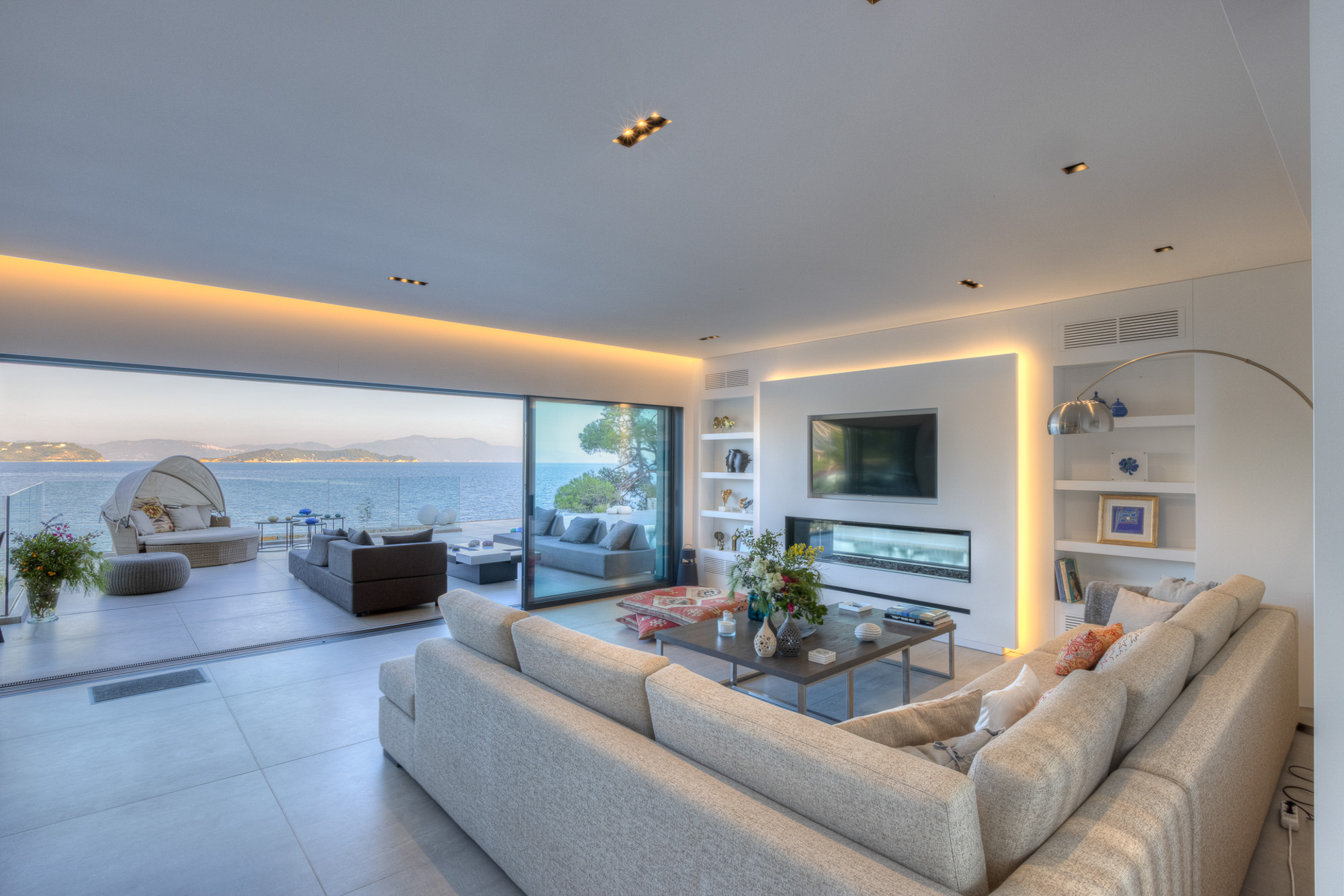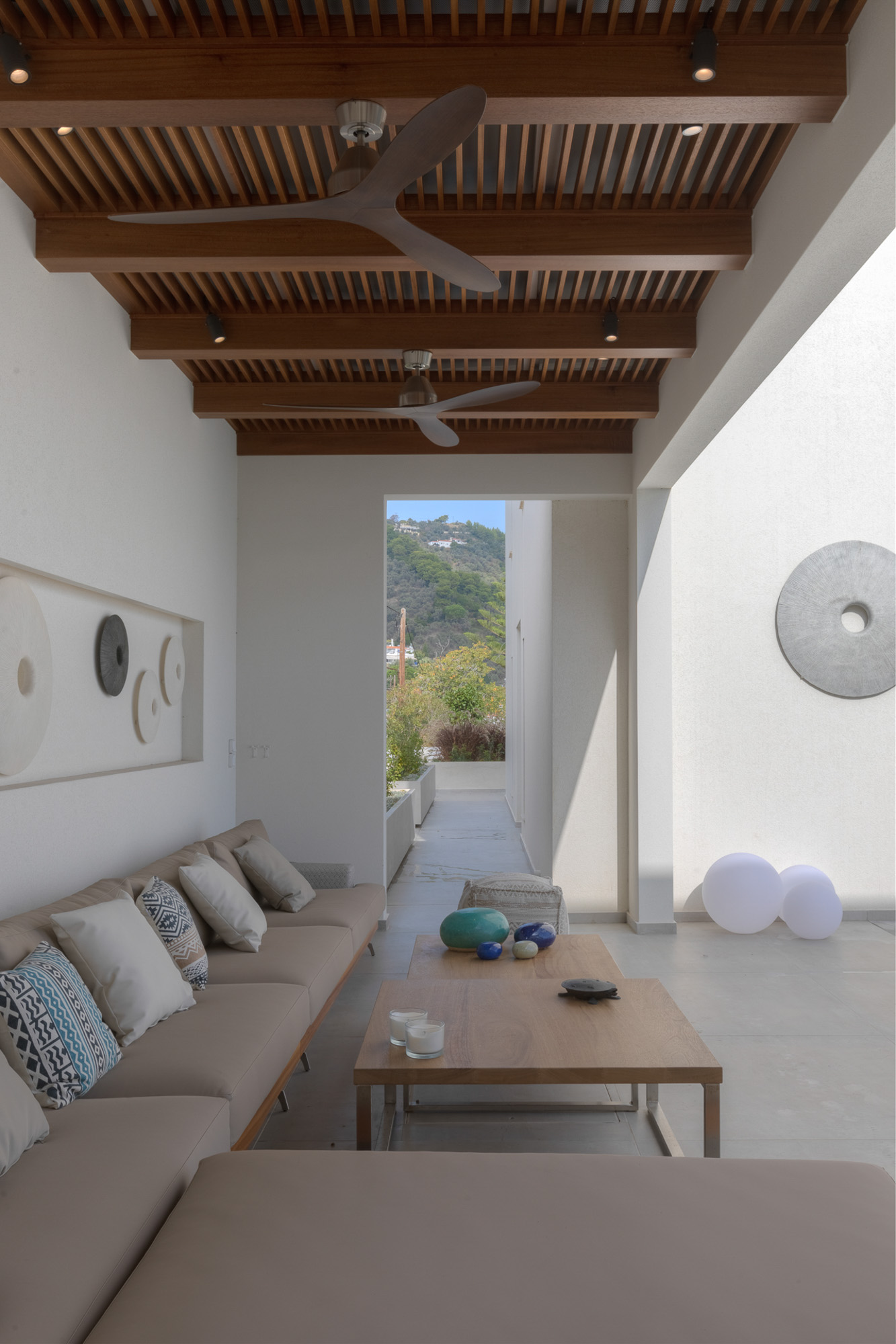 On one large terrace is a beautiful infinity pool with sea views. There's a variety of comfortable seating, drinks tables, and a dining table for 12. A few steps lead down to a lower terrace with built-in lounging seating, the perfect spot to relax in company, take in the views, enjoy the sunsets, or gaze at the stars.