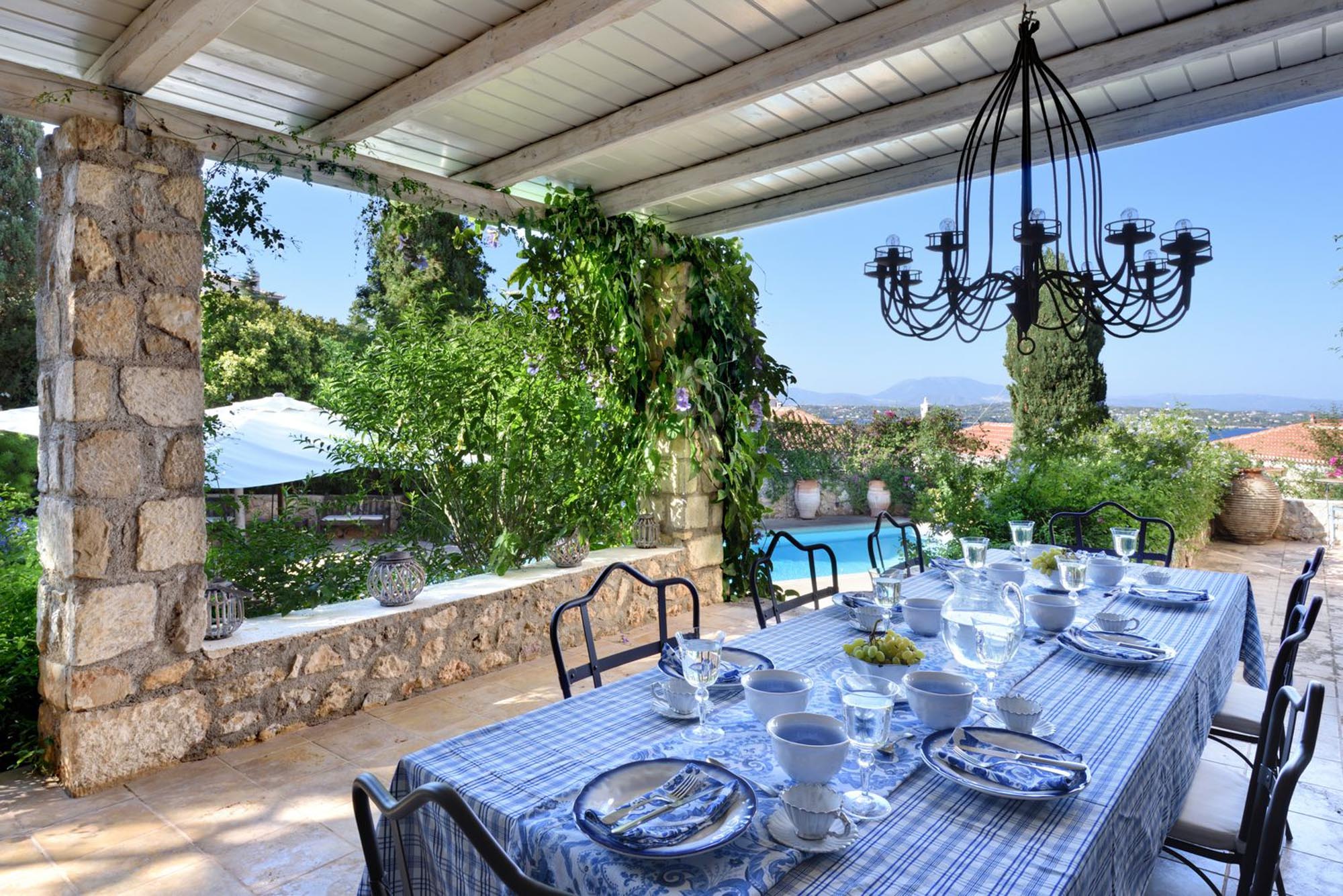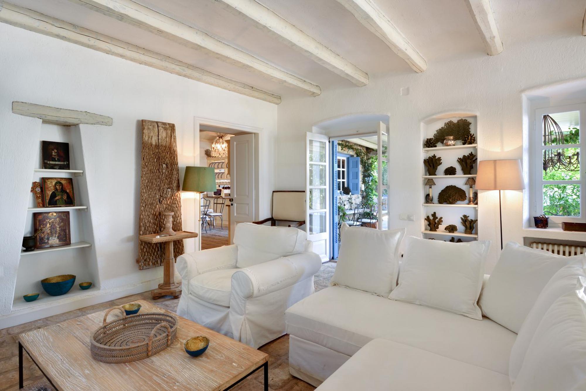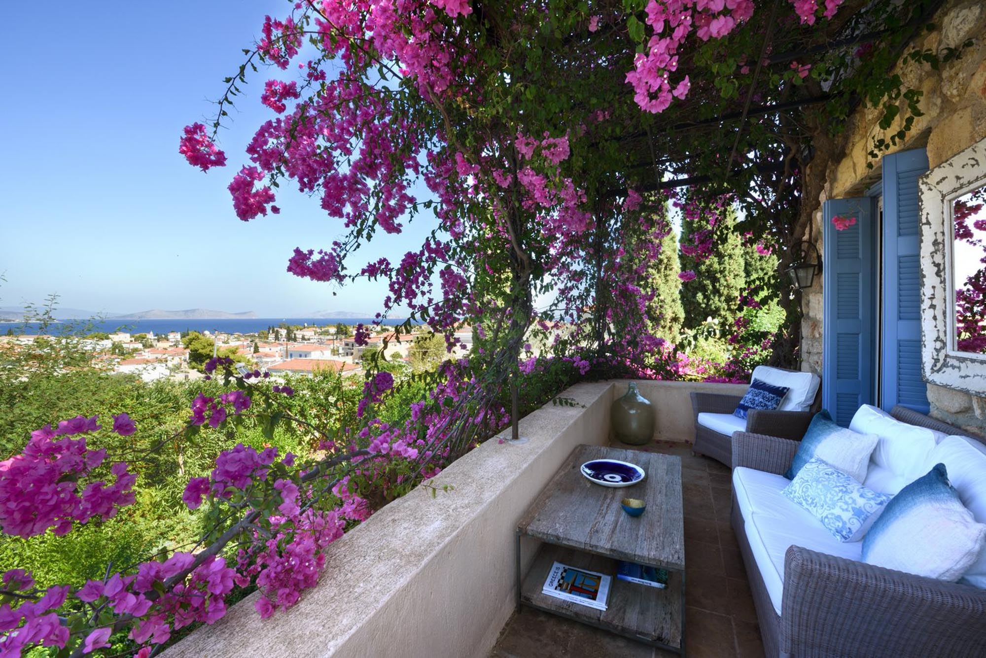 The garden features a traditional charcoal BBQ, two expansive outdoor dining tables, and several cosy lounge areas perfect for unwinding. Three generous balconies provide breathtaking views of the swimming pool, the Saronic Gulf and Hydra, the beautiful garden, and the vibrant town of Spetses.