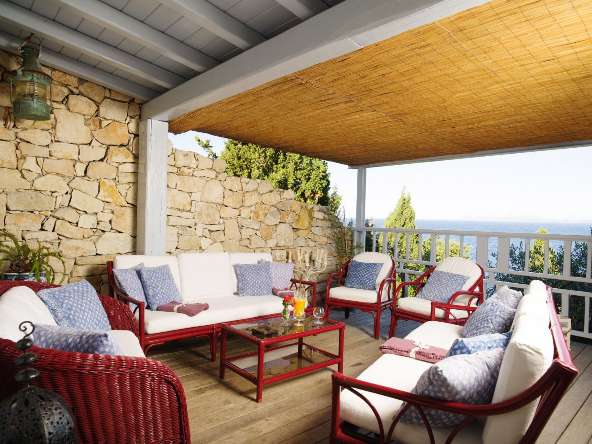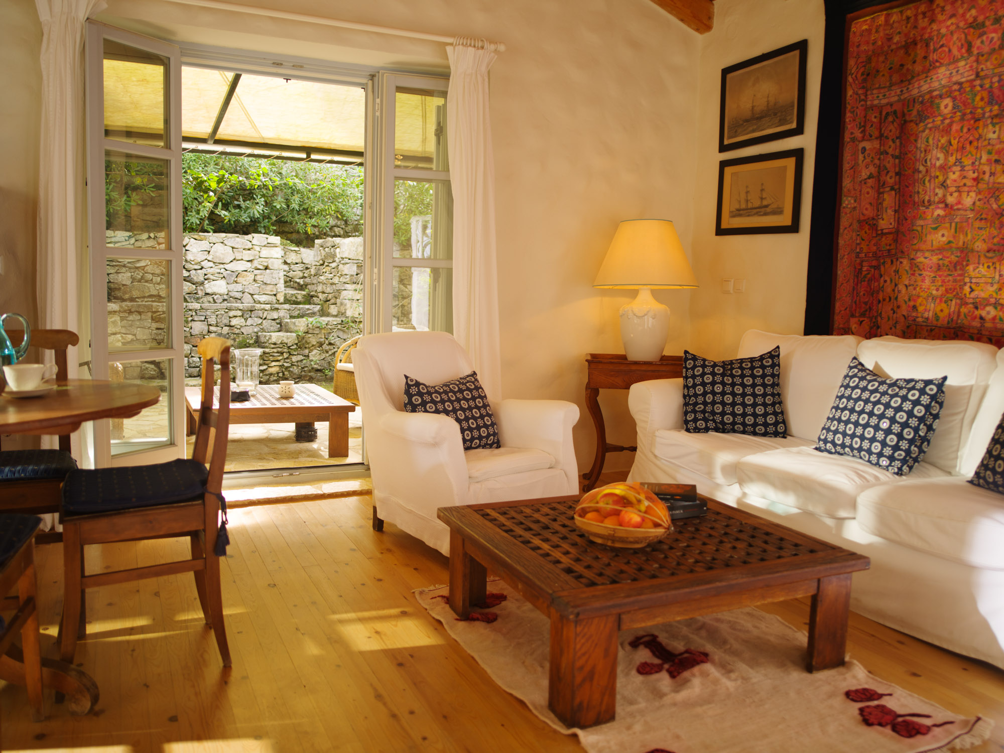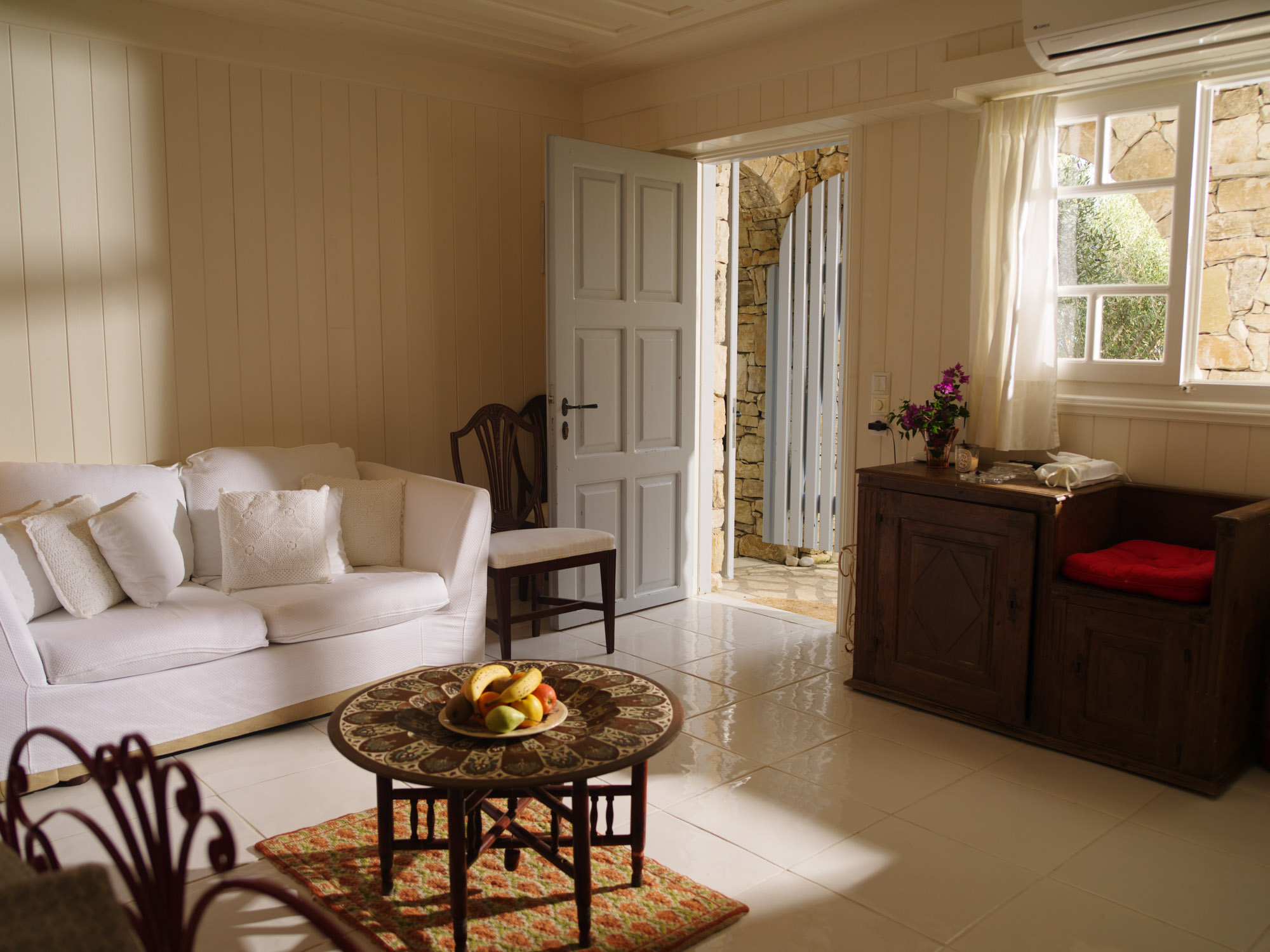 The interiors of the cottages are beautifully furnished, combining traditional Greek elements with modern comforts to create a warm and inviting atmosphere.