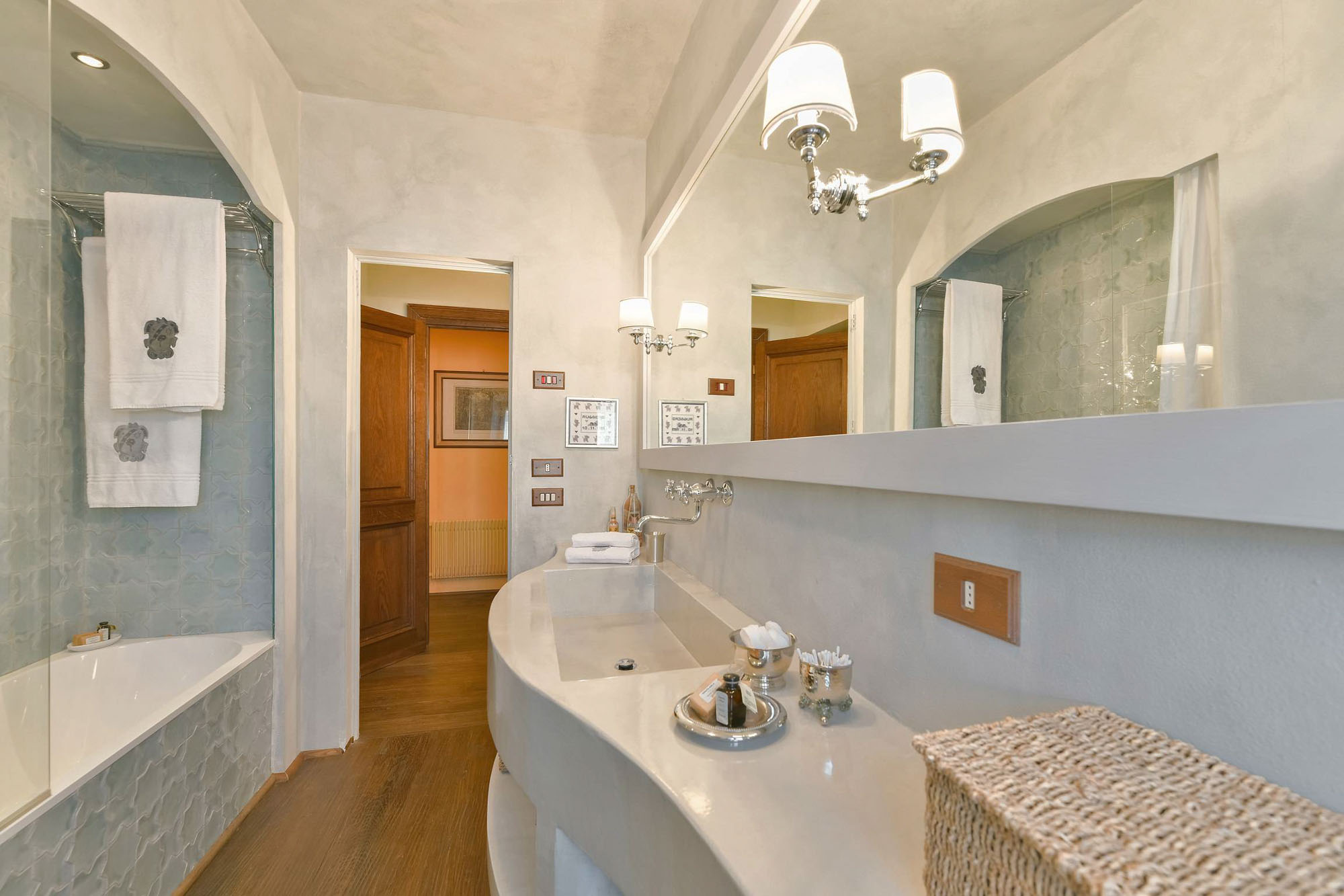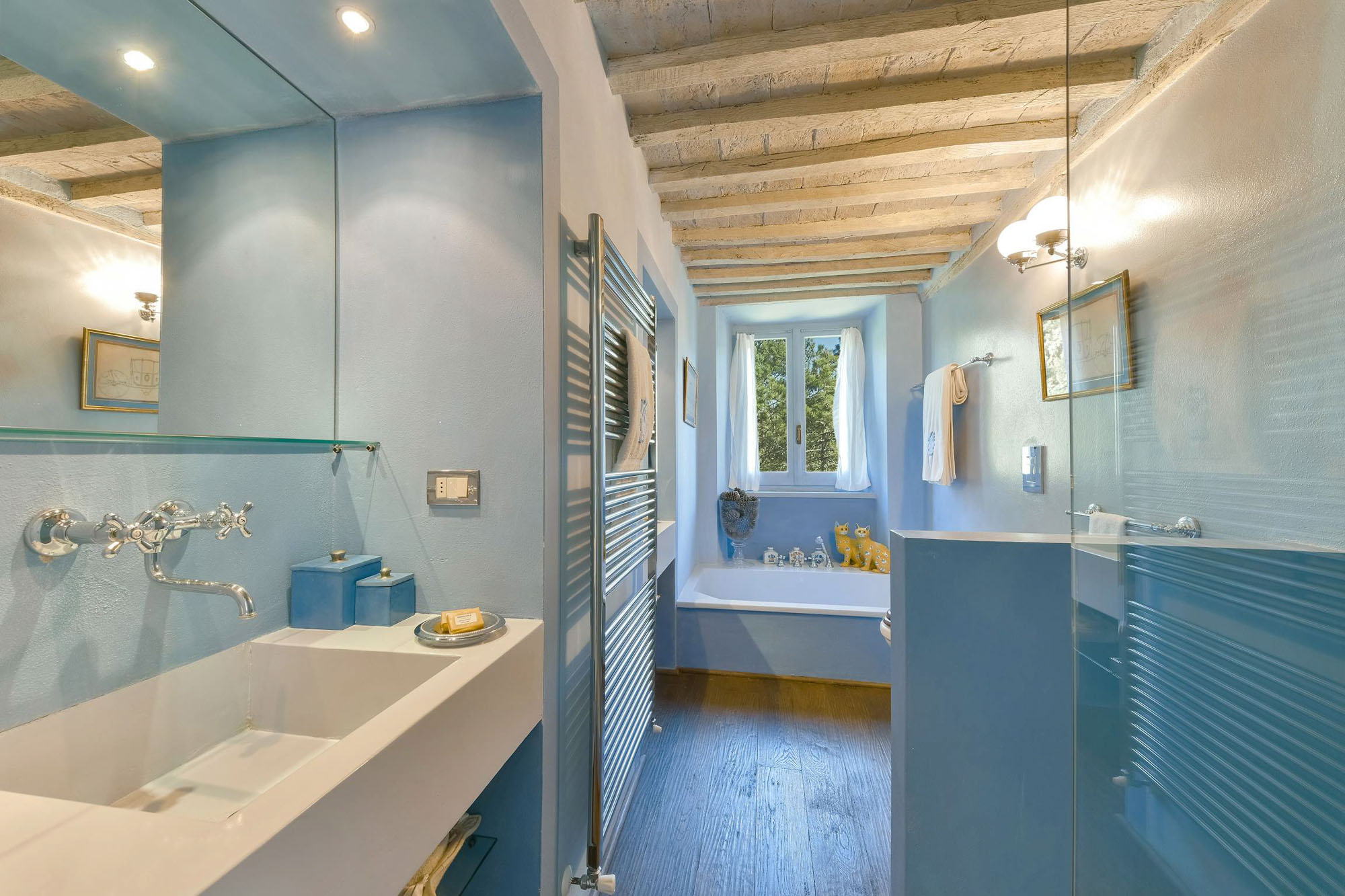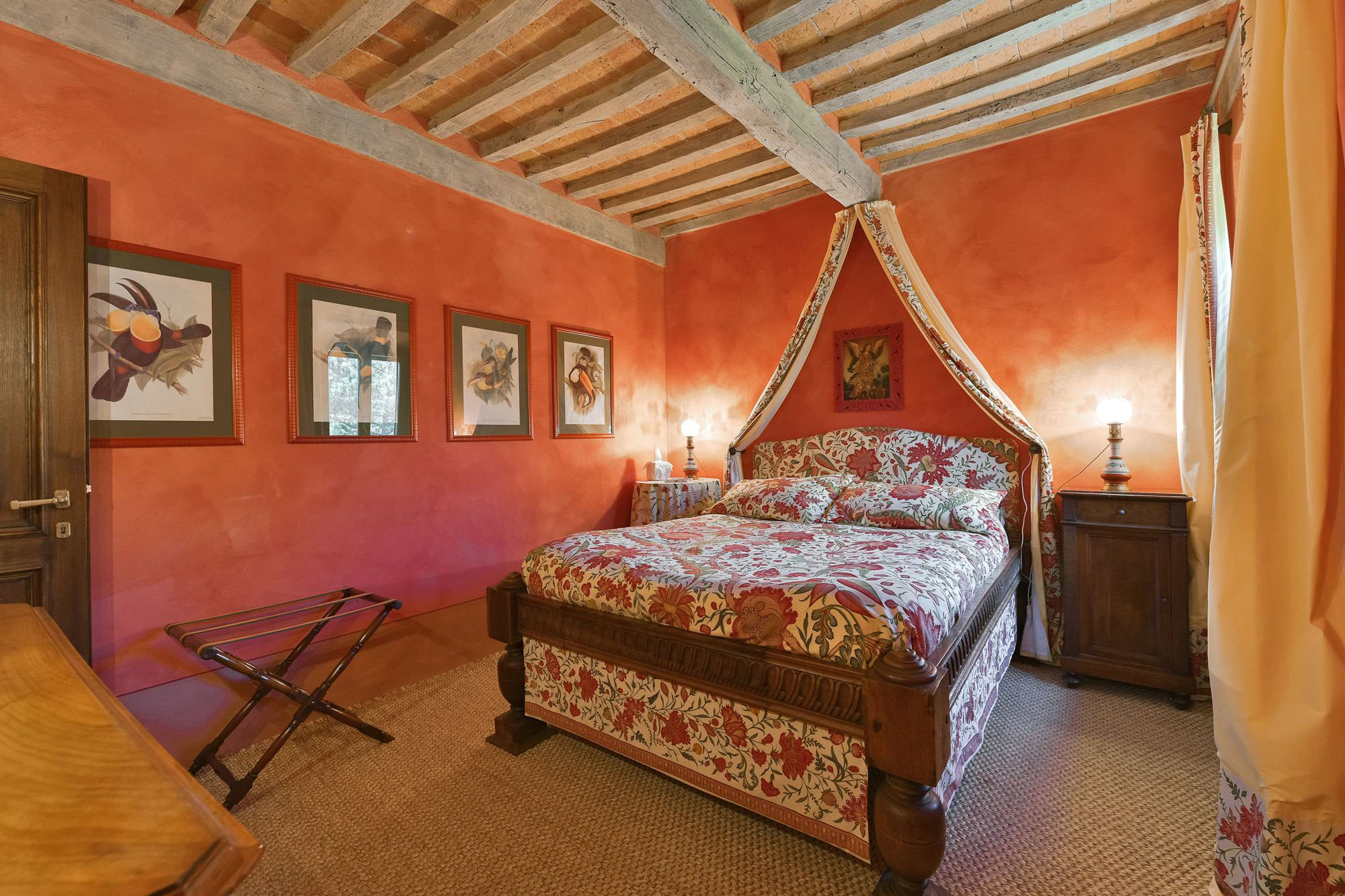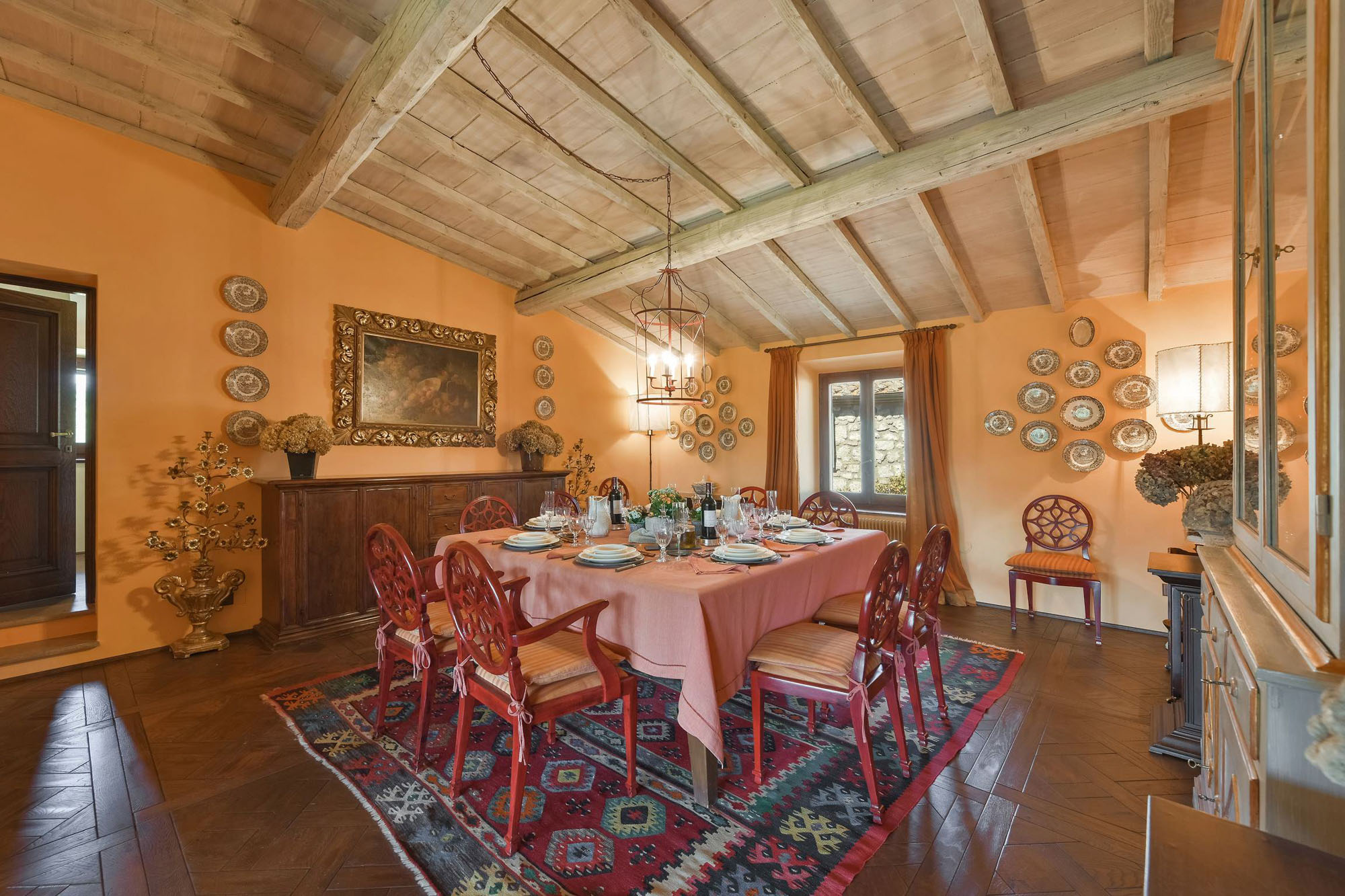 The remaining four bedrooms are on the first floor, two of which share a bathroom, and the other two are larger suites. Elegant living and dining rooms, with polished wooden floors and large colourful rugs, are also on the first floor, together with a TV room and a small kitchen. Another kitchen/dining room is on the stone vaulted ground floor, with a stone arch opening to a billiards room.