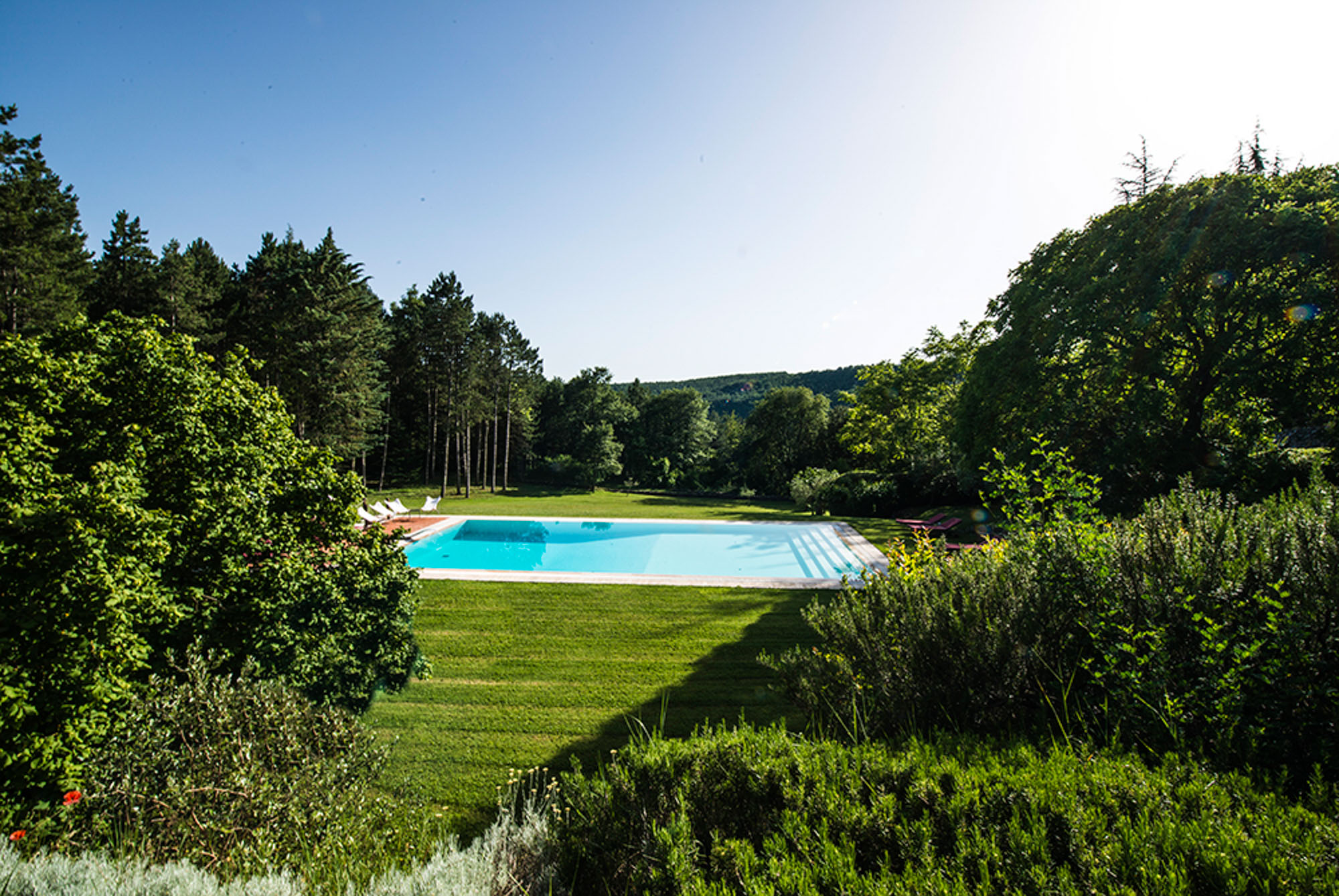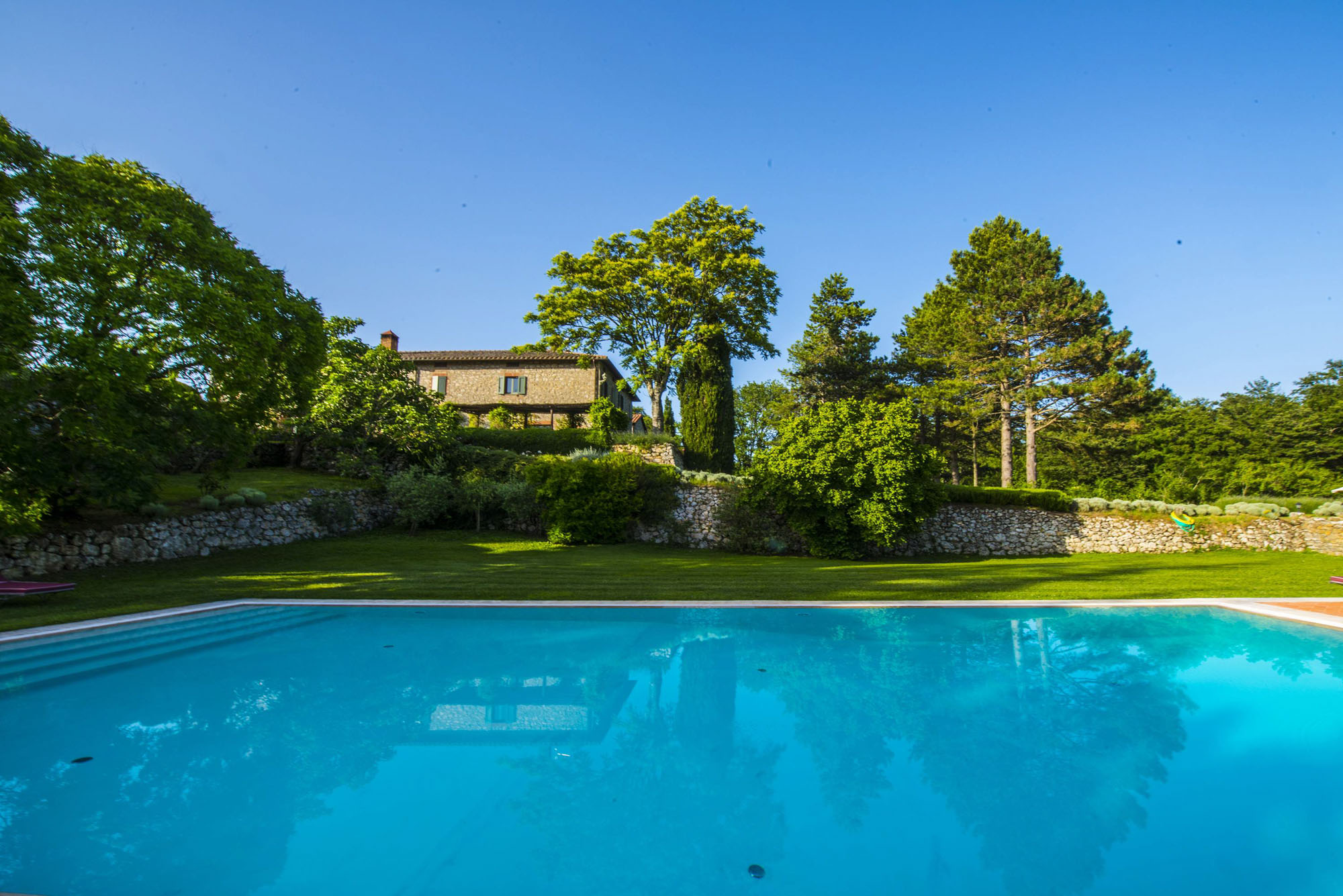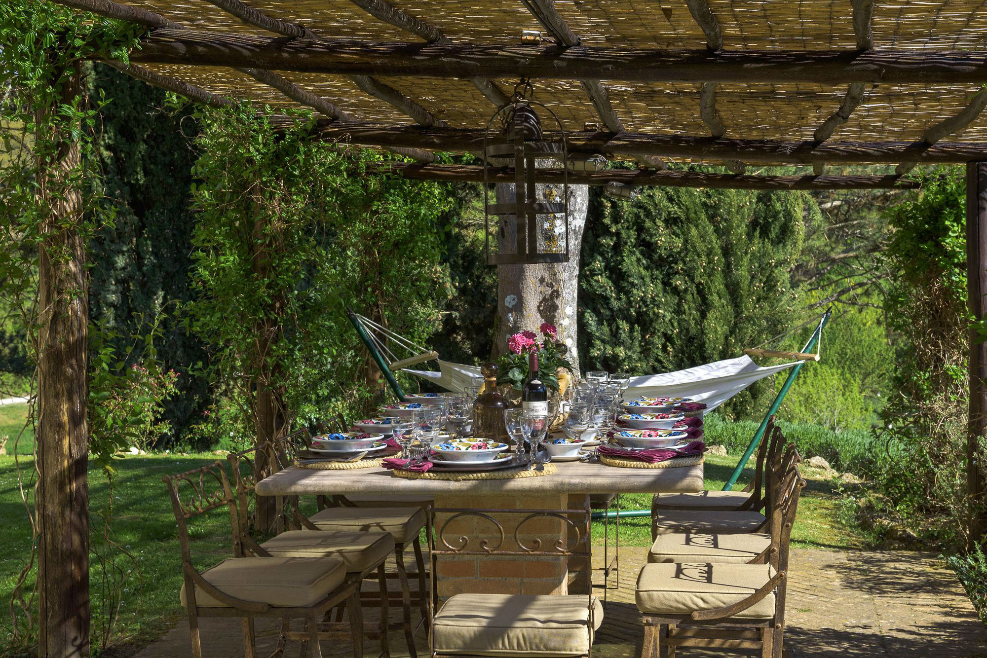 A pergola shades a dining table for al fresco meals, and an 18-meter swimming pool is on a lower lawn. There's lots of green space for playing games; table tennis and badminton are provided. Guests can explore the property's private trails with scenic walks and bike rides and take day trips to the nearby towns of Montepulciano, Montalcino, and Cetona—renowned for their rich history, exceptional cuisine, and world-class wineries.