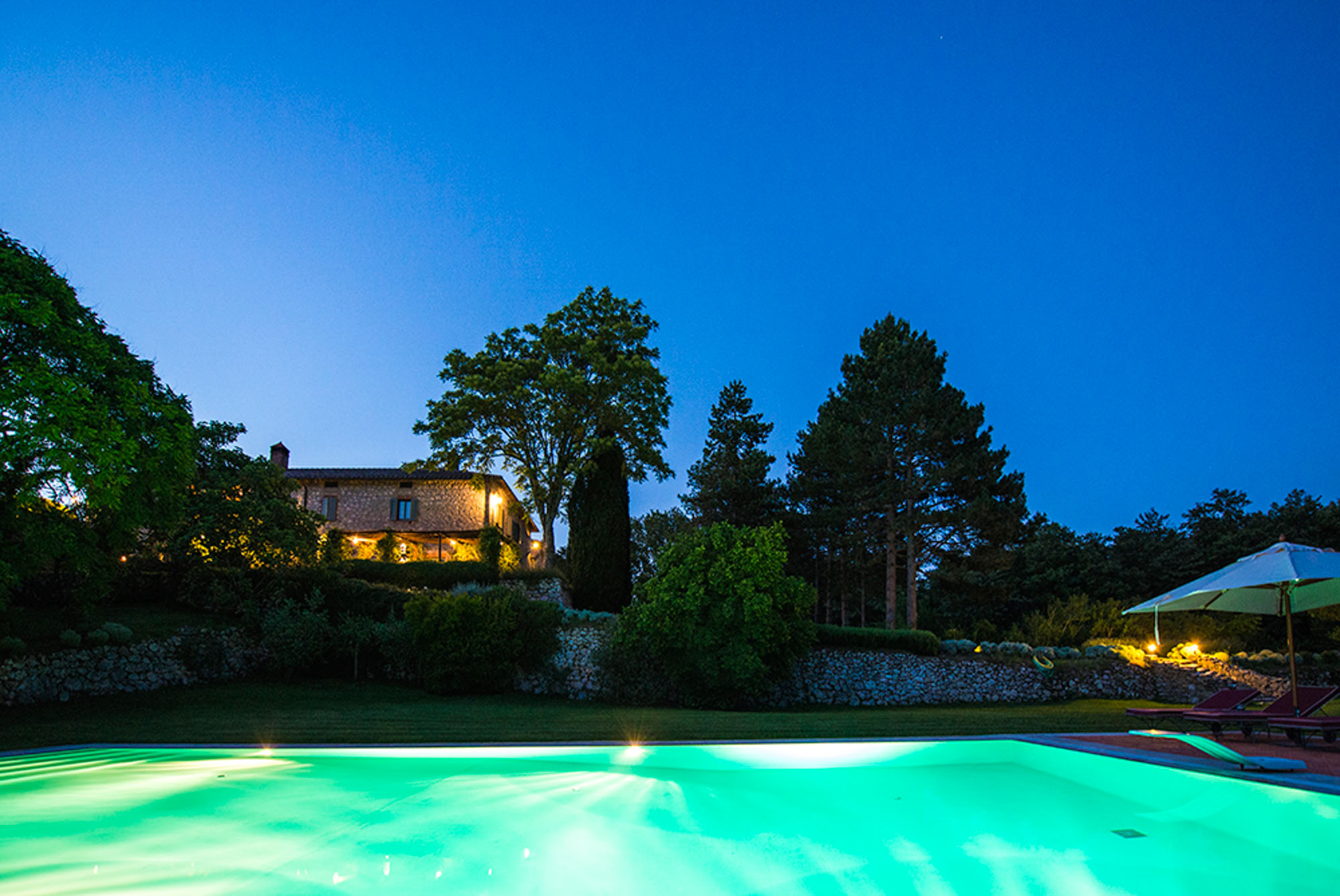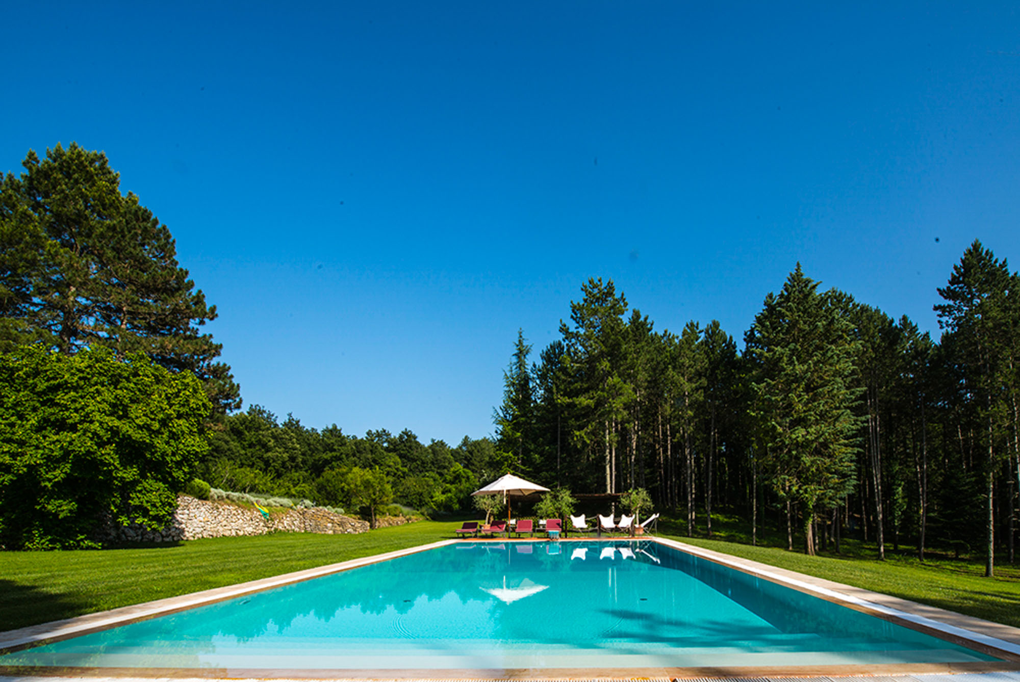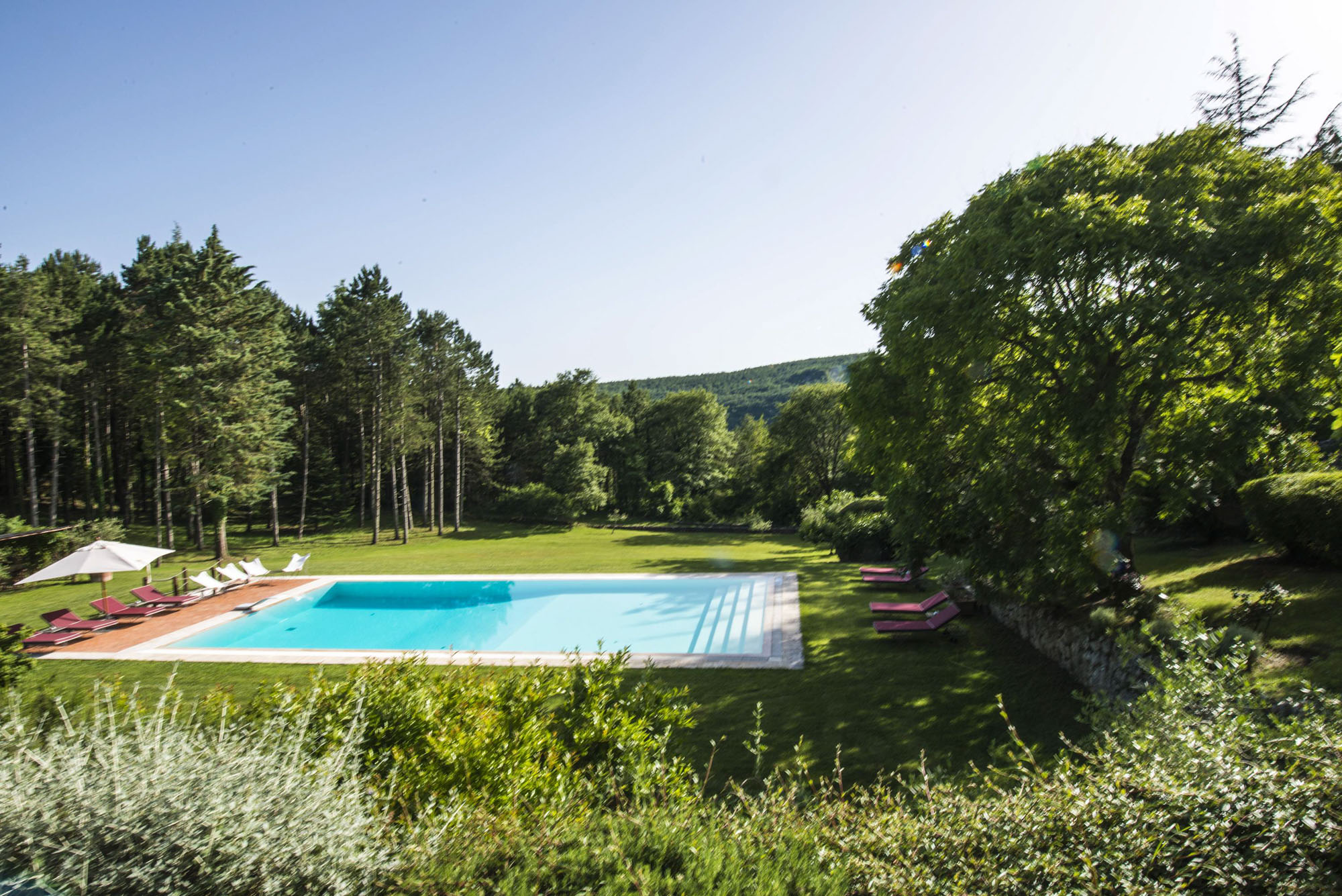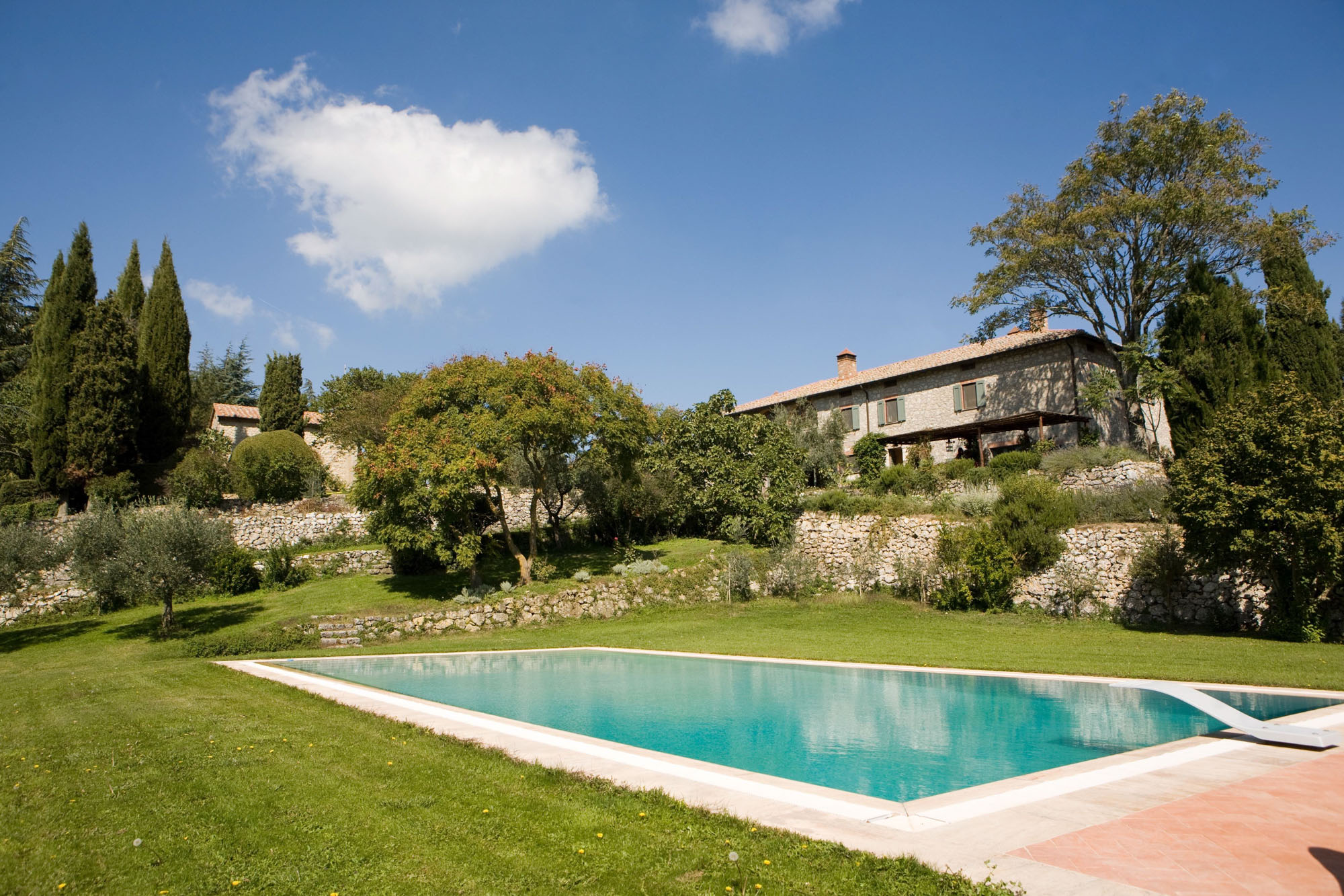 A pergola shades a dining table for al fresco meals, and an 18-meter swimming pool is on a lower lawn. There's lots of green space for playing games; table tennis and badminton are provided. Guests can explore the property's private trails with scenic walks and bike rides and take day trips to the nearby towns of Montepulciano, Montalcino, and Cetona—renowned for their rich history, exceptional cuisine, and world-class wineries.