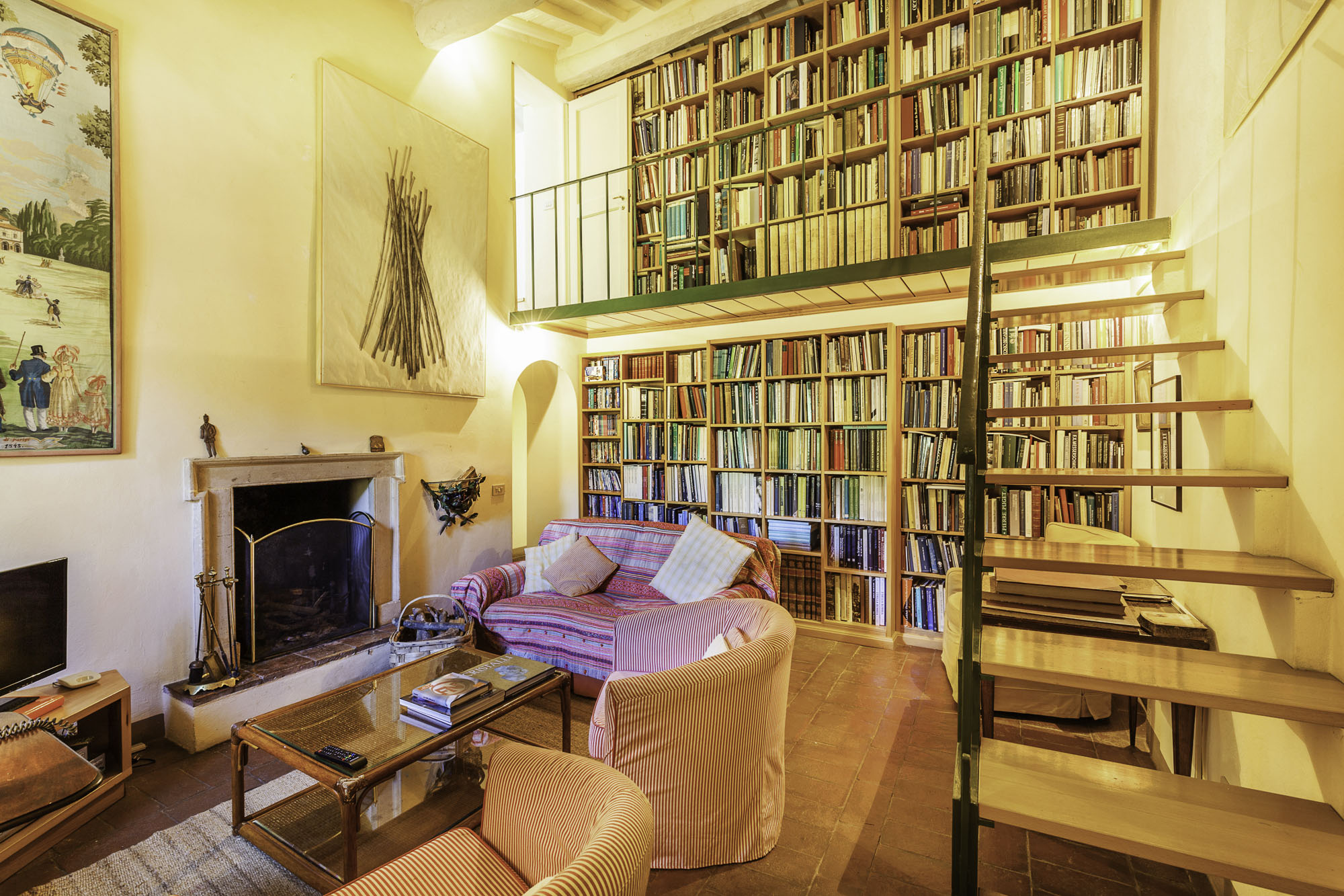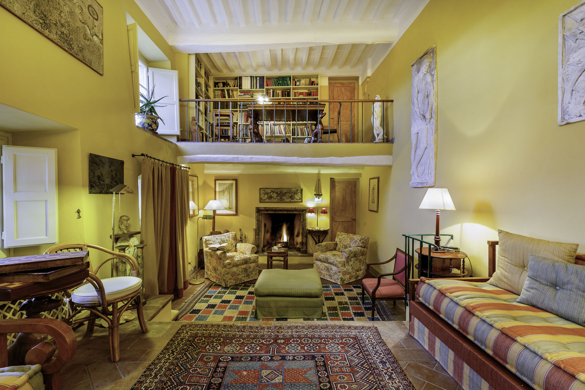 The ground floor features a well-equipped family kitchen, a dining room, and a family room complete with satellite TV and numerous board games. A long, sunny living room with comfortable seating and an open fire creates the perfect space to relax. A mezzanine library area overlooks the living room, providing a cosy reading nook.
