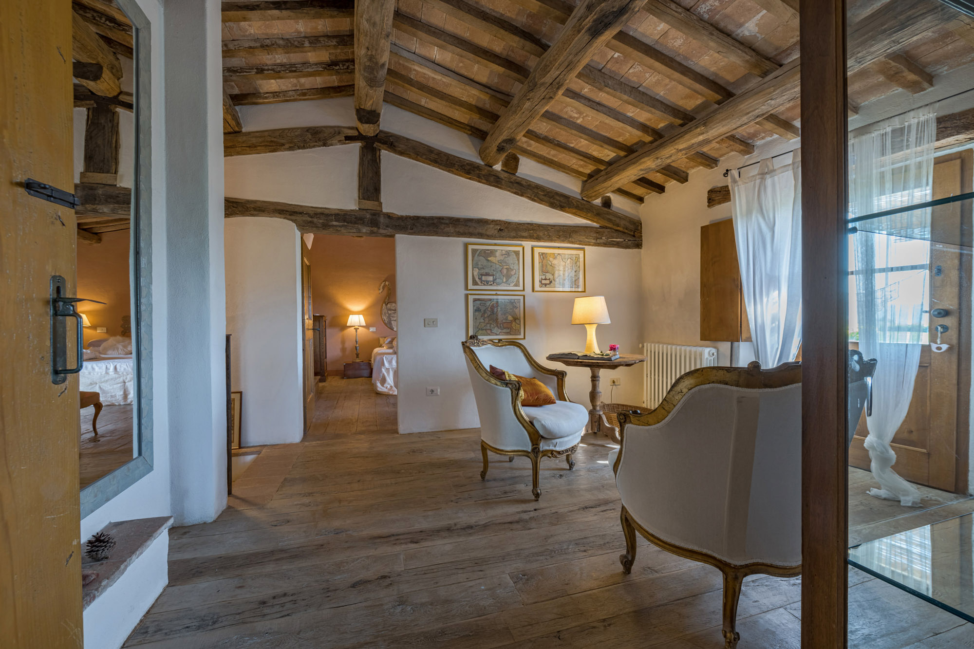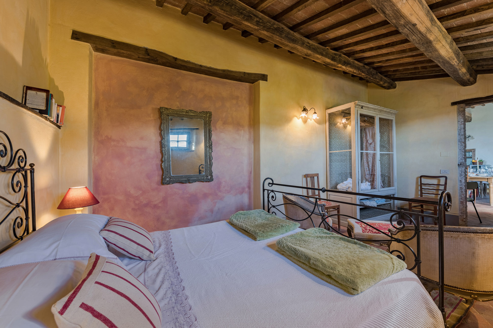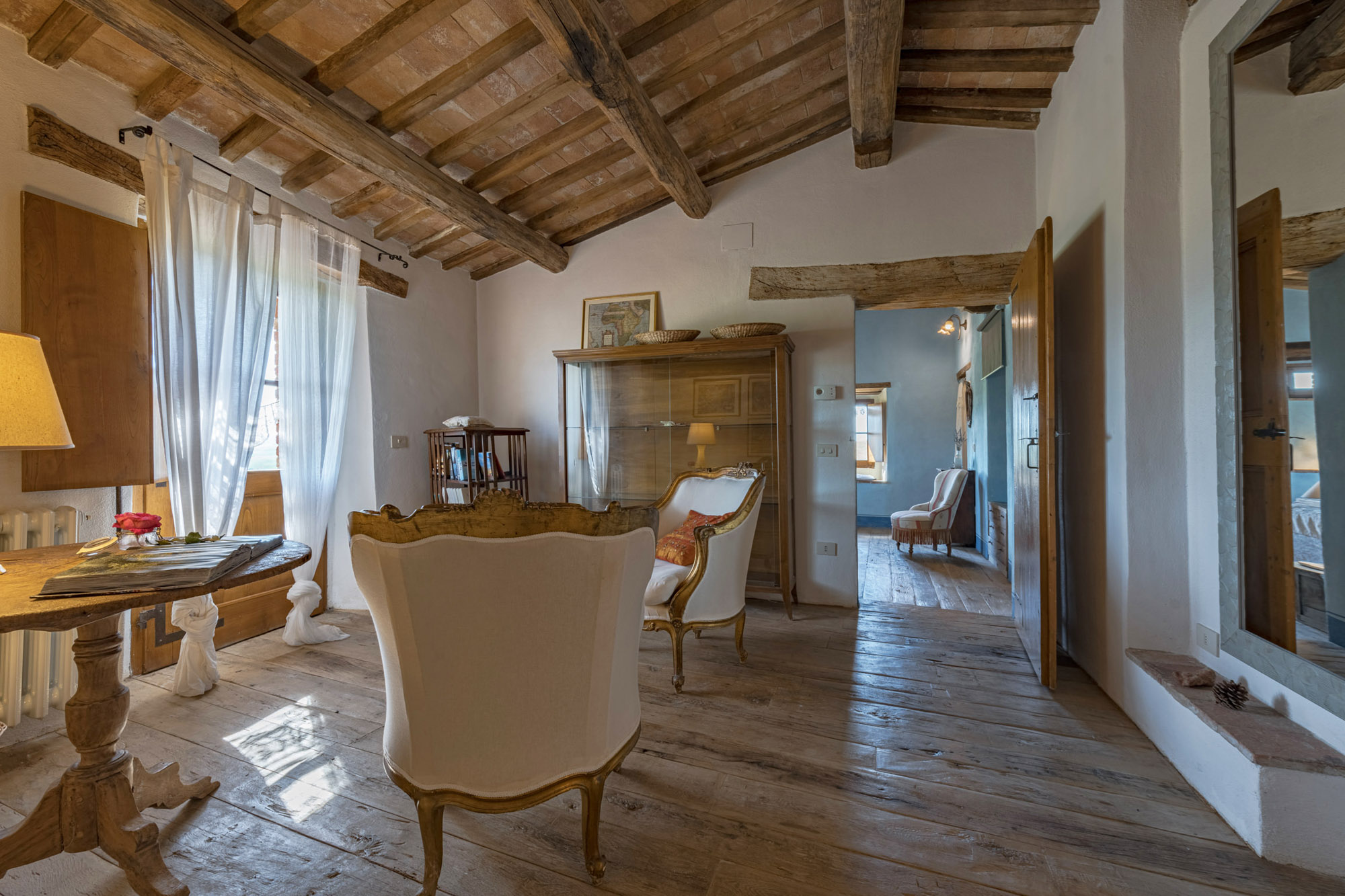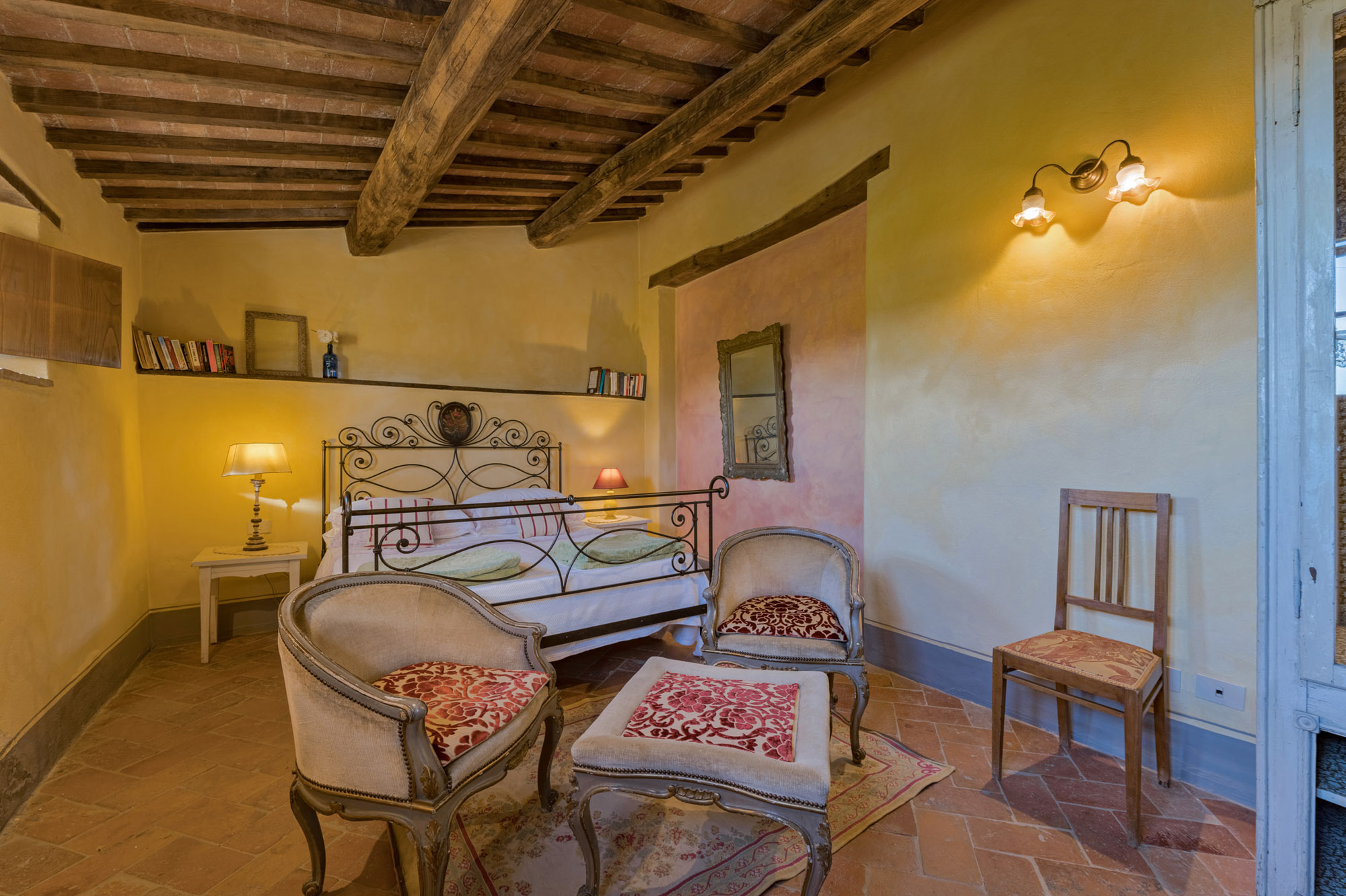 The six bedrooms have a romantic air; five are en-suite, one with a round bathtub and another with a hydromassage tub. There's a big Tuscan-style kitchen with modern amenities, a dining table for 12 and doors to the patio. The bright lounge, with its original feature fireplace, has access to a second, smaller kitchen for preparing drinks and snacks.