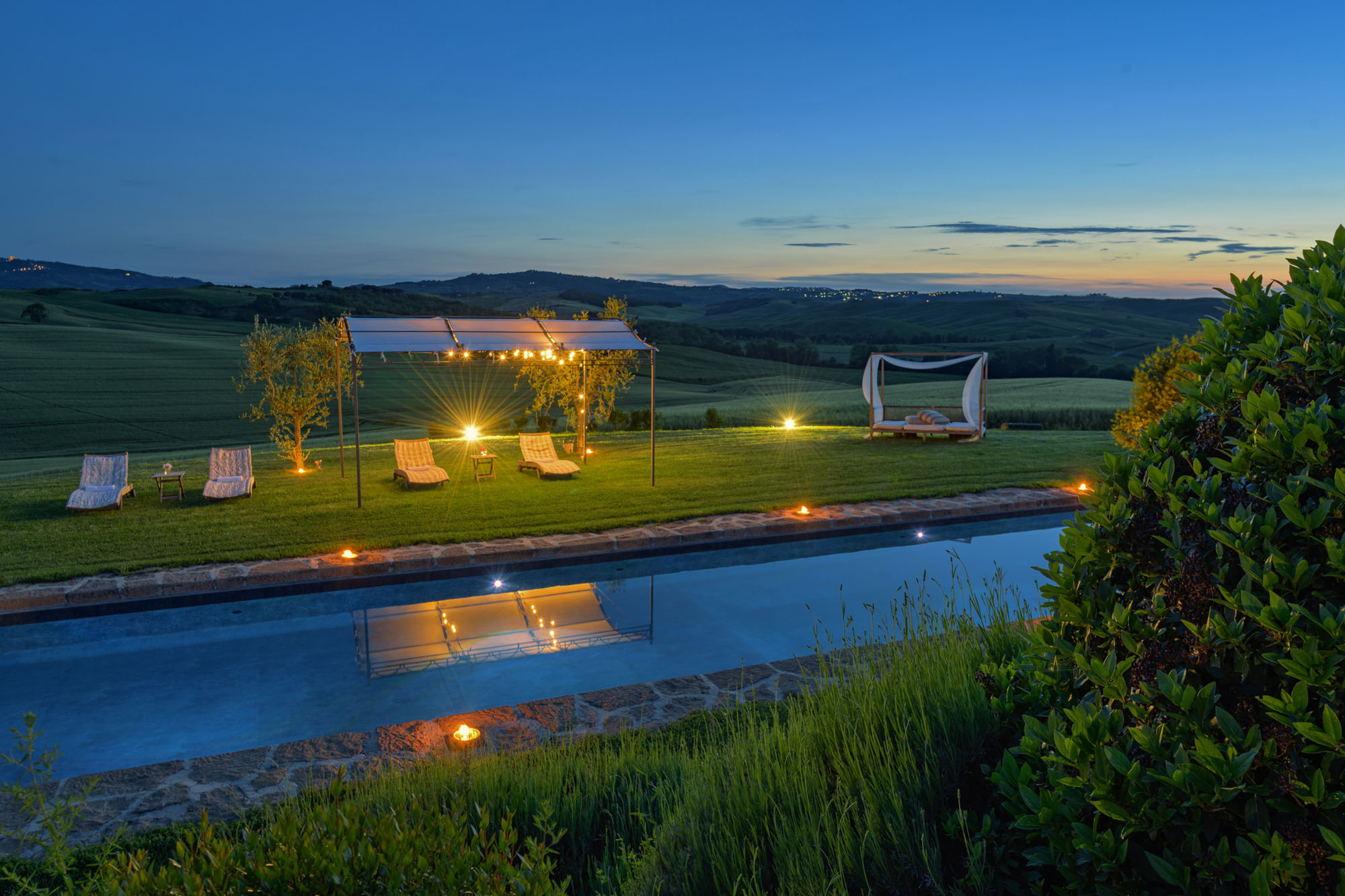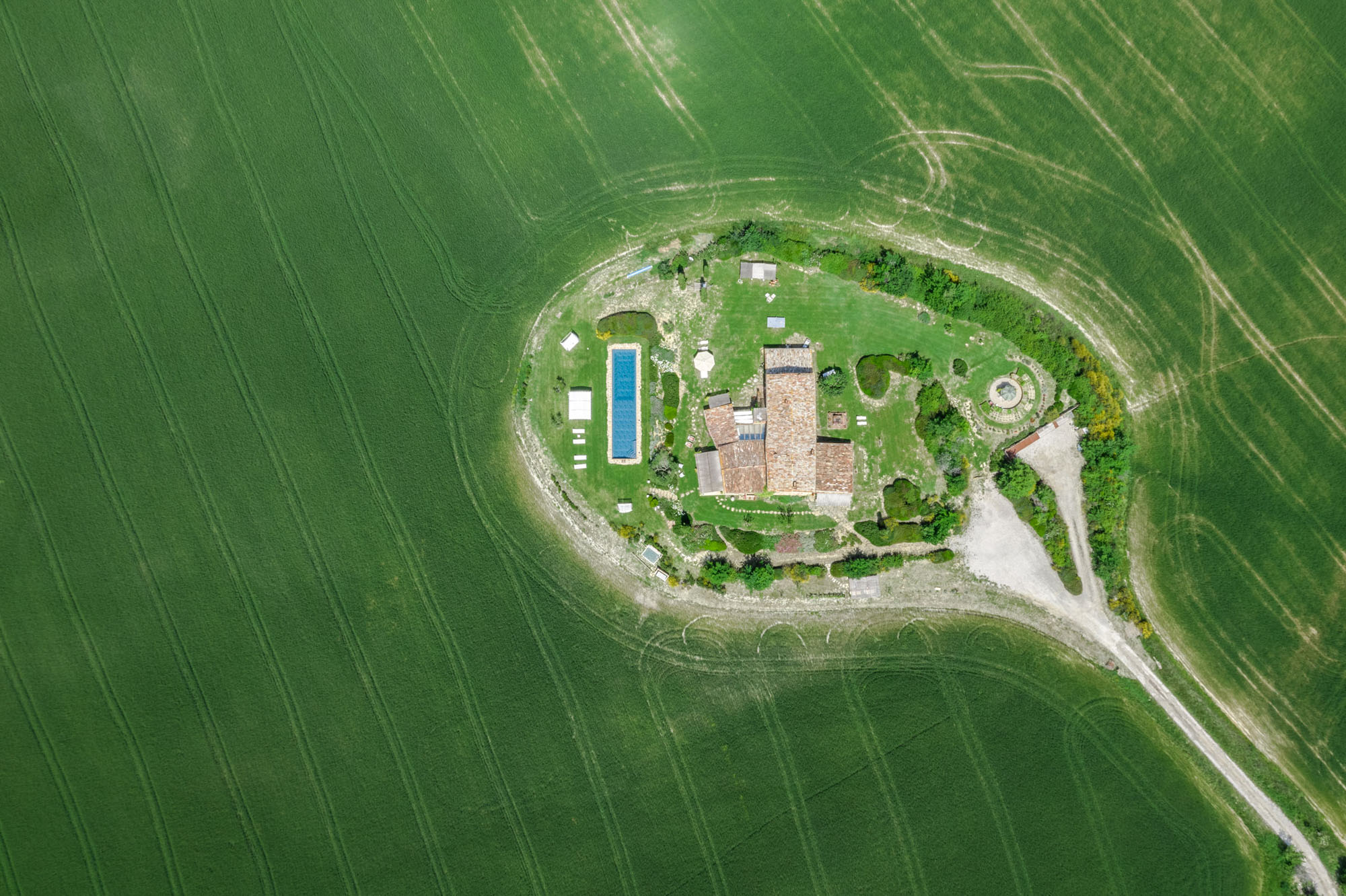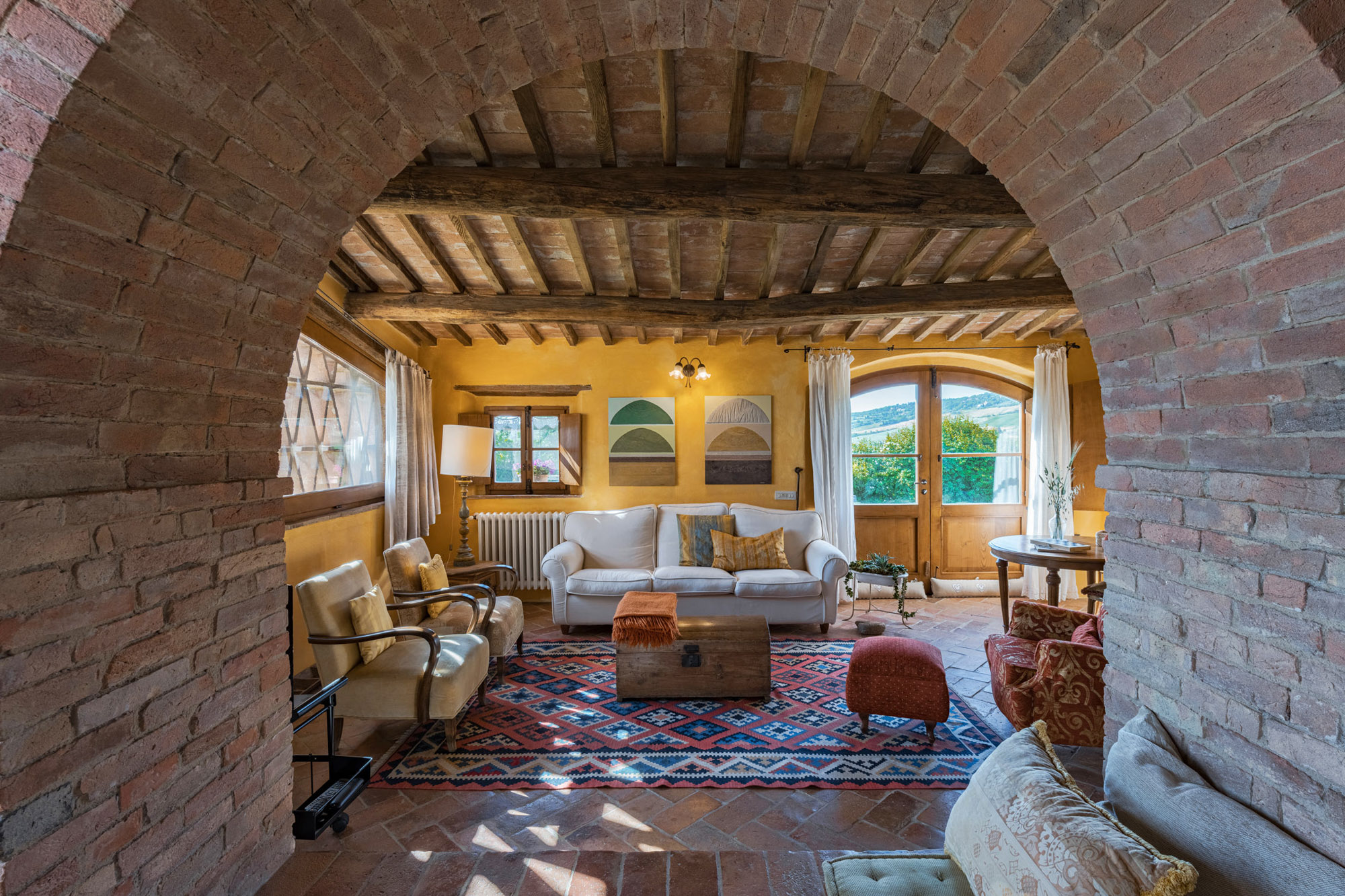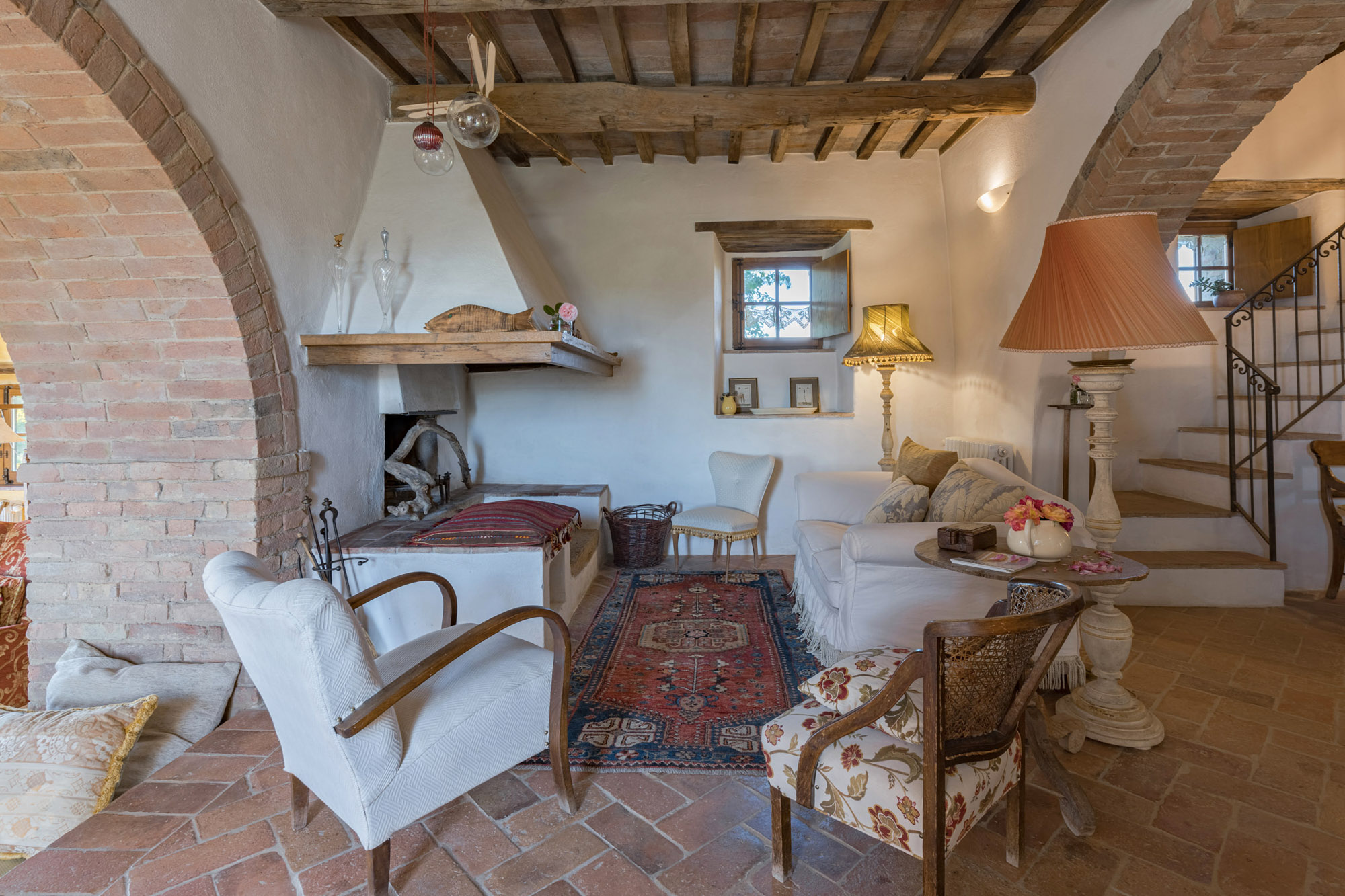 The six bedrooms have a romantic air; five are en-suite, one with a round bathtub and another with a hydromassage tub. There's a big Tuscan-style kitchen with modern amenities, a dining table for 12 and doors to the patio. The bright lounge, with its original feature fireplace, has access to a second, smaller kitchen for preparing drinks and snacks.