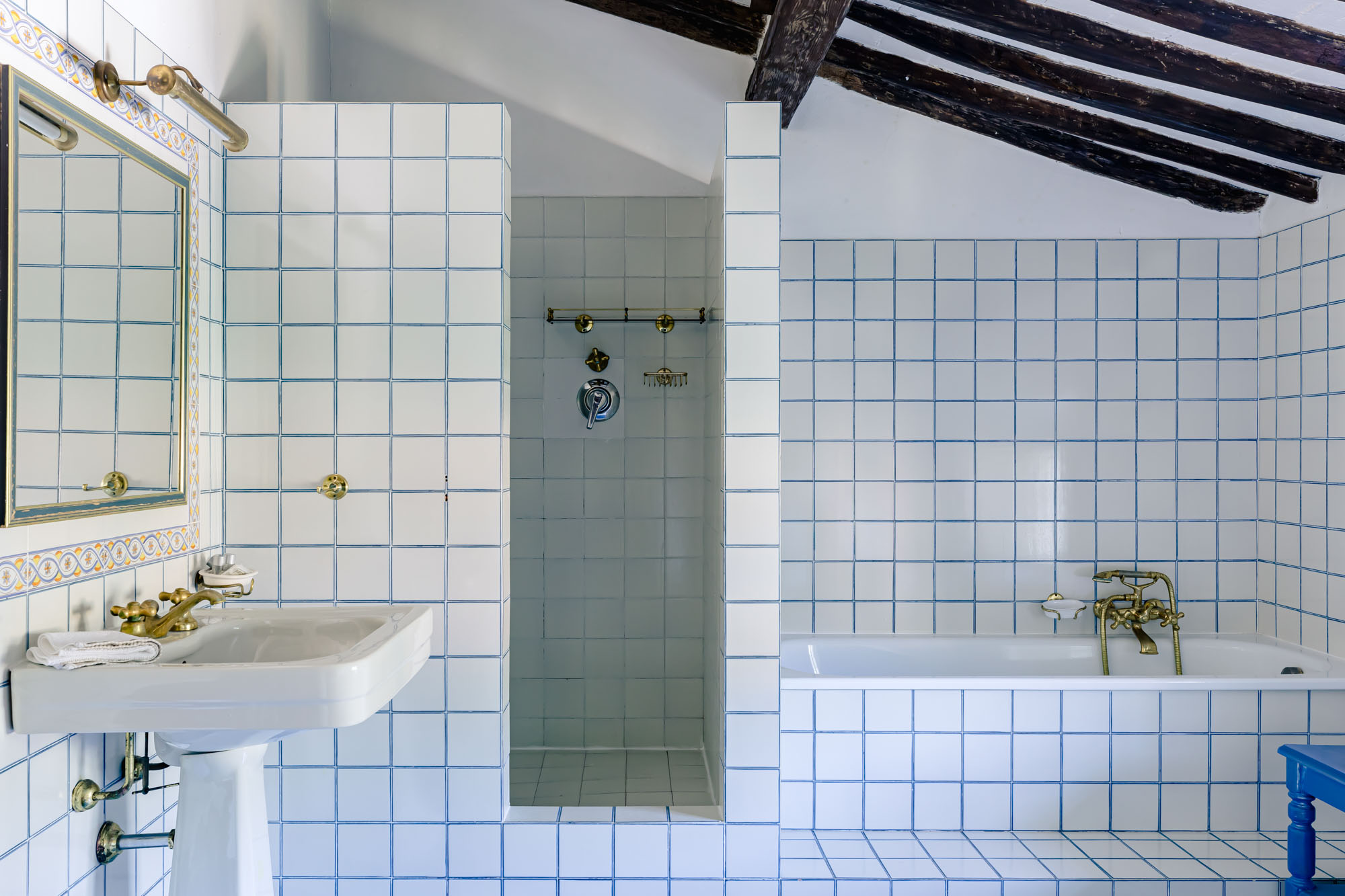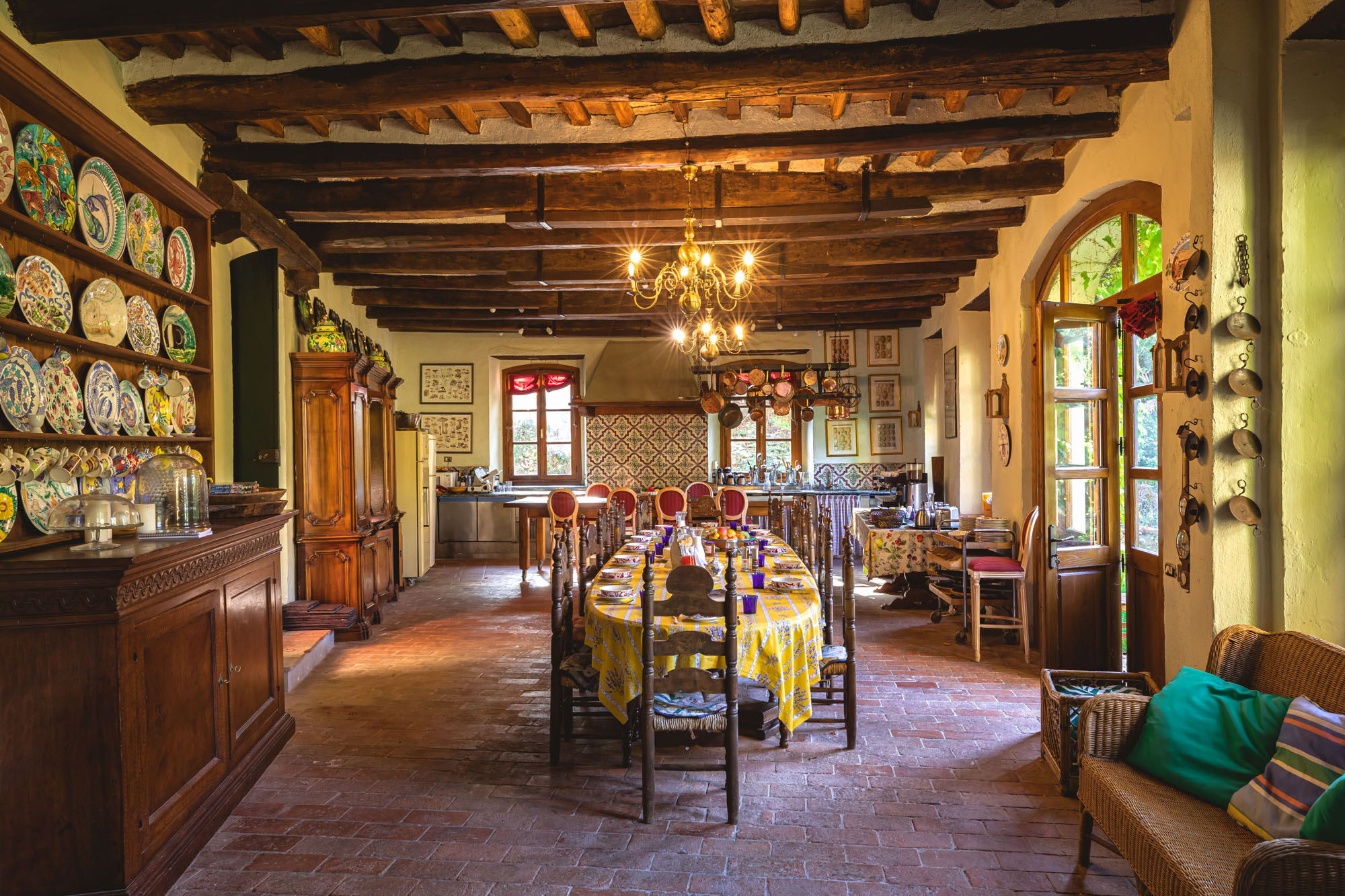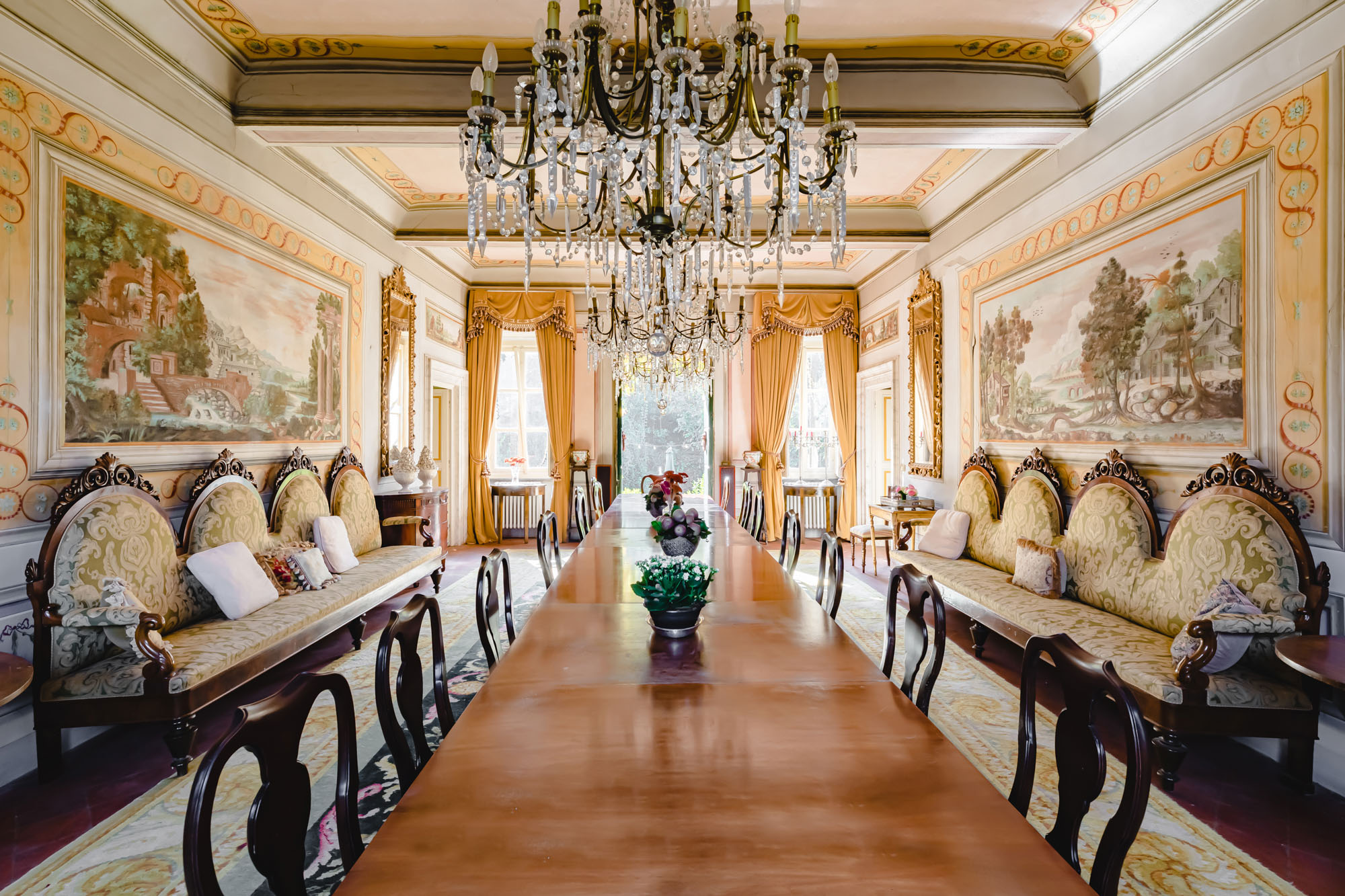 The property sleeps up to 35 guests across 2 buildings. The main house has 12 colourful bedrooms and 11 bathrooms, and the guest house, just a few metres away, has 5 en-suite rooms. The property has several beautiful reception rooms, a drawing room with a piano, a large game room, and a TV room. However, the highlight is the grand dining room, which seats 32 and is adorned with original frescoes and antique Venetian chandeliers.
