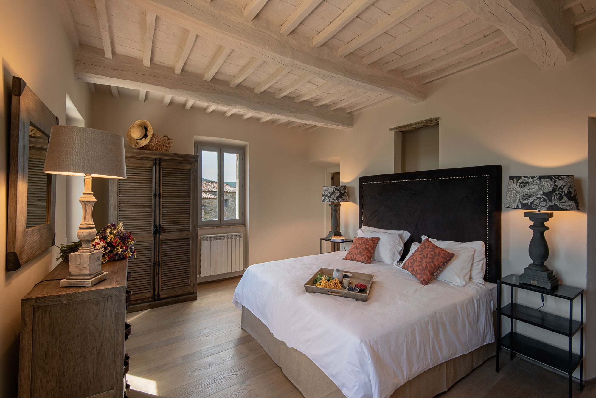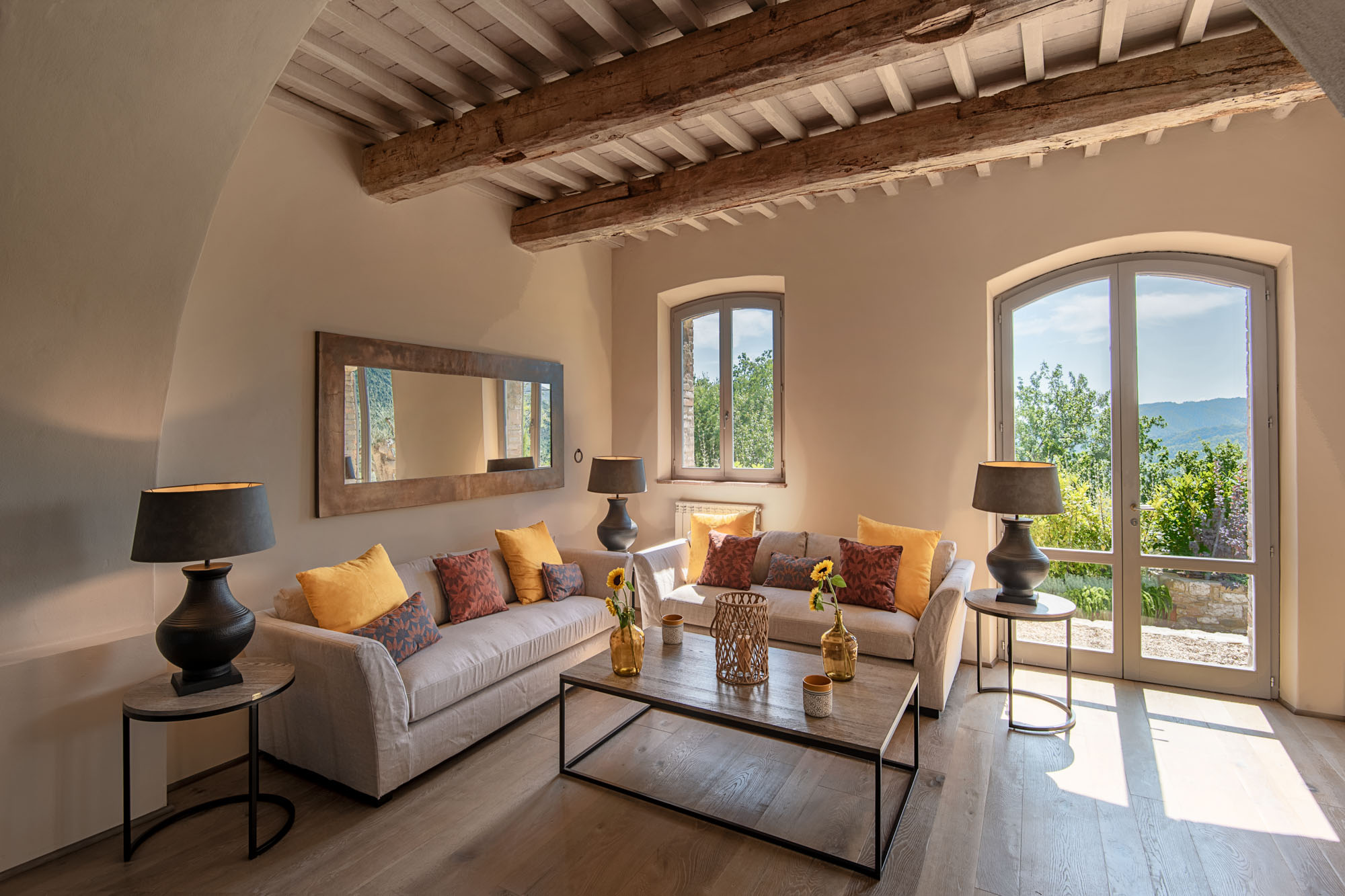 It's surrounded by large green lawns and situated in a commanding hilltop position with wonderful views of rural Umbria. The property has been expertly renovated and transformed into a supremely comfortable villa; it is an excellent venue for a memorable large group holiday, a wedding, or a special occasion. The beautiful church has soaring, vaulted ceilings and is decorated with hand-painted frescos. The little village of Pierantonio, with shops, a bank and bars is a few minutes drive.