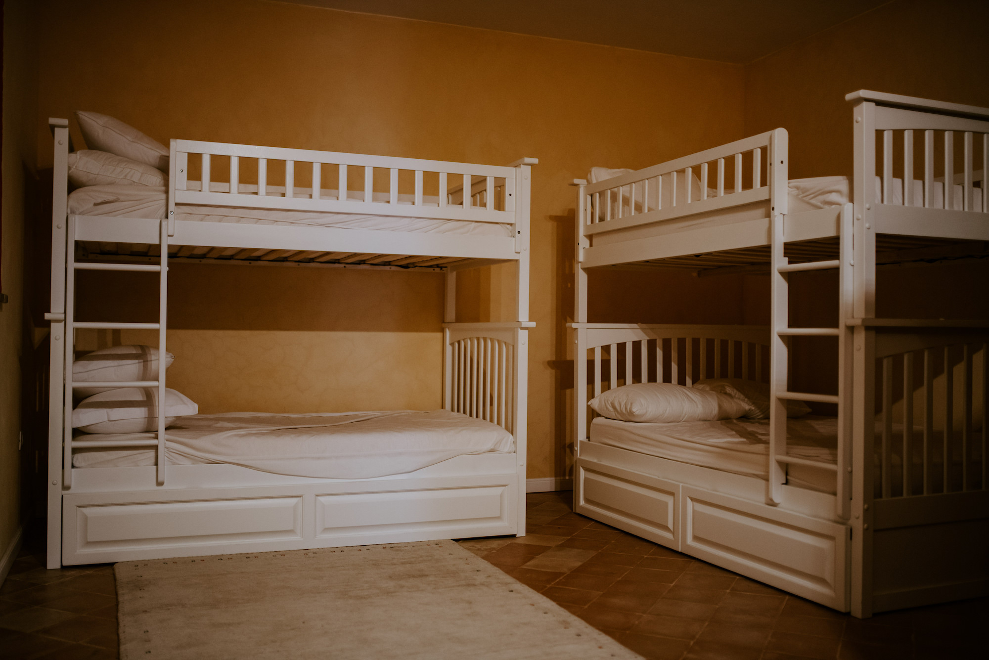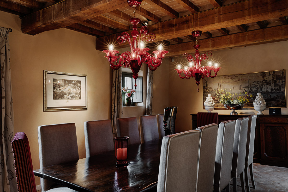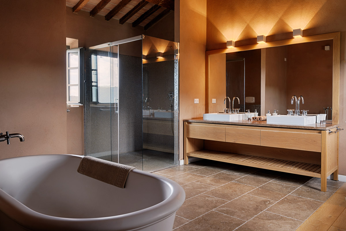 A palette of neutrals, warm umbers, and ochres is used for decoration, with an elegant blend of traditional and contemporary furniture and furnishings. The main house has two sitting rooms, one with a smart TV and a well-equipped kitchen with doors opening to the terrace. The long dark wood table in the dining room can seat up to 12 people and is lit by Venetian glass chandeliers. Four large en-suite bedrooms and a four-bed bunk room are in the main house, and two further large en-suites are in the guest house. The latter also has a kitchen with a table for four and a sitting room.