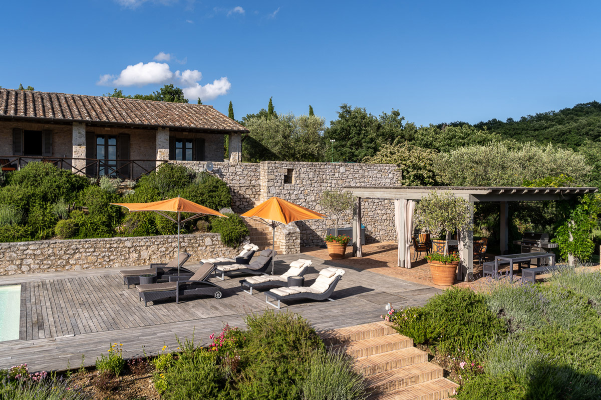 Further, chairs and tables are set around the various terraces, all with great views. Above the lawns, there's a 16-meter infinity pool surrounded by teak decking, comfortable loungers with parasols, and a pergola-covered al fresco kitchen/dining area with a barbecue. All of this is set within gardens planted with olives, lavender, and scented shrubs, punctuated by large terracotta pots characteristic of the Italian style.