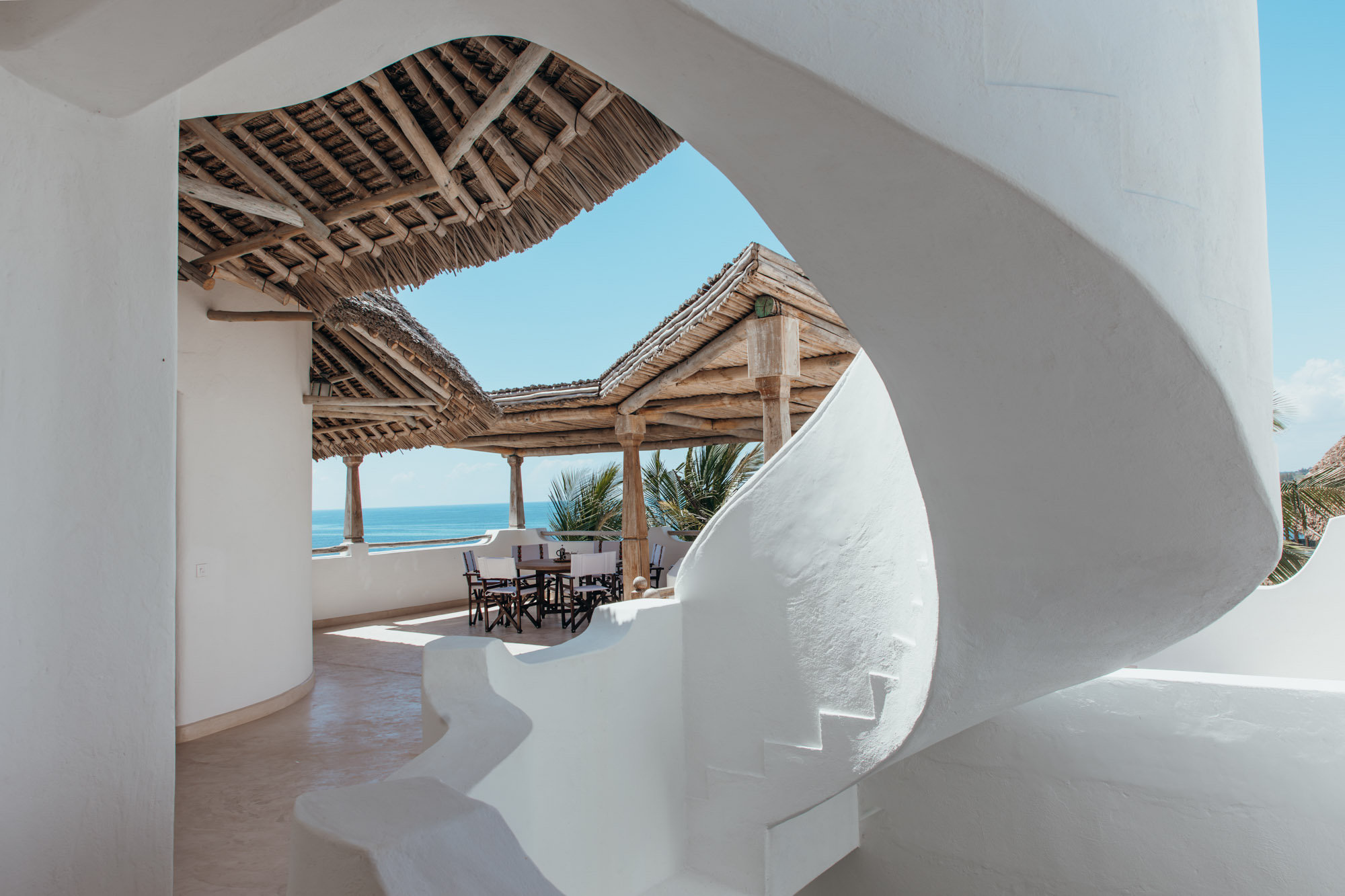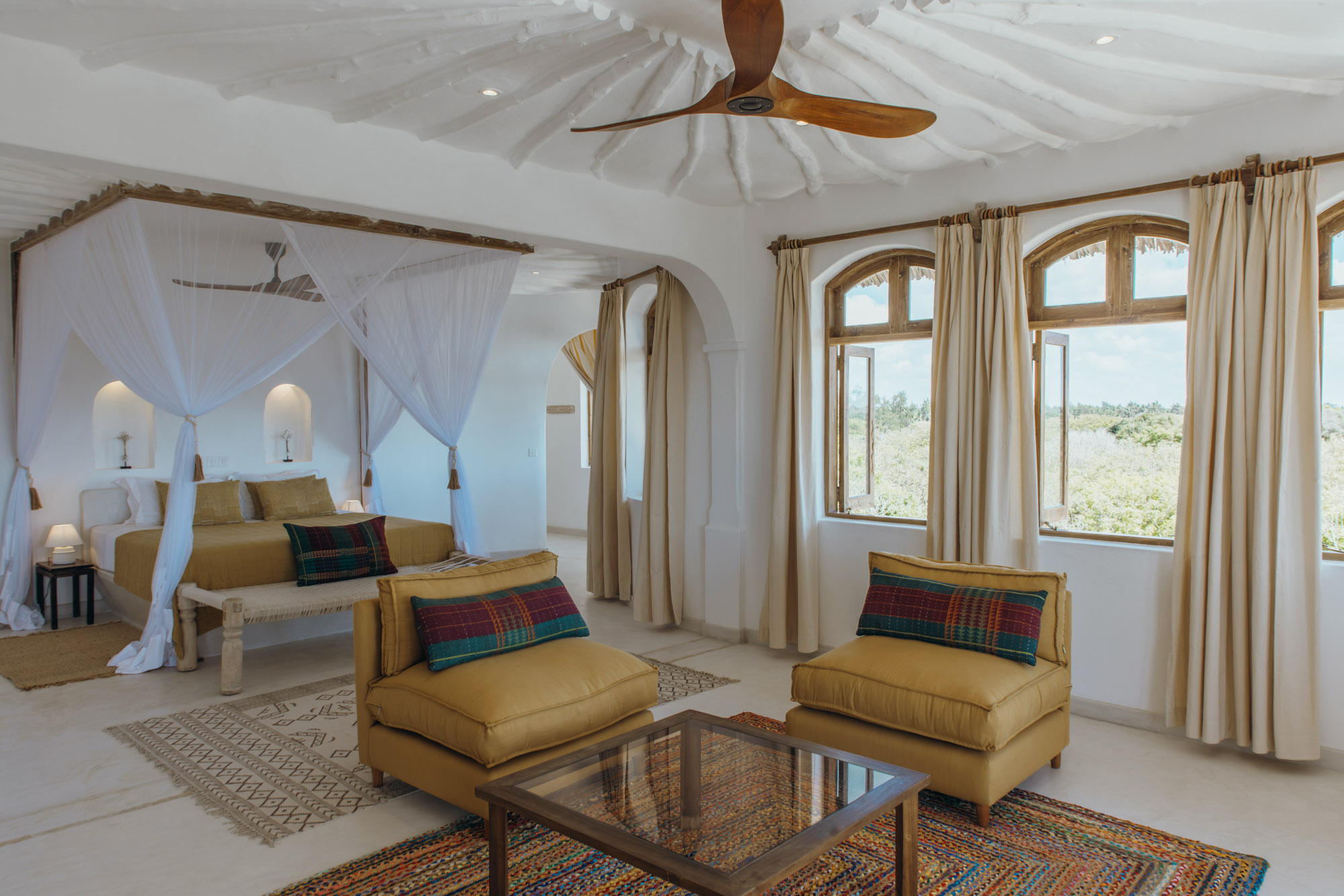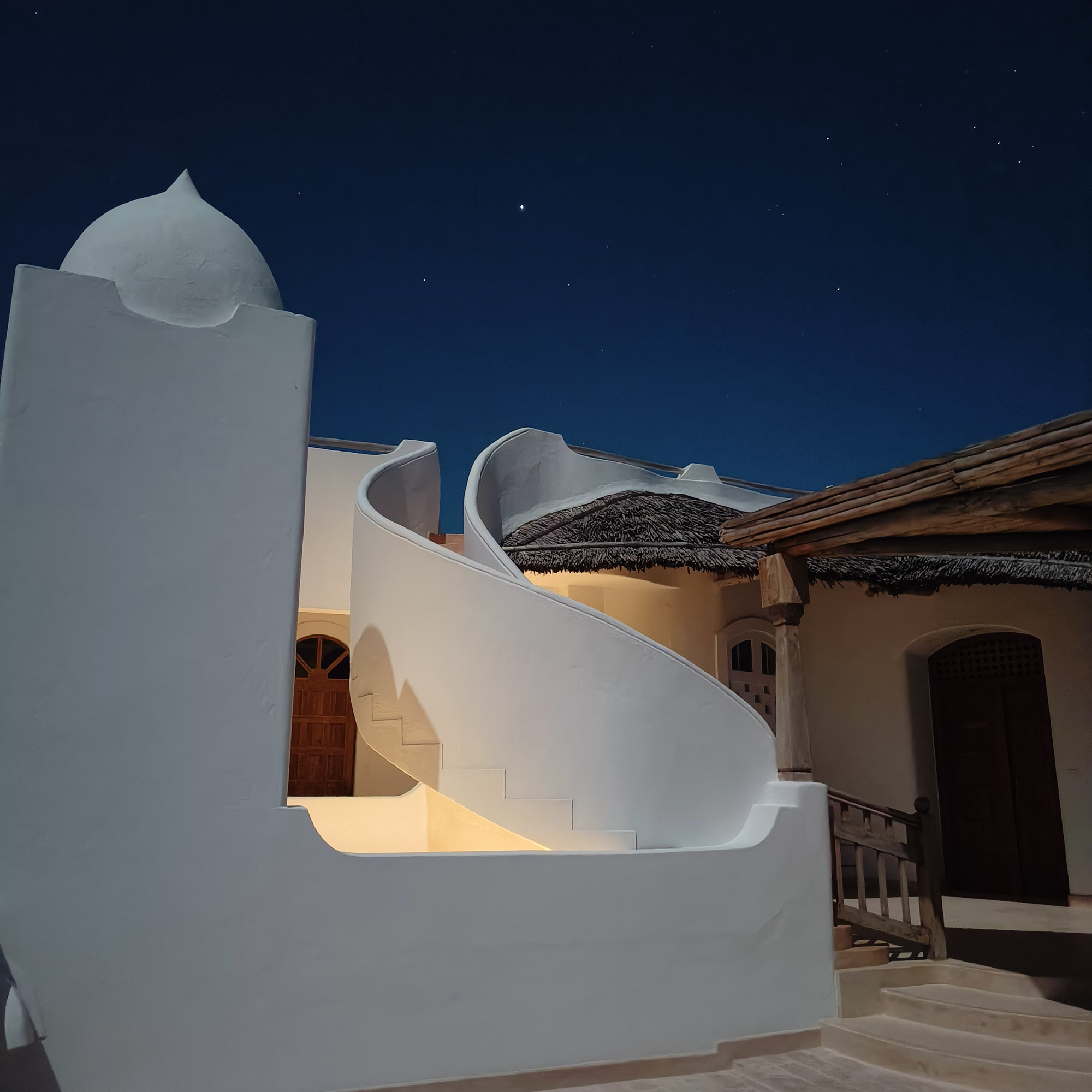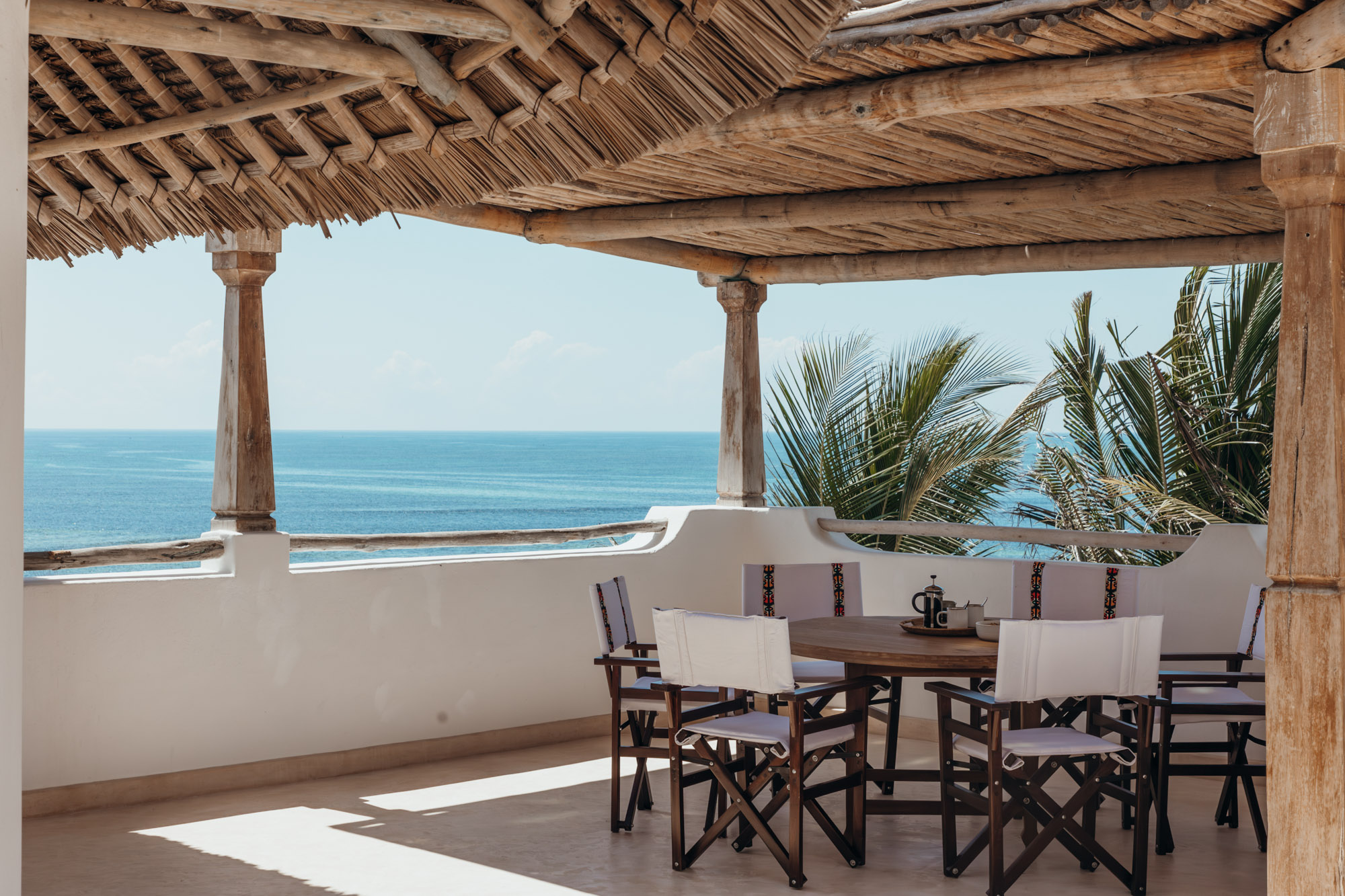 The large terrace and pool area, complemented by shaded baraza seating, create an ideal setting for socialising and enjoying the views. The villa’s magnificent dining area, featuring a grand round table, is perfect for leisurely lunches prepared by the in-house chef. For a change of scenery, guests can enjoy breakfast on the second-floor coral-tiled terrace, complete with a beautifully crafted coconut wood table. Meandering garden paths lead through endemic bushland, offering a peaceful stroll to the cliff’s edge, where a stairway descends to a secluded beach with coral formations and tidal pools for exploration. The roof terrace provides stunning sunset views, perfect for evening sundowners while watching dhows glide across the Mida Channel.