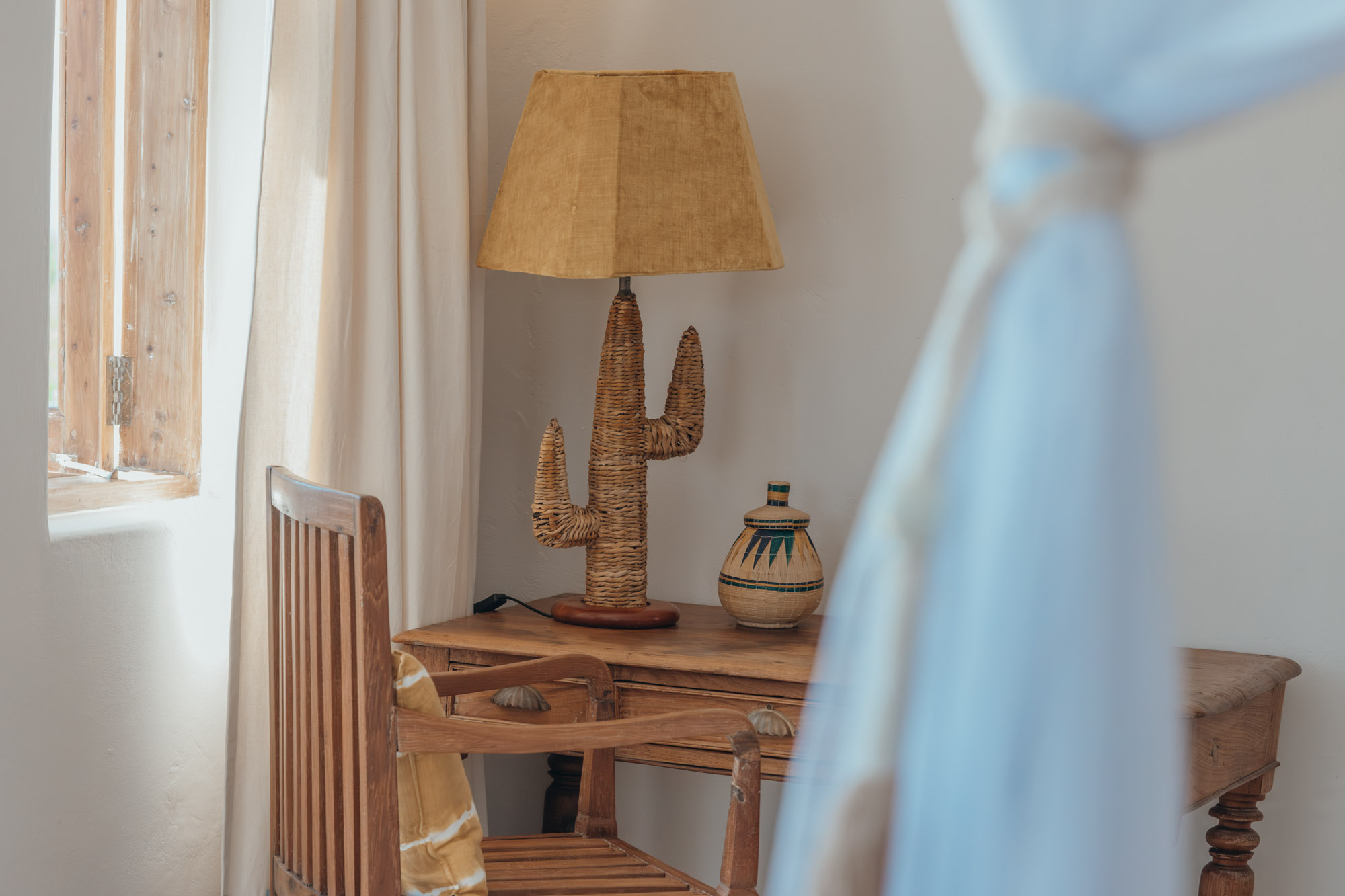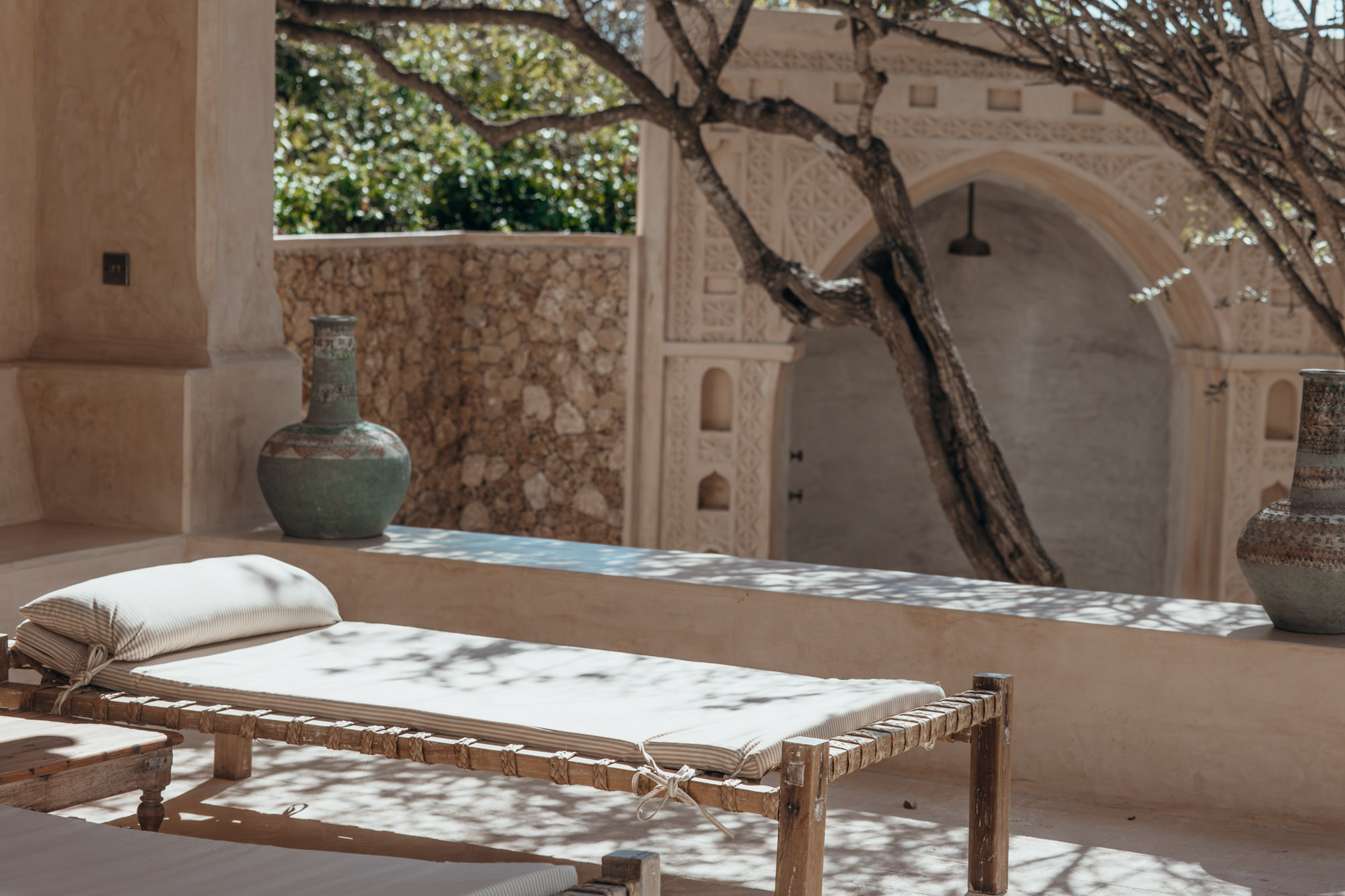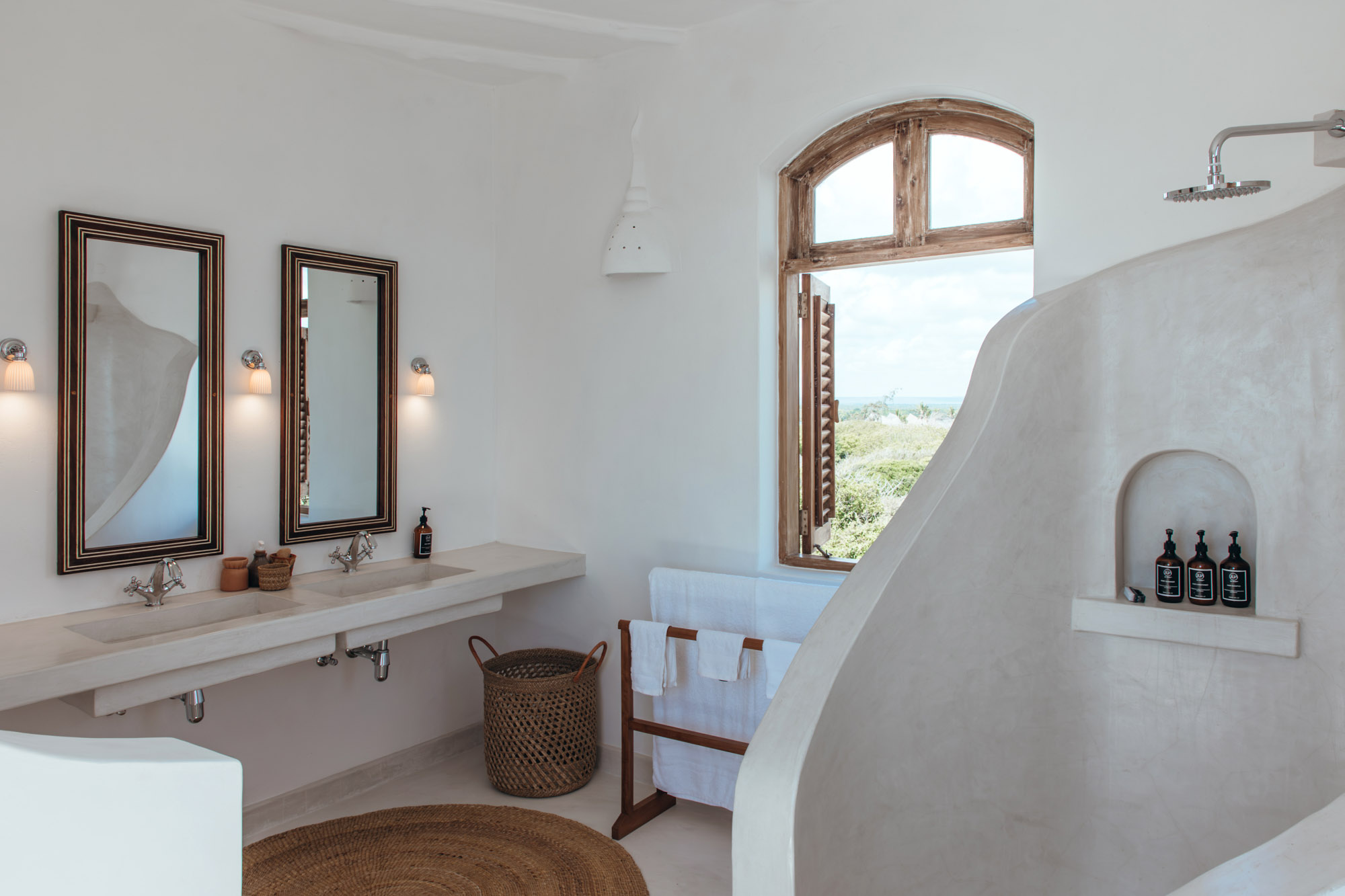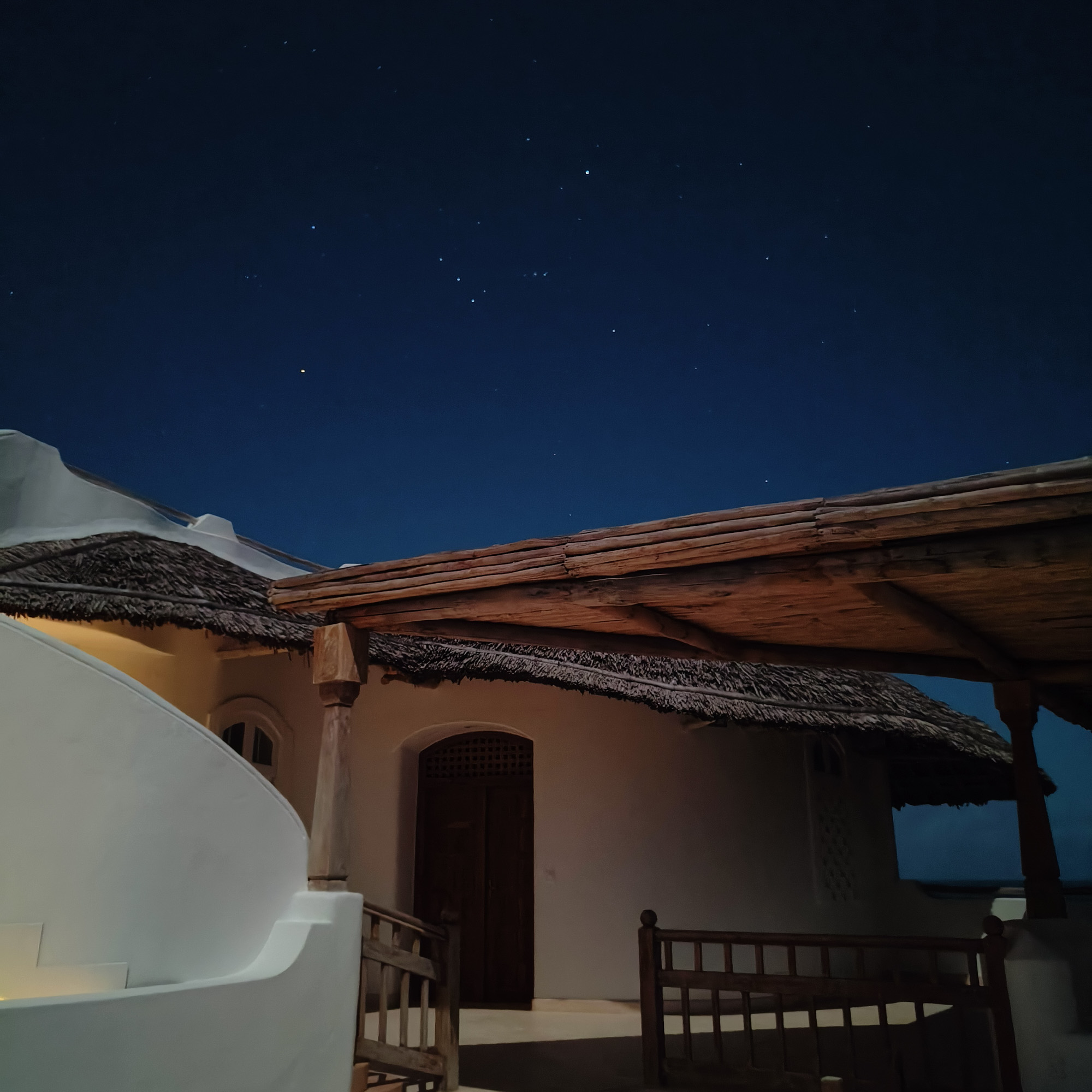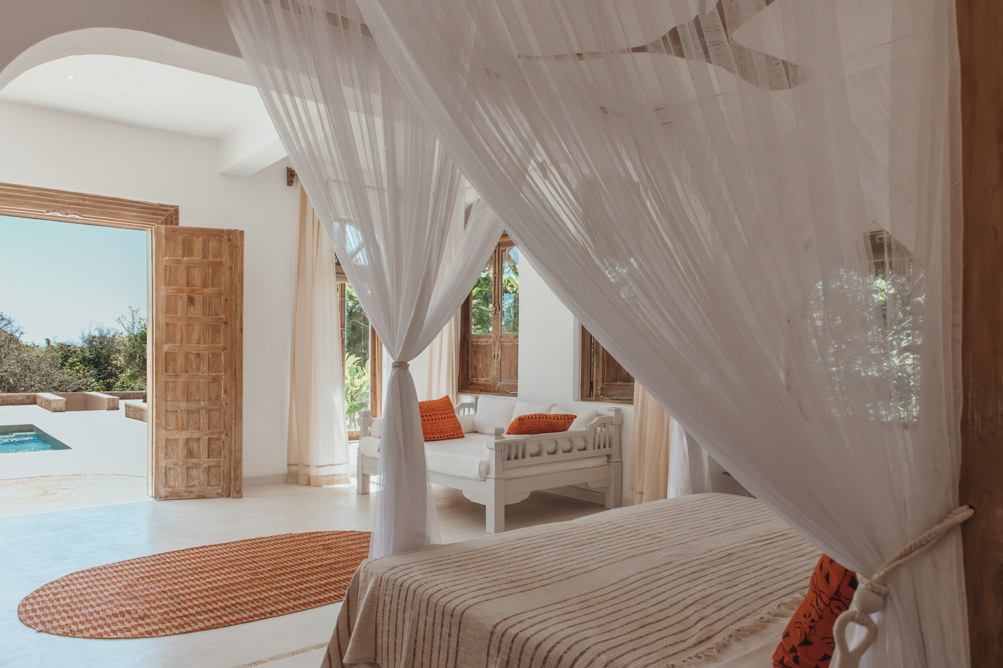 The large terrace and pool area, complemented by shaded baraza seating, create an ideal setting for socialising and enjoying the views. The villa’s magnificent dining area, featuring a grand round table, is perfect for leisurely lunches prepared by the in-house chef. For a change of scenery, guests can enjoy breakfast on the second-floor coral-tiled terrace, complete with a beautifully crafted coconut wood table. Meandering garden paths lead through endemic bushland, offering a peaceful stroll to the cliff’s edge, where a stairway descends to a secluded beach with coral formations and tidal pools for exploration. The roof terrace provides stunning sunset views, perfect for evening sundowners while watching dhows glide across the Mida Channel.