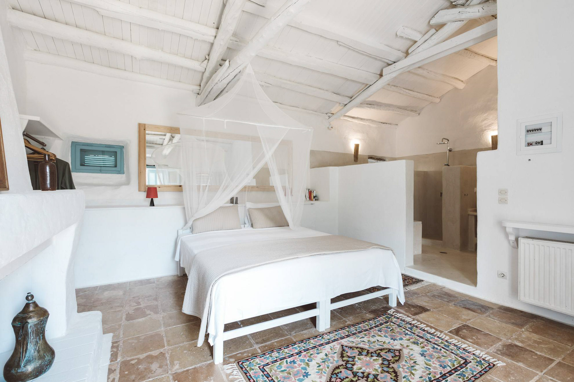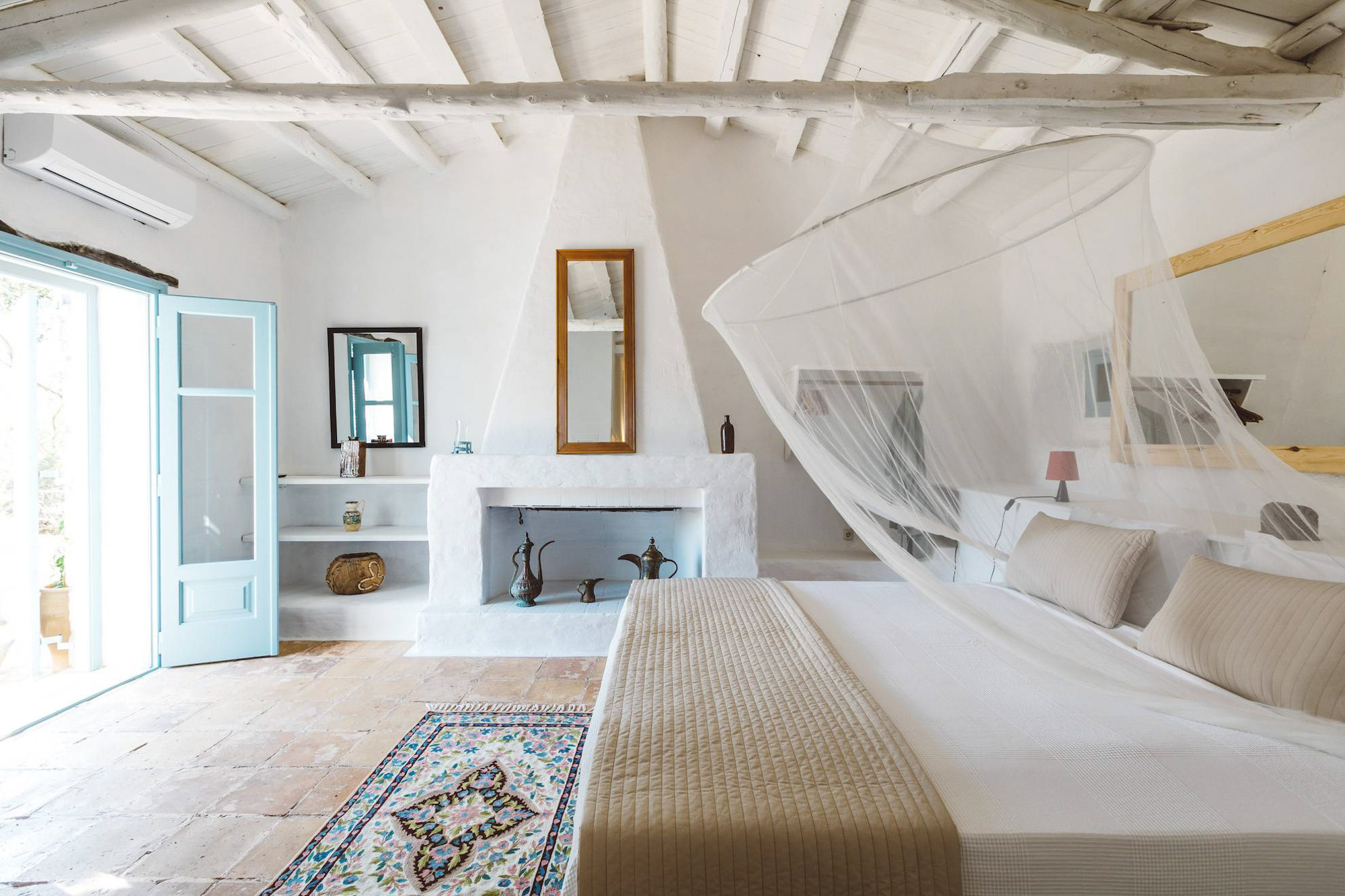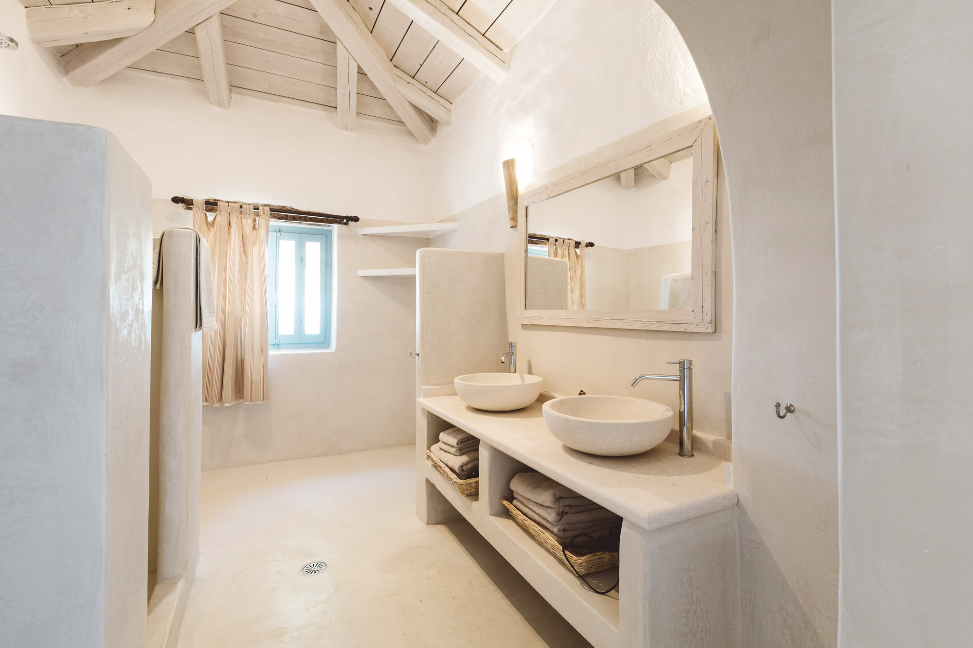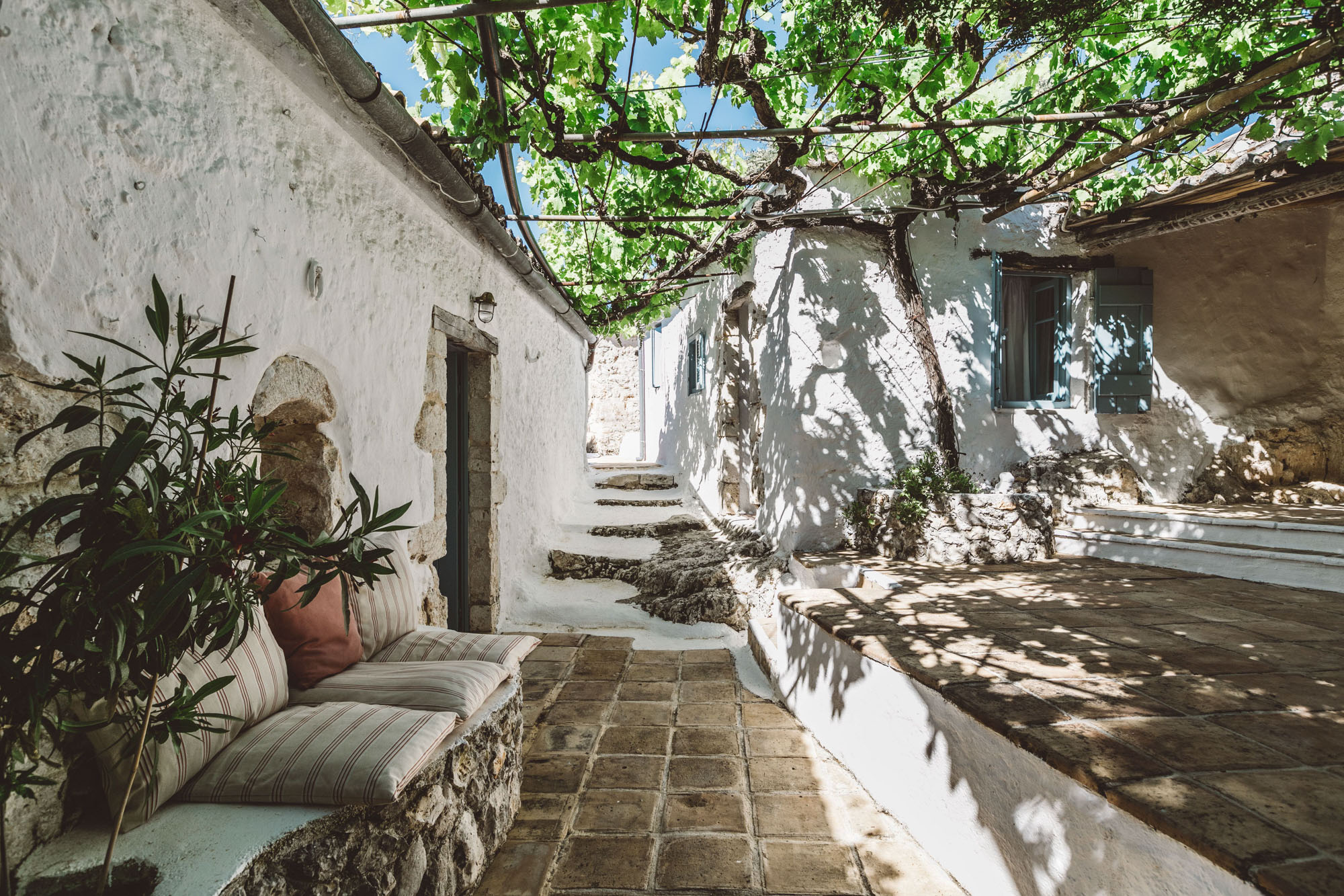 Set within a peaceful five-acre estate surrounded by ancient olive groves, the cottages surround a private courtyard. Perched gracefully on a hillside, the property offers panoramic views of the Ionian Sea. Inside, the design pays homage to the estate’s heritage, with interiors in crisp whites and calming blues. Seven en-suite bedrooms are scattered across 4 houses, and the bathrooms feature hand-carved basins made from local limestone.