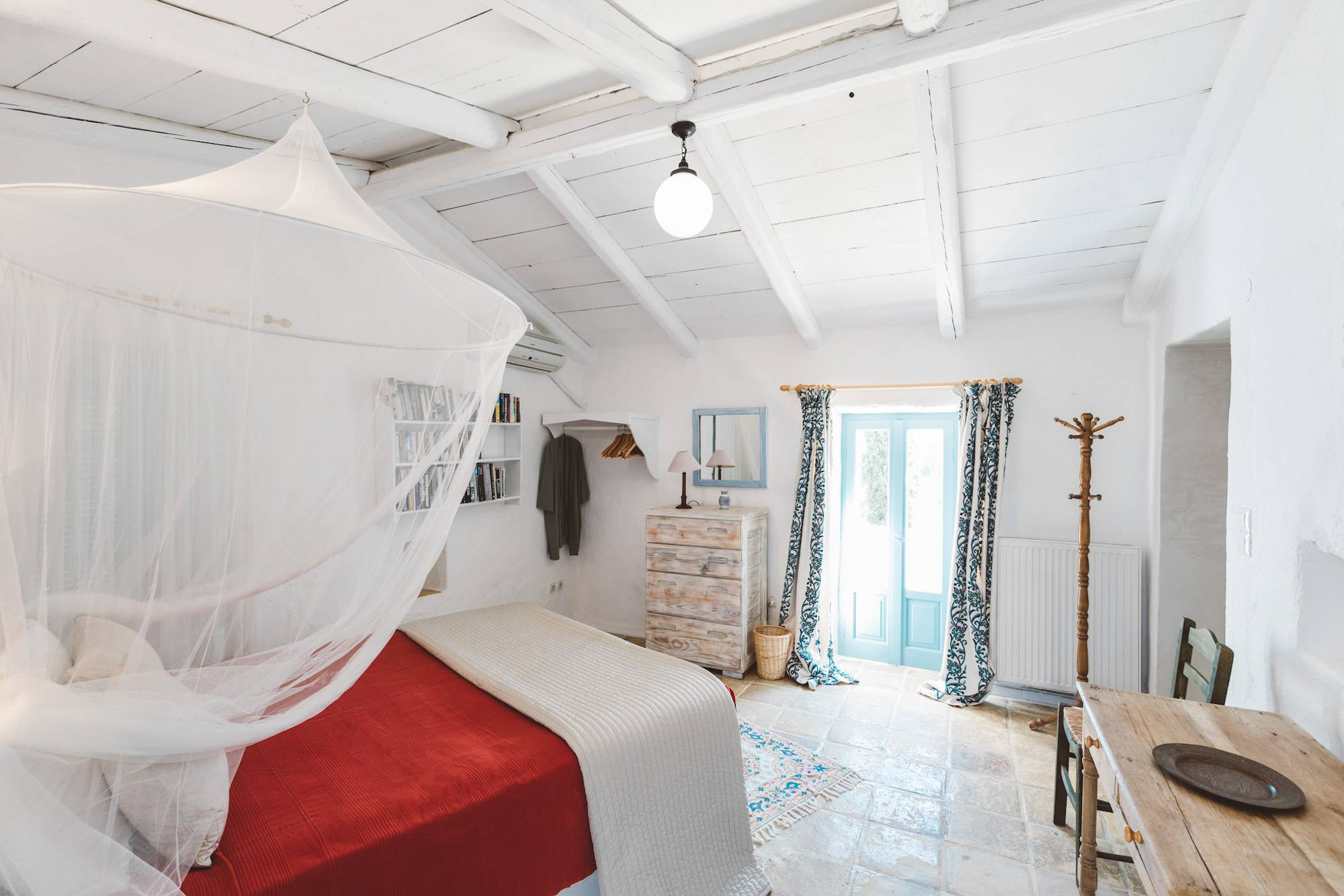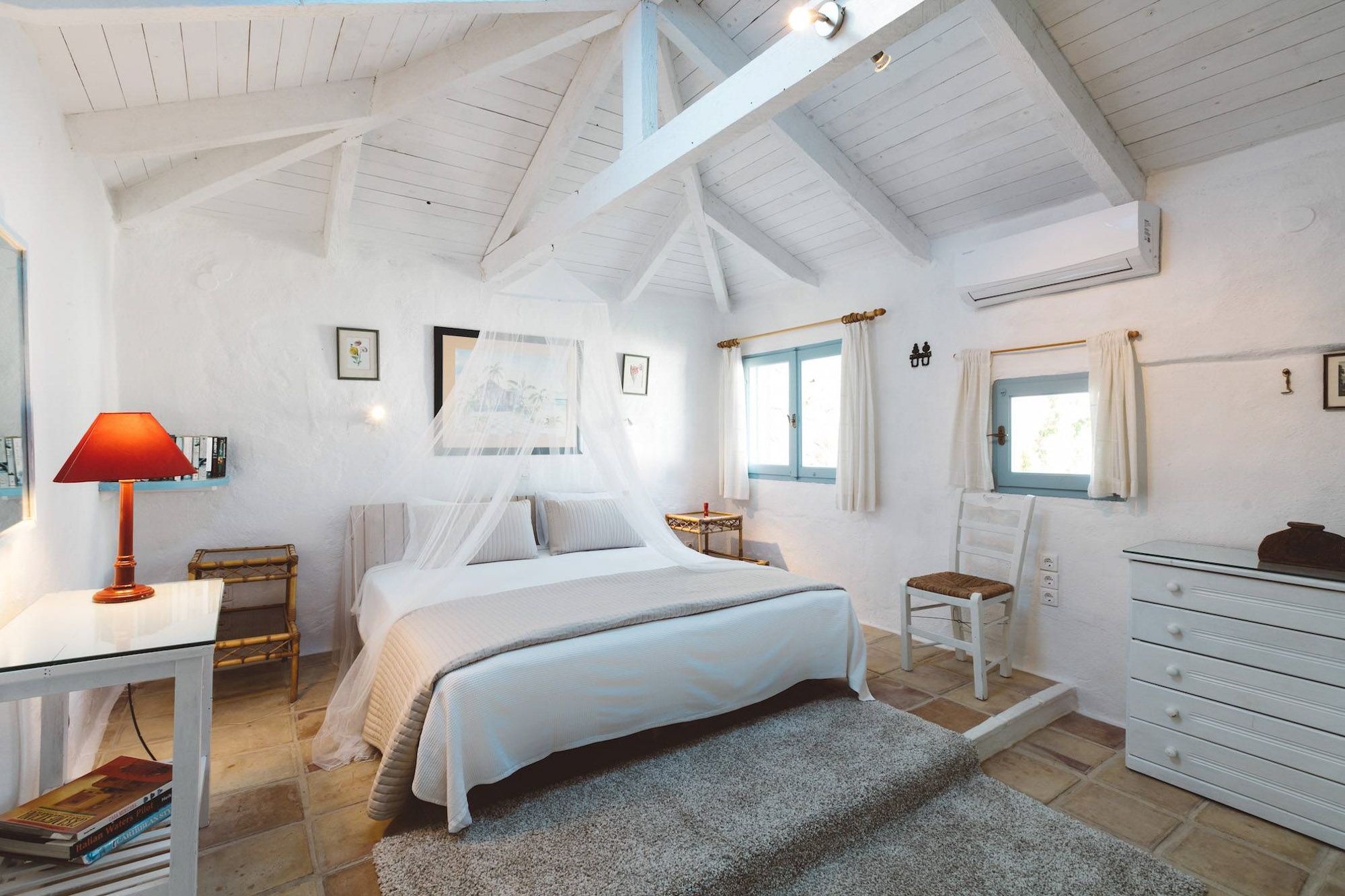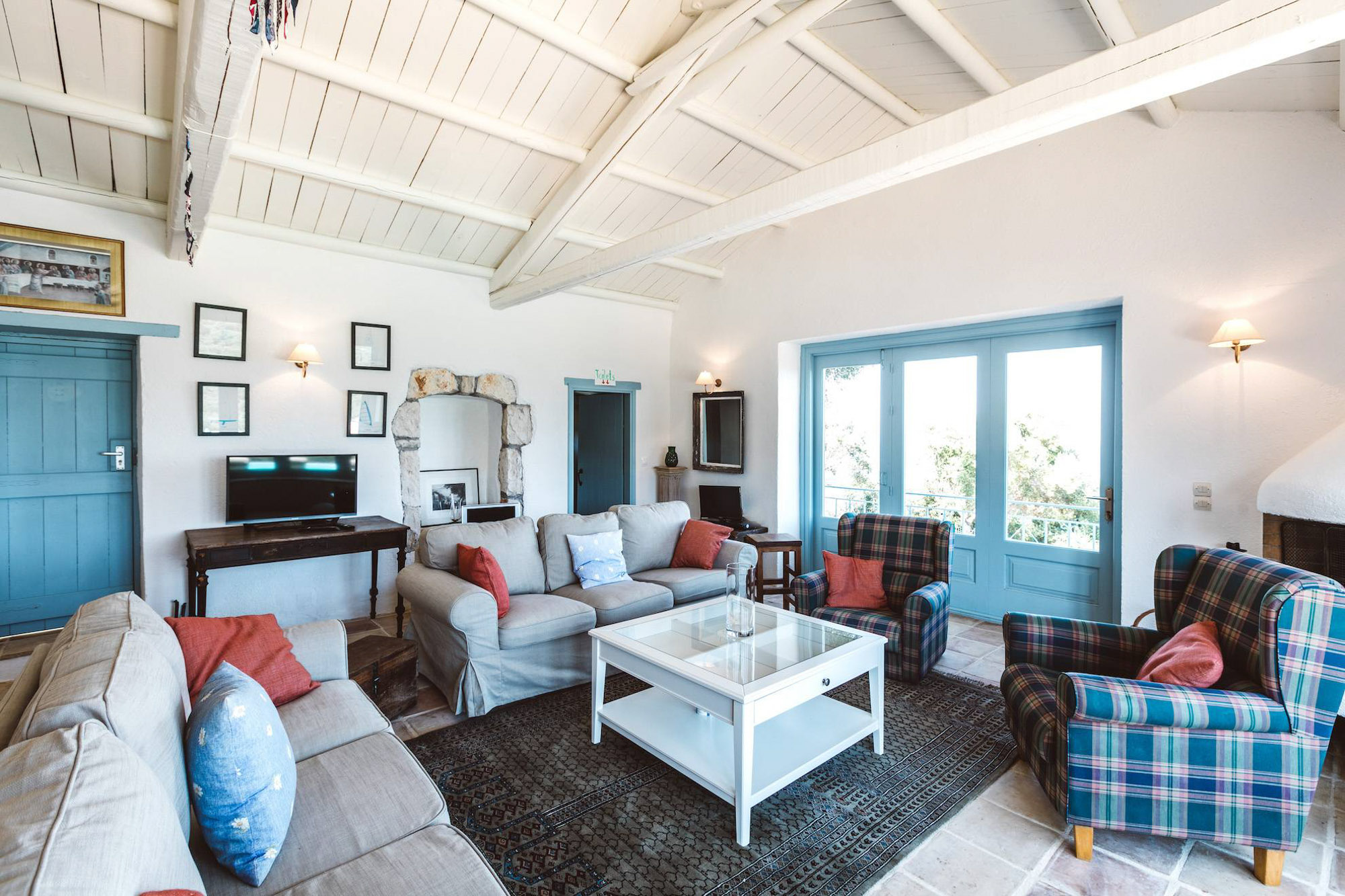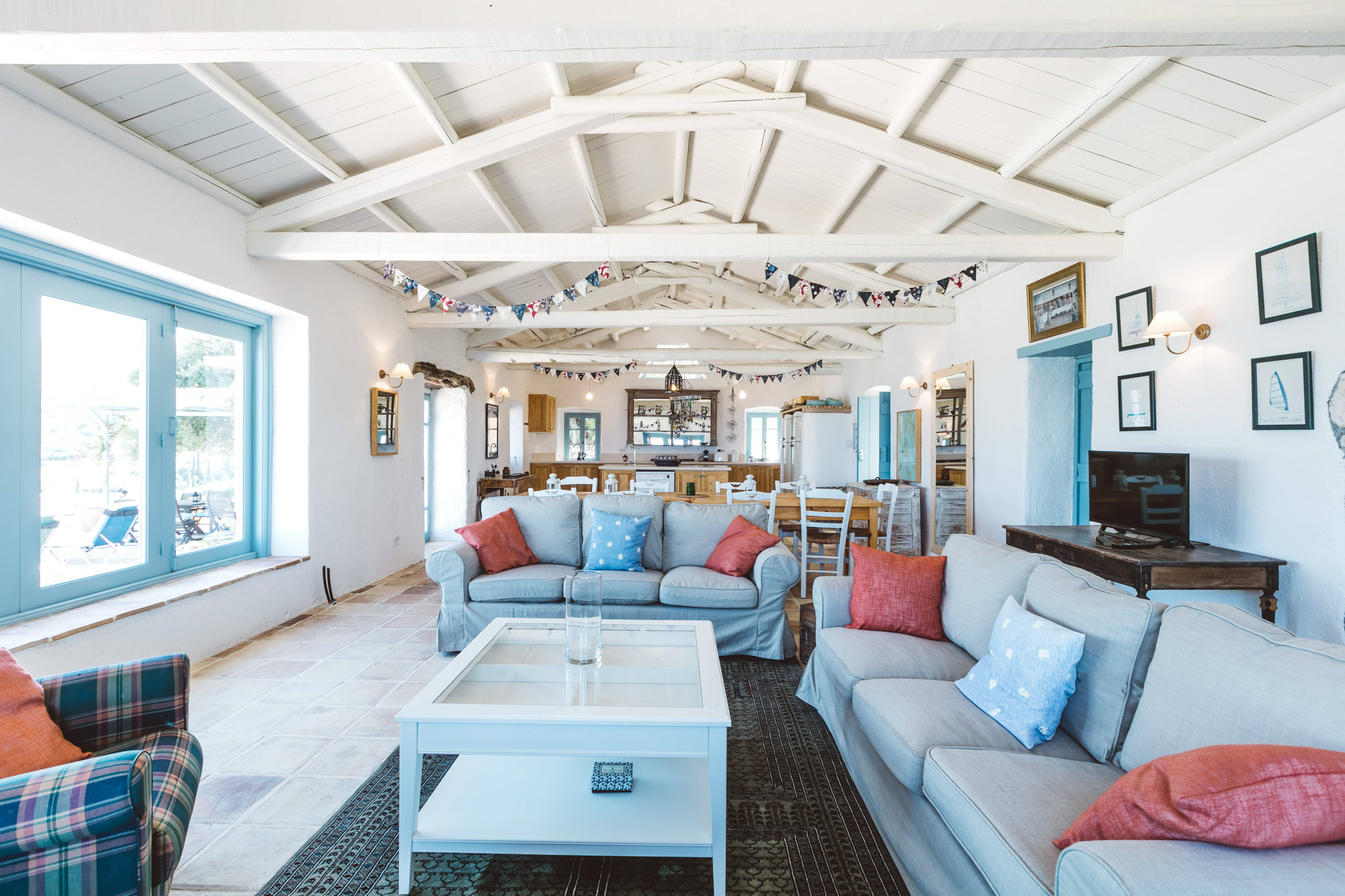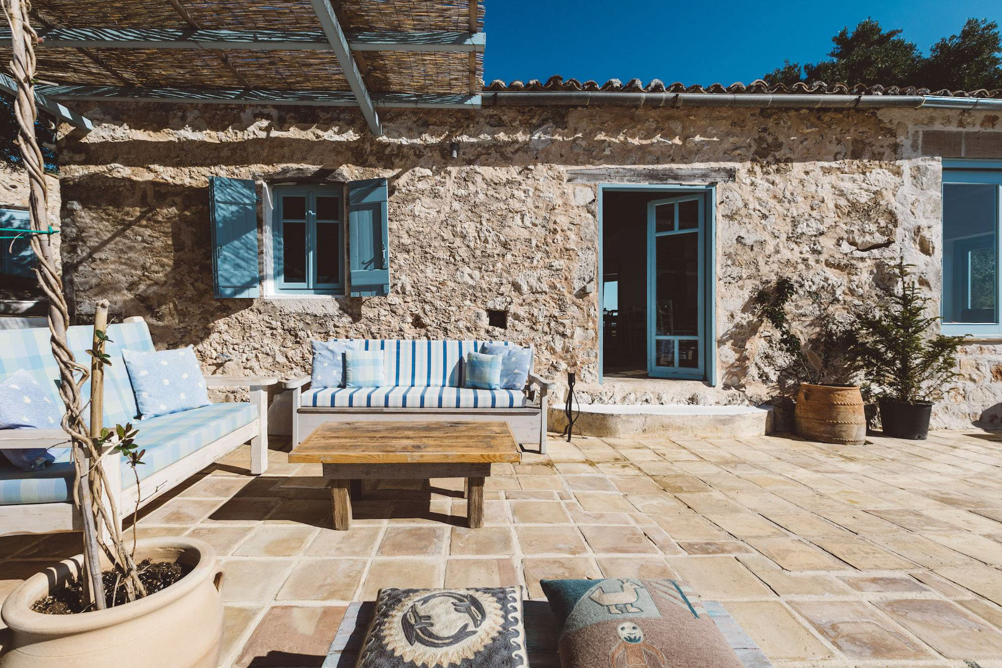 Set within a peaceful five-acre estate surrounded by ancient olive groves, the cottages surround a private courtyard. Perched gracefully on a hillside, the property offers panoramic views of the Ionian Sea. Inside, the design pays homage to the estate’s heritage, with interiors in crisp whites and calming blues. Seven en-suite bedrooms are scattered across 4 houses, and the bathrooms feature hand-carved basins made from local limestone.