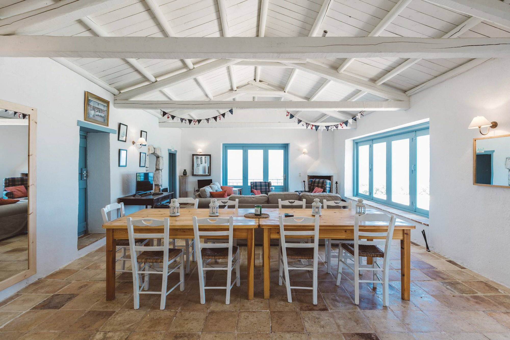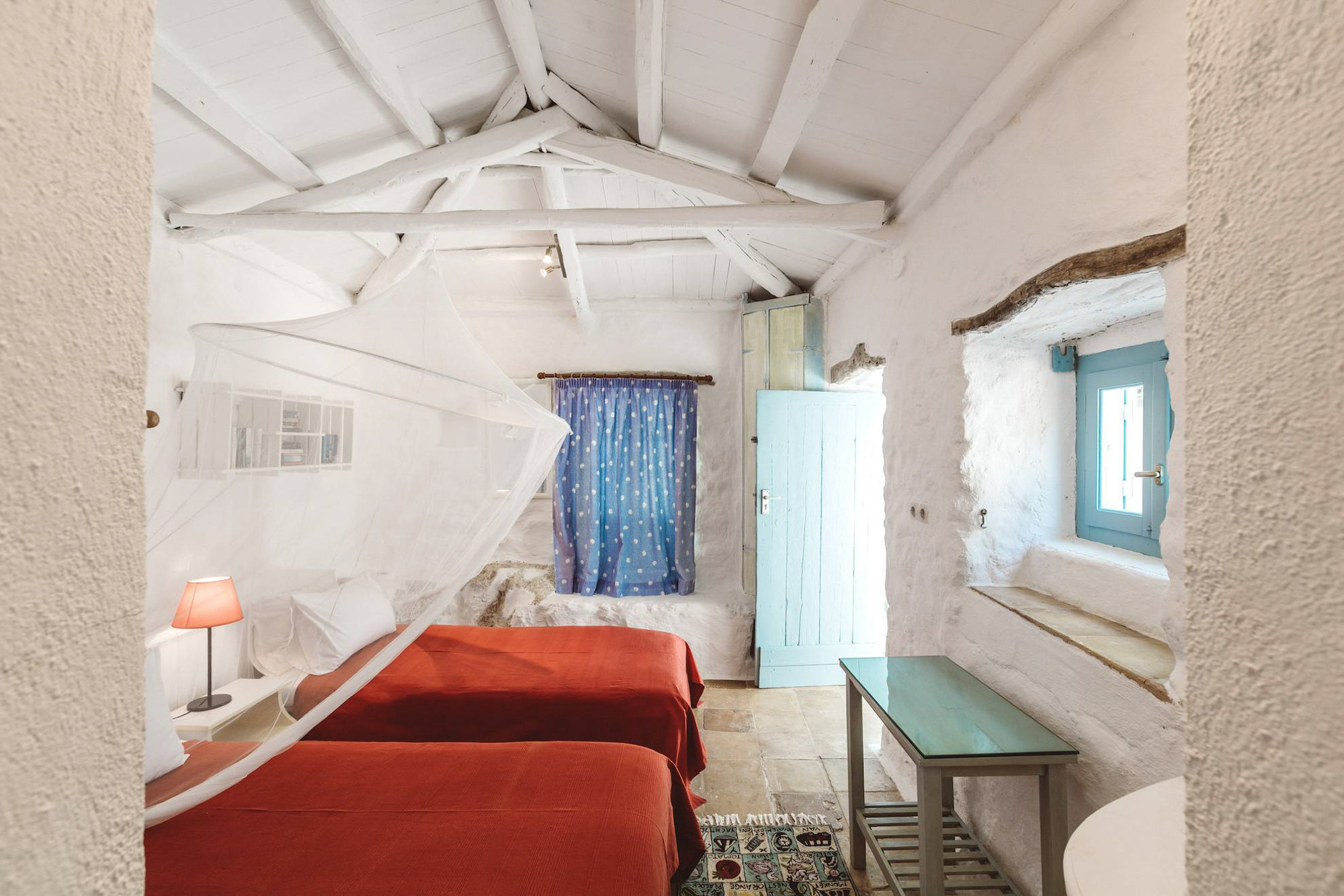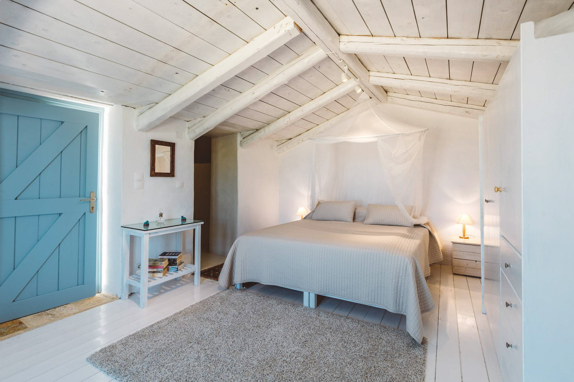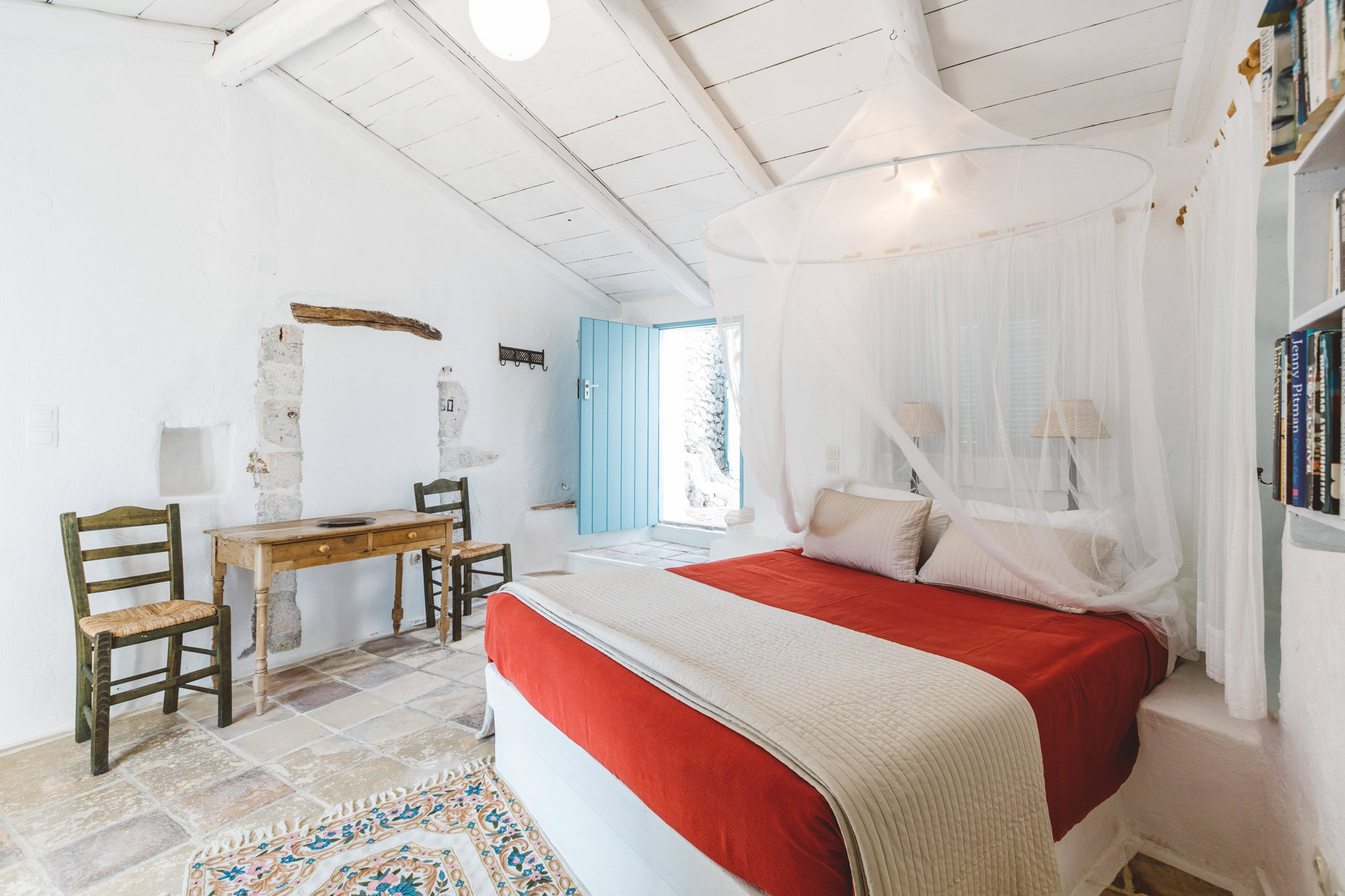 Set within a peaceful five-acre estate surrounded by ancient olive groves, the cottages surround a private courtyard. Perched gracefully on a hillside, the property offers panoramic views of the Ionian Sea. Inside, the design pays homage to the estate’s heritage, with interiors in crisp whites and calming blues. Seven en-suite bedrooms are scattered across 4 houses, and the bathrooms feature hand-carved basins made from local limestone.