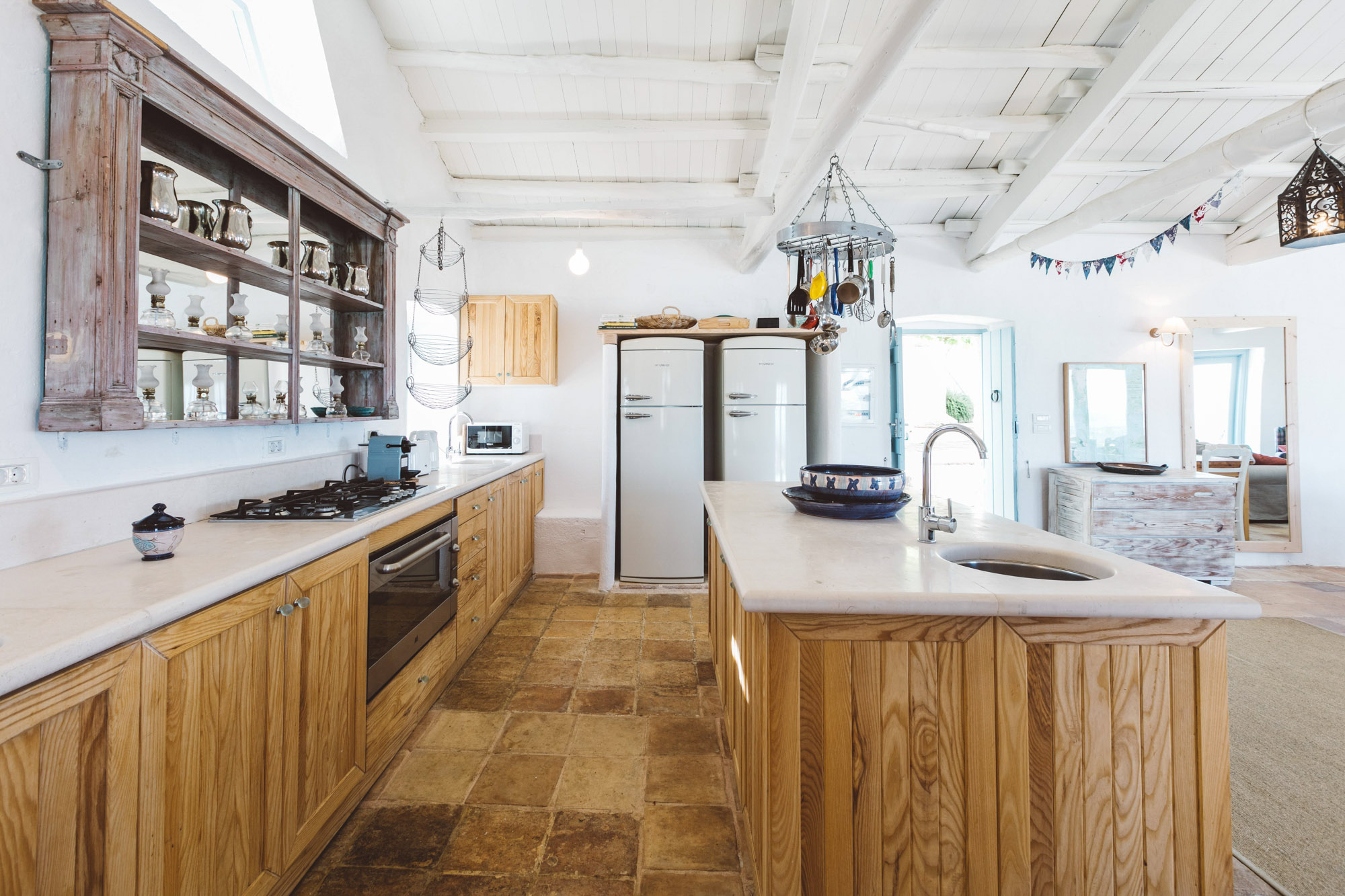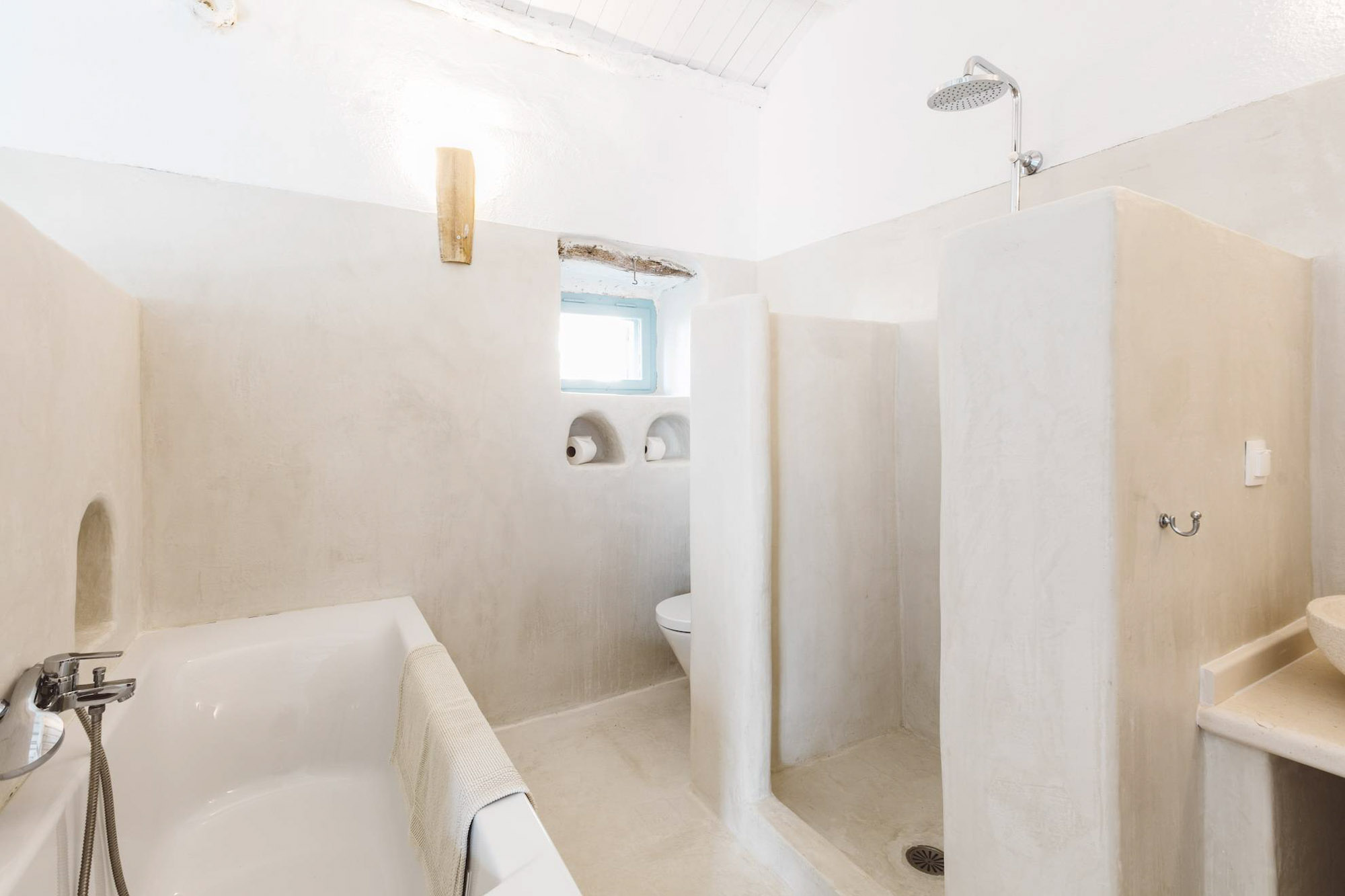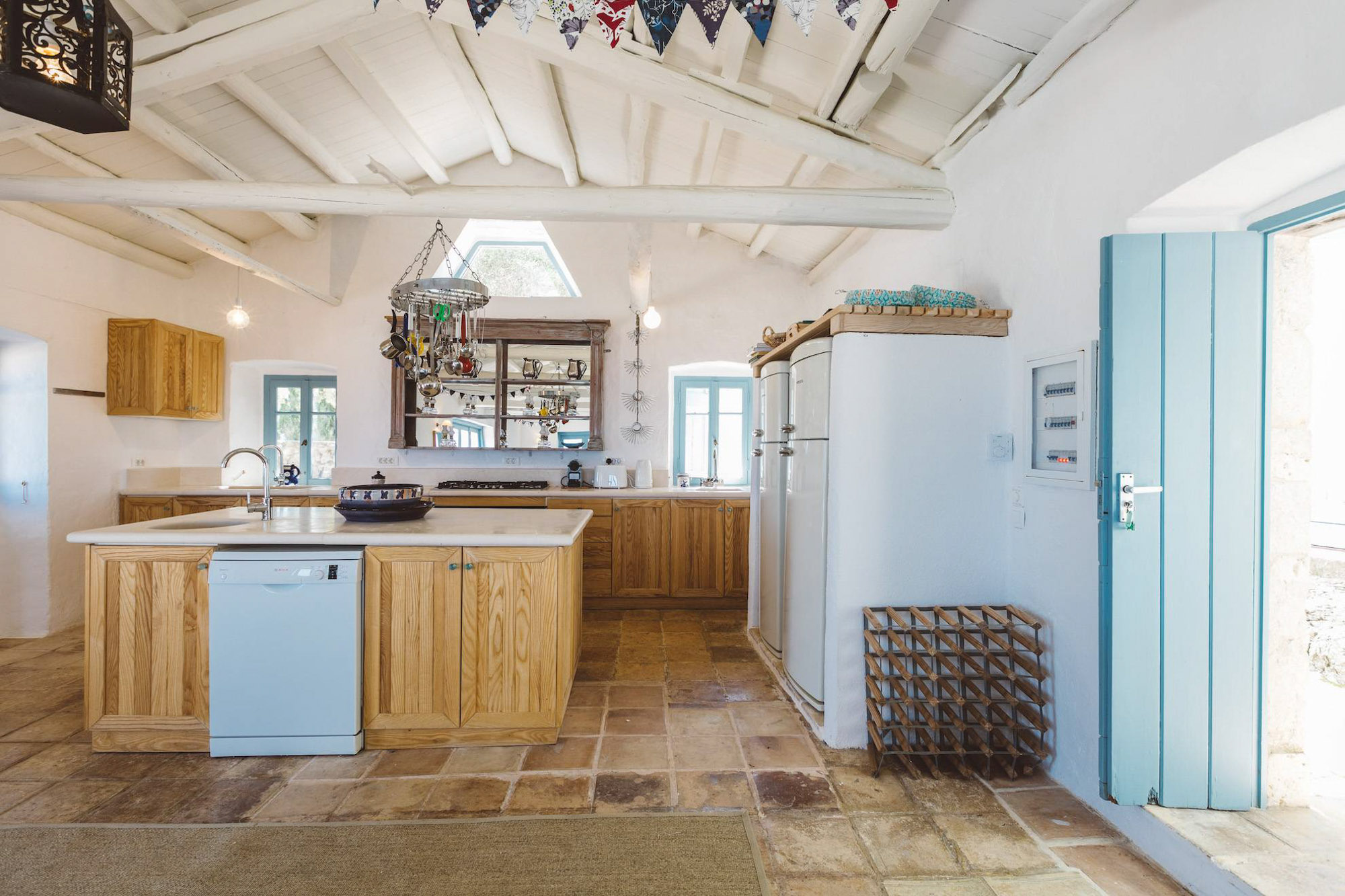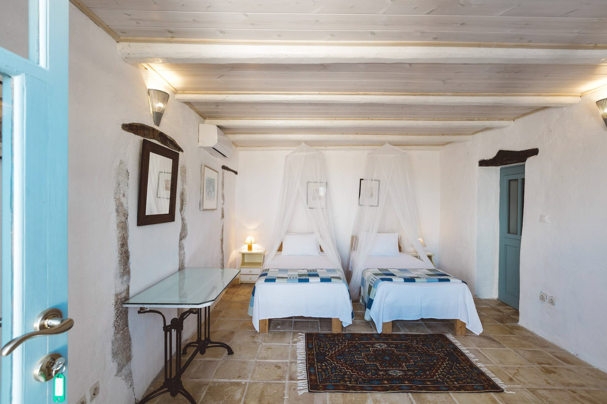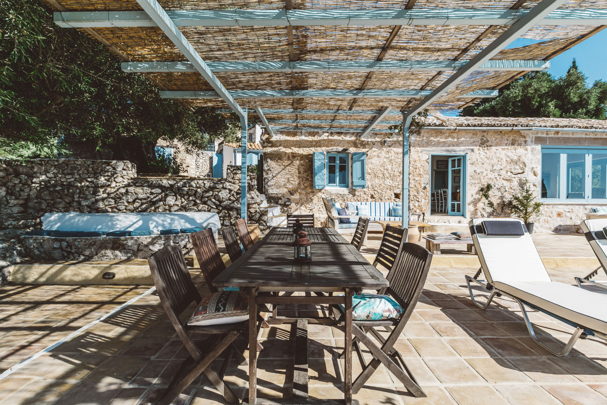 Set within a peaceful five-acre estate surrounded by ancient olive groves, the cottages surround a private courtyard. Perched gracefully on a hillside, the property offers panoramic views of the Ionian Sea. Inside, the design pays homage to the estate’s heritage, with interiors in crisp whites and calming blues. Seven en-suite bedrooms are scattered across 4 houses, and the bathrooms feature hand-carved basins made from local limestone.
