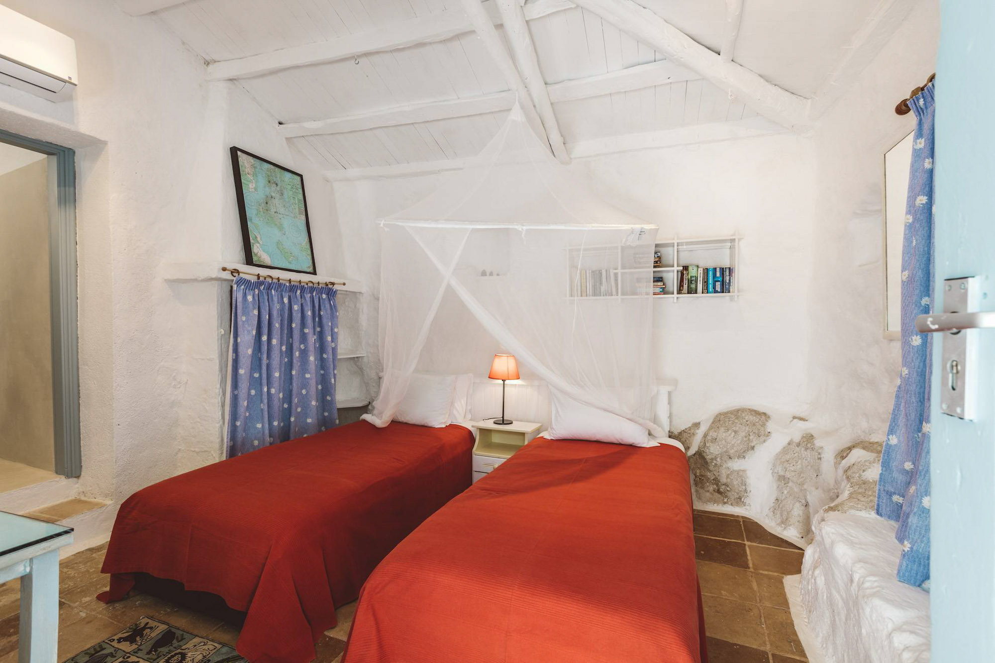 Each cottage has its own private entrance and outside access, offering plenty of privacy for each family. None of the bedrooms are interconnecting, although the main cottage includes a bedroom with a dressing room that can double up to become a family suite, with extra beds for children. The bedrooms are charmingly decorated, featuring red bed covers, painted furniture, and mosquito nets draped over the beds for a touch of elegance and comfort.